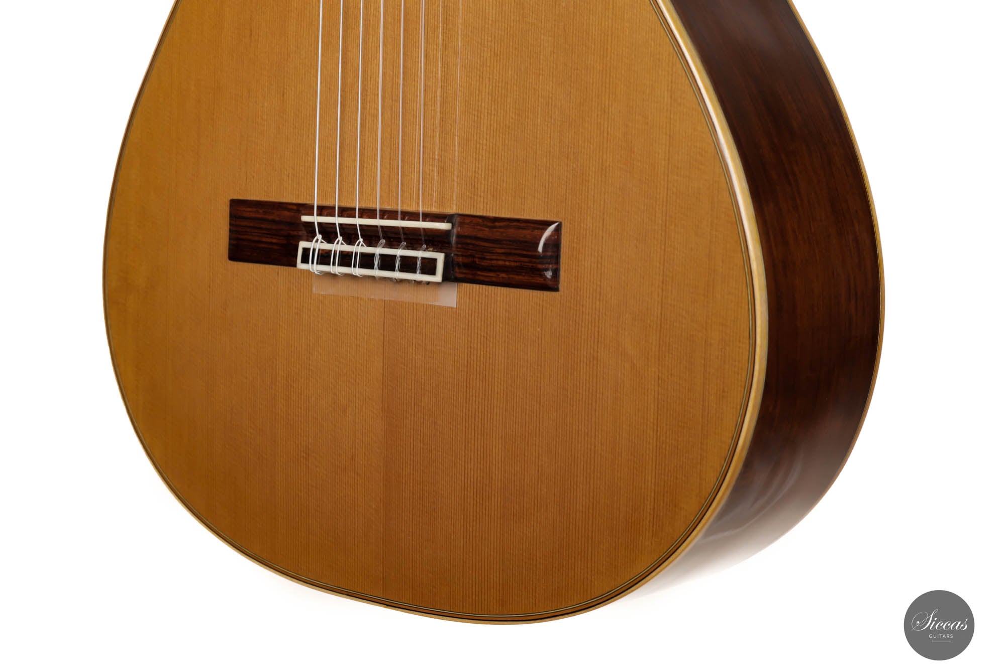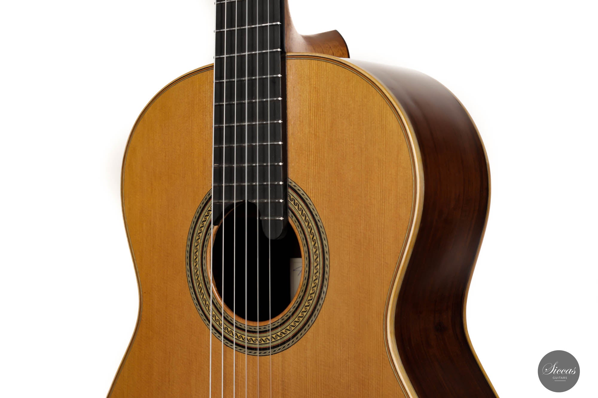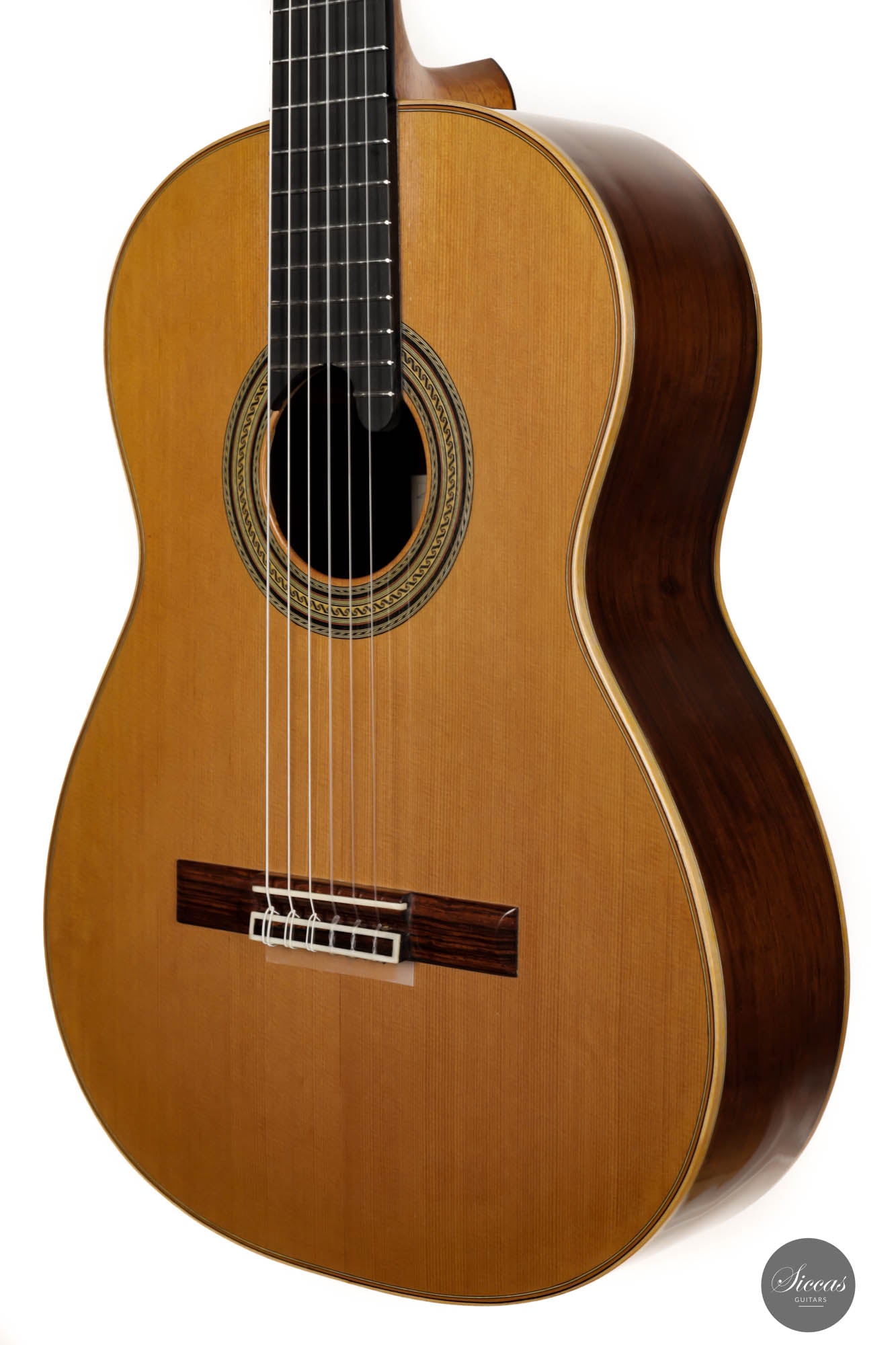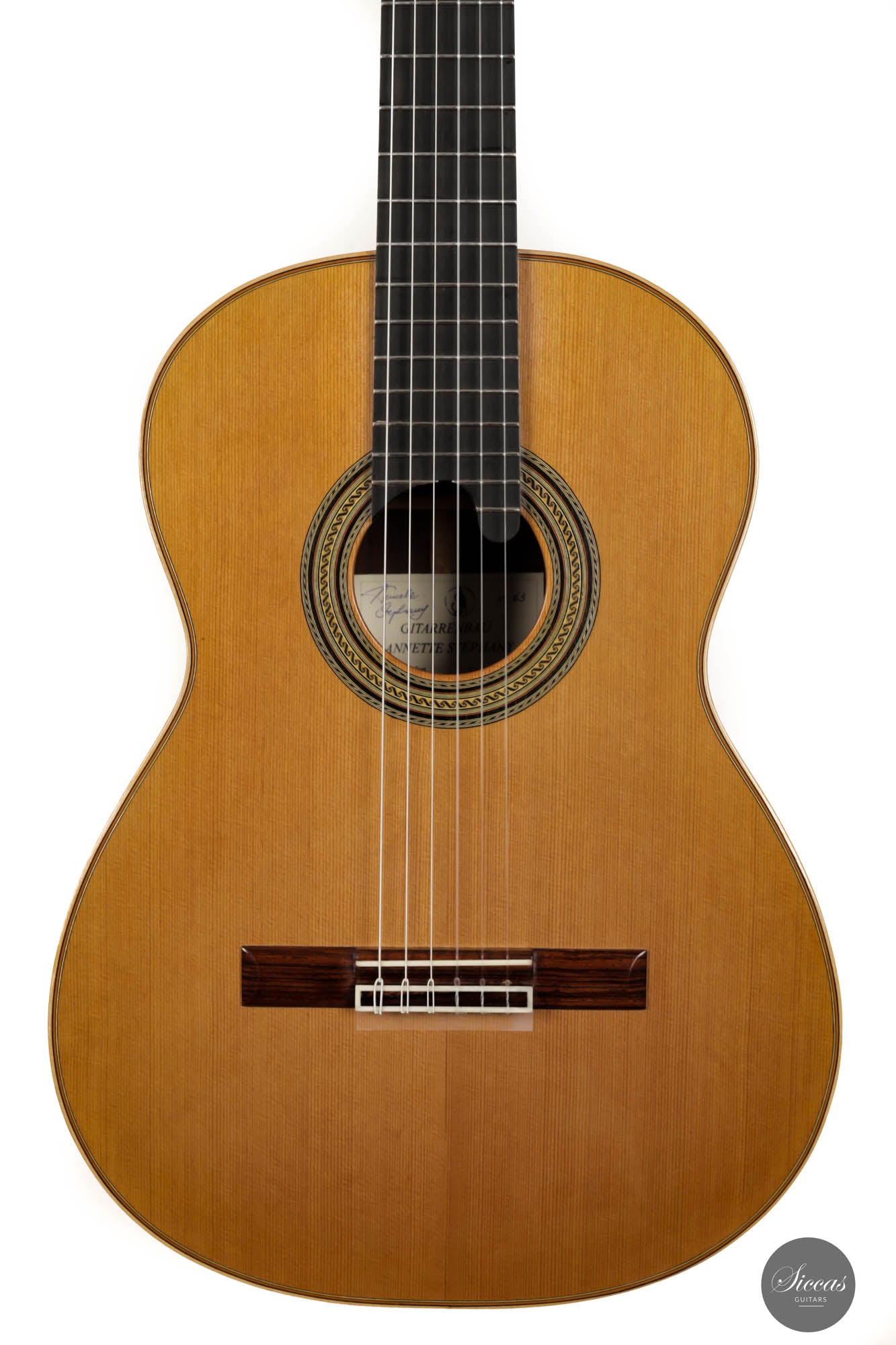 Dieses schöne, nagelneue Instrument kommt direkt aus Annettes Werkstatt. Es wurde in traditioneller Bauweise mit einem siebenfachen Verstrebungssystem gebaut. Die schön verzierte Zederndecke und der Boden und die Zargen aus Madagaskarpalisander zeigen Annettes herausragende Handwerkskunst als Gitarrenbauerin. Die 640 mm lange Mensur macht dieses Instrument außerdem zu einer perfekten Gitarre für Konzertinterpreten mit kleineren Händen. Akustisch hat dieses feine Instrument eine bunte Klangpalette von Fichtengitarre und die Wärme von Zederngitarre kombiniert. Die knackigen und soliden Bässe bilden ein starkes Fundament für die Gesamtintonation dieser unglaublichen Gitarre. Es ist ein zuverlässiges traditionelles Konzertinstrument, das durch seine Vielseitigkeit die Bedürfnisse eines jeden Konzertgitarristen erfüllt.