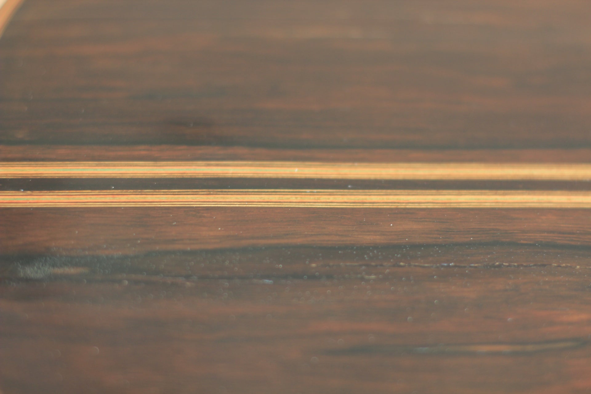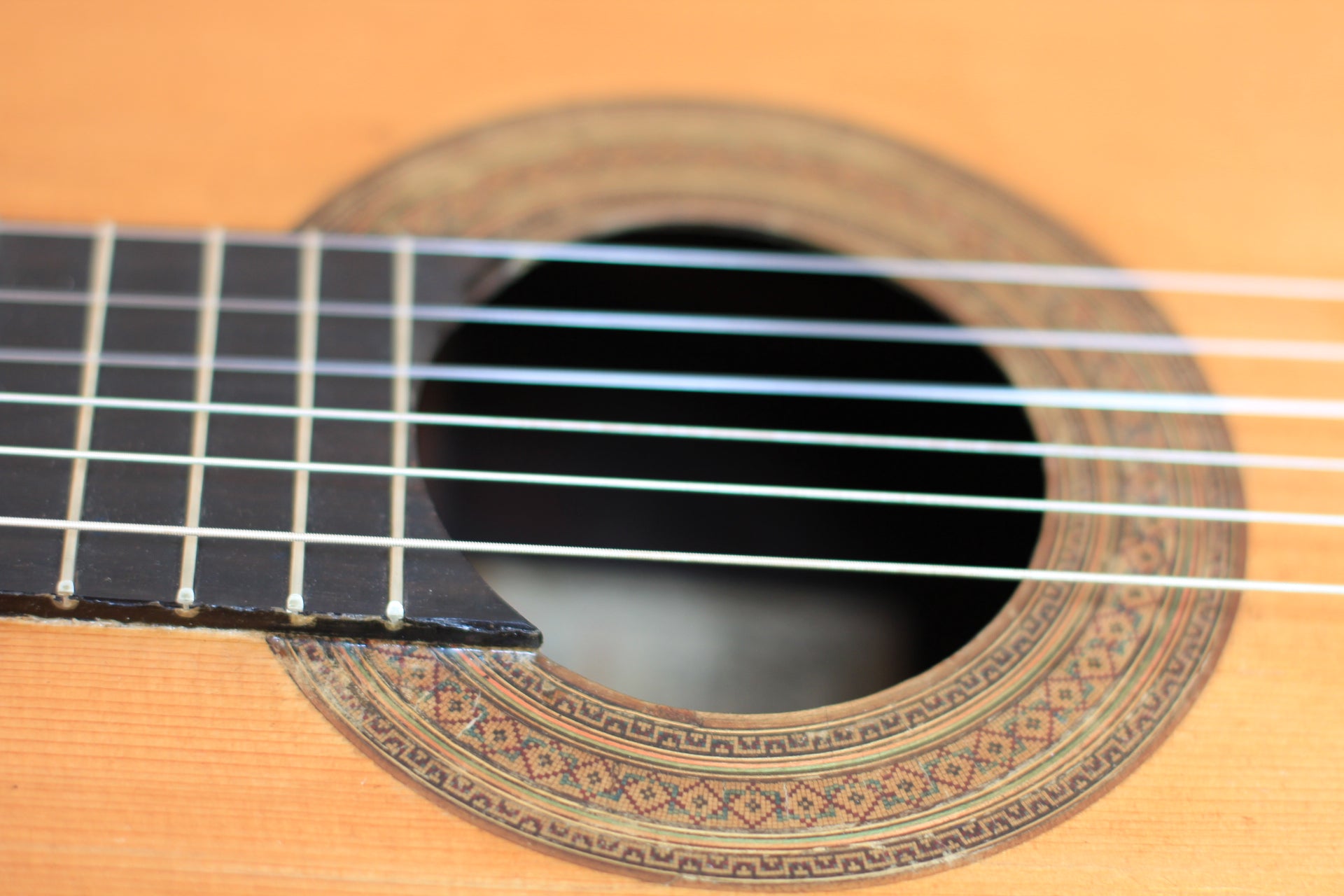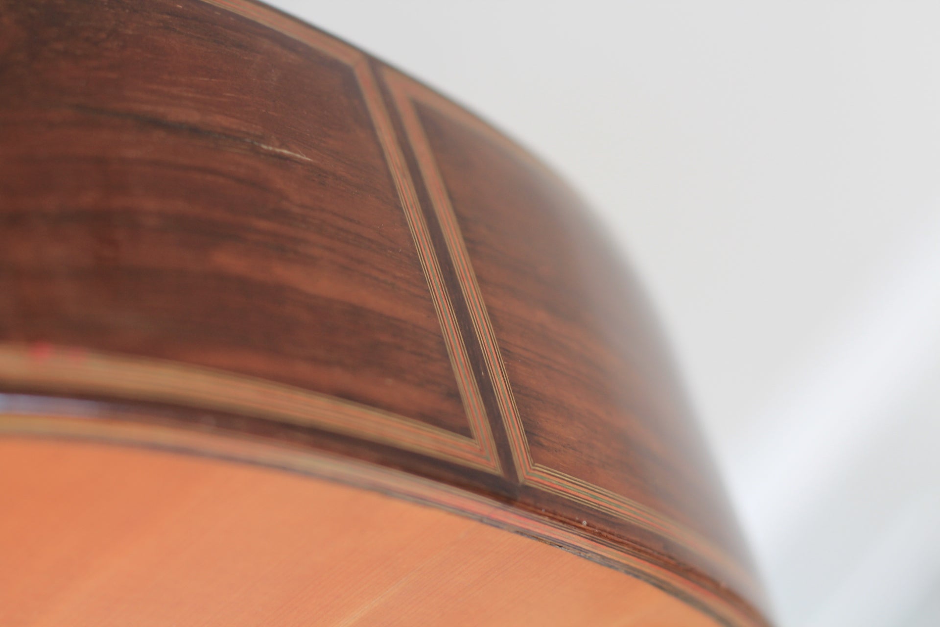 Diese Antigua Casa Nuñez Gitarre wurde 1924 gebaut. Sie hat einige reparierte Risse auf der Decke und dem Boden, die alle stabil sind. Die Gitarre wurde mit Nitrolack lackiert.