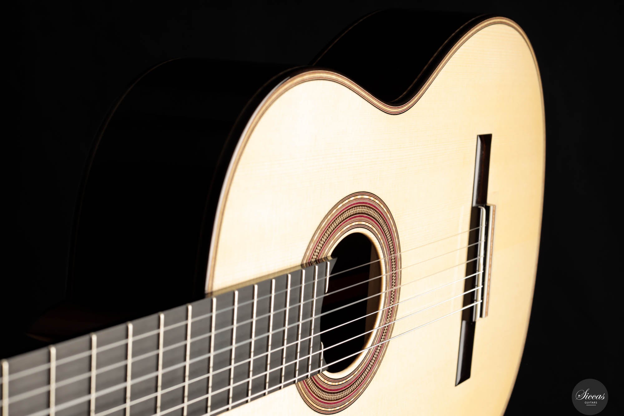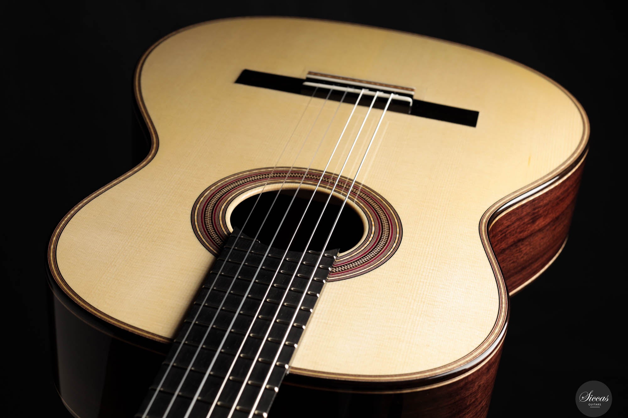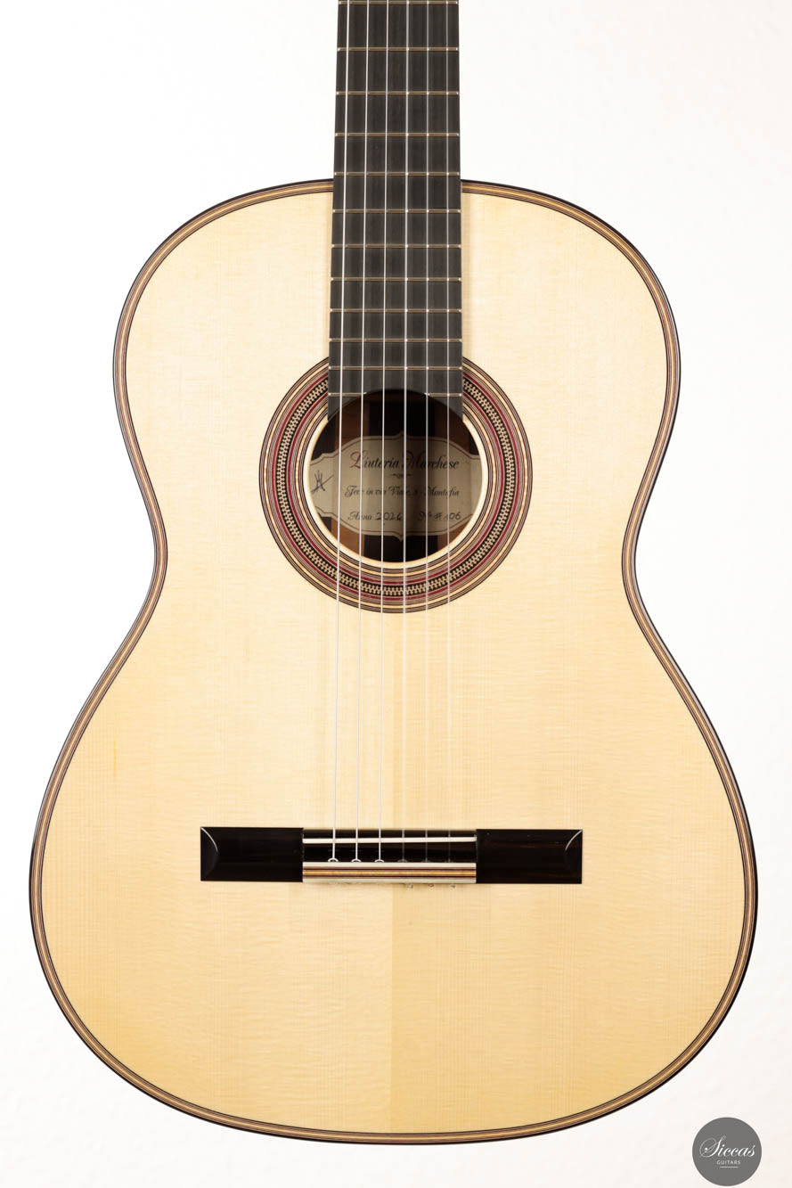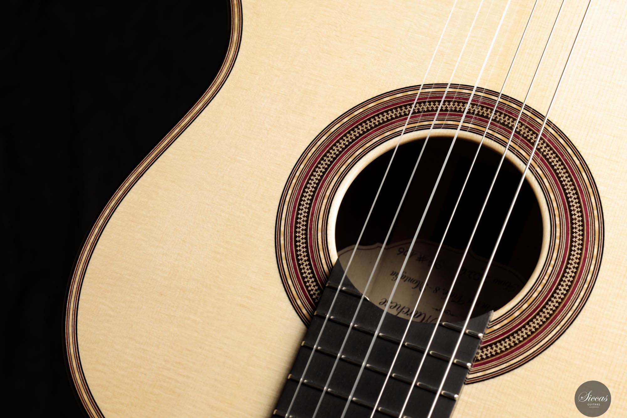 Mit einem traditionellen 7-Fächer-Bracing-Design konzipiert, ist die Antonio Marchese Gitarre Nr. 106 darauf ausgelegt, Marcheses Ideal akustischer Perfektion zu erreichen, mit einer Hauptresonanz im F/F#-Bereich. Diese Designwahl resultiert in einer reichen Mischung aus tiefen, dunklen Bassklängen und klaren, melodischen Höhen, die ein ausgewogenes und ausdrucksstarkes Klangspektrum bieten. Diese Gitarre ist darauf ausgelegt, den nuancierten Anforderungen verschiedener Spielstile gerecht zu werden und bietet ein vielseitiges Werkzeug für Musiker, die ein reiches und dynamisches Hörerlebnis suchen. Die Kombination aus außergewöhnlicher Bauqualität, innovativem Design und überlegener tonaler Balance macht die Antonio Marchese Gitarre Nr. 106 zu einer ausgezeichneten Wahl für Gitarristen, die ihren musikalischen Ausdruck bereichern möchten, und verstärkt Antonio Marcheses Ruf als eine führende Figur in der Kunst des Gitarrenbaus.