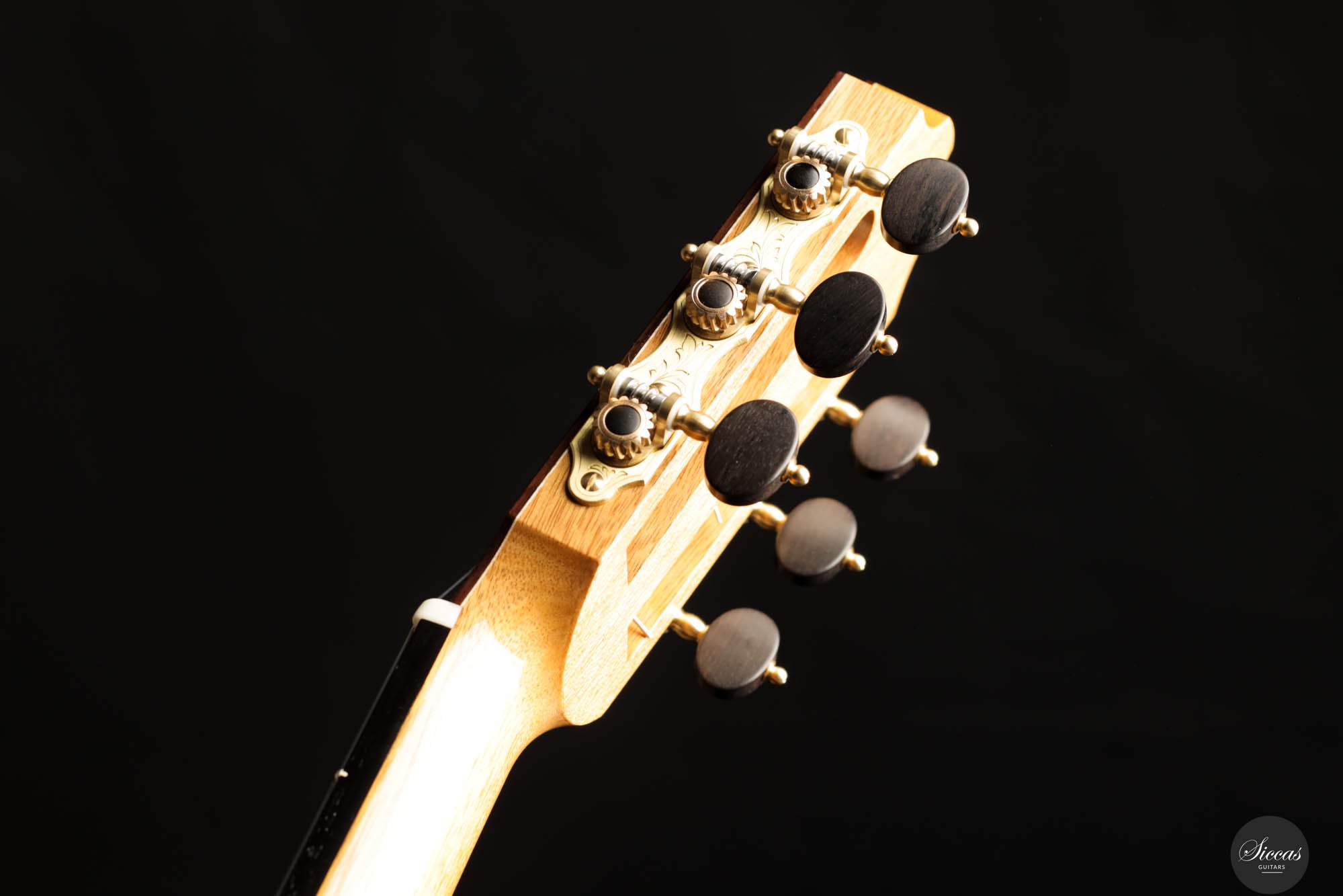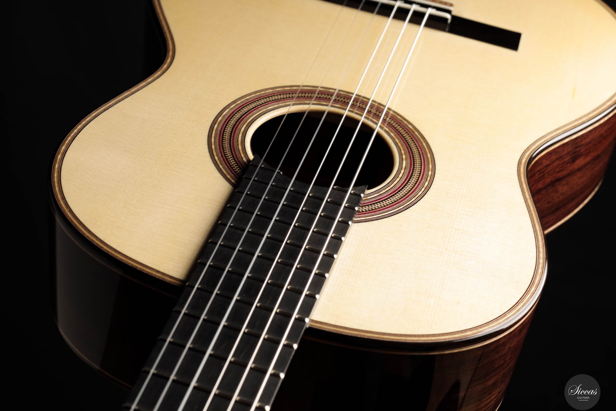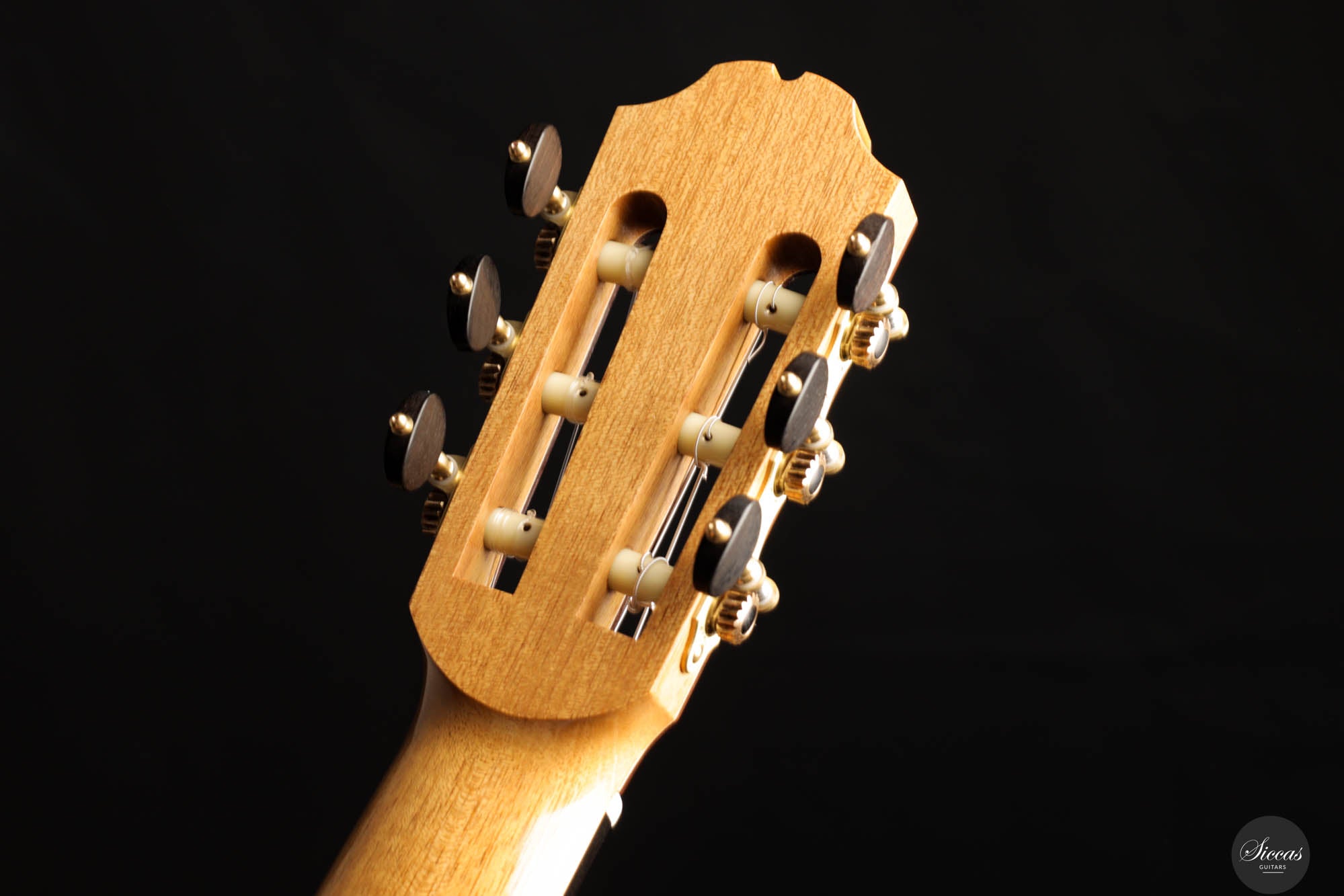 Mit einem traditionellen 7-Fächer-Bracing-Design konzipiert, ist die Antonio Marchese Gitarre Nr. 106 darauf ausgelegt, Marcheses Ideal akustischer Perfektion zu erreichen, mit einer Hauptresonanz im F/F#-Bereich. Diese Designwahl resultiert in einer reichen Mischung aus tiefen, dunklen Bassklängen und klaren, melodischen Höhen, die ein ausgewogenes und ausdrucksstarkes Klangspektrum bieten. Diese Gitarre ist darauf ausgelegt, den nuancierten Anforderungen verschiedener Spielstile gerecht zu werden und bietet ein vielseitiges Werkzeug für Musiker, die ein reiches und dynamisches Hörerlebnis suchen. Die Kombination aus außergewöhnlicher Bauqualität, innovativem Design und überlegener tonaler Balance macht die Antonio Marchese Gitarre Nr. 106 zu einer ausgezeichneten Wahl für Gitarristen, die ihren musikalischen Ausdruck bereichern möchten, und verstärkt Antonio Marcheses Ruf als eine führende Figur in der Kunst des Gitarrenbaus.