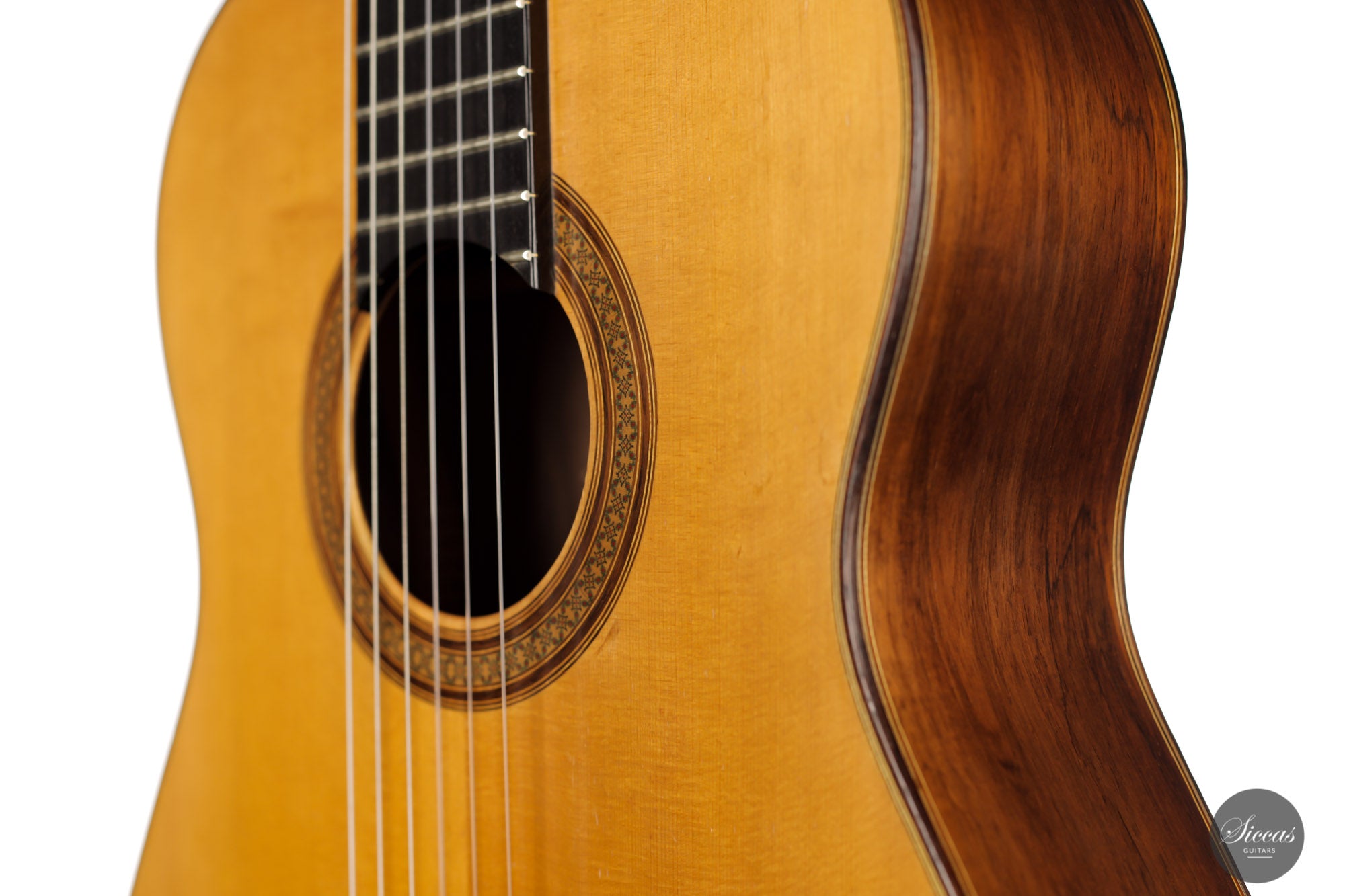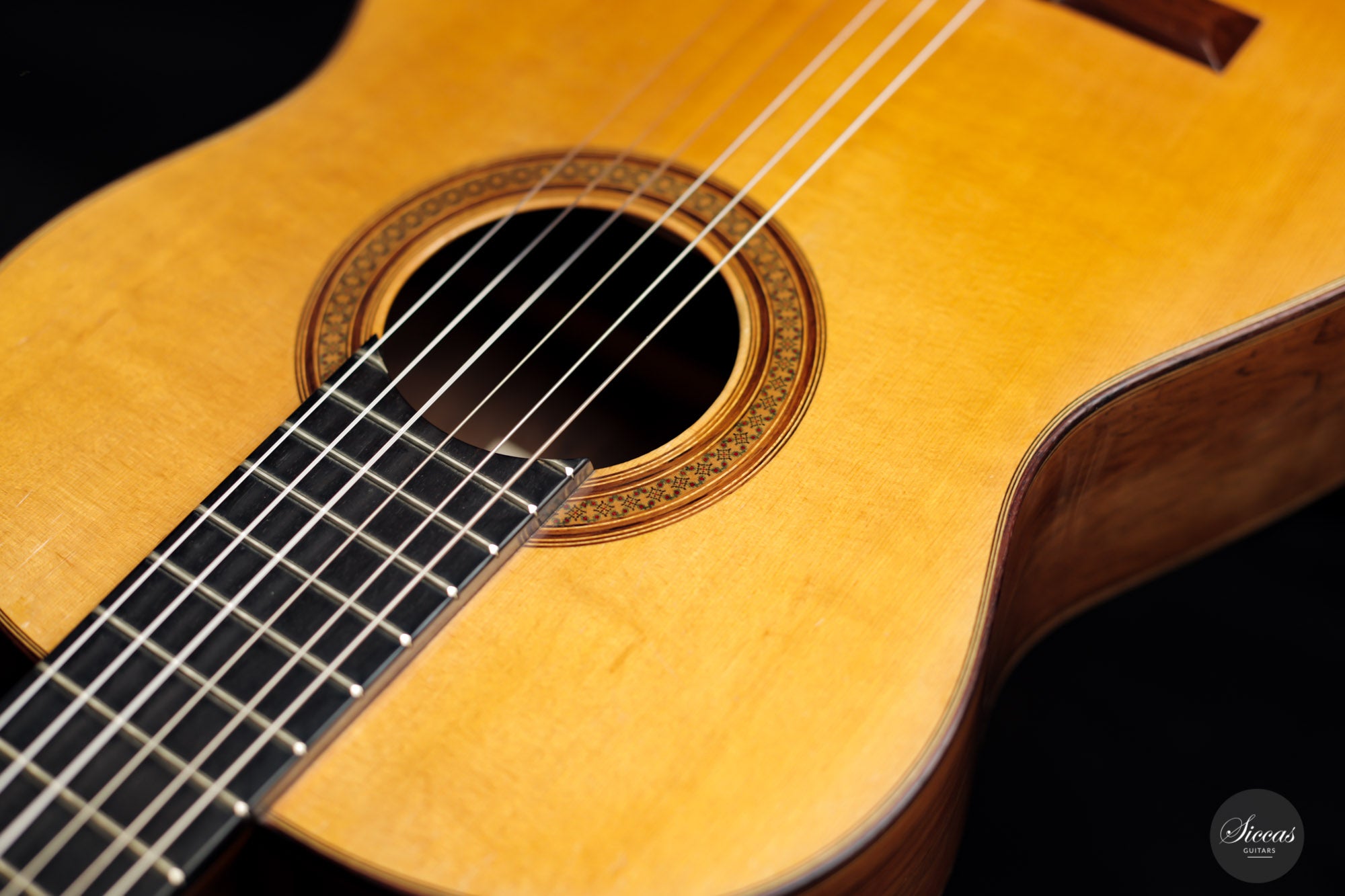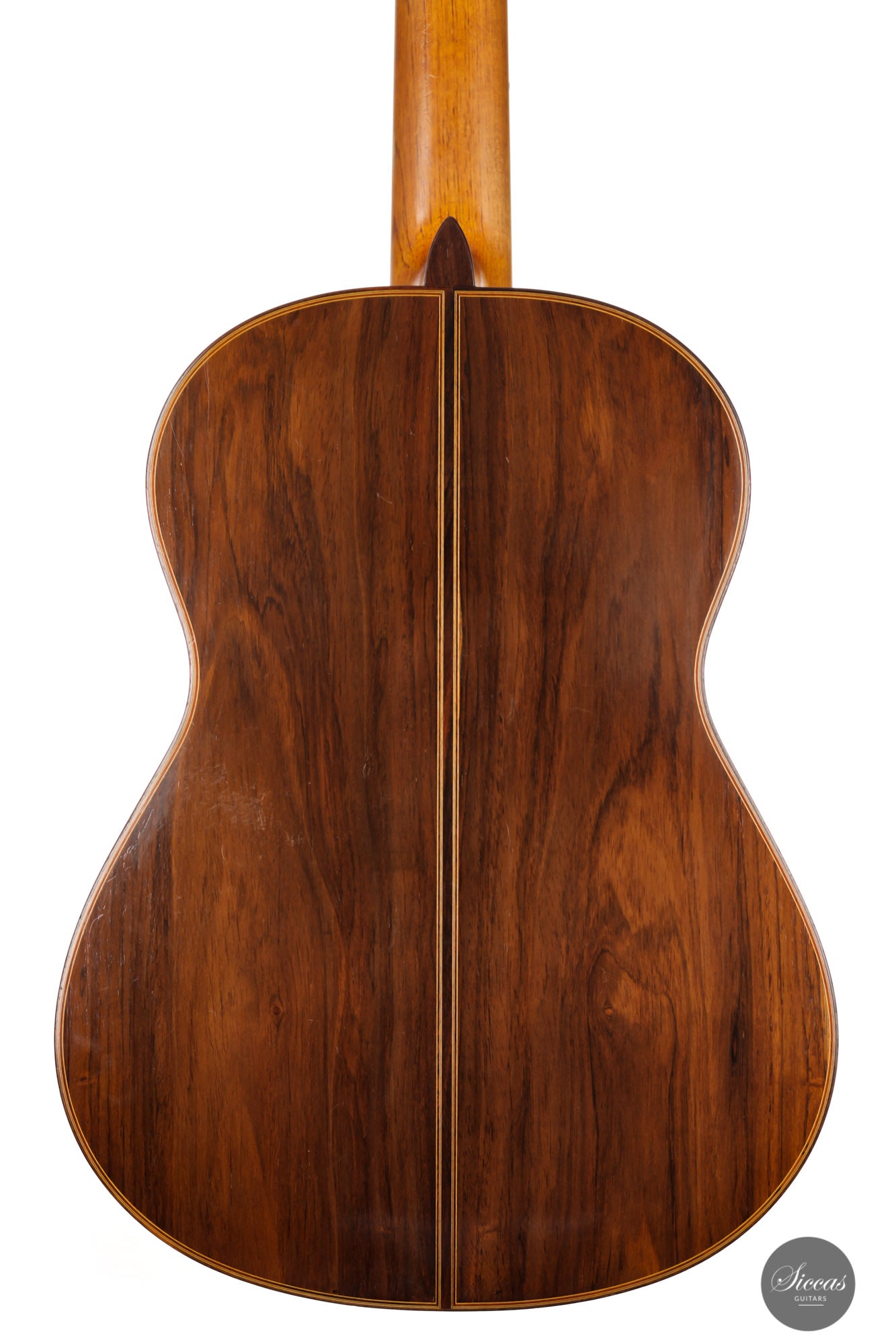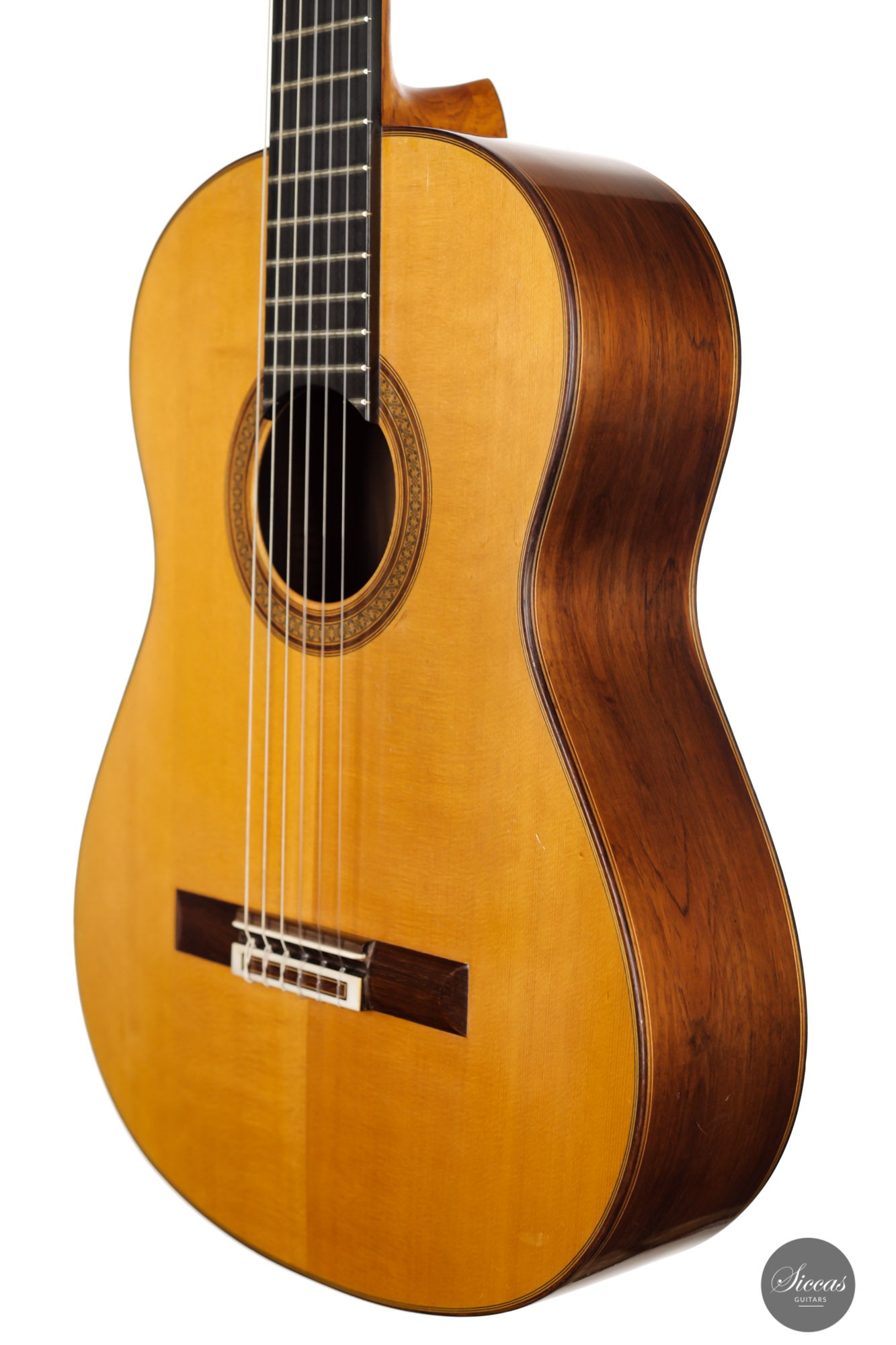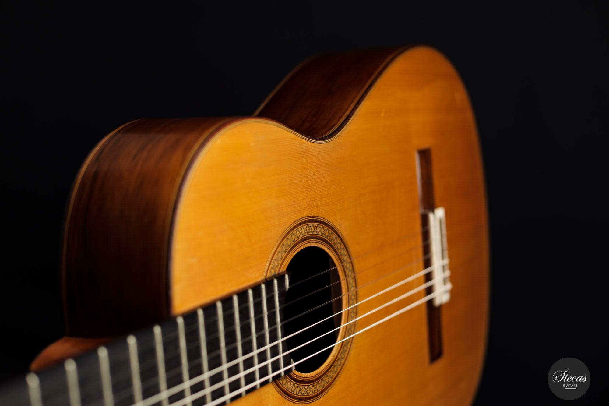 This gorgeous guitar from 1981 with the number 299 is an exciting instrument. It features a Robert Bouchet bracing, but with a slightly thinner crosspiece than usual. As a result, the top is impressively responsive and produces a radiant tone. Montero's rich and warm tone is immediately recognizable, and so is the overall aesthetic of the guitar. The spruce top has developed a lovely color over the years, and the Brazilian rosewood (CITES certified) back and sides are likewise remarkable. This guitar is free of cracks and only superficial playing wear is a reminder that it has been played intensively over the last forty years.