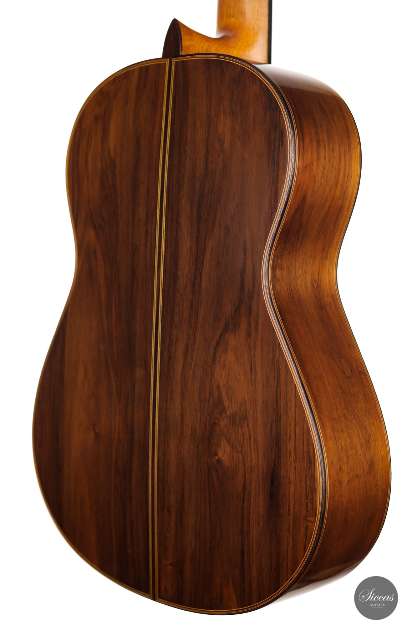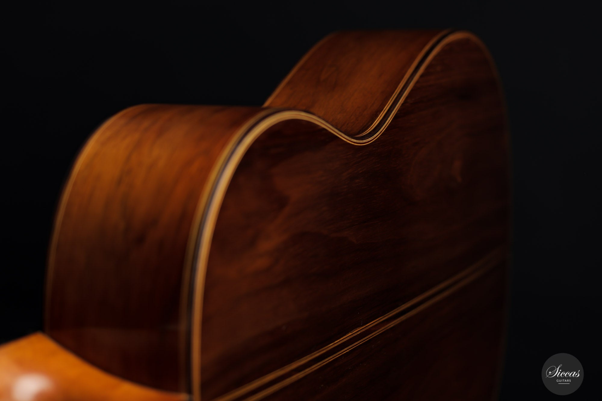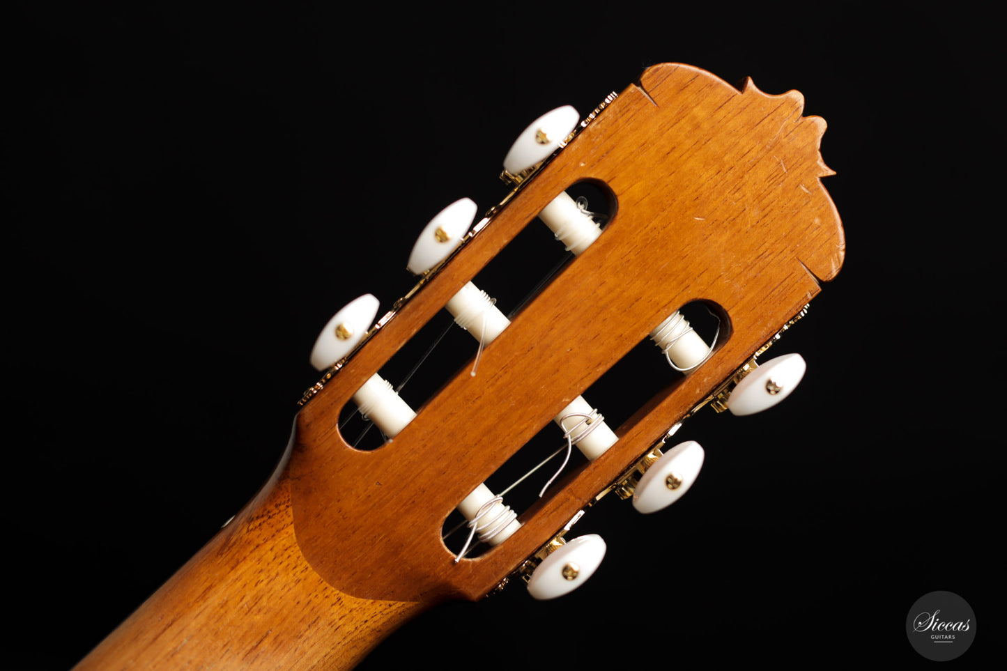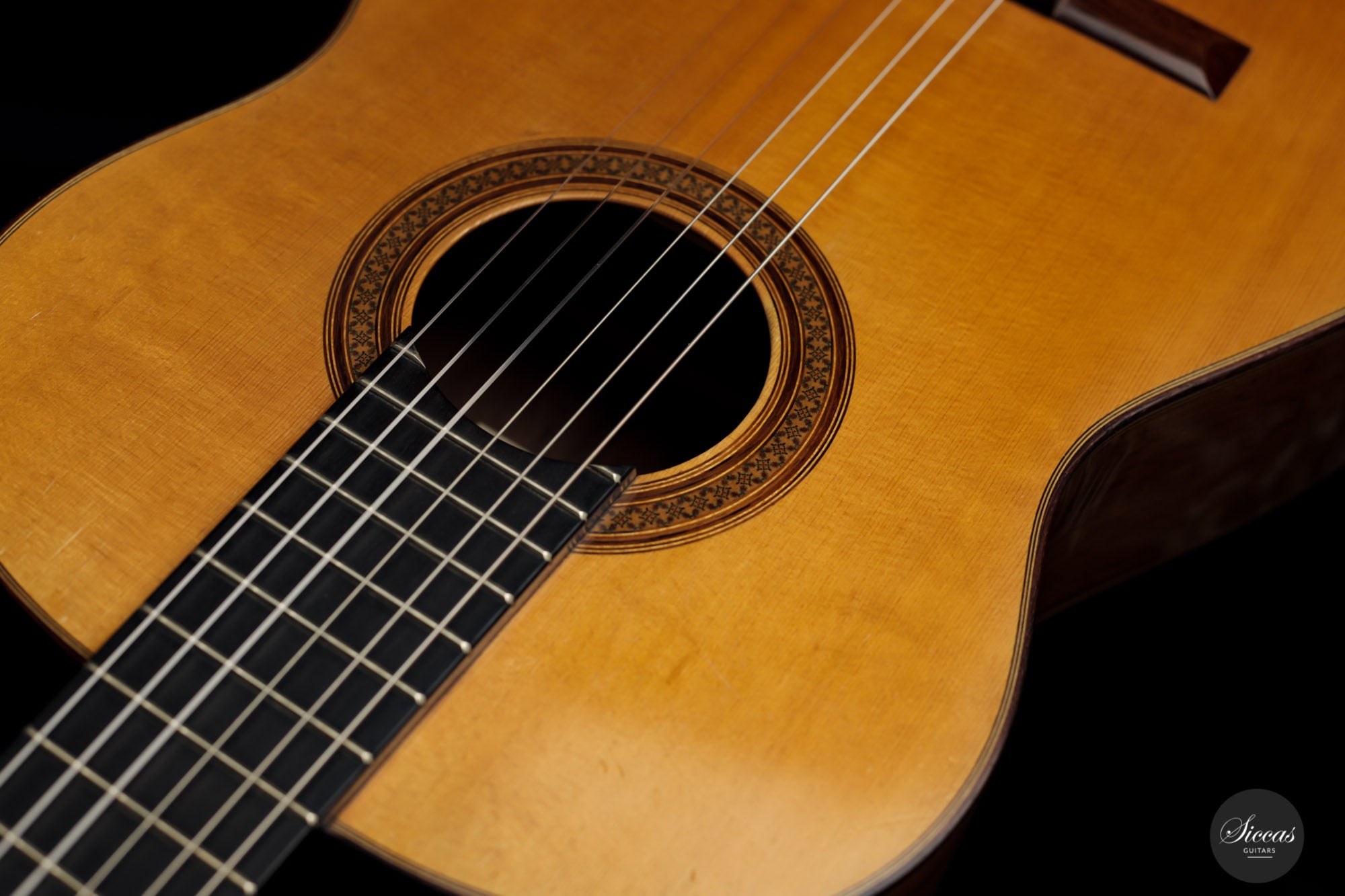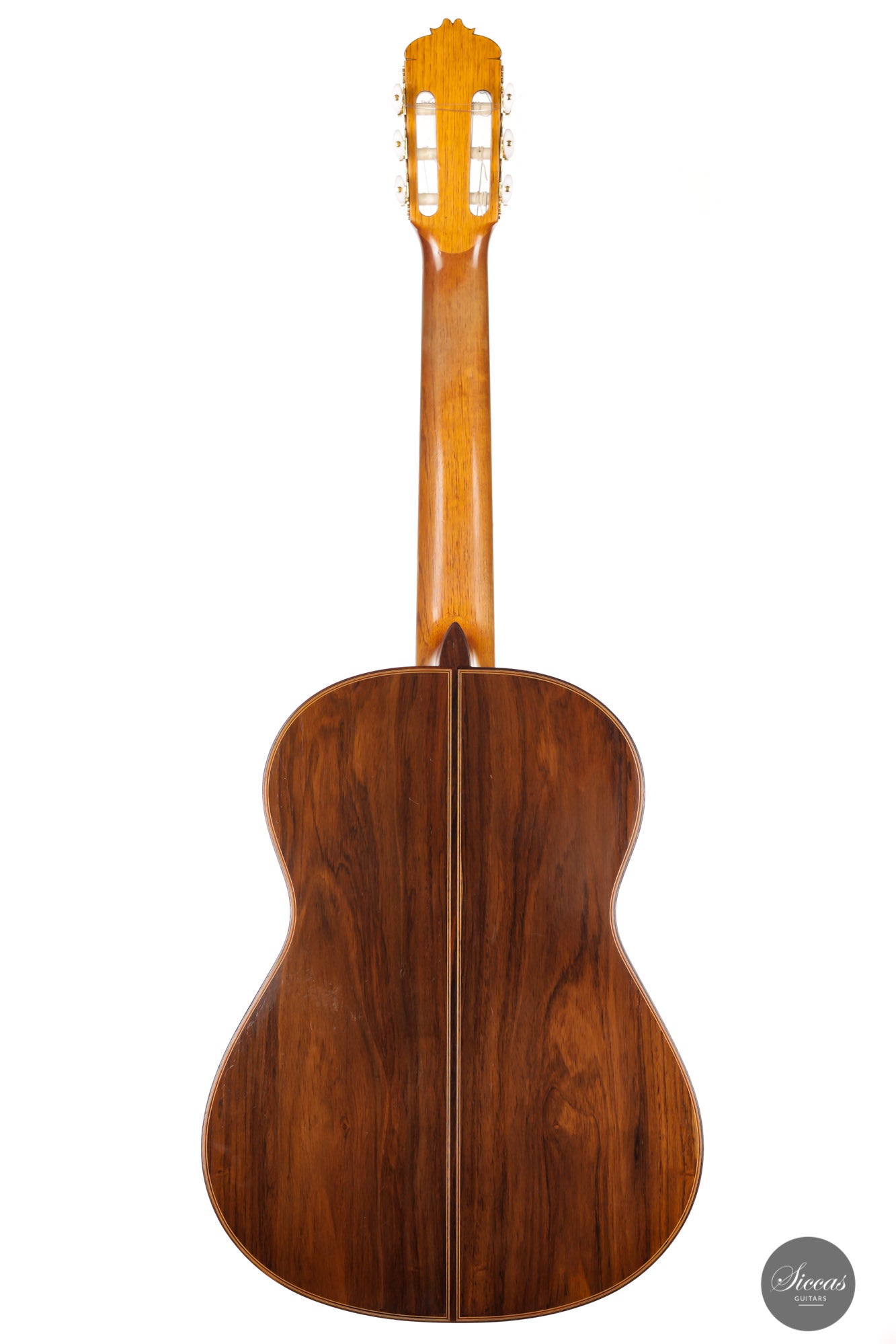 This gorgeous guitar from 1981 with the number 299 is an exciting instrument. It features a Robert Bouchet bracing, but with a slightly thinner crosspiece than usual. As a result, the top is impressively responsive and produces a radiant tone. Montero's rich and warm tone is immediately recognizable, and so is the overall aesthetic of the guitar. The spruce top has developed a lovely color over the years, and the Brazilian rosewood (CITES certified) back and sides are likewise remarkable. This guitar is free of cracks and only superficial playing wear is a reminder that it has been played intensively over the last forty years.