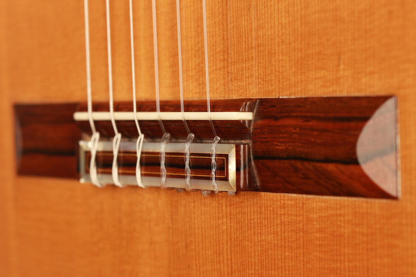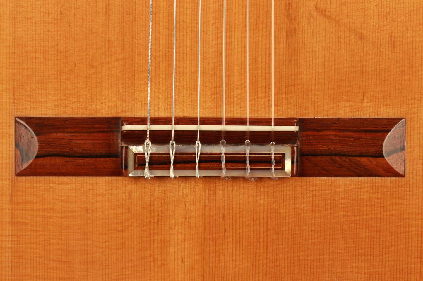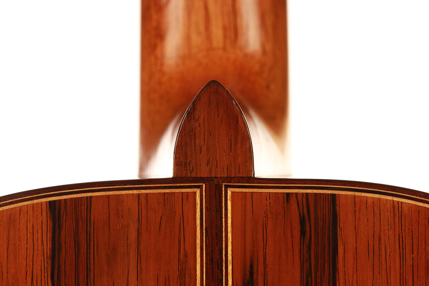 This gorgeous Robert Bouchet model has one of the most beautiful Brazilian rosewood back and sides (CITES certified) that we have seen on a A. M. Montero for a while. Back and sides are in a remarkable state of conservation and free of cracks. The top has four perfectly repaired and stable cracks. This guitar is of course hand signed on the second back-brace by Antonio Marin Montero.