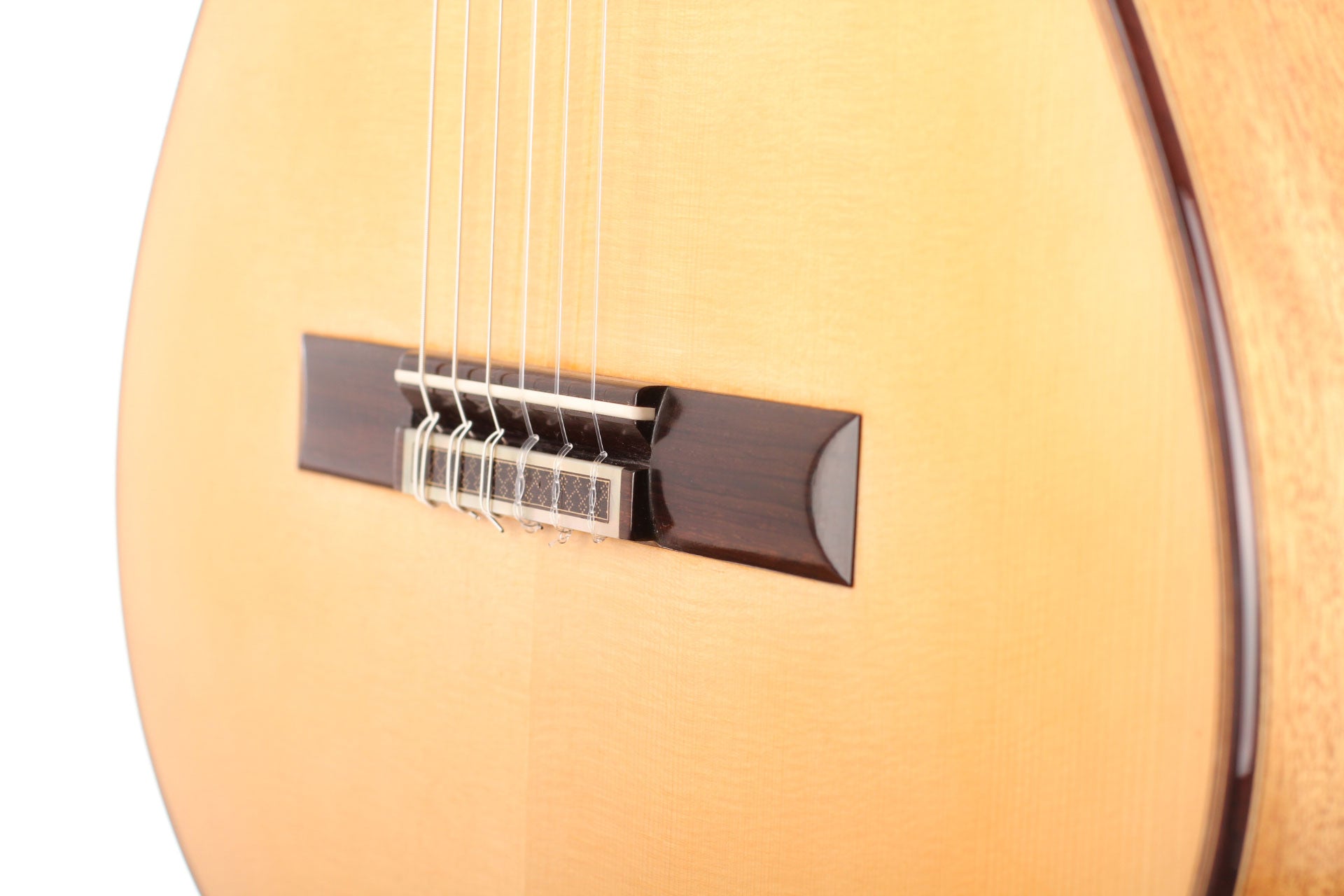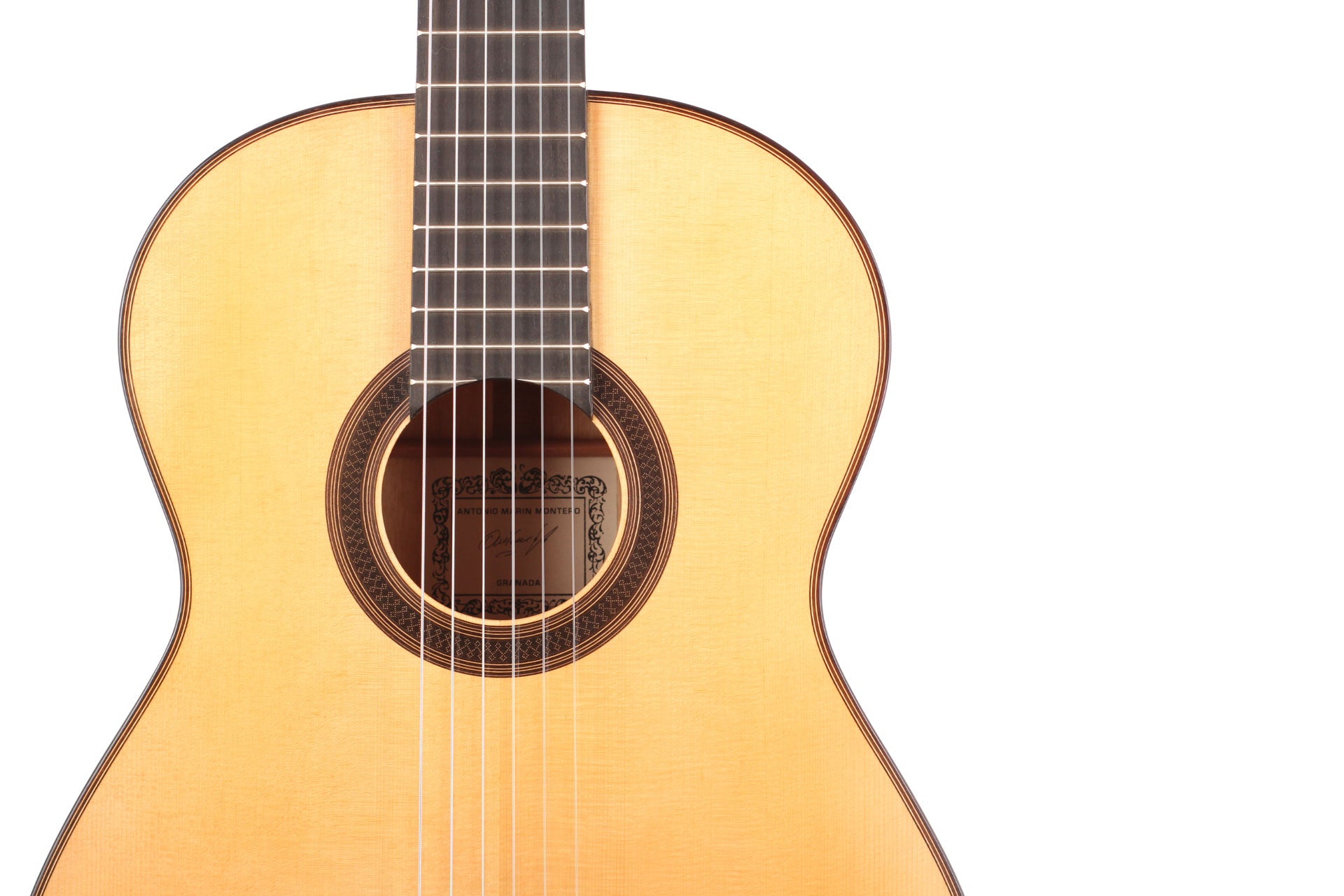 Antonio Marín Montero wurde 1933 in Granada geboren und war der ersten Gitarrenbauer in seiner Familie. Im Jahr 1957 begann er in der Werkstatt des Gitarrenbauers Pérez zu arbeiten. Wiederum zwei Jahre danach begann er eine Ausbildung bei Eduardo Ferrer bis schließlich seine eigene Werkstatt eröffnete. Diese neue Gitarre wurde im September 2016 fertiggestellt. Die Fichtendecke hat eine sehr gleichmäßige Maserung. Boden und Zargen sind aus Satinholz gefertigt worden. Verdelt wurde die Gitarre mit einer Schellackpolitur. Die Mechaniken sind von Rubner. Der Hartschalenkoffer ist inklusive.