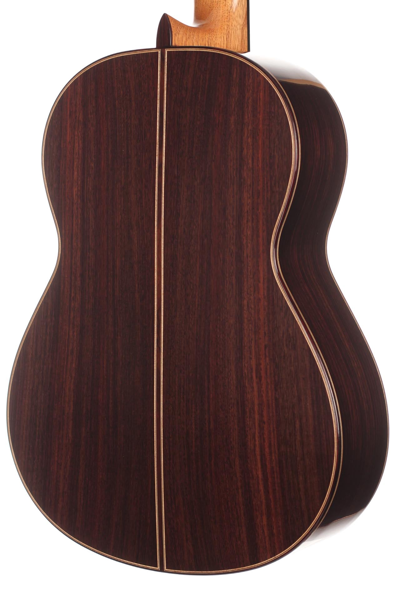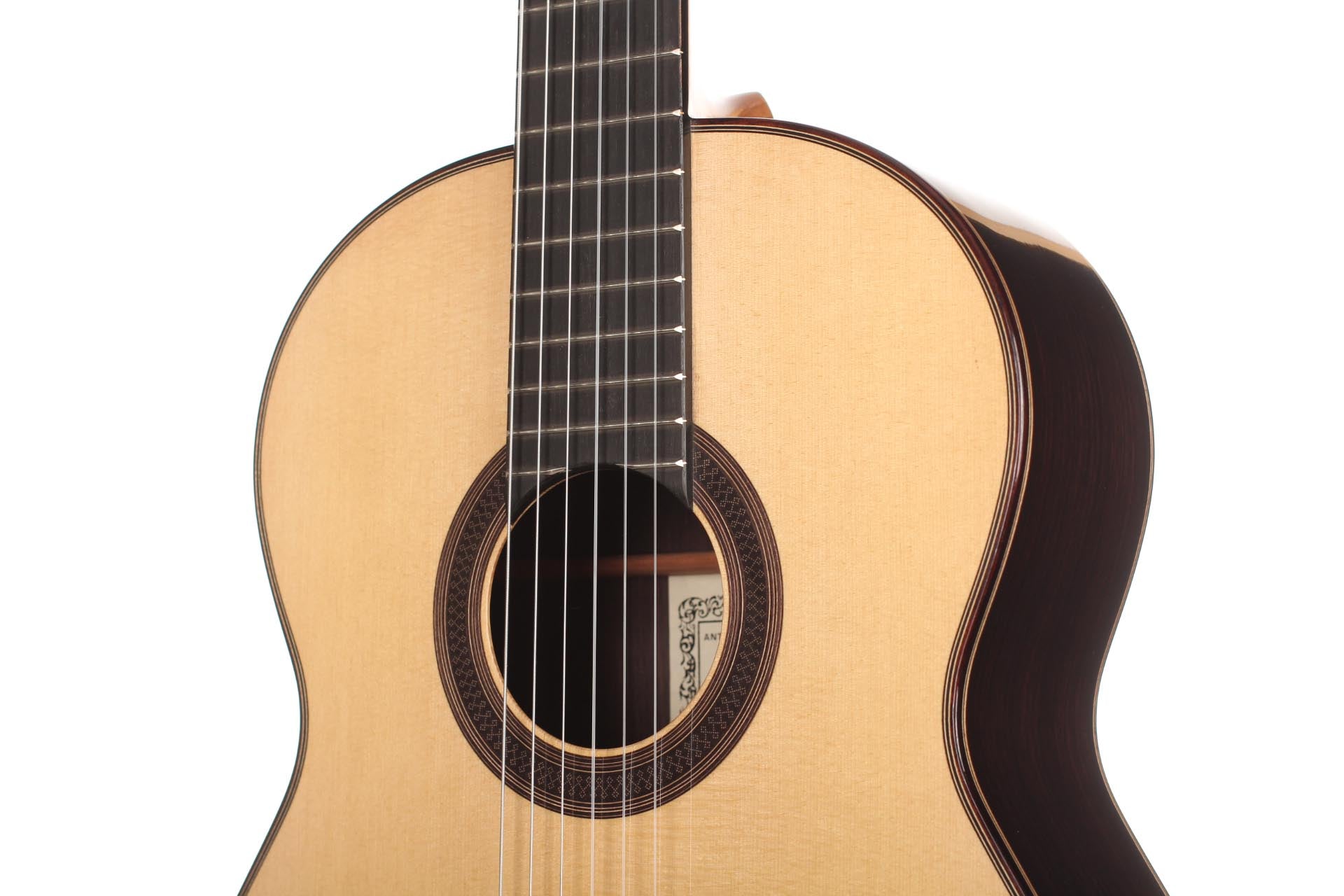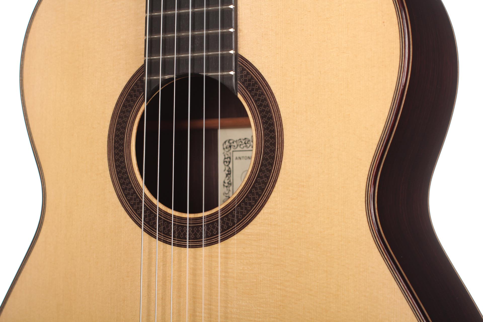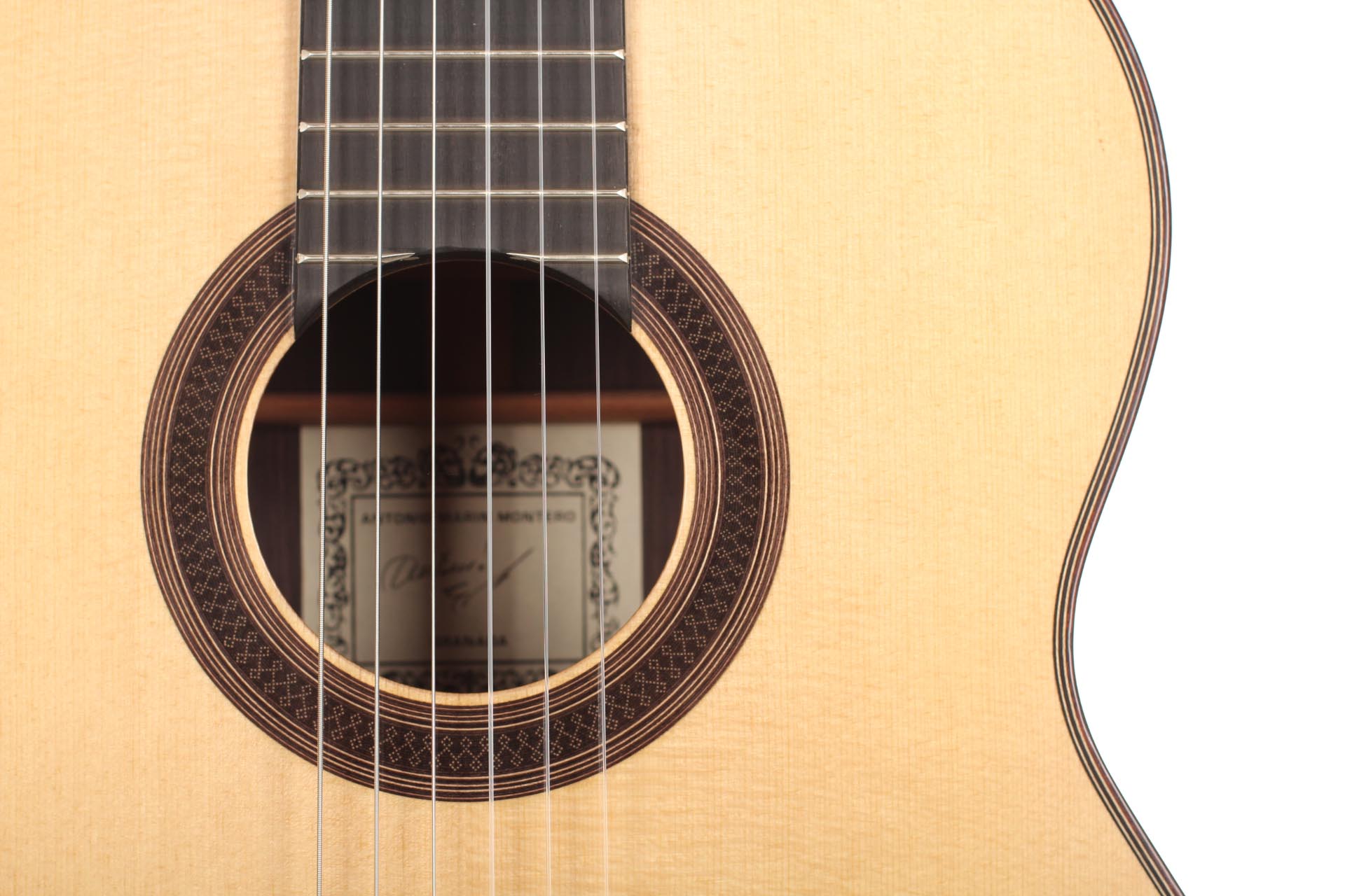 Antonio Marín Montero wurde 1933 in Granada geboren und war der ersten Gitarrenbauer in seiner Familie. Im Jahr 1957 begann er in der Werkstatt des Gitarrenbauers Pérez zu arbeiten. Wiederum zwei Jahre danach begann er eine Ausbildung bei Eduardo Ferrer bis schließlich seine eigene Werkstatt eröffnete. Diese neue Gitarre wurde zwischen den Jahren 2017 und 2018 fertiggestellt. Die Fichtendecke hat eine sehr gleichmäßige Maserung. Boden und Zargen sind aus indischem Palisander gefertigt worden. Klanglich ist dieses Instrument sehr offen und kräftig, die Klarheit ist bestechend mit sehr viel Tiefe, Ausgeglichenheit und Fülle. Veredelt wurde die Gitarre mit einer Schellackpolitur. Die Mechaniken sind von Rubner. Ein Hartschalenkoffer ist inklusive.
