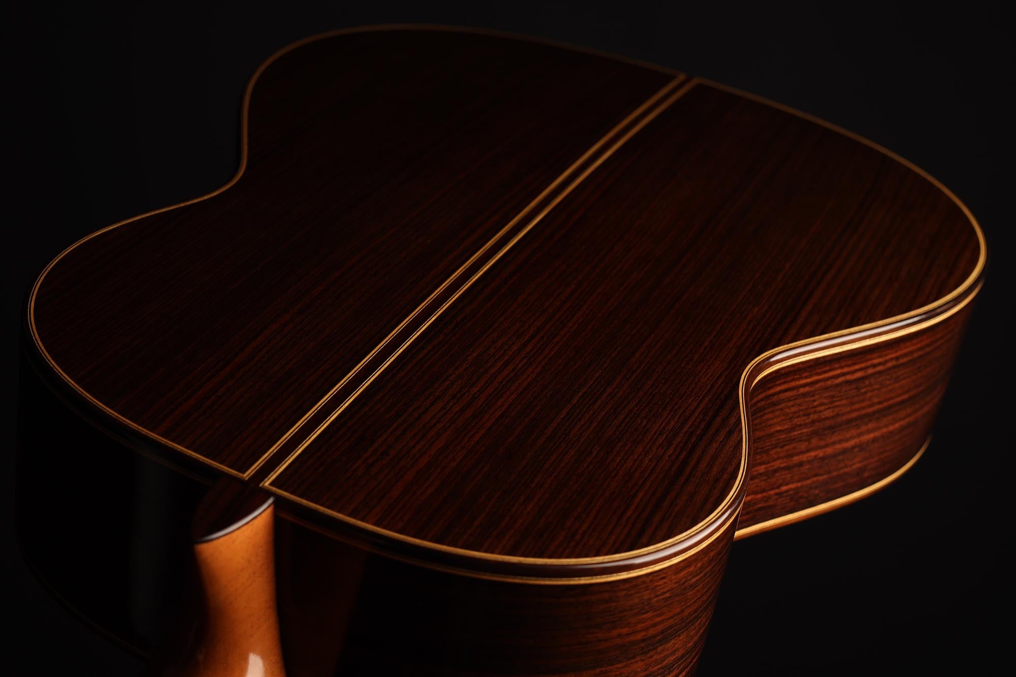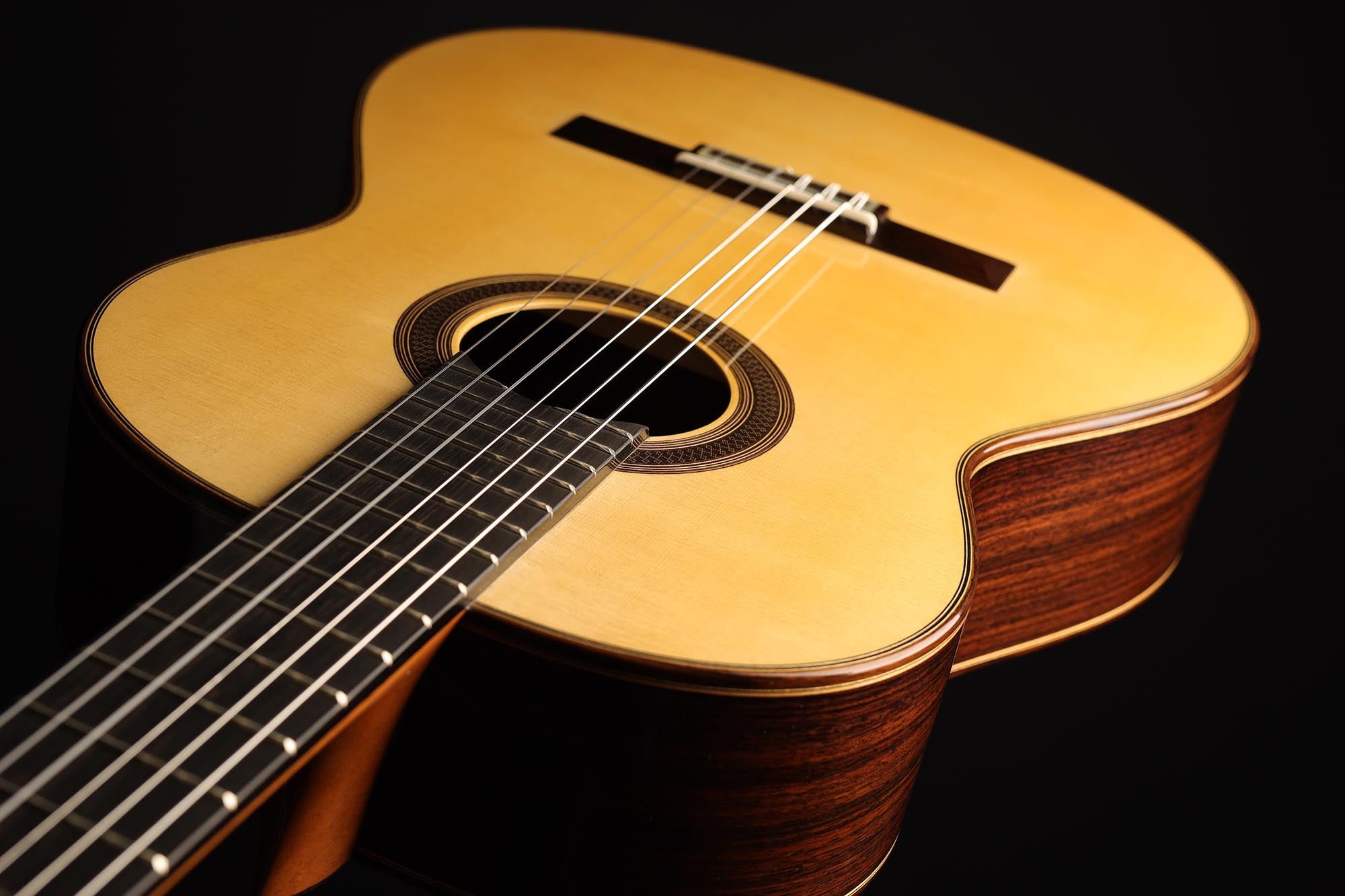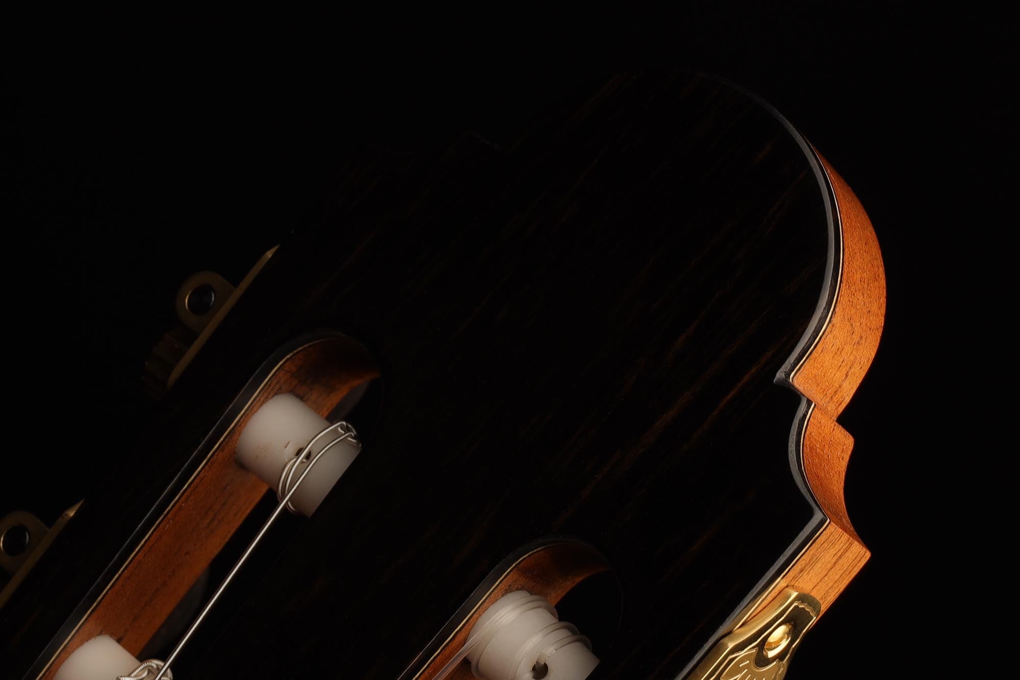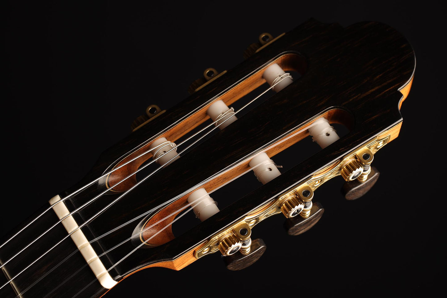 In fact, this one centimeter difference makes left-hand playing more comfortable and enables one to approach the repertoire of composers such as Agustin Barrios Mangoré, Fernando Sor, Napoleon Coste, etc. with great ease. On the other hand, this guitar is an excellent concert instrument with a spruce top and Indian rosewood back and sides. The bracing is made on the model of Robert Bouchet's, with a transversal bar added to the fan bracing, called "barre d'âme".