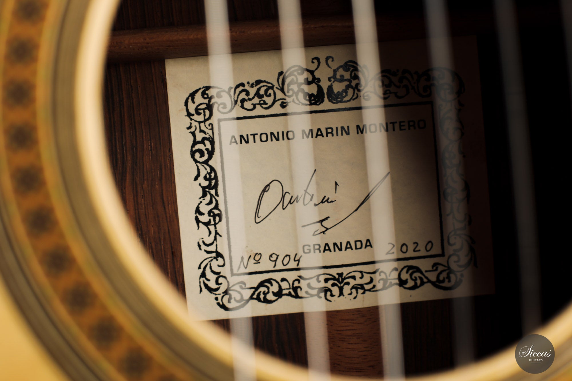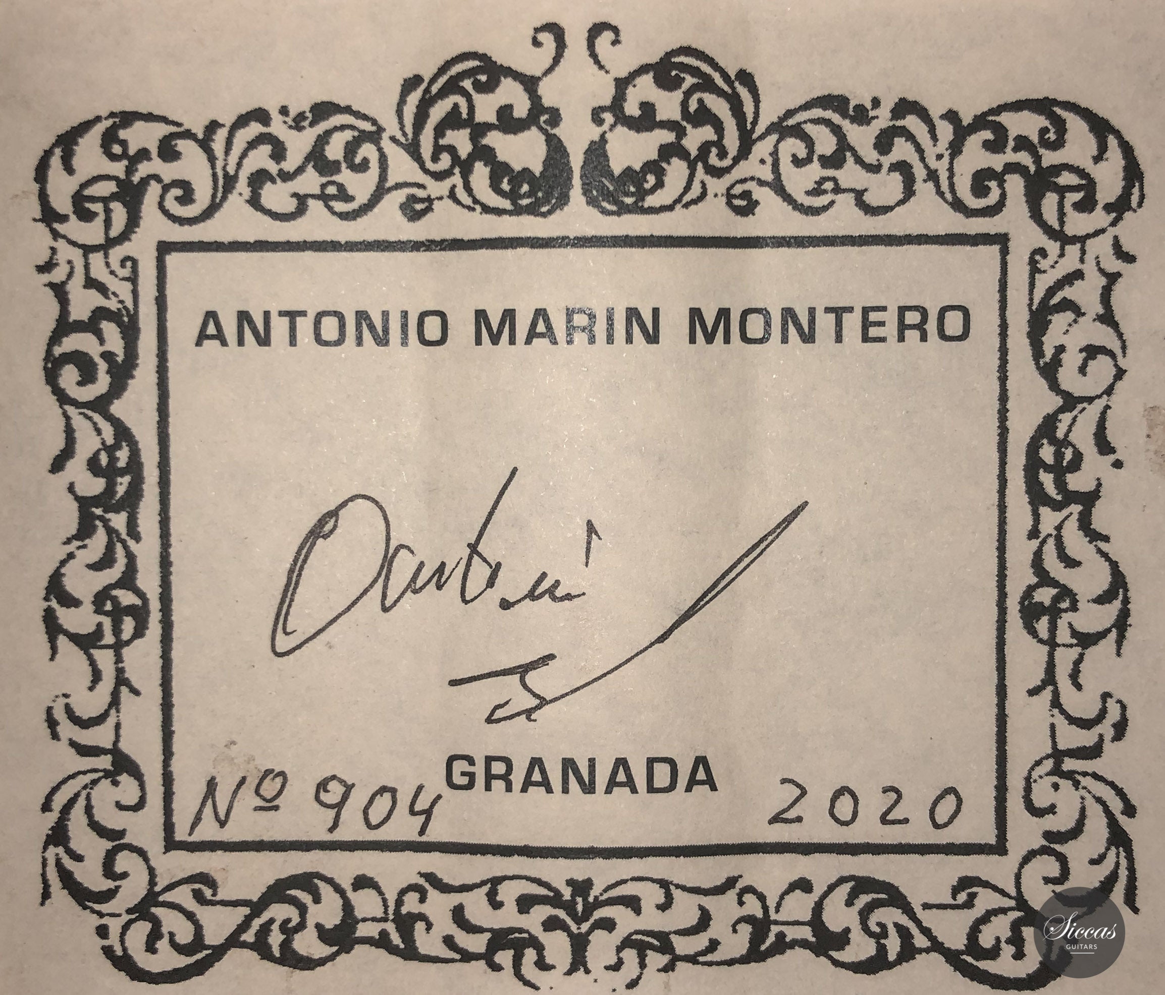 This superb and important guitar numbered 904 is a rare Brazilian Rosewood (CITES certified) Special Edition. It features many unique details, which make it a true work of art. The exclusivity of the woods used is obvious, and one can only admire the quality of the chosen timbers. This 2020 model with traditional Spanish bracing is very light and built with a very responsive soundboard made of first-class “bear claw” spruce, a very rare detail in Marin Montero’s production. The set of Cites certified Brazilian rosewood has a tight and parallel grain, which is very homogeneous and shows some vivid colors. On the edges, the wood becomes very dark which gives it a subtle elegance. It is important to note that this guitar is one of the few to have its number written on the label.