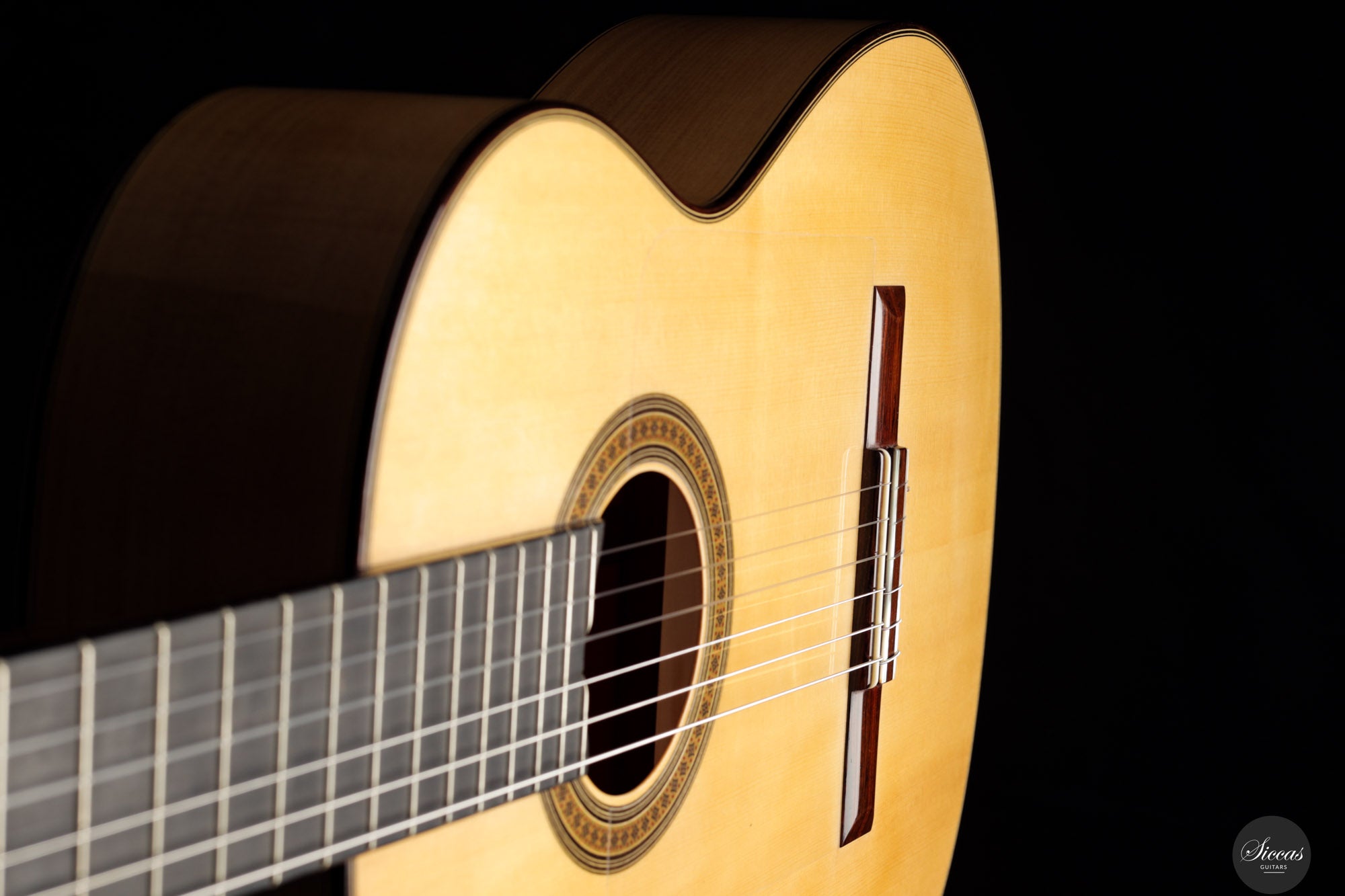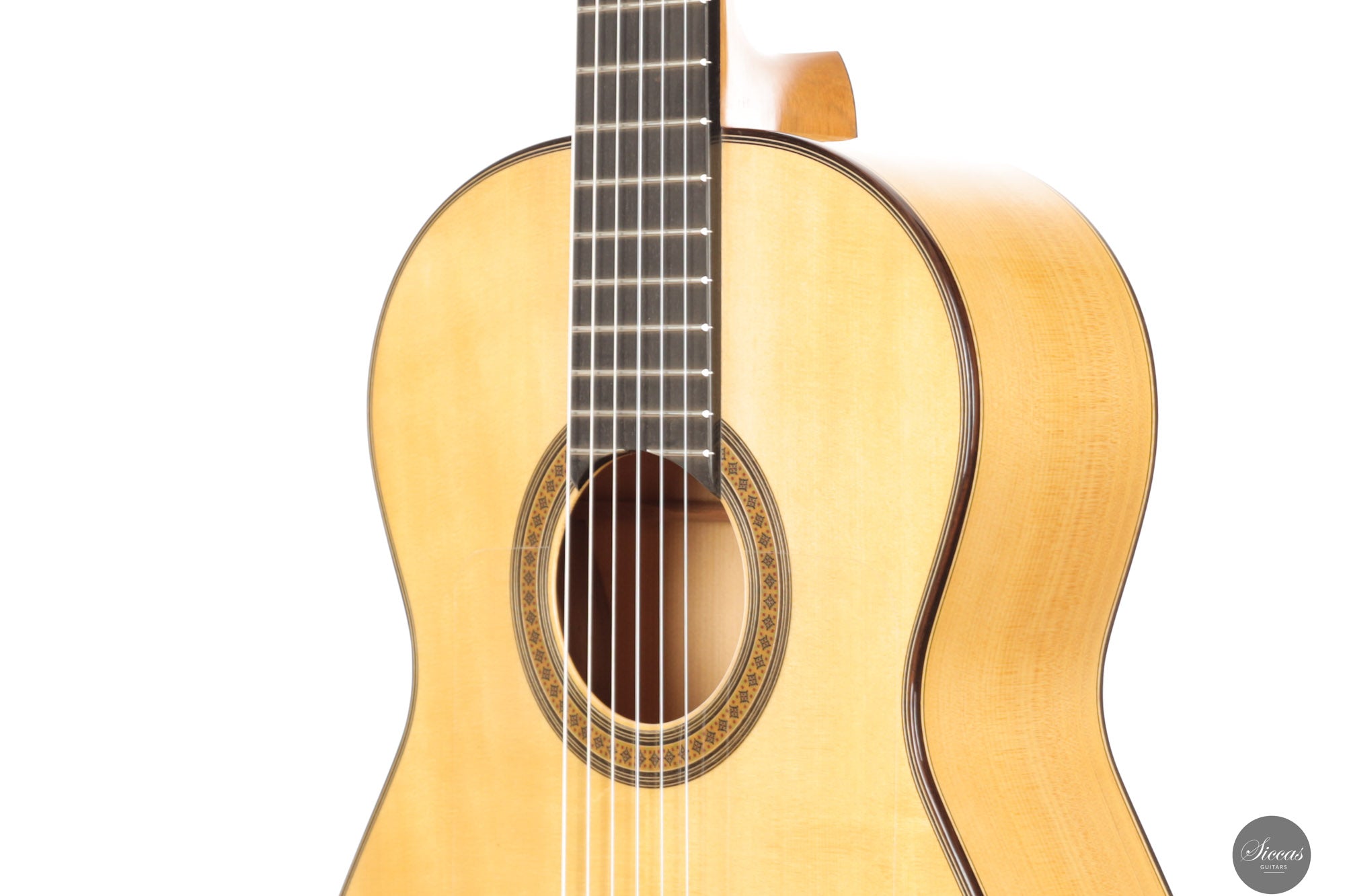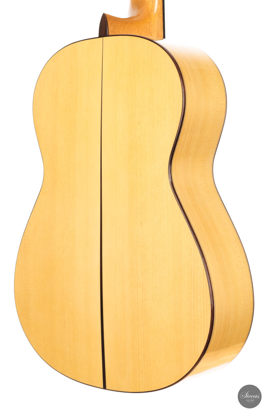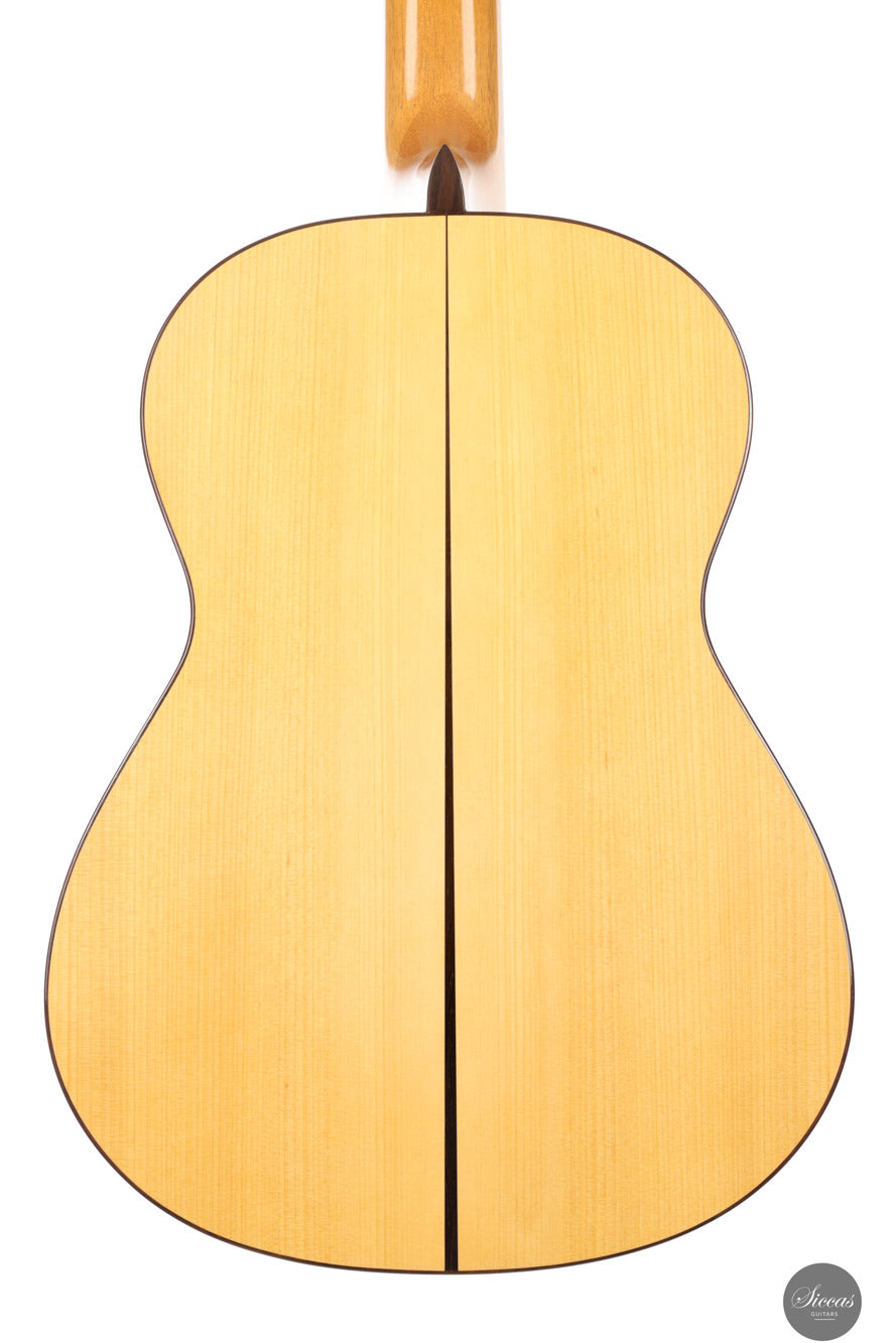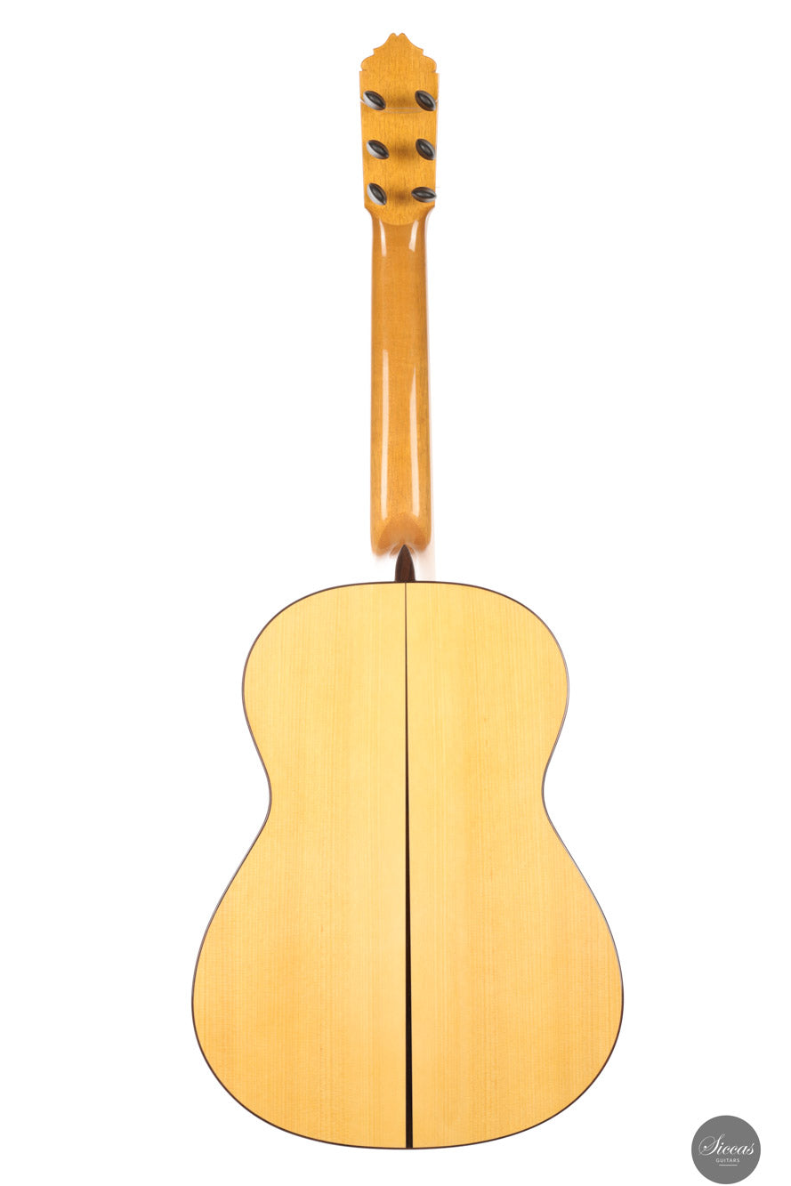 Diese 2024 gebaute Flamenca Blanca mit der Nummer 934 gehört zu den allerletzten Gitarren von Antonio Marín Montero. Mit Fichtendecke sowie Boden und Zargen aus Zypresse verkörpert sie die Direktheit und Brillanz einer traditionellen Flamencogitarre, bietet jedoch zugleich eine außergewöhnliche Vielseitigkeit, die sie auch für klassische Literatur interessant macht. Der Klang ist farbenreich, luftig und obertonreich, dabei zugleich bemerkenswert rund und angenehm im Spiel – Eigenschaften, die sie von vielen anderen Fichte-Zypresse-Gitarren unterscheiden. Die Ansprache ist schnell und sensibel, gleichzeitig erlaubt die Gitarre eine flexible Tonformung durch den Spieler. Ausgestattet ist sie mit mechanisierten Wirbeln, die das leichte Gewicht der Kopfplatte und damit die typischen Flamenco-Klangeigenschaften bewahren, zugleich jedoch eine komfortable Stimmung und einfache Wartung wie bei modernen Mechaniken ermöglichen. Dieses Instrument setzt einen außergewöhnlich hohen Maßstab und ist sowohl Höhepunkt von Maríns Lebenswerk als auch ein Bezugspunkt für kommende Generationen von Flamencobauern.Zustand: