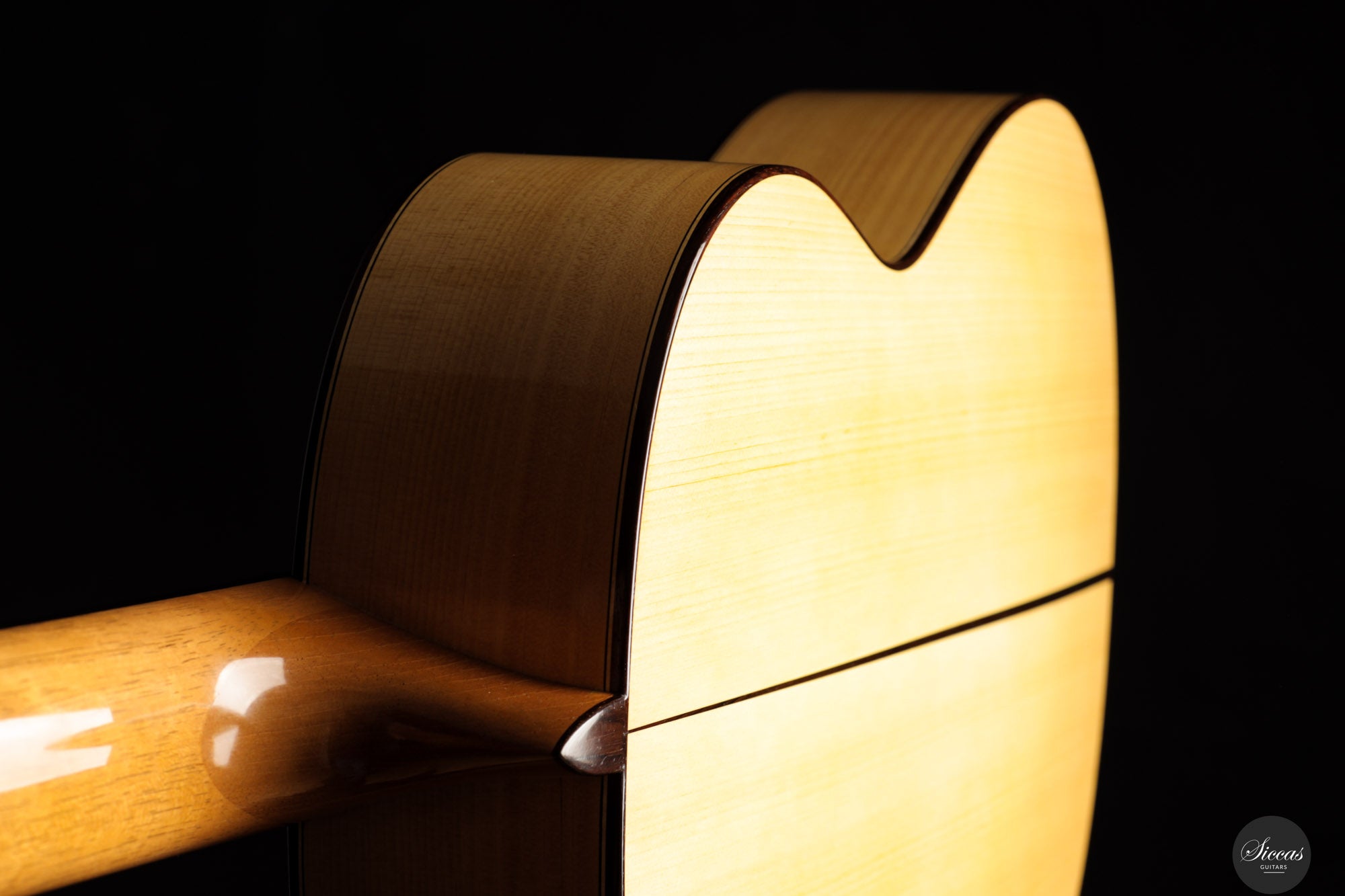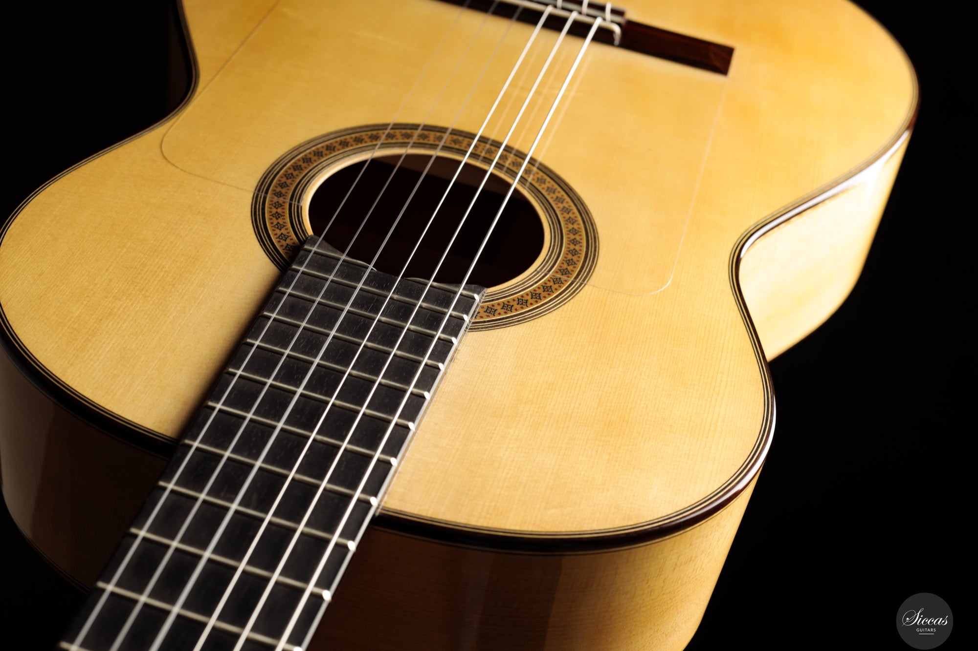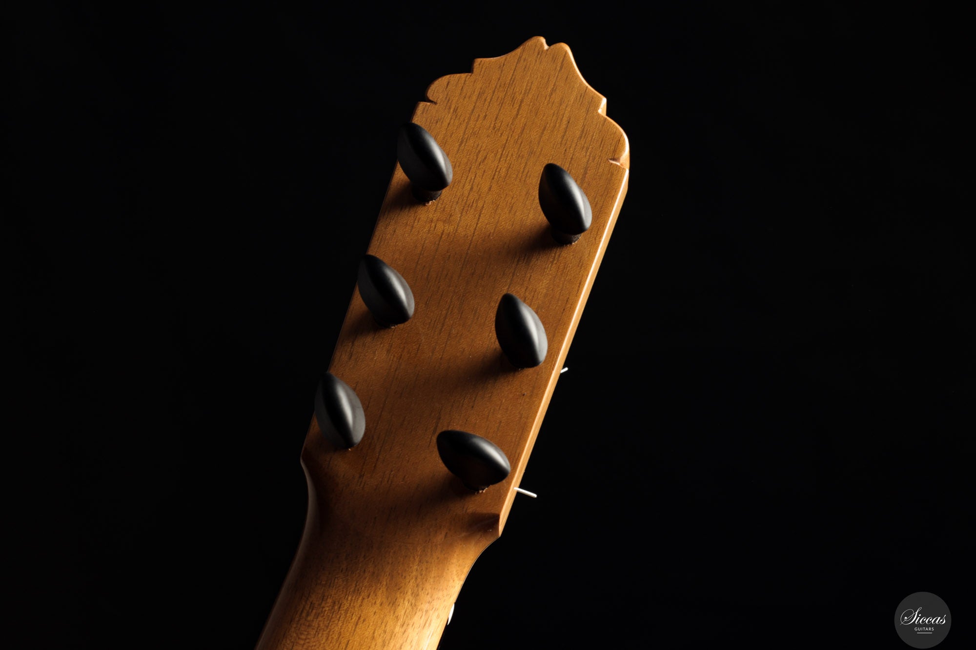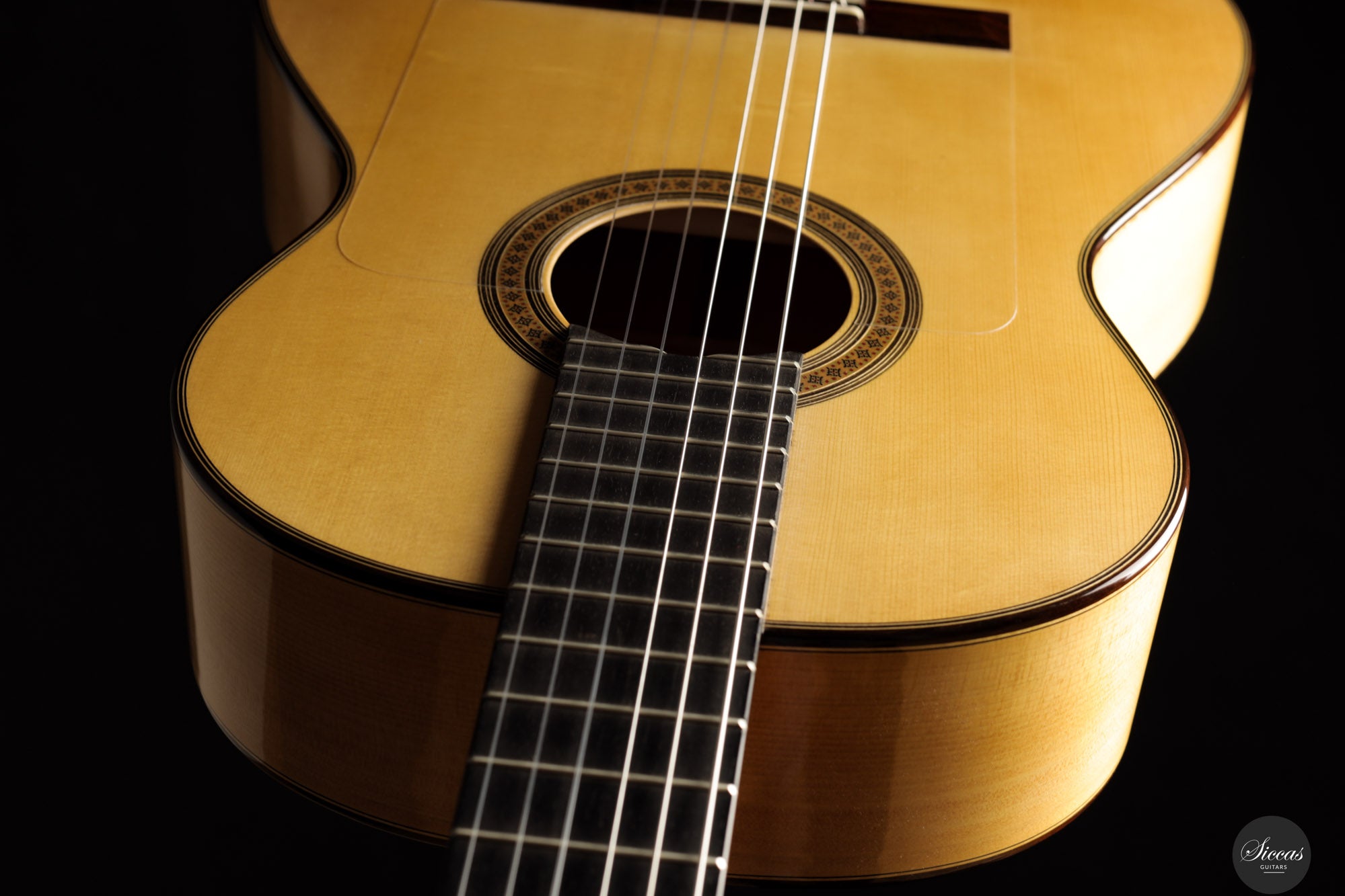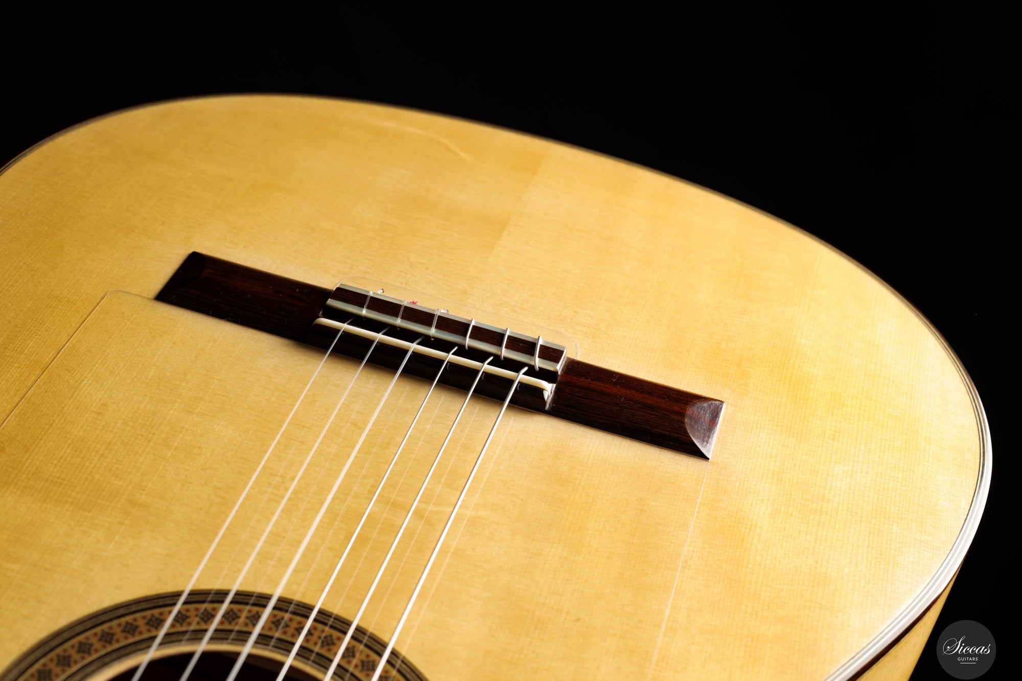 Diese 2024 gebaute Flamenca Blanca mit der Nummer 934 gehört zu den allerletzten Gitarren von Antonio Marín Montero. Mit Fichtendecke sowie Boden und Zargen aus Zypresse verkörpert sie die Direktheit und Brillanz einer traditionellen Flamencogitarre, bietet jedoch zugleich eine außergewöhnliche Vielseitigkeit, die sie auch für klassische Literatur interessant macht. Der Klang ist farbenreich, luftig und obertonreich, dabei zugleich bemerkenswert rund und angenehm im Spiel – Eigenschaften, die sie von vielen anderen Fichte-Zypresse-Gitarren unterscheiden. Die Ansprache ist schnell und sensibel, gleichzeitig erlaubt die Gitarre eine flexible Tonformung durch den Spieler. Ausgestattet ist sie mit mechanisierten Wirbeln, die das leichte Gewicht der Kopfplatte und damit die typischen Flamenco-Klangeigenschaften bewahren, zugleich jedoch eine komfortable Stimmung und einfache Wartung wie bei modernen Mechaniken ermöglichen. Dieses Instrument setzt einen außergewöhnlich hohen Maßstab und ist sowohl Höhepunkt von Maríns Lebenswerk als auch ein Bezugspunkt für kommende Generationen von Flamencobauern.Zustand: