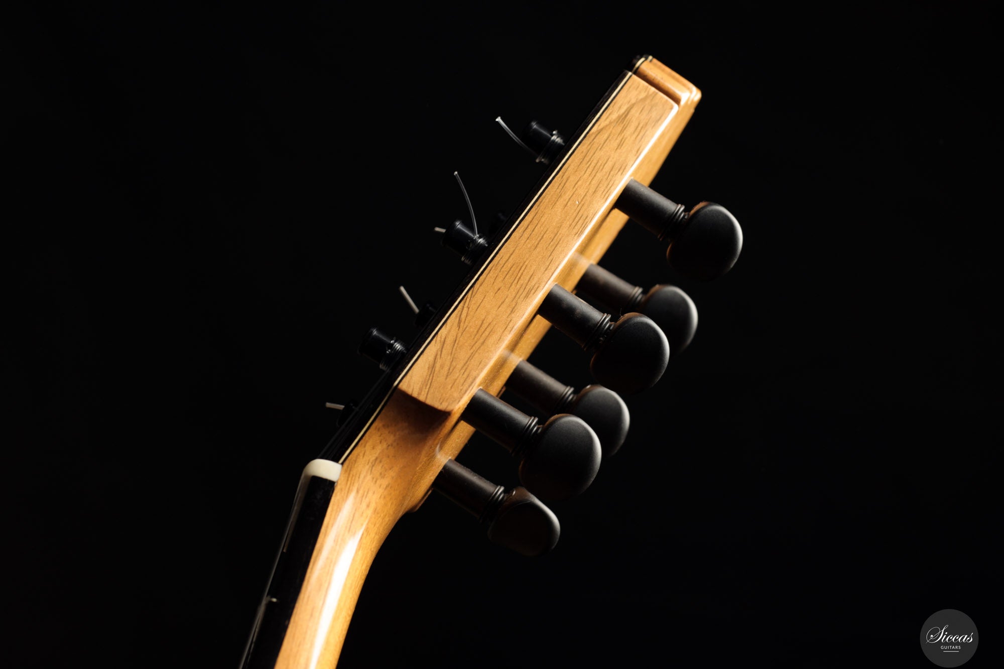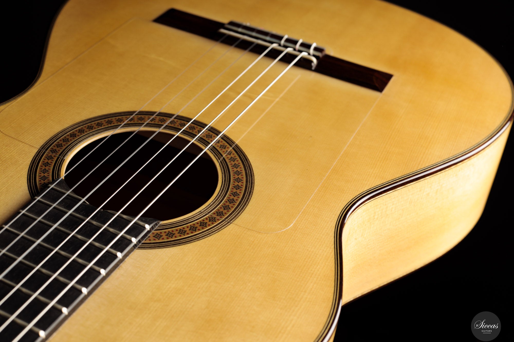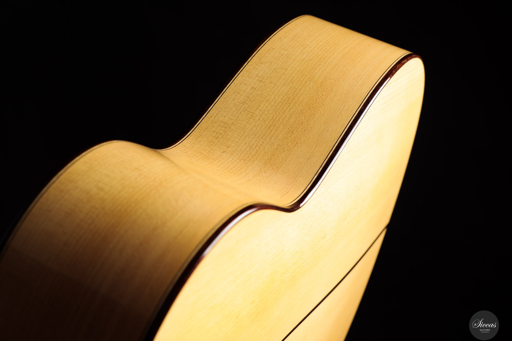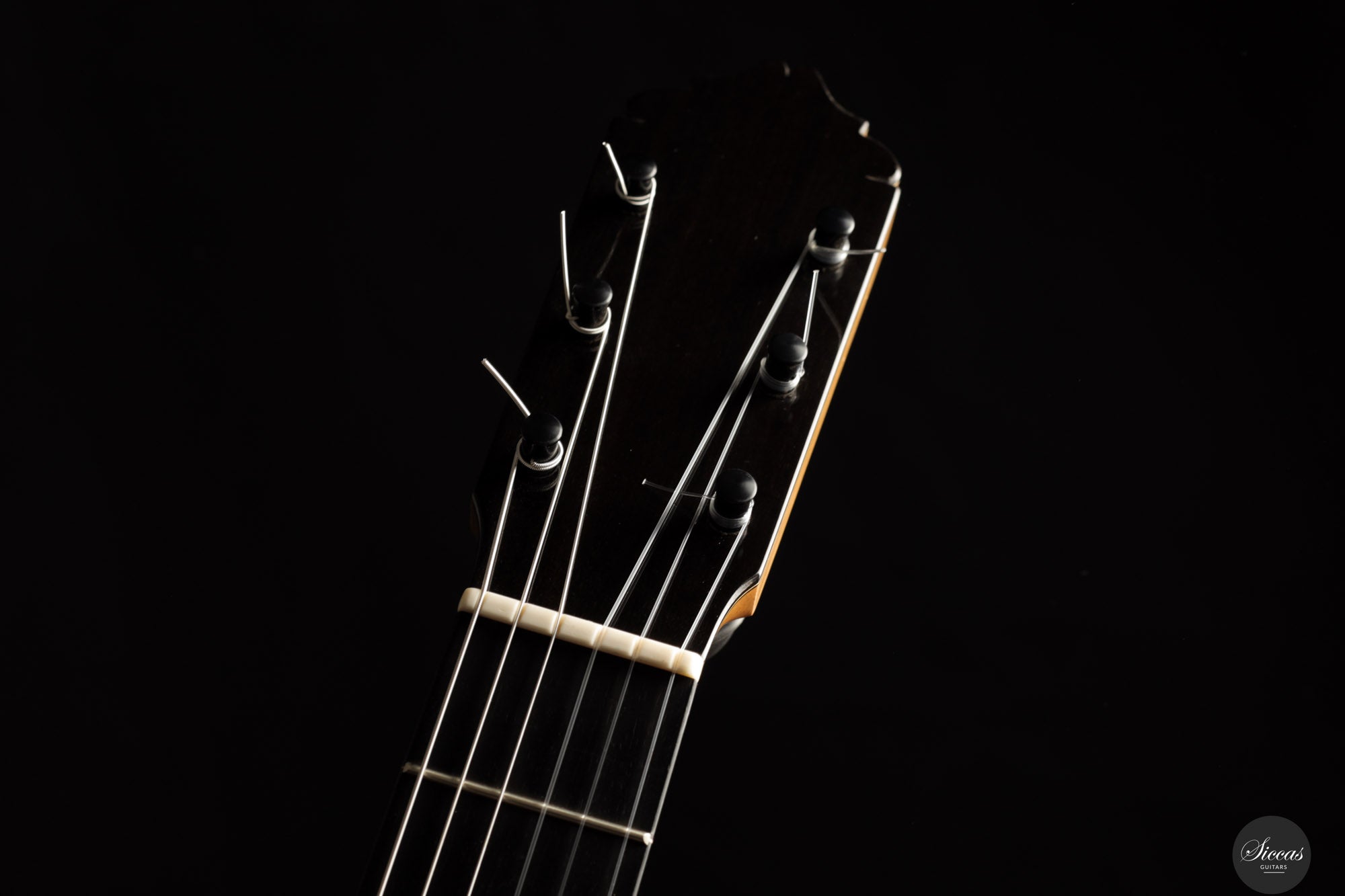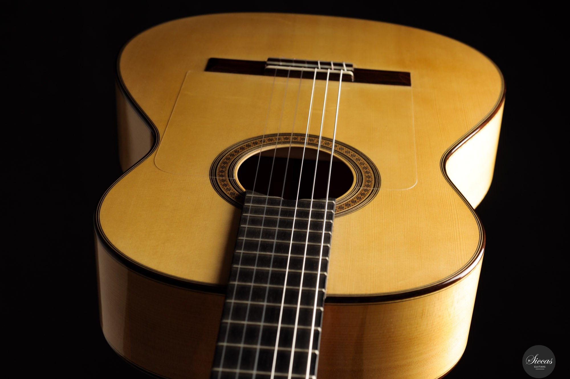 Diese 2024 gebaute Flamenca Blanca mit der Nummer 934 gehört zu den allerletzten Gitarren von Antonio Marín Montero. Mit Fichtendecke sowie Boden und Zargen aus Zypresse verkörpert sie die Direktheit und Brillanz einer traditionellen Flamencogitarre, bietet jedoch zugleich eine außergewöhnliche Vielseitigkeit, die sie auch für klassische Literatur interessant macht. Der Klang ist farbenreich, luftig und obertonreich, dabei zugleich bemerkenswert rund und angenehm im Spiel – Eigenschaften, die sie von vielen anderen Fichte-Zypresse-Gitarren unterscheiden. Die Ansprache ist schnell und sensibel, gleichzeitig erlaubt die Gitarre eine flexible Tonformung durch den Spieler. Ausgestattet ist sie mit mechanisierten Wirbeln, die das leichte Gewicht der Kopfplatte und damit die typischen Flamenco-Klangeigenschaften bewahren, zugleich jedoch eine komfortable Stimmung und einfache Wartung wie bei modernen Mechaniken ermöglichen. Dieses Instrument setzt einen außergewöhnlich hohen Maßstab und ist sowohl Höhepunkt von Maríns Lebenswerk als auch ein Bezugspunkt für kommende Generationen von Flamencobauern.Zustand: