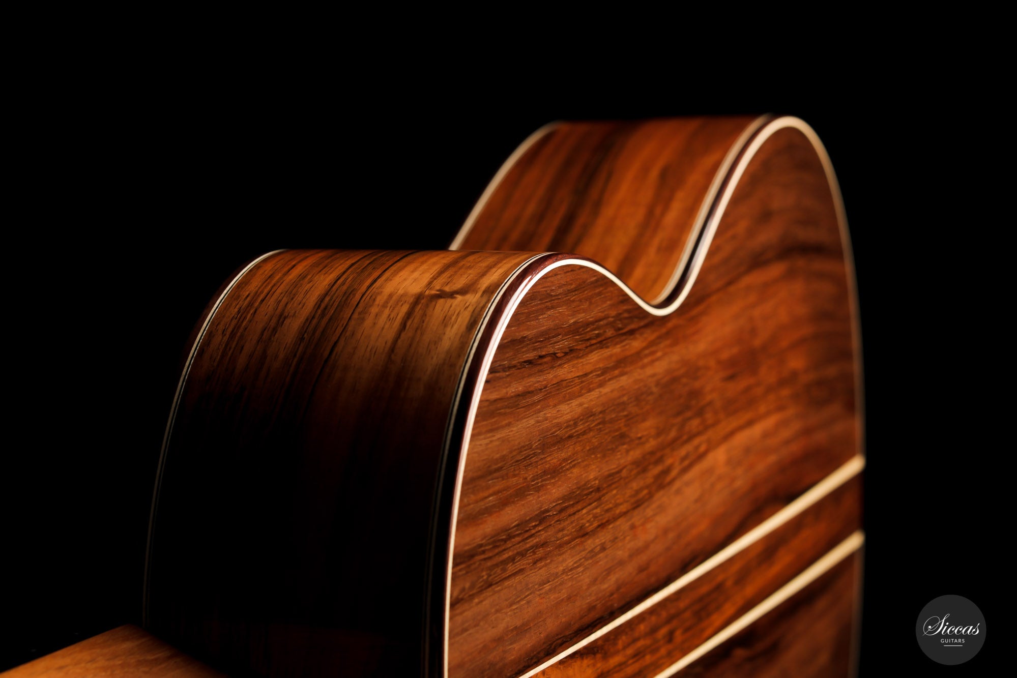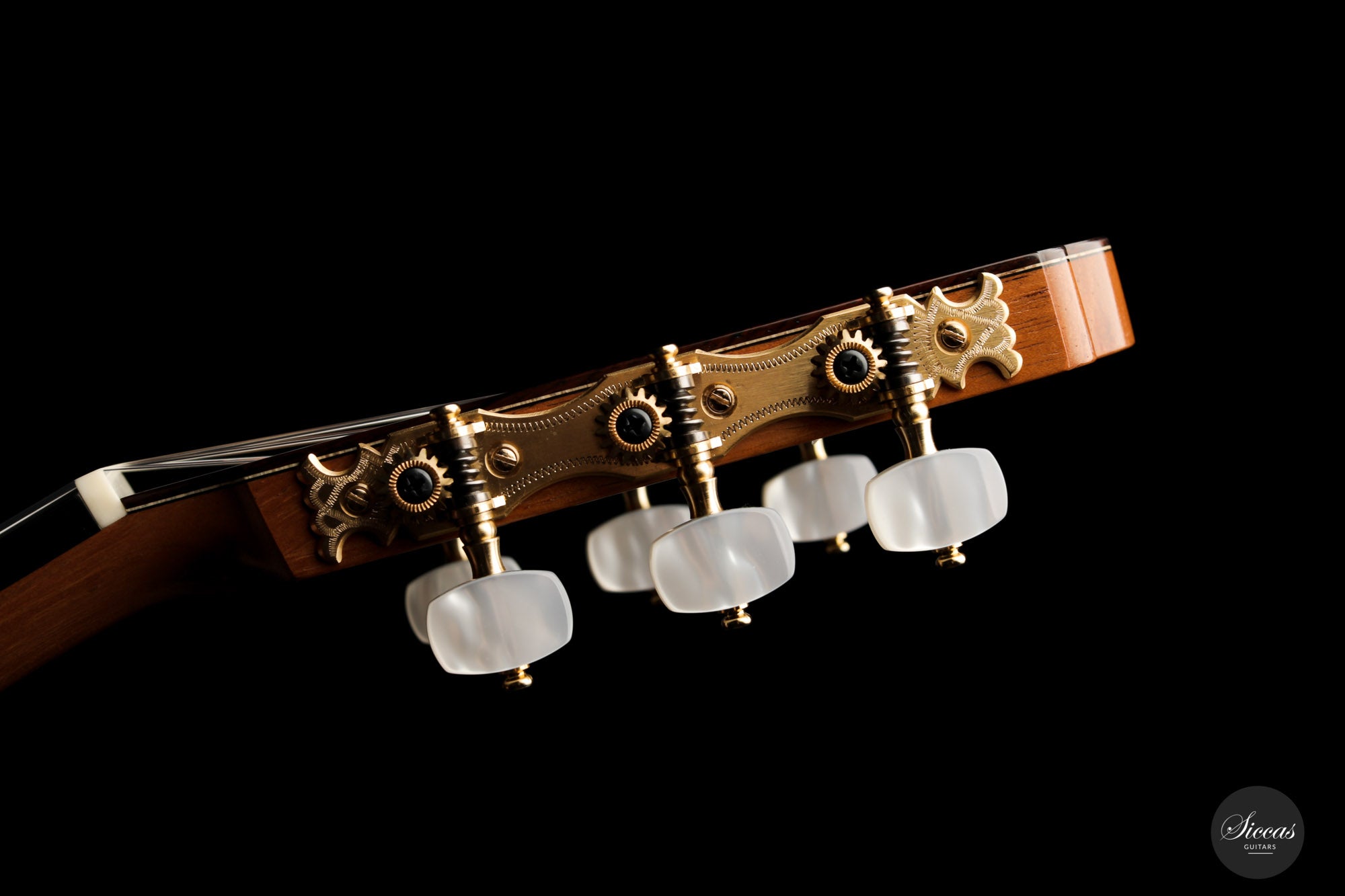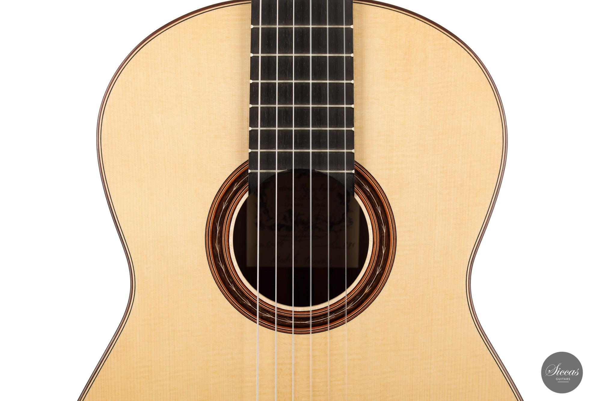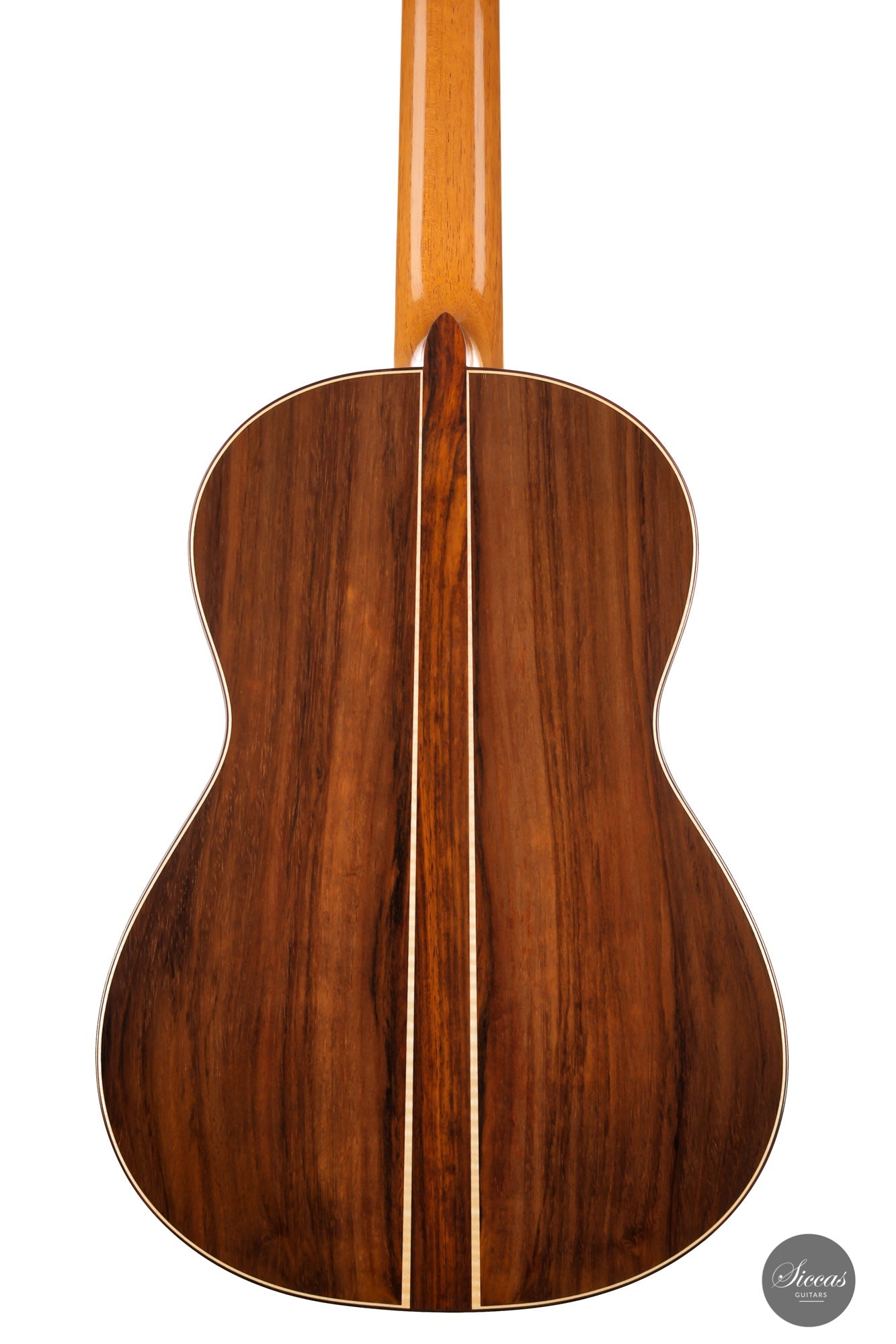 This beautiful Torres model has a slightly smaller body and is made with a gorgeous set of Pau Ferro for back and sides. This wood shows stunning orange colors with wonderful green and dark veins. The sound of this guitar is very appealing with rich timbres and clarity in the treble. A wonderful guitar that is suitable not only for a wide repertoire but also especially for guitarists who prefer an instrument with a slightly smaller body and expressive character.
