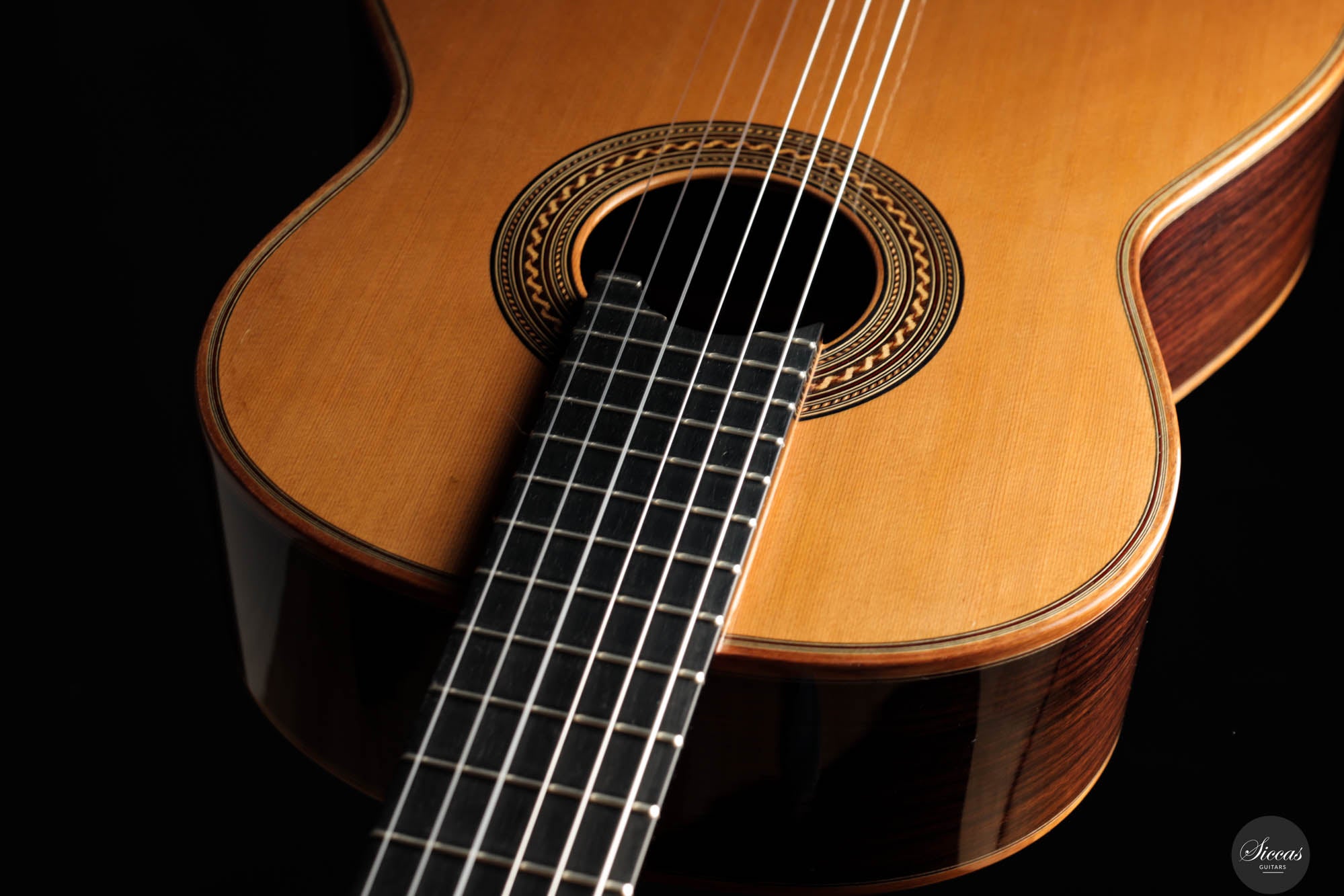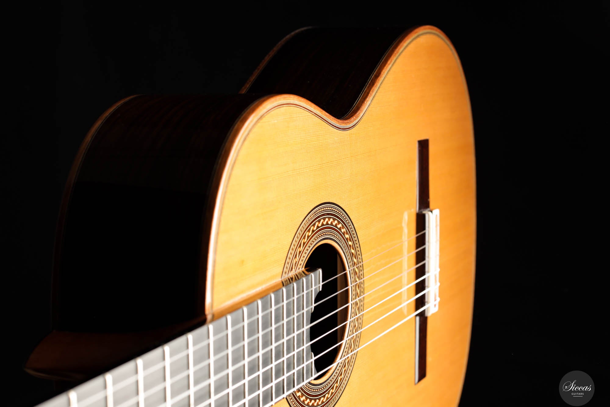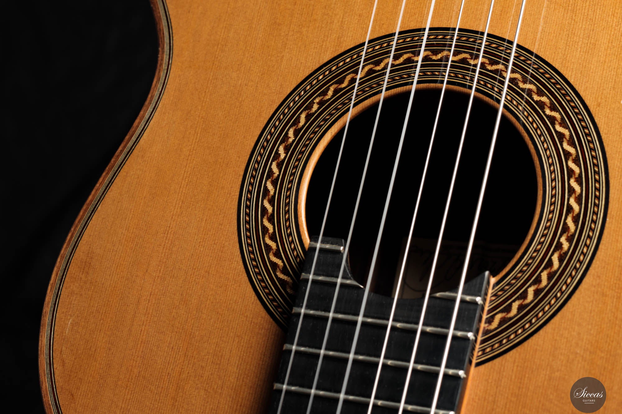 Die Spielbarkeit des Instruments sticht bemerkenswert hervor und bietet unvergleichliche Leichtigkeit und Komfort für beide Hände. Sein Design ermöglicht ein außergewöhnliches Spielerlebnis, bei dem der Spieler sich mühelos ausdrücken kann, ohne körperliche Anstrengung. Die Lautstärke der Gitarre ist nicht nur laut, sondern auch mit einem langen Sustain und orchestralen sympathischen Resonanzen angereichert, was eine lyrische Dimension zu ihrem Klang hinzufügt. Dies führt zu einem Ton, der den Raum mit Wärme füllt, charakterisiert durch ein dunkles Timbre, das nicht auf Klarheit verzichtet. Die hervorragende Trennung der Stimmen innerhalb des Klangspektrums der Gitarre gewährleistet ein ausgewogenes Verhältnis zwischen den Bass- und Höhenfrequenzen, was sie zu einem anpassungsfähigen Instrument für verschiedene musikalische Genres und Spieltechniken macht. Es ist auch erwähnenswert, dass diese Gitarre mit der sehr langen Wartezeit zu den am schwersten zu erlangenden Gitarren gehört.