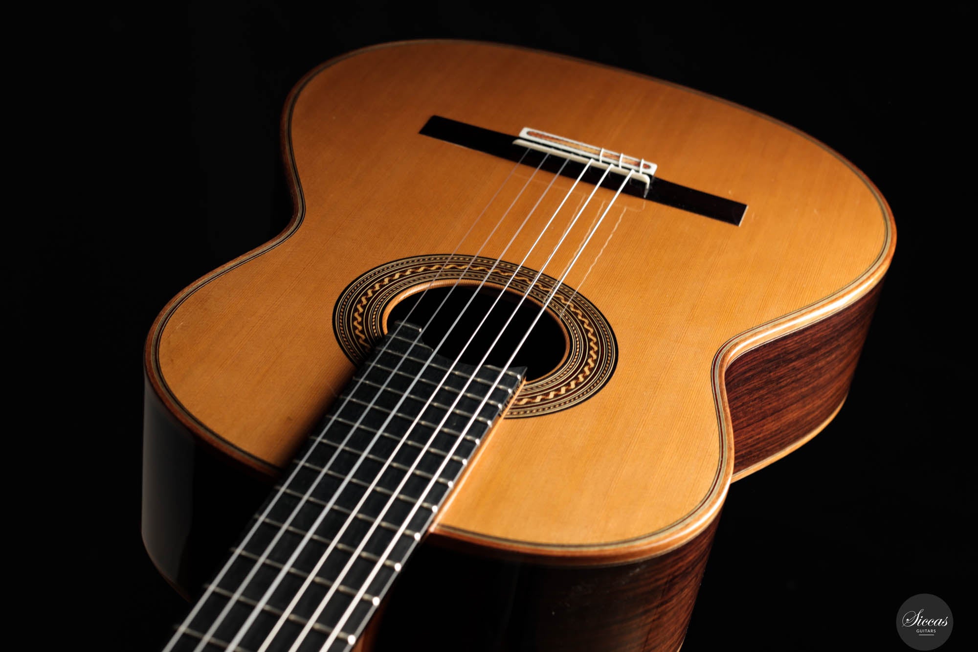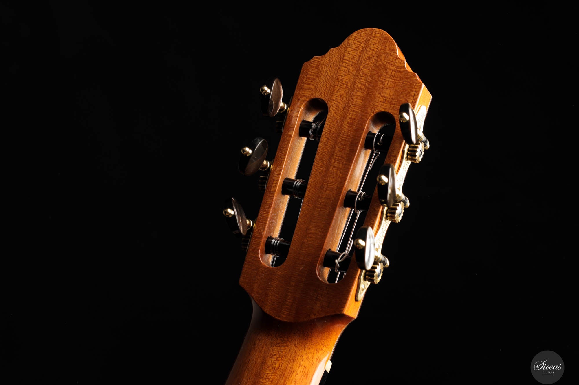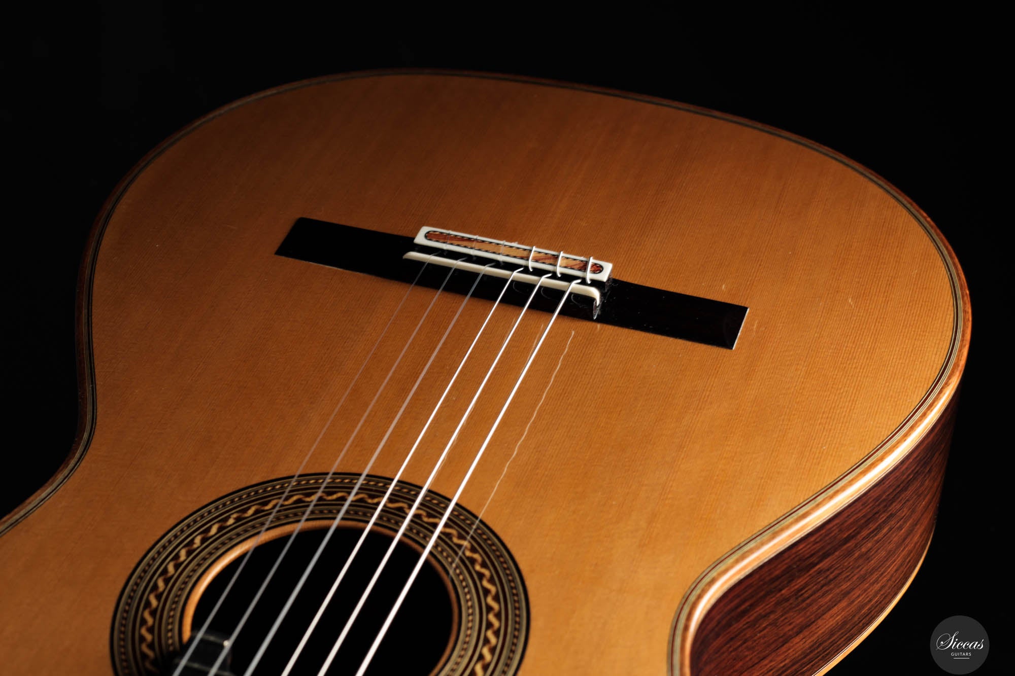 Die Spielbarkeit des Instruments sticht bemerkenswert hervor und bietet unvergleichliche Leichtigkeit und Komfort für beide Hände. Sein Design ermöglicht ein außergewöhnliches Spielerlebnis, bei dem der Spieler sich mühelos ausdrücken kann, ohne körperliche Anstrengung. Die Lautstärke der Gitarre ist nicht nur laut, sondern auch mit einem langen Sustain und orchestralen sympathischen Resonanzen angereichert, was eine lyrische Dimension zu ihrem Klang hinzufügt. Dies führt zu einem Ton, der den Raum mit Wärme füllt, charakterisiert durch ein dunkles Timbre, das nicht auf Klarheit verzichtet. Die hervorragende Trennung der Stimmen innerhalb des Klangspektrums der Gitarre gewährleistet ein ausgewogenes Verhältnis zwischen den Bass- und Höhenfrequenzen, was sie zu einem anpassungsfähigen Instrument für verschiedene musikalische Genres und Spieltechniken macht. Es ist auch erwähnenswert, dass diese Gitarre mit der sehr langen Wartezeit zu den am schwersten zu erlangenden Gitarren gehört.
