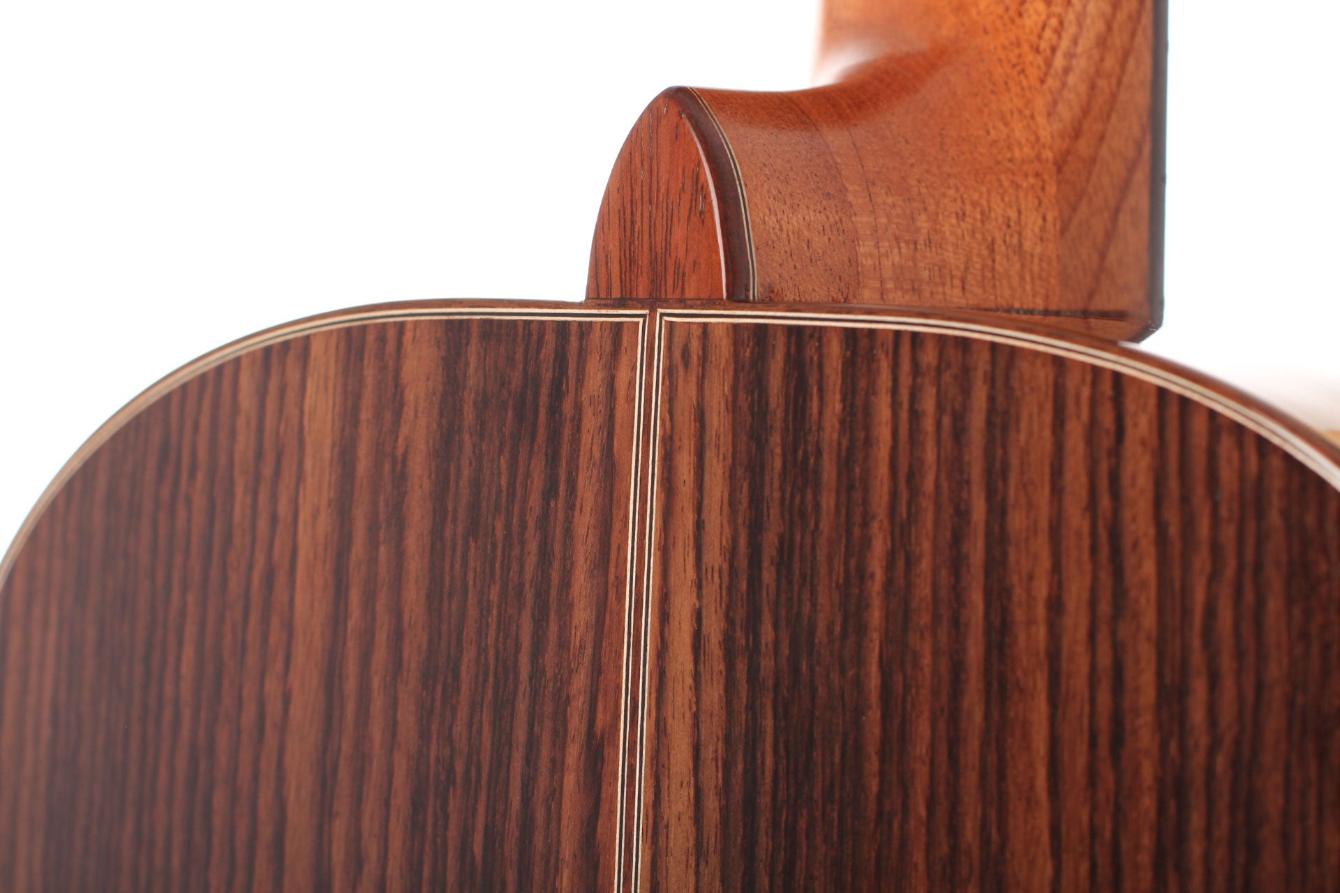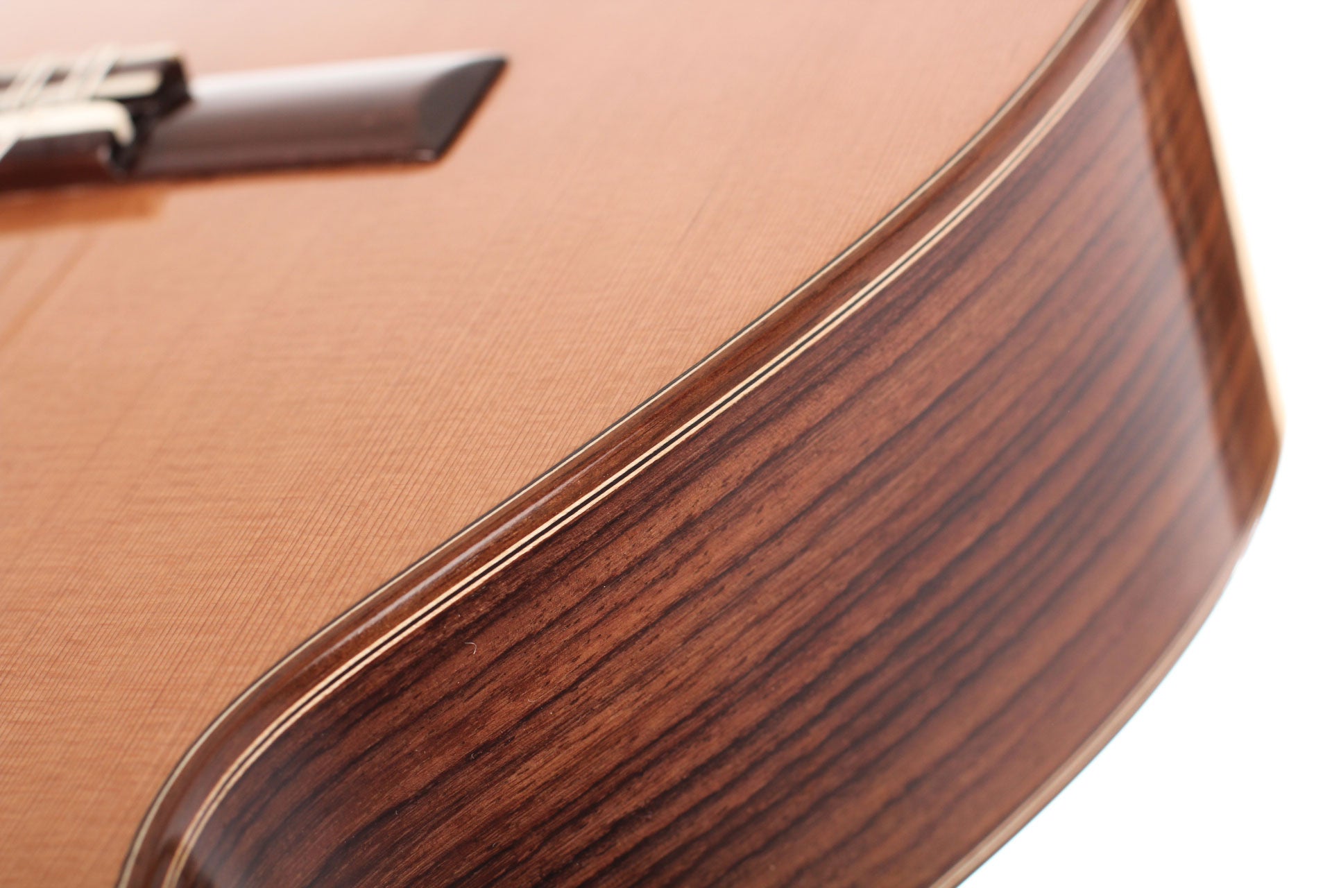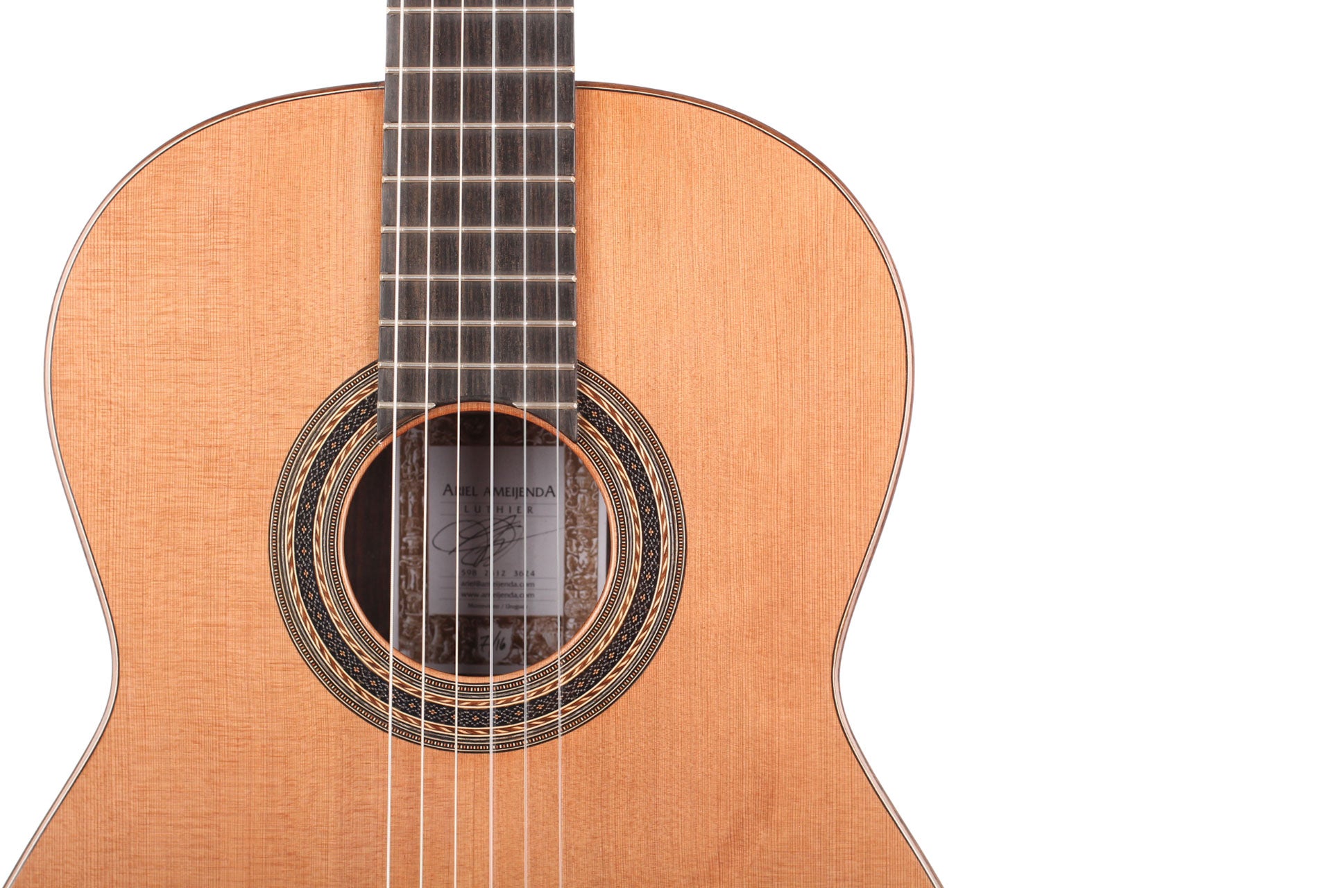Schon in der Kindheit half Ariel in der Werkstatt des Vaters mit, wo er schon früh Gitarrenbautechniken erlernte. Im Alter von 14 Jahren baute er selbstständig seine ersten Gitarren. 1997 eröffnete Ariel seine erste eigene Werkstatt in Montevideo. Seit 2014 befindet sich seine Wekstatt in Piriapolis, Uruguay. Diese Gitarre wurde 2016 gebaut und hat eine Zederndecke sowie Boden und Zargen aus Indischem Palisander. Der Klang ist sehr kräftig und warm, wie man es von einer Zederndeckengitarre erwarten würde. Zugleich ist der Diskant angenehm brillant und hat einen sehr langanhaltenden Sustain. Die Mechaniken sind von Gotoh. Inklusive Hartschalenkoffer.