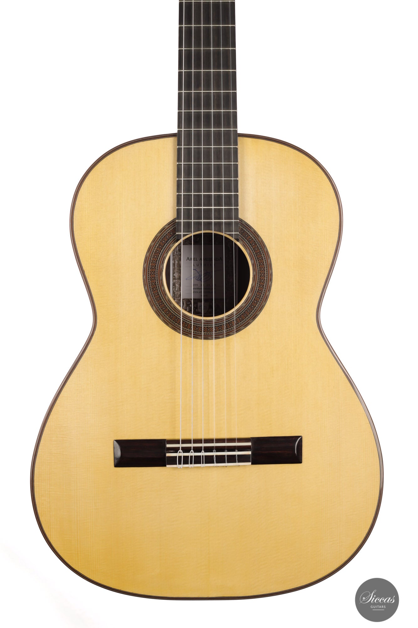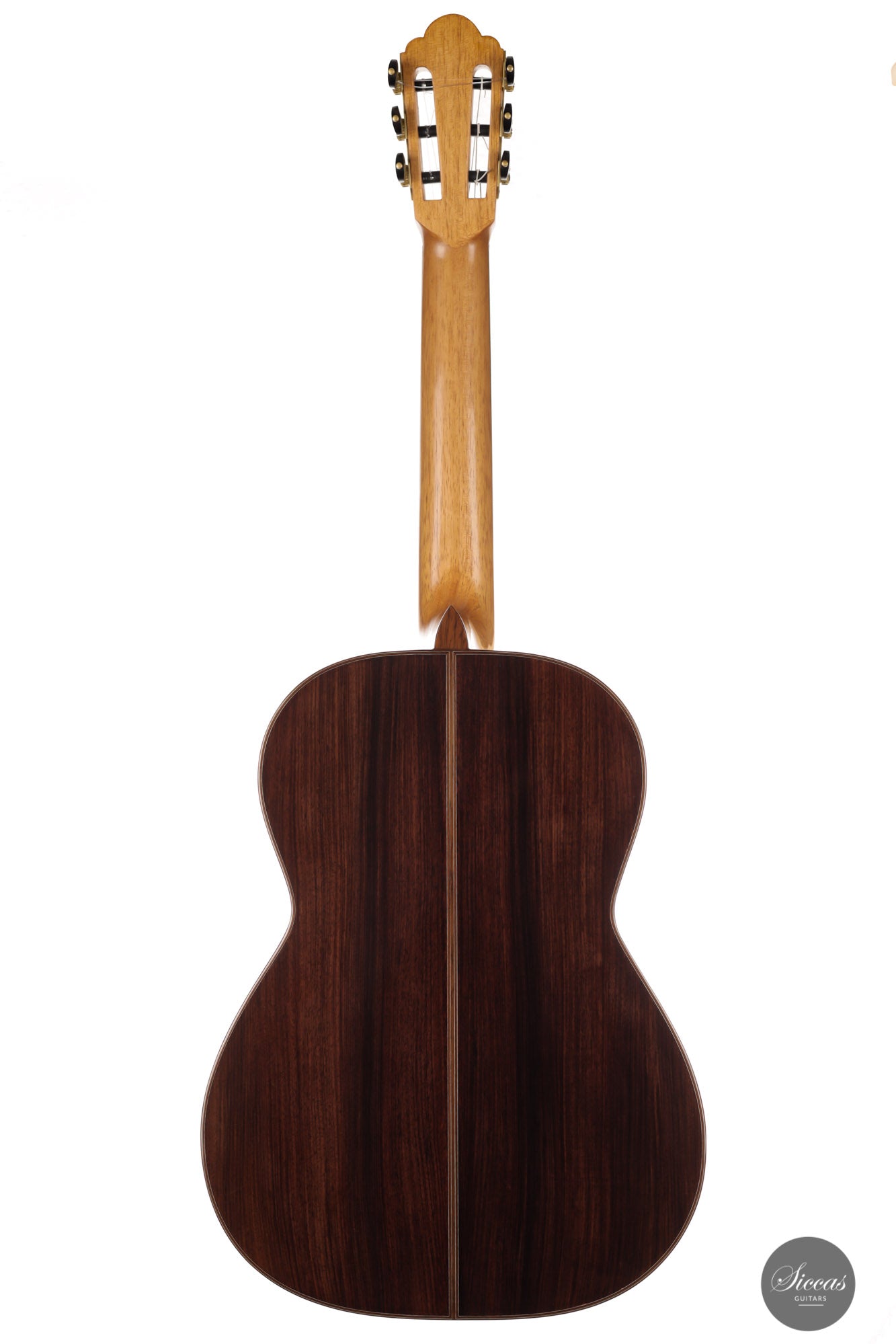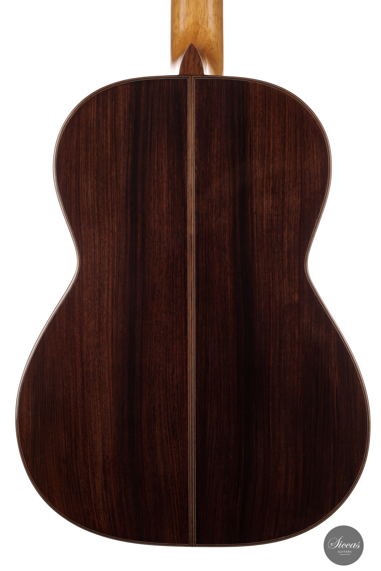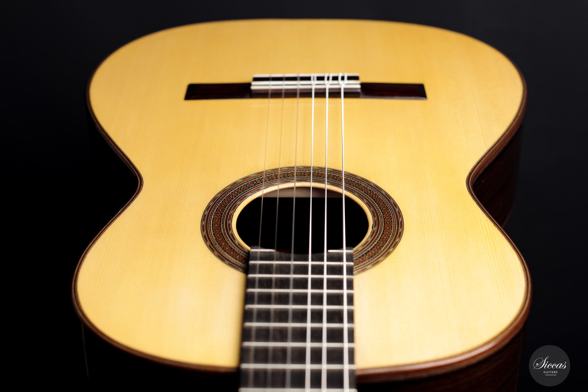 Diese Gitarre mit kürzerer Mensur ist eine Sonderanfertigung für Siccas Guitars, bei welcher der Schwerpunkt auf Klang und Spielbarkeit liegt. Sie kommt direkt aus Ariels Werkstatt und hat eine 63 cm Mensur, 2 cm kürzer als die Standard-Mensur von 65 cm, was sie sehr komfortabel für die linke Hand macht. Die Beleistung ist von Antonio de Torres' Gitarren inspiriert und macht dieses Instrument sehr reaktionsschnell, warm und fröhlich. Außerdem wurde für Boden und Zargen ein schönes Set aus dunklem indischem Palisander gewählt, das der Gitarre ein elegantes und edles Aussehen verleiht.