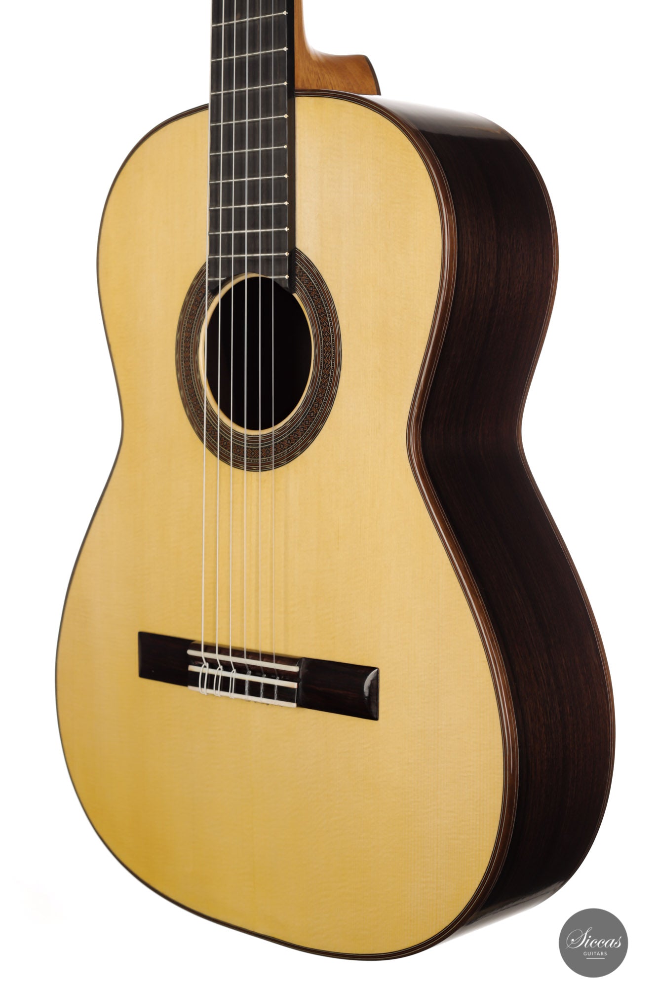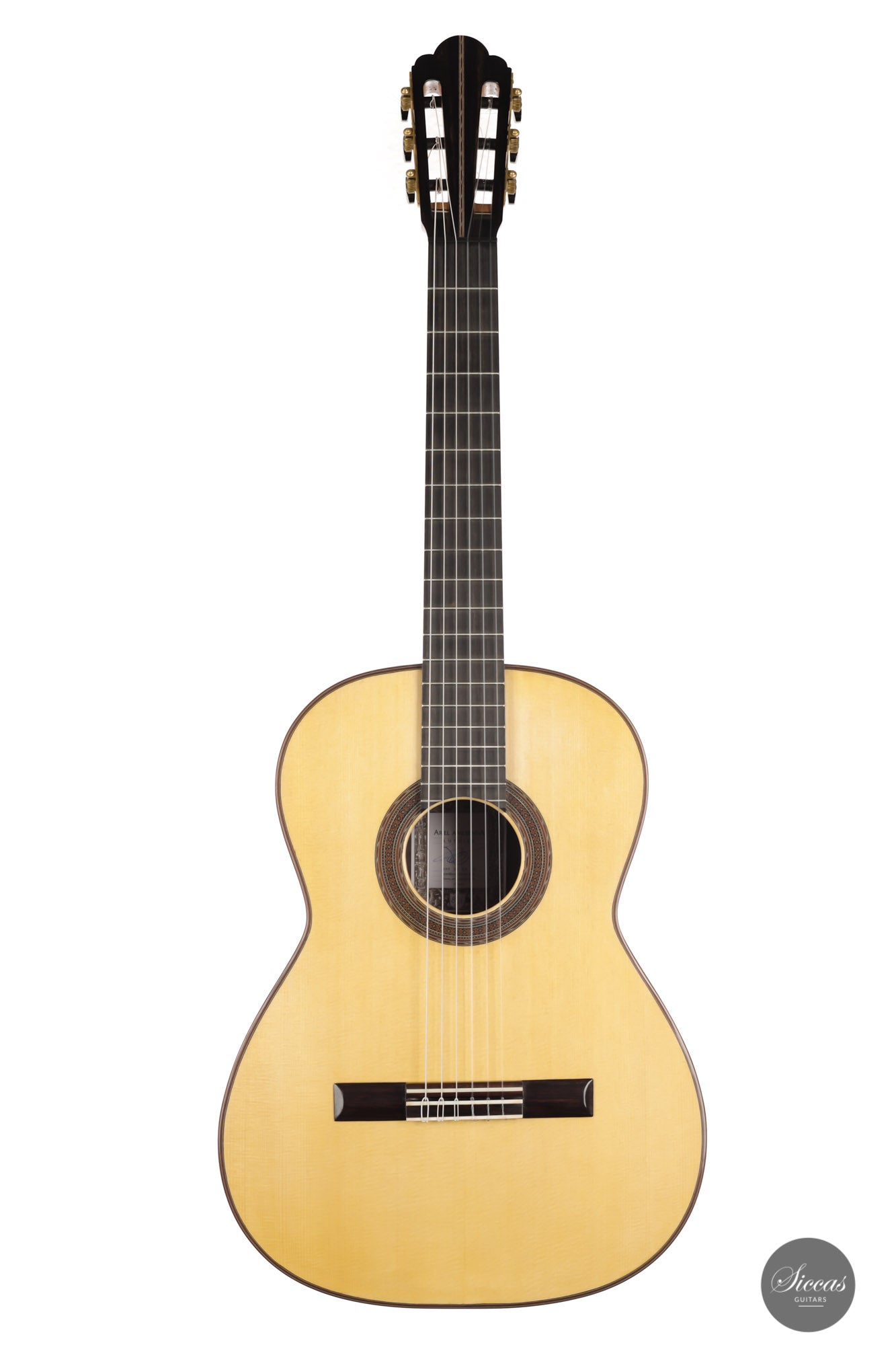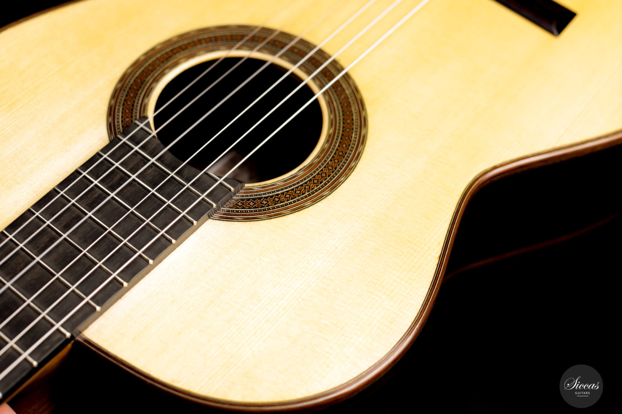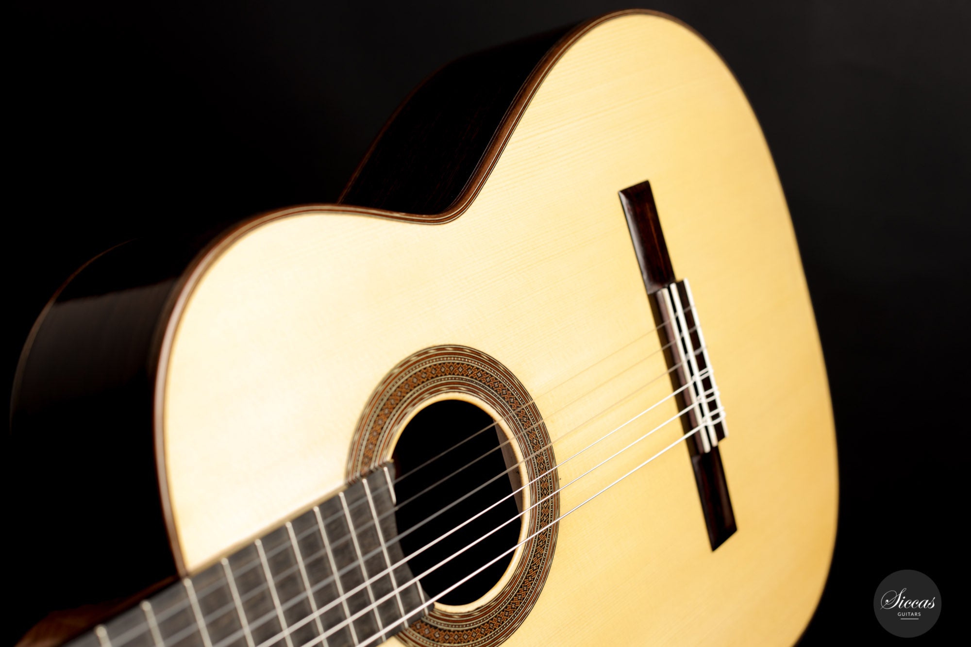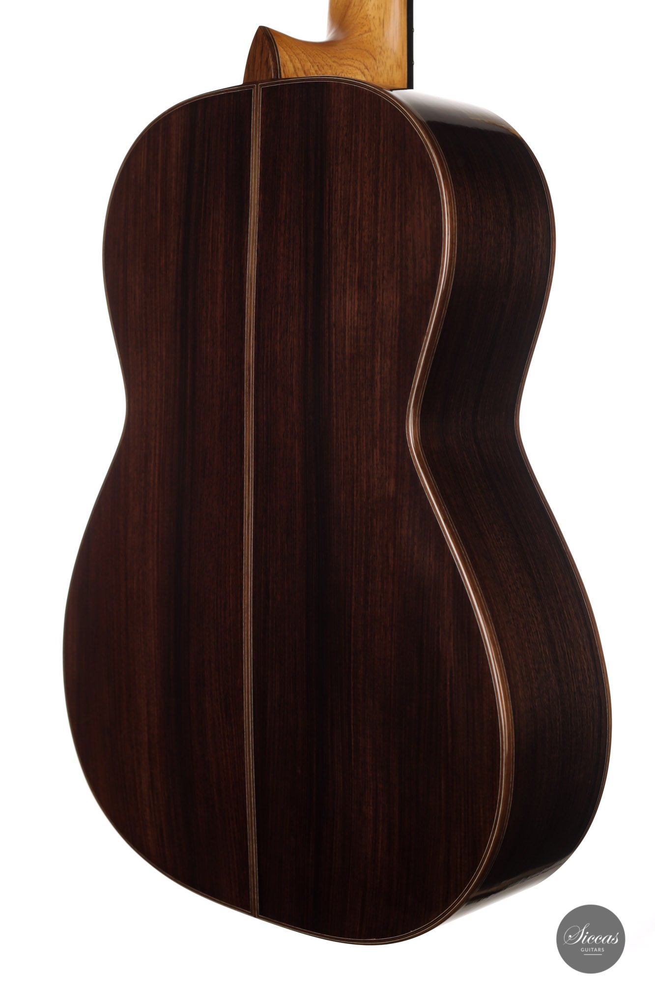 Diese Gitarre mit kürzerer Mensur ist eine Sonderanfertigung für Siccas Guitars, bei welcher der Schwerpunkt auf Klang und Spielbarkeit liegt. Sie kommt direkt aus Ariels Werkstatt und hat eine 63 cm Mensur, 2 cm kürzer als die Standard-Mensur von 65 cm, was sie sehr komfortabel für die linke Hand macht. Die Beleistung ist von Antonio de Torres' Gitarren inspiriert und macht dieses Instrument sehr reaktionsschnell, warm und fröhlich. Außerdem wurde für Boden und Zargen ein schönes Set aus dunklem indischem Palisander gewählt, das der Gitarre ein elegantes und edles Aussehen verleiht.