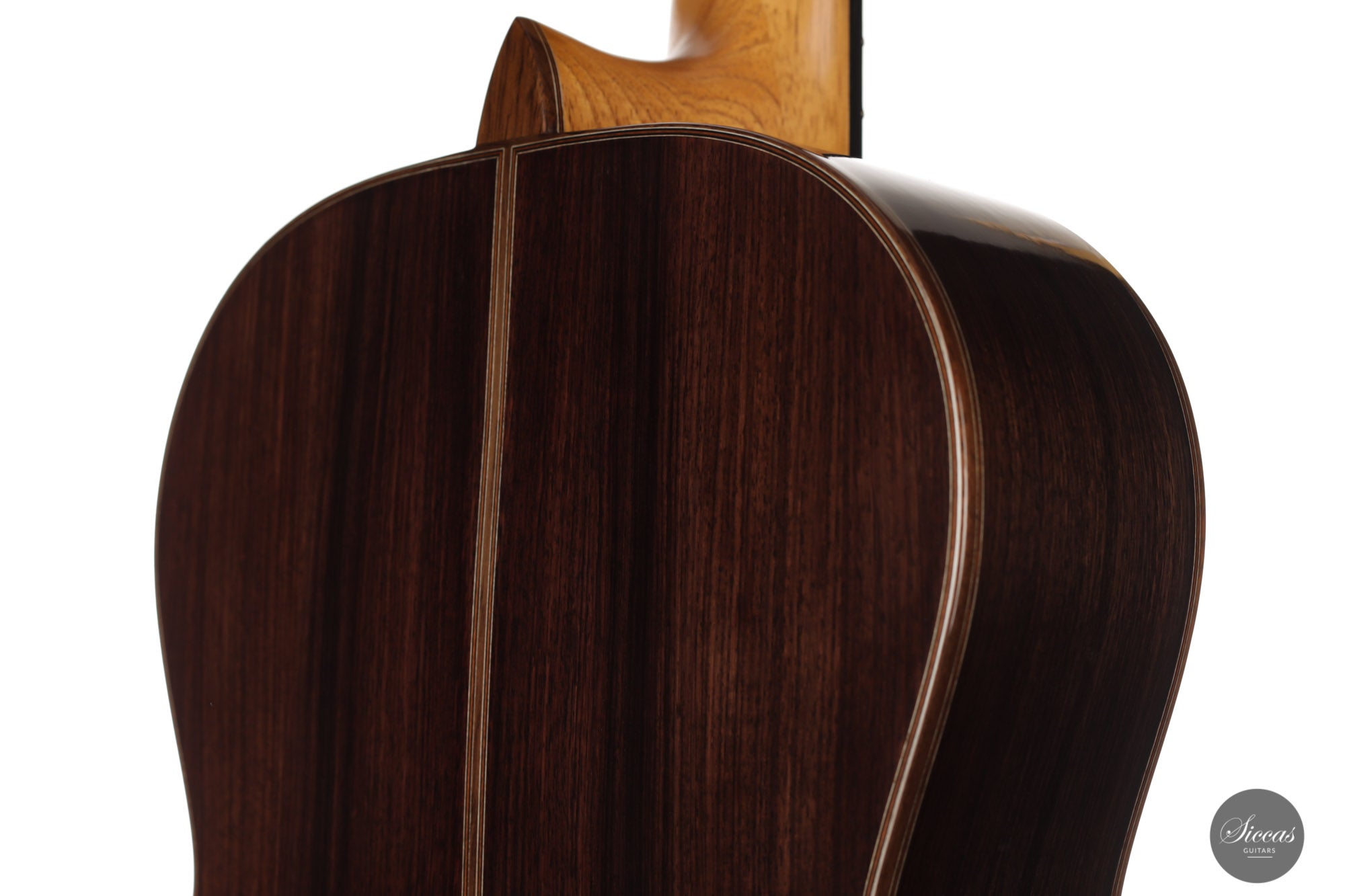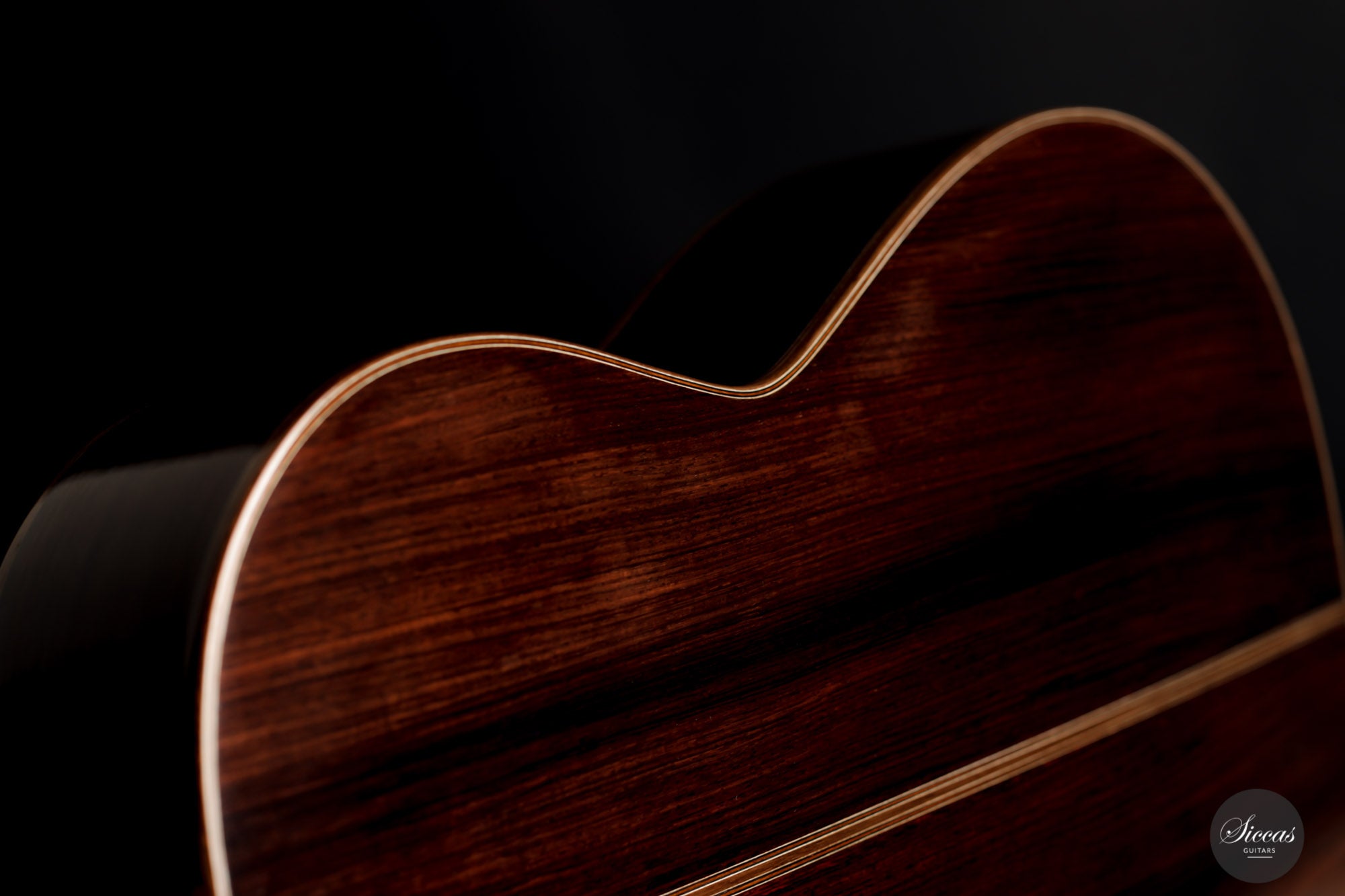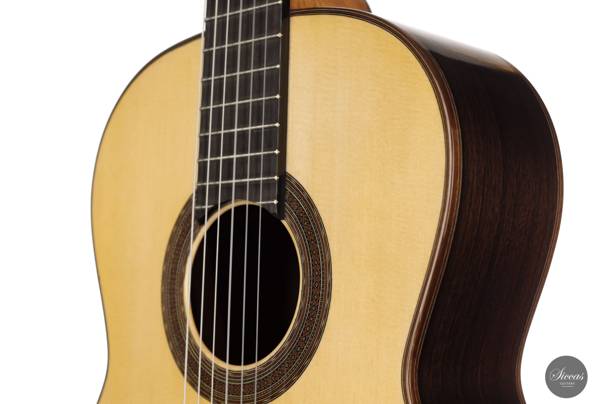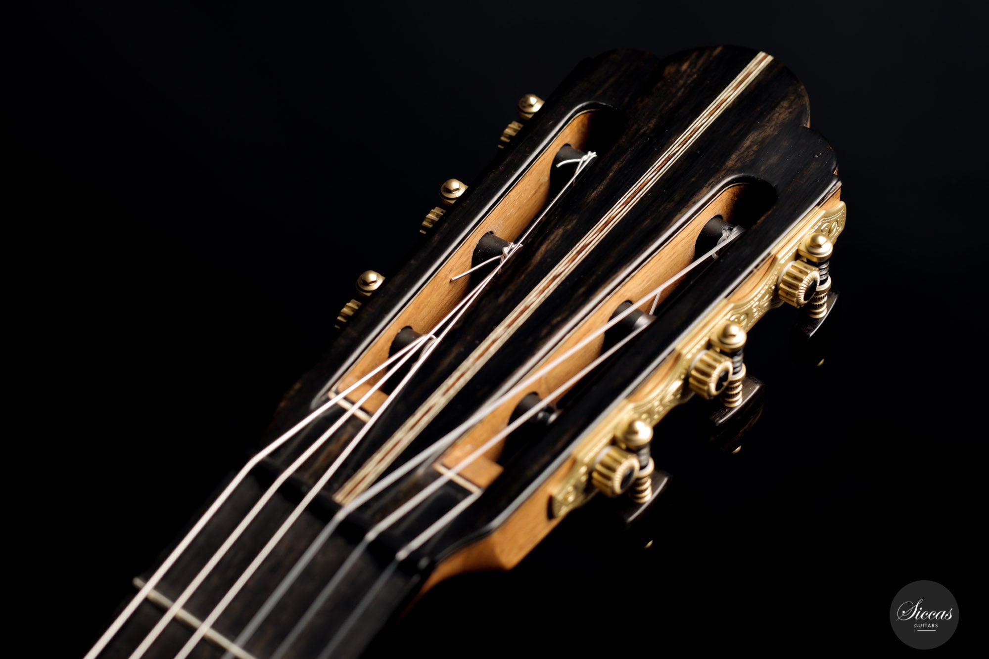 Diese Gitarre mit kürzerer Mensur ist eine Sonderanfertigung für Siccas Guitars, bei welcher der Schwerpunkt auf Klang und Spielbarkeit liegt. Sie kommt direkt aus Ariels Werkstatt und hat eine 63 cm Mensur, 2 cm kürzer als die Standard-Mensur von 65 cm, was sie sehr komfortabel für die linke Hand macht. Die Beleistung ist von Antonio de Torres' Gitarren inspiriert und macht dieses Instrument sehr reaktionsschnell, warm und fröhlich. Außerdem wurde für Boden und Zargen ein schönes Set aus dunklem indischem Palisander gewählt, das der Gitarre ein elegantes und edles Aussehen verleiht.
