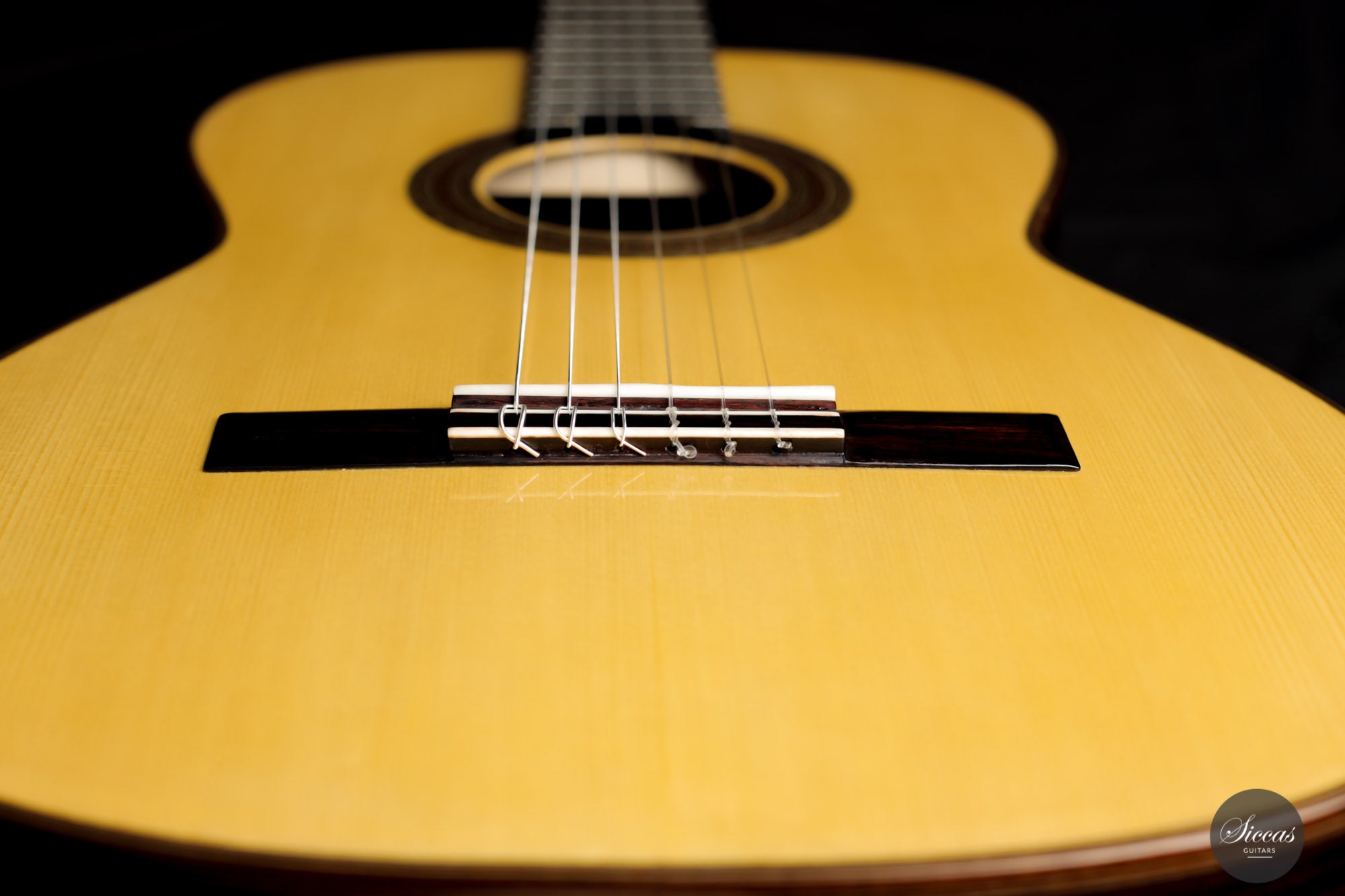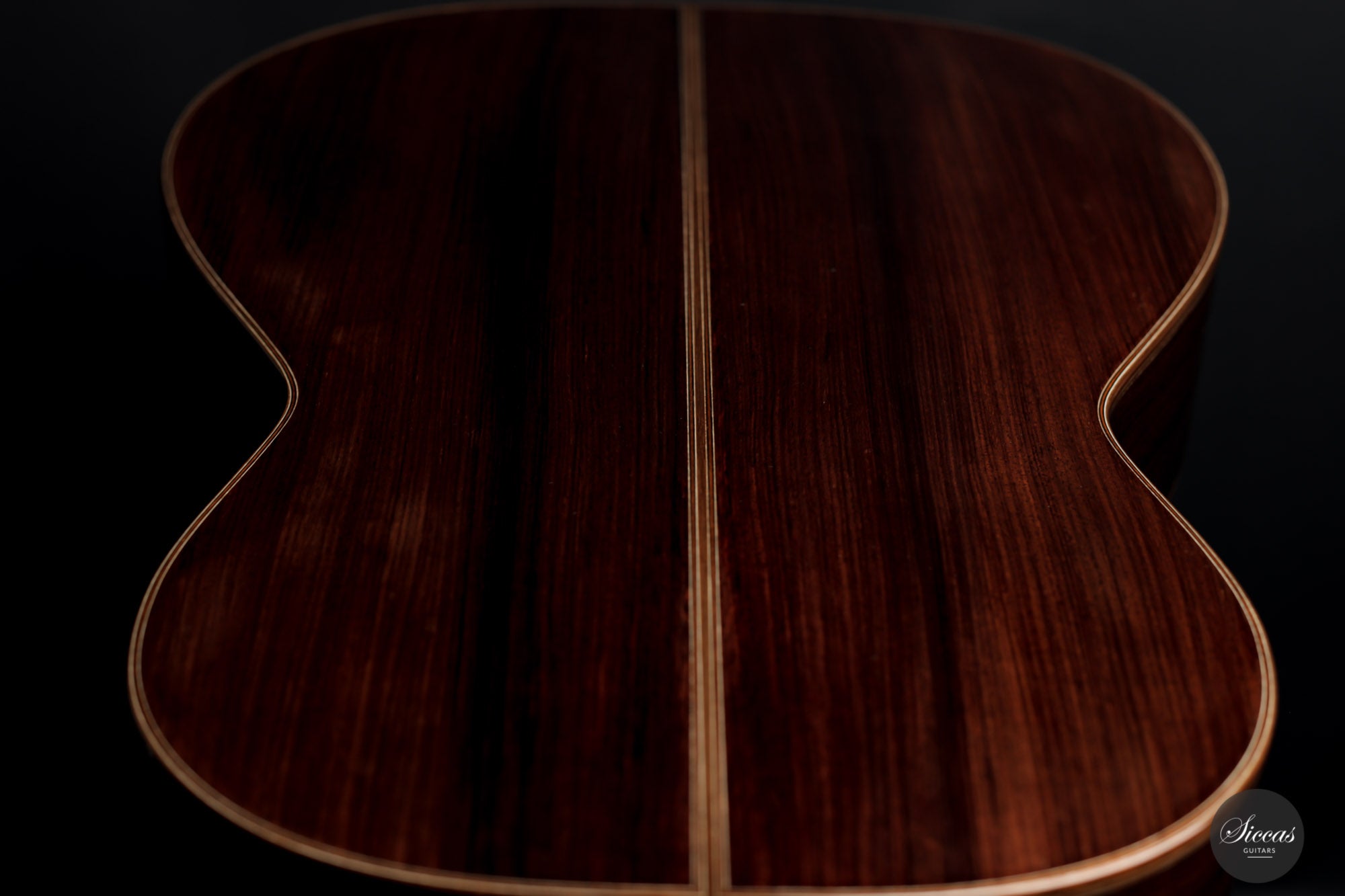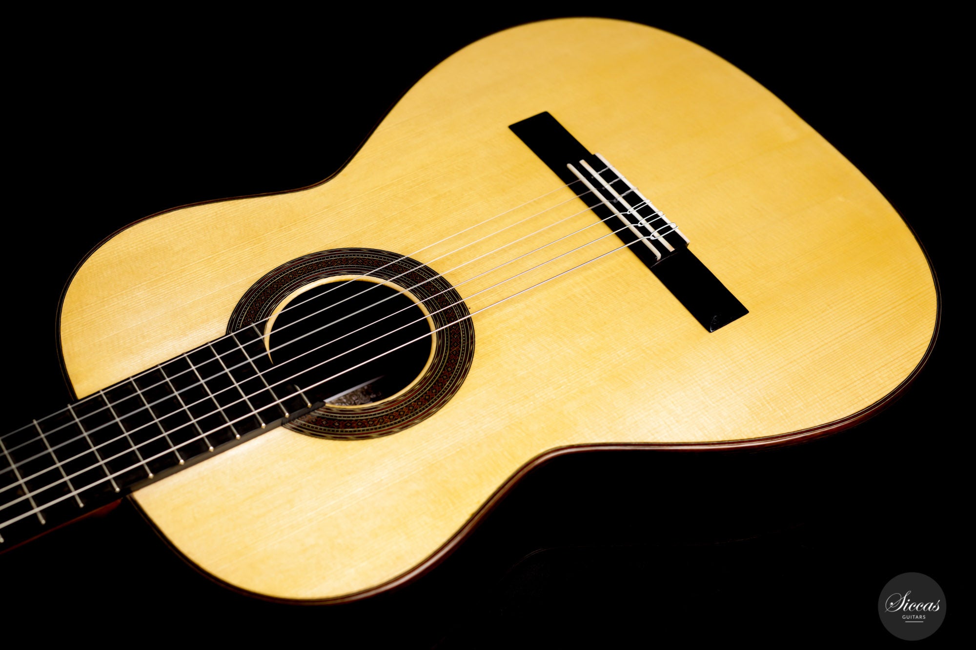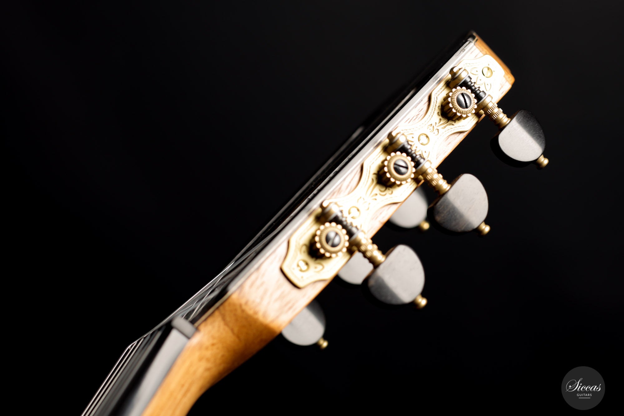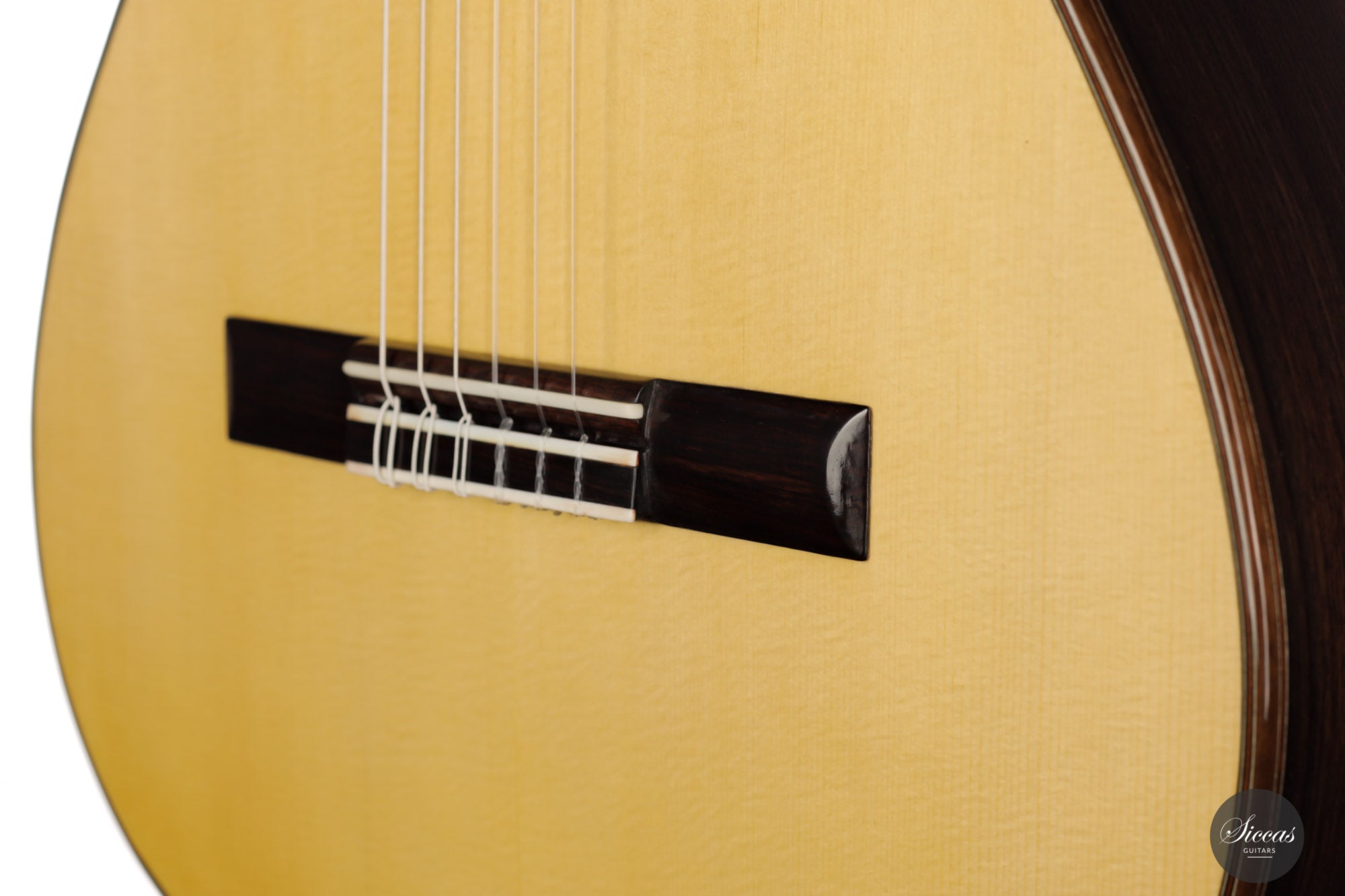 Diese Gitarre mit kürzerer Mensur ist eine Sonderanfertigung für Siccas Guitars, bei welcher der Schwerpunkt auf Klang und Spielbarkeit liegt. Sie kommt direkt aus Ariels Werkstatt und hat eine 63 cm Mensur, 2 cm kürzer als die Standard-Mensur von 65 cm, was sie sehr komfortabel für die linke Hand macht. Die Beleistung ist von Antonio de Torres' Gitarren inspiriert und macht dieses Instrument sehr reaktionsschnell, warm und fröhlich. Außerdem wurde für Boden und Zargen ein schönes Set aus dunklem indischem Palisander gewählt, das der Gitarre ein elegantes und edles Aussehen verleiht.