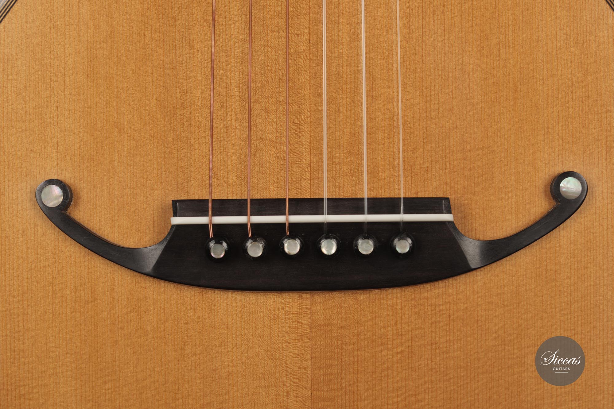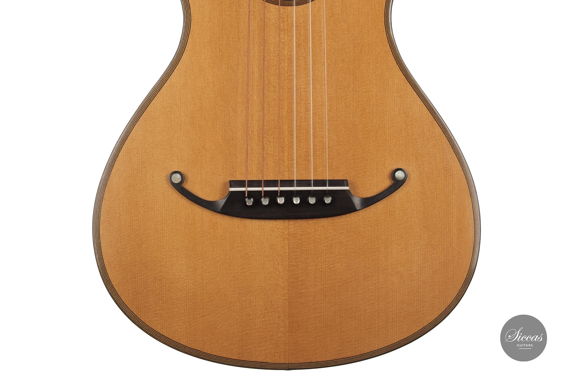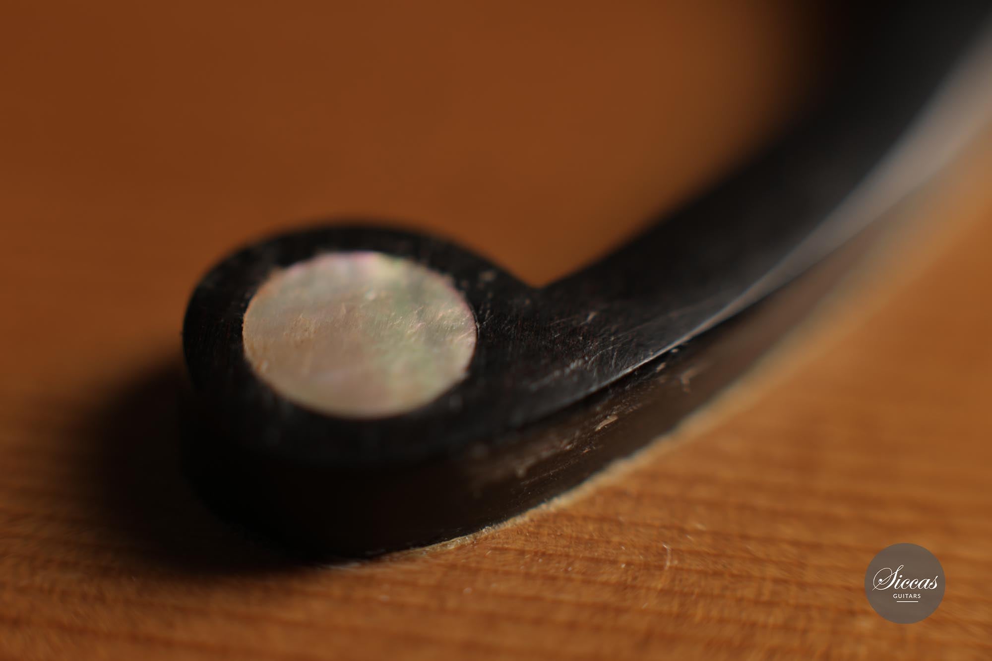 Diese großartige Replik einer französischen romantischen Gitarre, die um 1820 gebaut wurde, ist ein sehr feines Instrument. Die 640-mm-Mensur sowie der breite Hals sind sehr komfortabel, besonders für Gitarristen mit eher breiten Fingern. Auf der Rückseite des Halses befindet sich zudem Ebenholzfurnier, das einen besonders angenehmen Griff bietet. Der Klang ist klar und präzise, reich an Obertönen mit einem sehr ausgeprägten Timbre. Eine sehr schöne romantische Gitarre, die von einem renommierten Handwerker komplett von Hand gebaut wurde, und im originalen Götz-Hartschalenkoffer verkauft wird.
