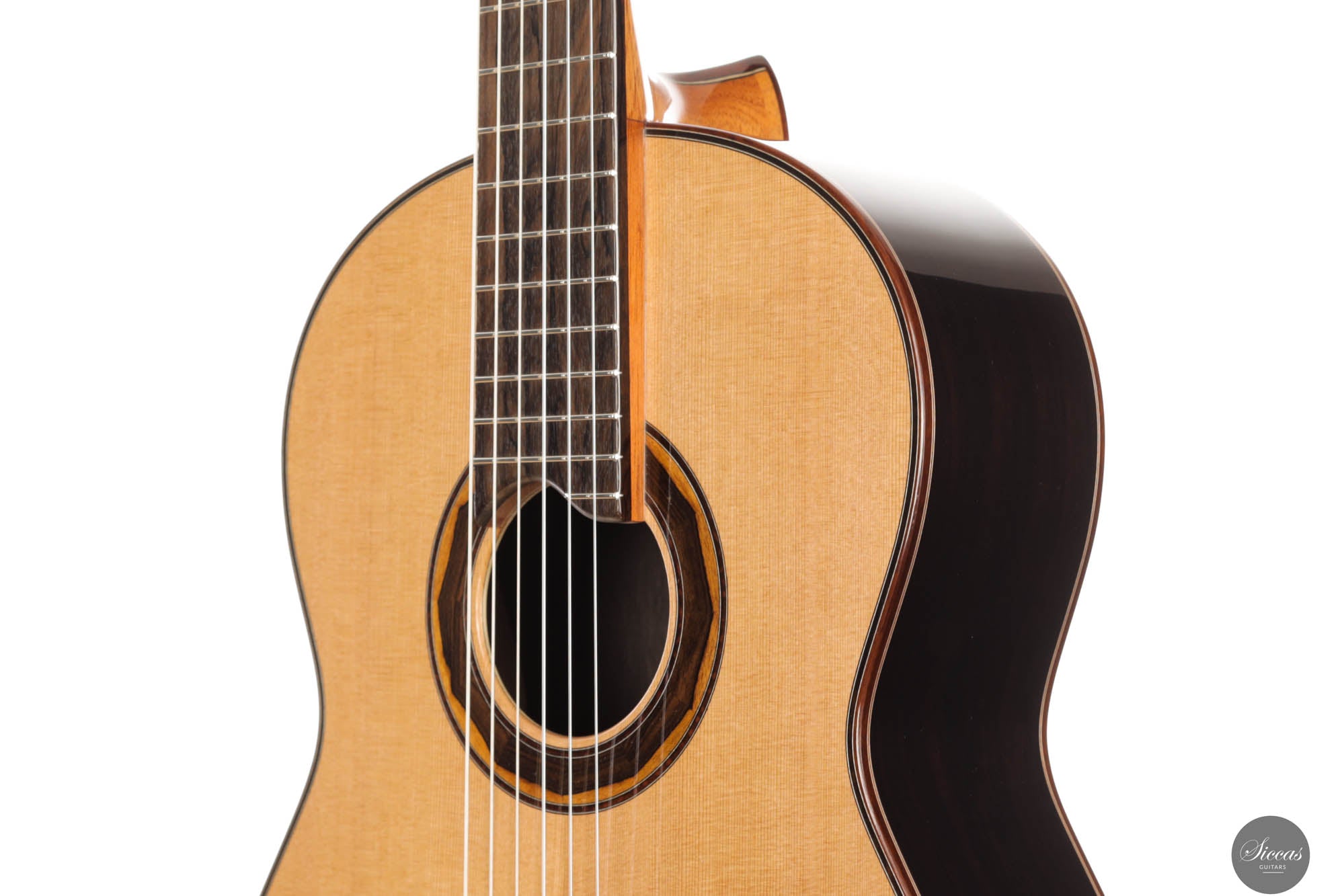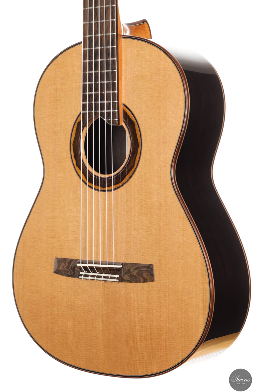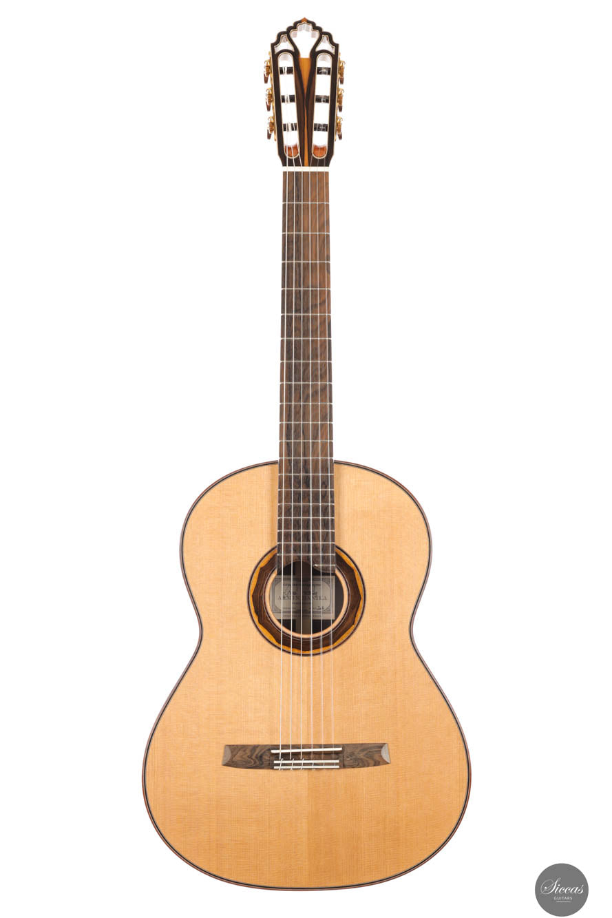 At HANIKA craftsmanship is understood as custom work and sound as art. A guitar from the famous Baiersdorf manufacture is a symbol of quality and craftsmanship tradition. Since 1953 it has been the basis for the success story of the company, combined with trend-setting innovations. Master plucked instrument maker Armin Hanika took over the company from his father in 1993 and has been building classical guitars of outstanding quality ever since. The 1a Lattice models represent the pinnacle of Armin Hanika’s guitar craftsmanship, showcasing exceptional beauty and sophistication. These models feature back and sides constructed from the finest hand-picked Mexican ziricote wood, complemented by a double-top lattice soundboard made from perfectly split cedar wood. The innovative design of the domed soundboard with lattice bracing enhances the guitar’s efficiency, while Klaus Scheller tuning machines emphasize the high quality standards that the 1A Lattice demands. Visually, the guitar stands out with its body finished in a UV-curing high-gloss varnish and a soundboard meticulously hand-polished with shellac, presenting a stunning aesthetic that is as refined as it is durable. Sonically, the 1A Lattice offers exceptional dynamics, rich substance in sound, crispness, and responsive playability. The careful selection of materials and superior craftsmanship ensure that this classical guitar meets the highest demands of professional musicians. Additionally, the inclusion of a luxurious BAM case with the purchase not only protects this exquisite instrument but also reflects the overall quality and value of the guitar. This model is a perfect blend of traditional craftsmanship and modern design, making it a sought-after piece for any serious guitarist looking for an instrument that delivers both visually and acoustically.