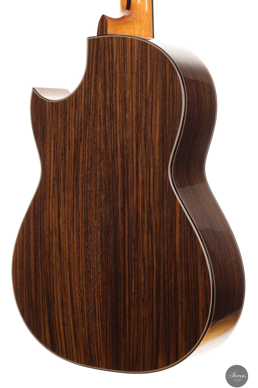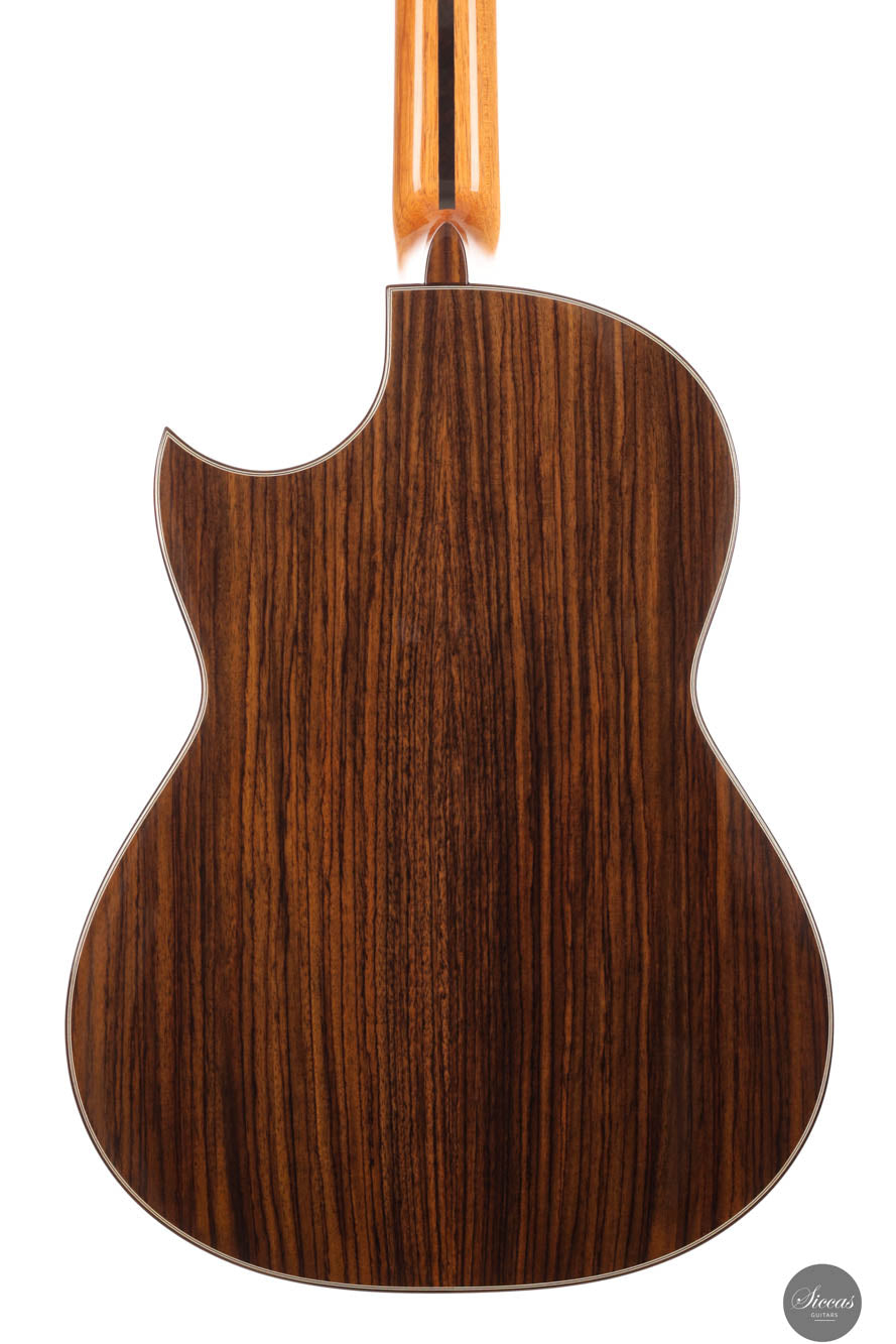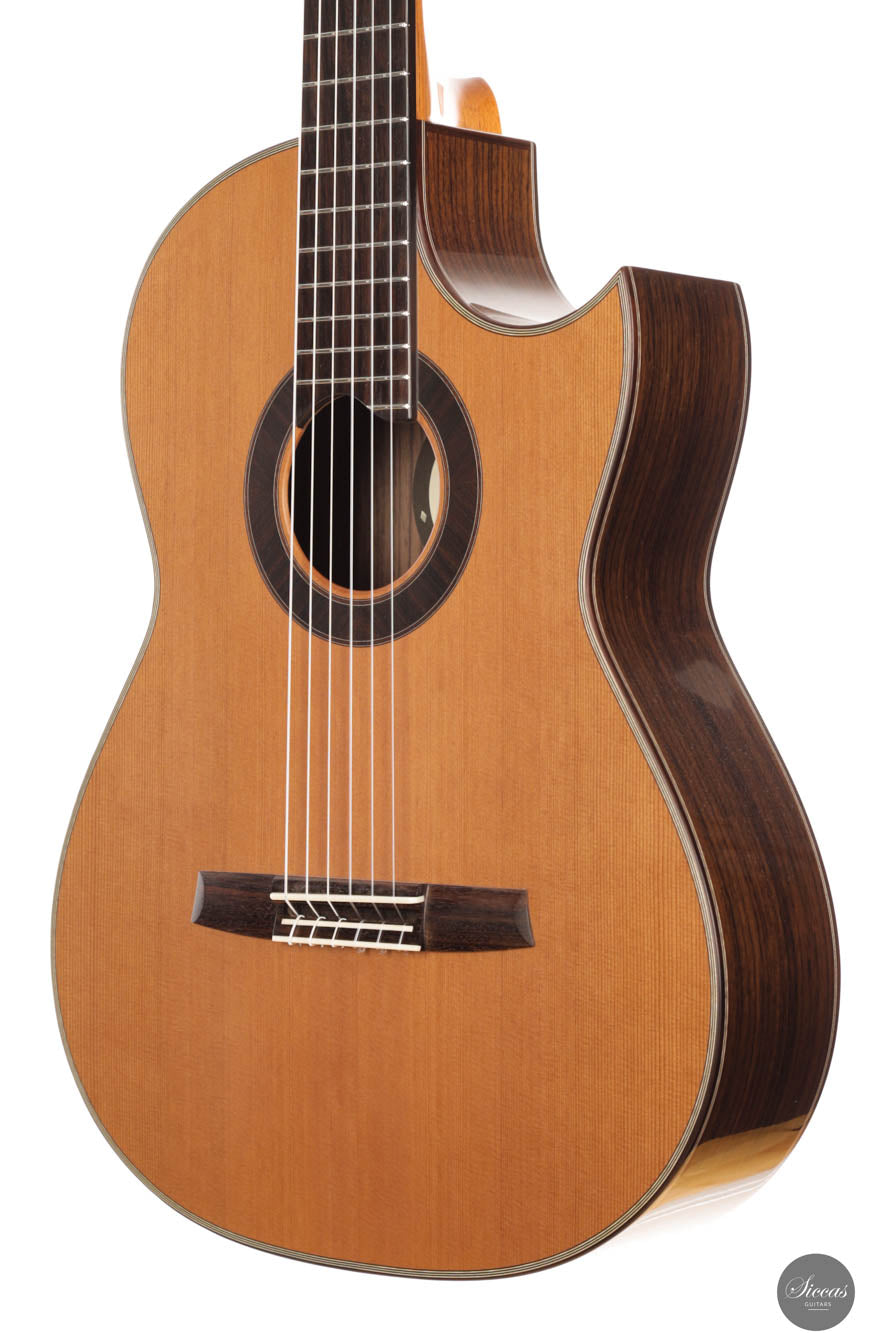 Die Hanika CutPro PC ist eine moderne Konzertgitarre mit florentinischem Cutaway, die speziell für leichten Zugang zu den hohen Lagen und verbesserten Spielkomfort entwickelt wurde. Mit einer Decke aus Zeder und Boden sowie Zargen aus indischem Palisander vereint sie kräftiges Attack mit vollem, warmem Klang und klarer Projektion. Das seidenmatte Finish der Decke und die hochglanzlackierten Zargen unterstreichen die edle Optik, ergänzt durch Details wie die Palisander-Ahorn-Kopfplatte und den geschwungenen Steg. Dank asymmetrischer 5-fach Fächerbeleistung, verstärktem Cedro-Hals und hochwertigen Rubner-Mechaniken bietet die CutPro PC sowohl klanglich als auch handwerklich höchste Qualität. Geliefert wird sie im Hanika Gig-Bag.