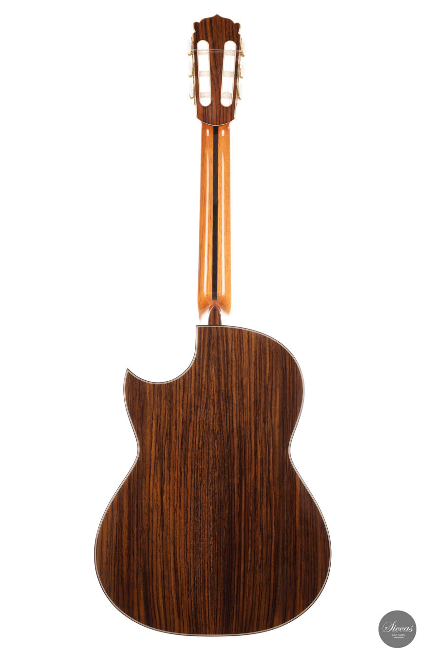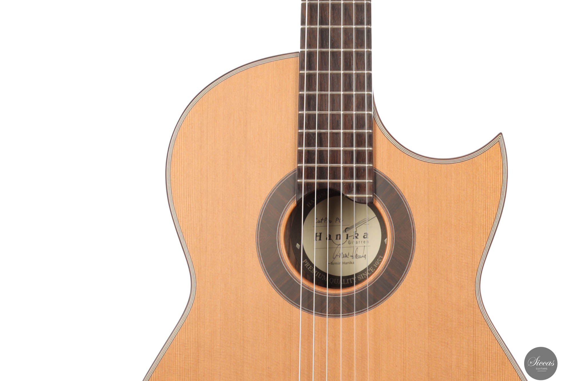 Bei HANIKA versteht man Handwerk als Maßarbeit und Klang als Kunst. Eine Gitarre aus der bekannten Baiersdorfer Manufaktur ist Sinnbild für Qualität und handwerkliche Tradition. Mit zukunftsweisenden Innovationen verbunden, ist sie seit 1953 die Grundlage für die Erfolgsgeschichte des Unternehmens. Zupfinstrumentenmacher-Meister Armin Hanika übernahm das Unternehmen 1993 von seinem Vater und baut seitdem klassische Gitarren von hervorragender Qualität. Auf Basis der 56er Modelle entwickelte Cutaway-Konzertgitarre für leichtes Greifen und bessere Spiel-barkeit in hohen Lagen. Der florentinische Cutaway ermöglicht eine komfortable Spielbarkeit in hohen Lagen. Die Zargenhöhe ist leicht reduziert. Boden und Zarge gefertigt aus hochwertigem, leichtem indischem Palisander, Decke aus hochwertigem Zedernholz. Die Kombination aus indischem Palisander, einem besonders ausdrucksstarken Klangholz, und Zedernholz sorgen bei diesem Modell für gutes Attack und satten Klang. Optisch ansprechend sind Boden und Zarge in Hochglanz Finish und die Zederndecke seidenmatt lackiert. Das schön strukturierte Klangholz gepaart mit dem geschweiften Steg aus ostindischem Palisander und der Palisander-Ahorn-Palisander-Kopfplatte, sind das optische Highlight dieser Gitarre. Aus sehr hochwertigen vollmassiven Tonhölzern gefertigt, ist diese Gitarre mit einer flachen Decke mit asymmetrischer 5-fach Fächerbeleistung ausgestattet. Die gebuchste gold-farbene ‚Rubner R2‘-Mechanik mit Randgravur, der aus bestem Hartholz durchgängig versperrte Cedro-Hals, das hochwertige Ebenholz-Griffbrett und die Palisander-Ahorn-Palisander-Kopfplatte zeigen die hohe Qualität der CutProPC. Der Korpus der Gitarre ist mit einem UV-härtenden Acryllack hochglanzlackiert, die Decke wird geschlossen-porig Matt lackiert. Inkl. Hanika Gig-Bag.