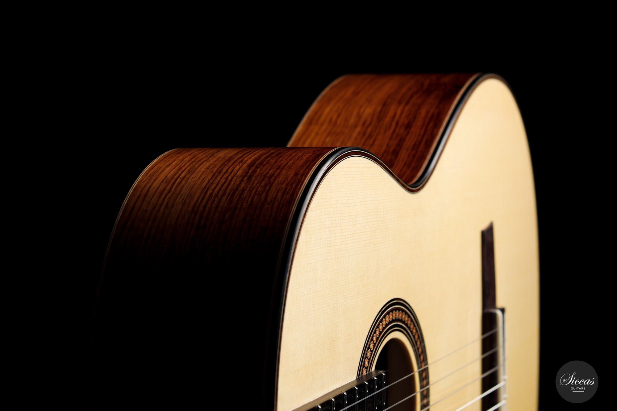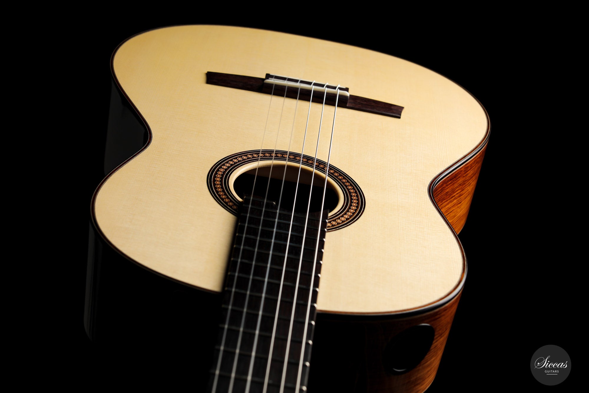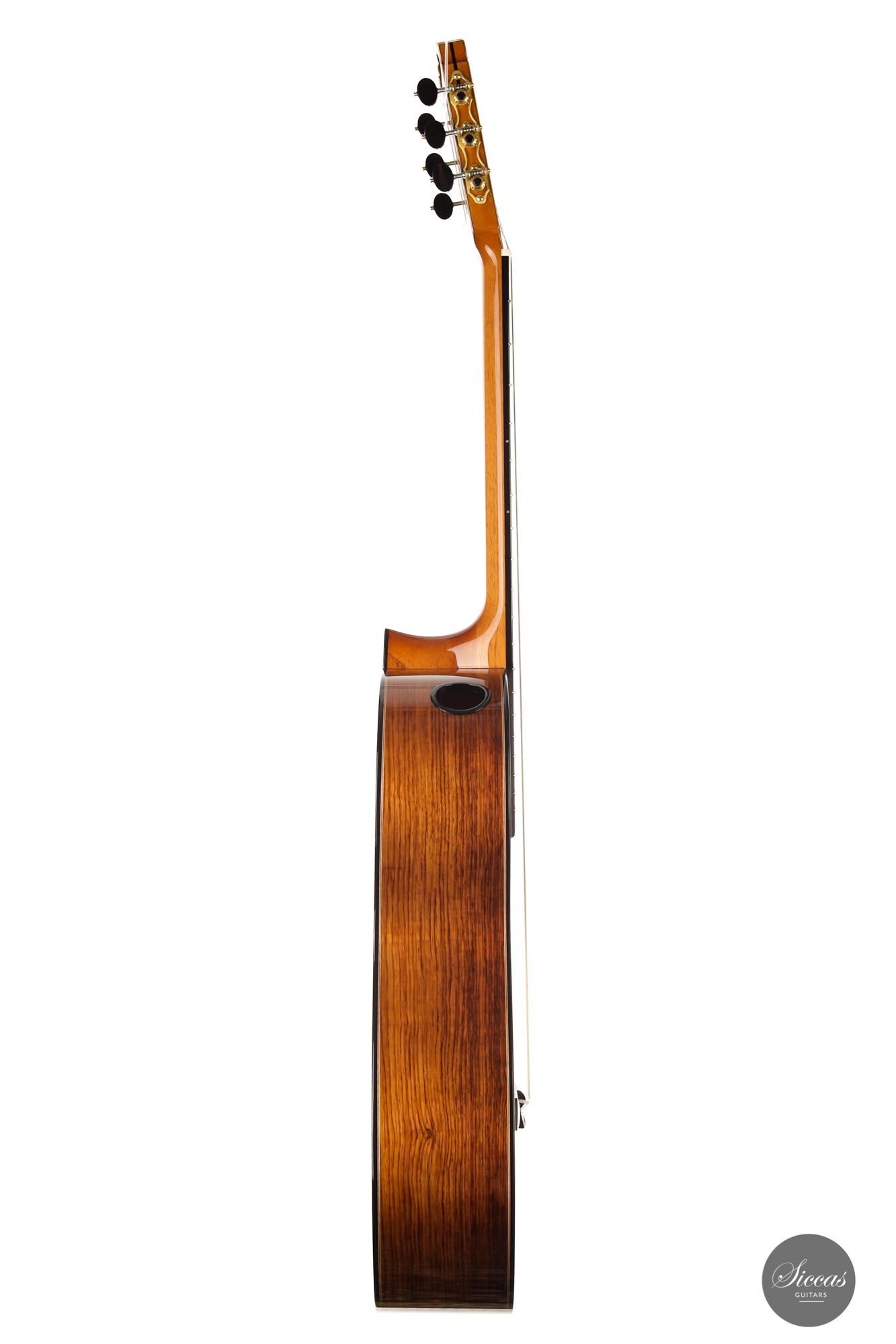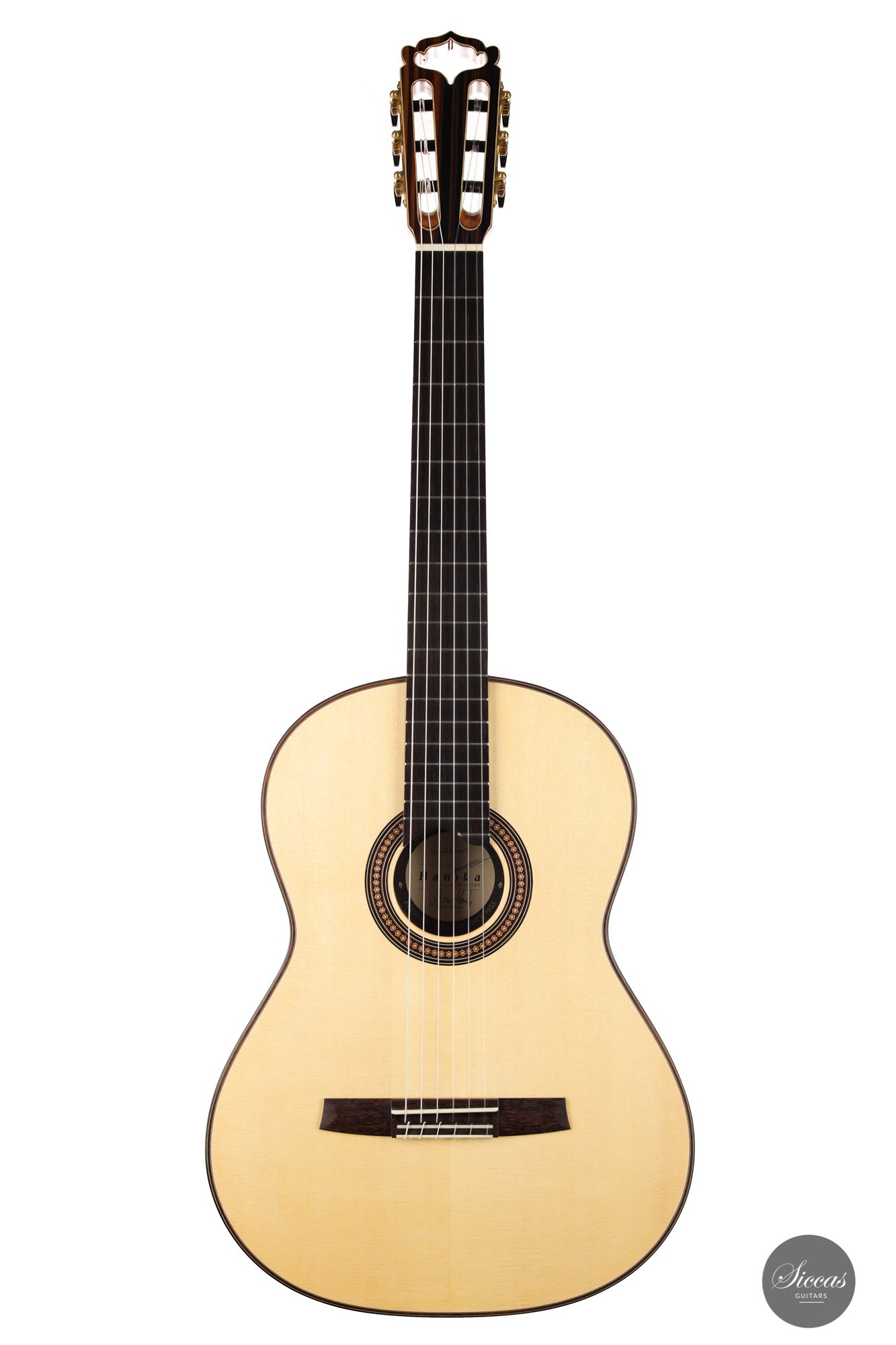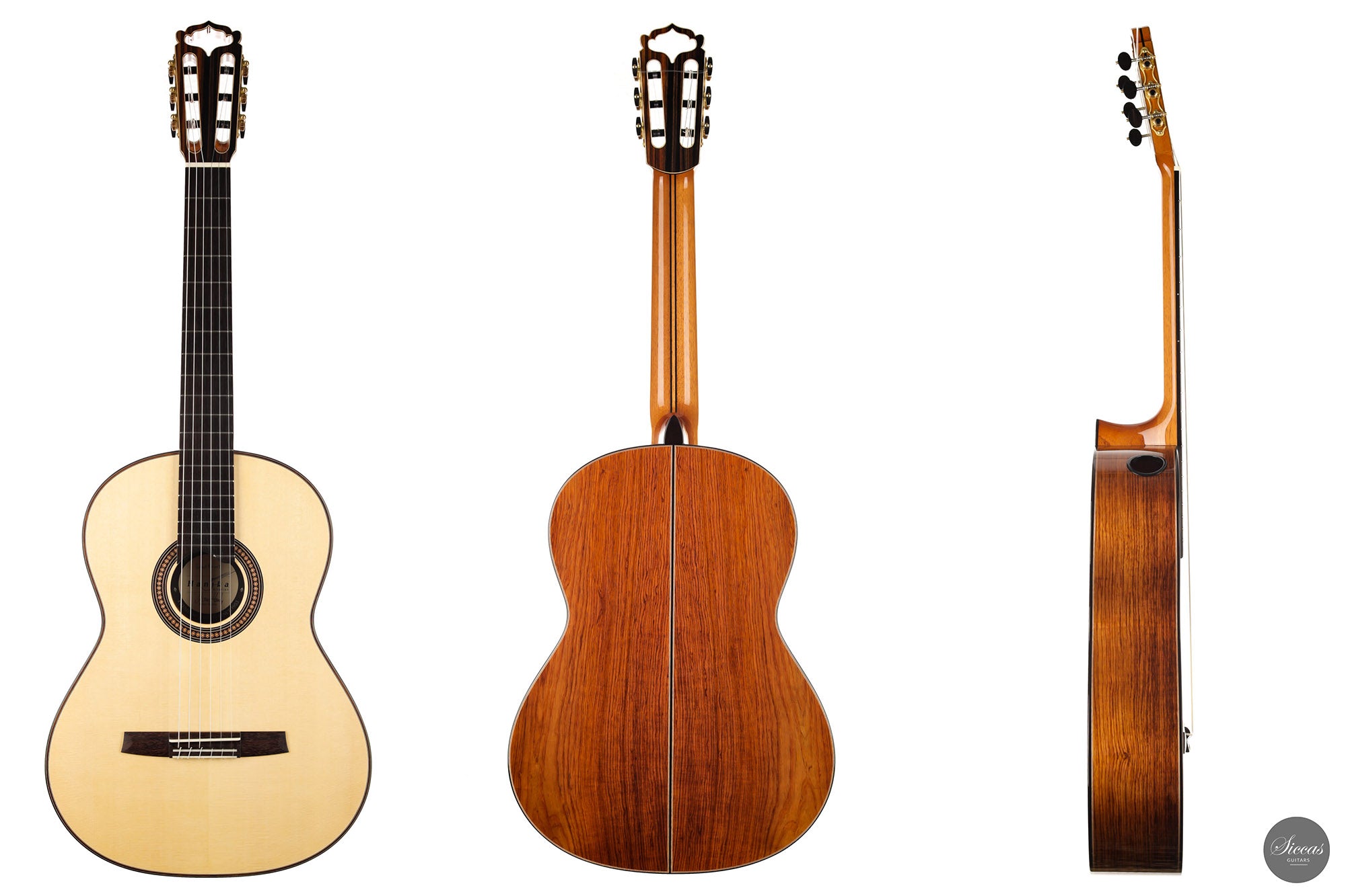 Grand Konzert, eine Innovation für große Räume. Boden und Zarge der Grand Konzert sind aus allerbestem mexikanischen Palo Escrito-Tonholz gefertigt, komplettiert durch eine perfekt geschnittene Fichtendecke von allerfeinster Holzqualität. Ein zweiter Klangboden aus wertigem Santos-Palisander sorgt freischwingend im Korpus für eine hervorragende Projektion und volleren Klang. Die kuppelgewölbte Decke mit 7-fach asymmetrisch gewichteter Fächerbeleistung optimiert den Wirkungsgrad dieser Konzertgitarre. Gerade durch ihr warmes und facettenreiches Timbre, den vollen Klang und die hervorragende Tonprojektion ist die Grand Konzert ideal für den großen Auftritt. Das Monitor-Schallloch unterstützt die Eigenwahrnehmung des Gitarristen und führt zu einer verbesserten direkten Hörbarkeit und Tonkontrolle. Der durchbrochene Palisander-Ahorn-Makassar-Kopf, die exklusive Alessi-Mechanik und die Korpuslackierung in Hochglanz sowie Deckenlackierung in aufwändigster Schelllack-Handpolitur runden dieses Instrument klanglich wie optisch ab. Inlusive Hiscox Pro II Koffer.