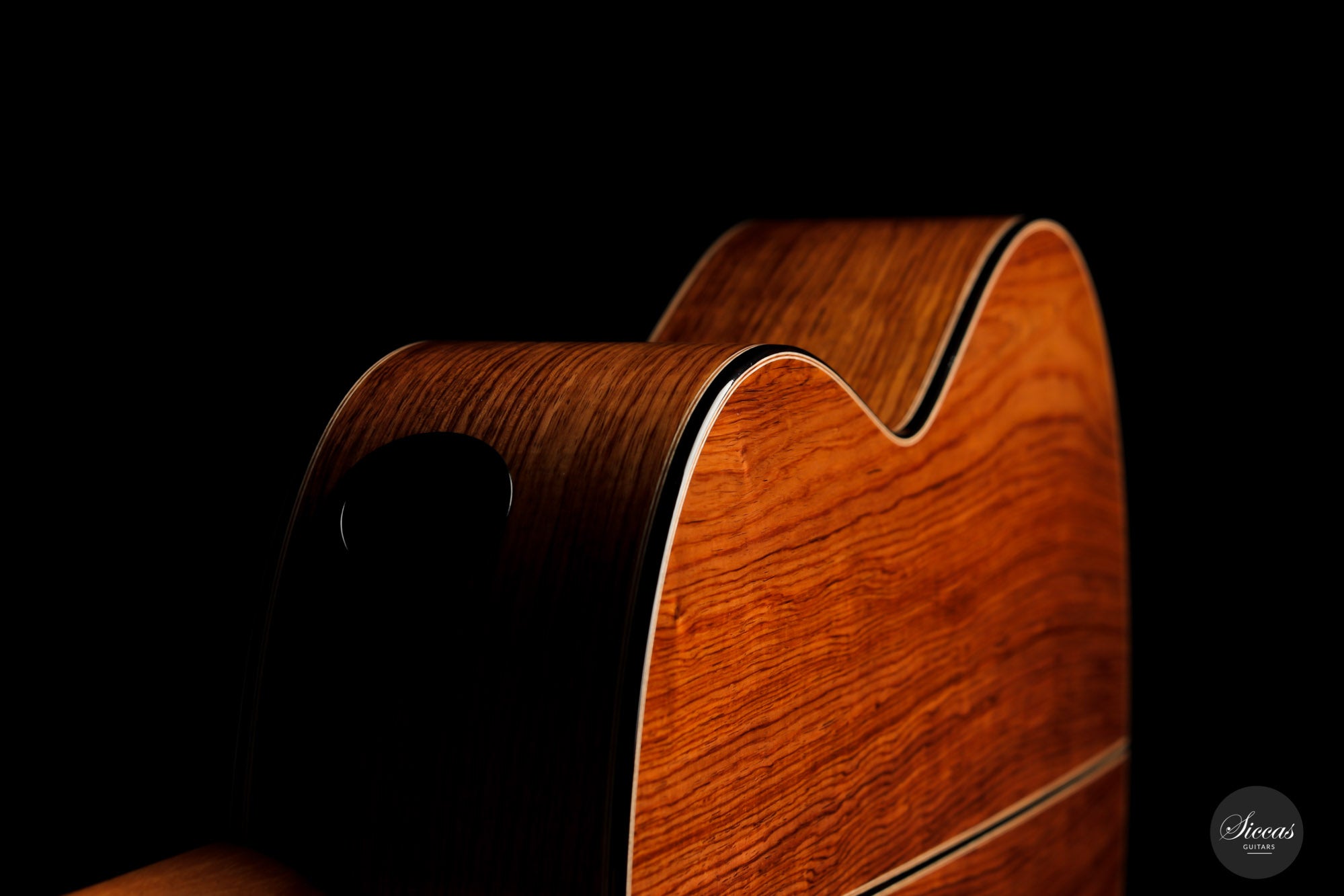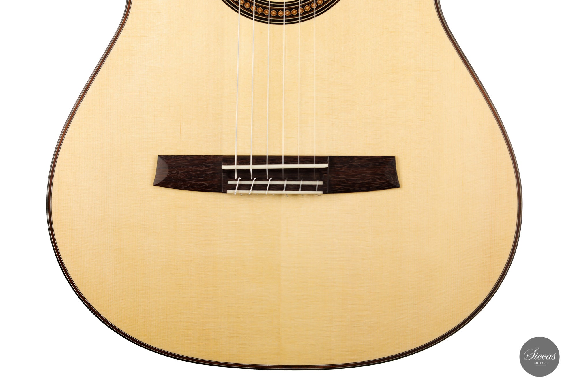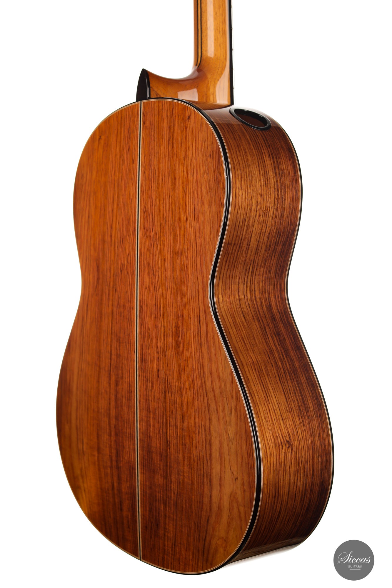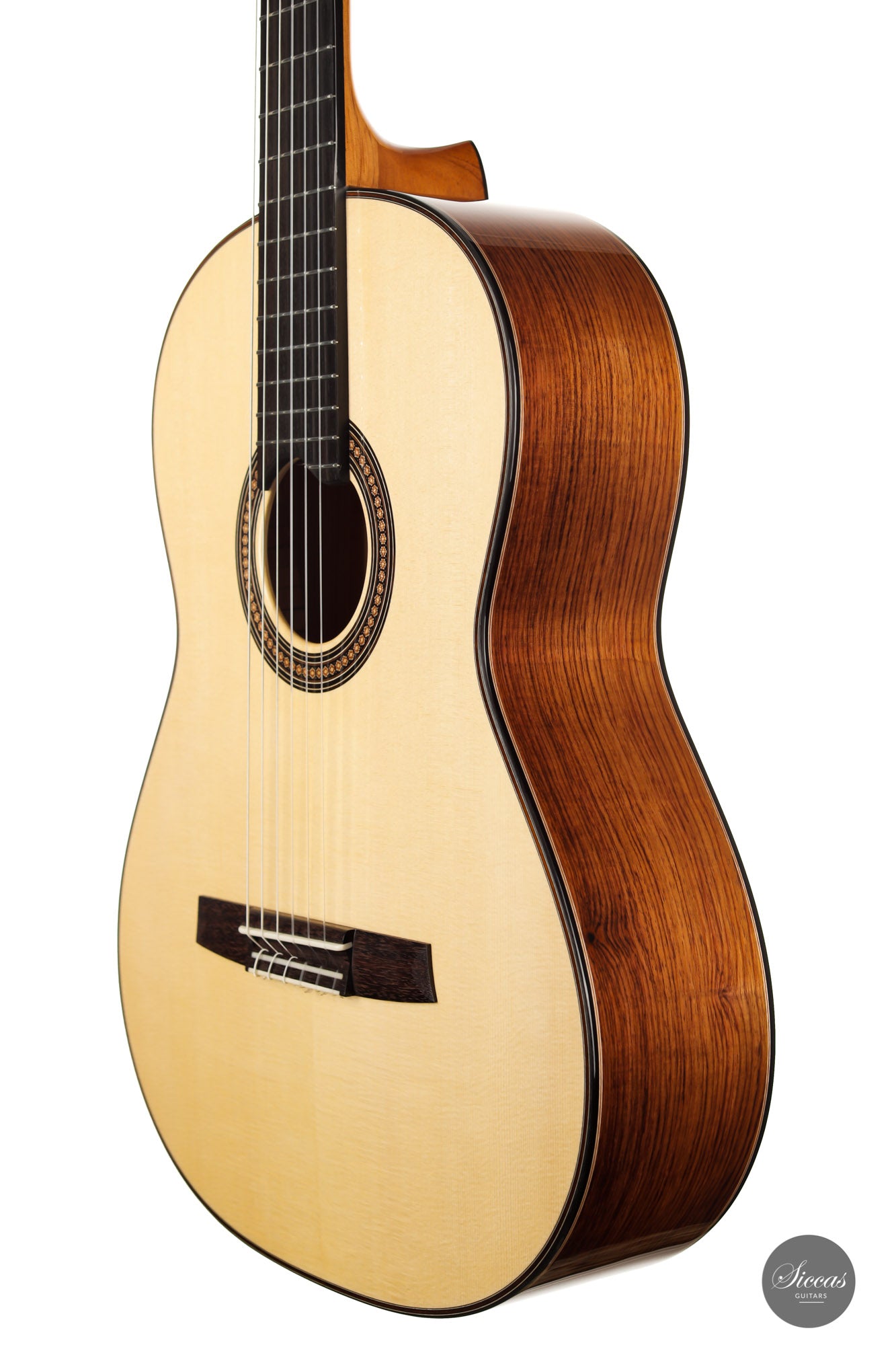 Grand Konzert, eine Innovation für große Räume. Boden und Zarge der Grand Konzert sind aus allerbestem mexikanischen Palo Escrito-Tonholz gefertigt, komplettiert durch eine perfekt geschnittene Fichtendecke von allerfeinster Holzqualität. Ein zweiter Klangboden aus wertigem Santos-Palisander sorgt freischwingend im Korpus für eine hervorragende Projektion und volleren Klang. Die kuppelgewölbte Decke mit 7-fach asymmetrisch gewichteter Fächerbeleistung optimiert den Wirkungsgrad dieser Konzertgitarre. Gerade durch ihr warmes und facettenreiches Timbre, den vollen Klang und die hervorragende Tonprojektion ist die Grand Konzert ideal für den großen Auftritt. Das Monitor-Schallloch unterstützt die Eigenwahrnehmung des Gitarristen und führt zu einer verbesserten direkten Hörbarkeit und Tonkontrolle. Der durchbrochene Palisander-Ahorn-Makassar-Kopf, die exklusive Alessi-Mechanik und die Korpuslackierung in Hochglanz sowie Deckenlackierung in aufwändigster Schelllack-Handpolitur runden dieses Instrument klanglich wie optisch ab. Inlusive Hiscox Pro II Koffer.