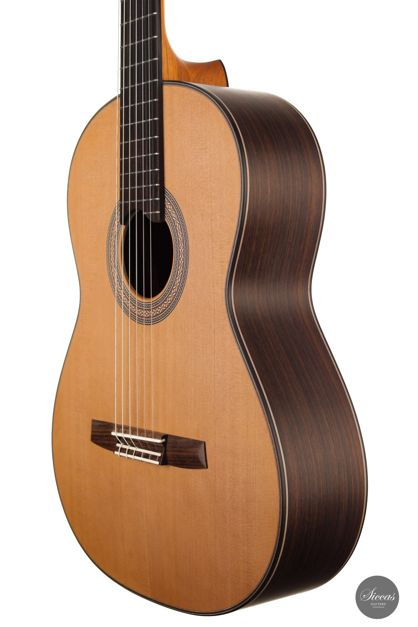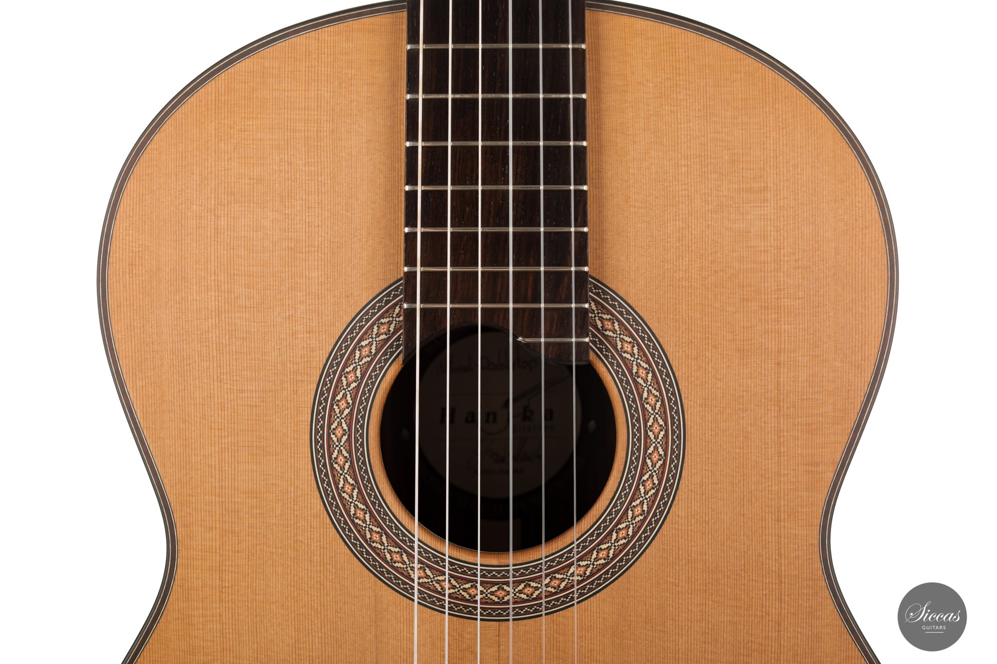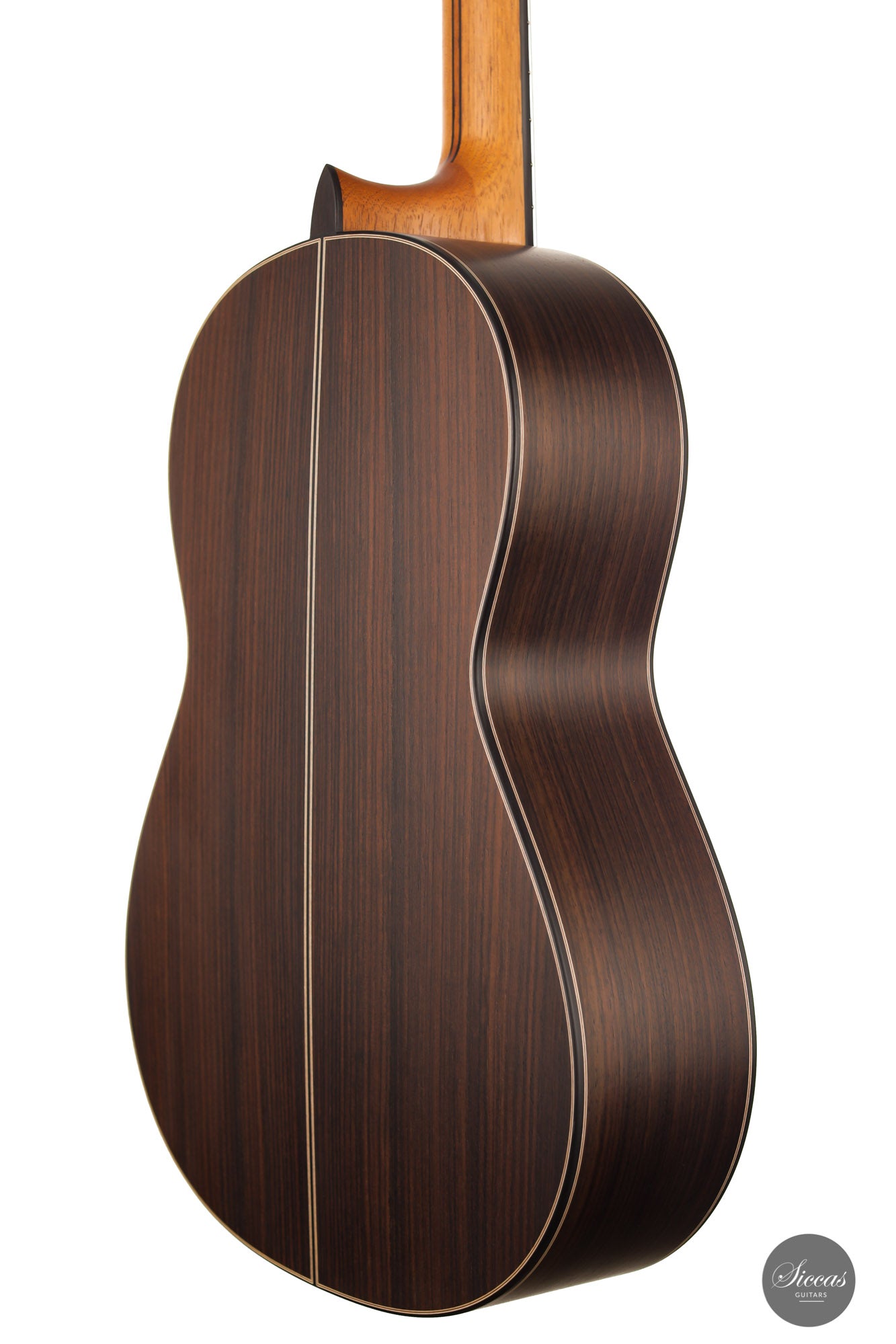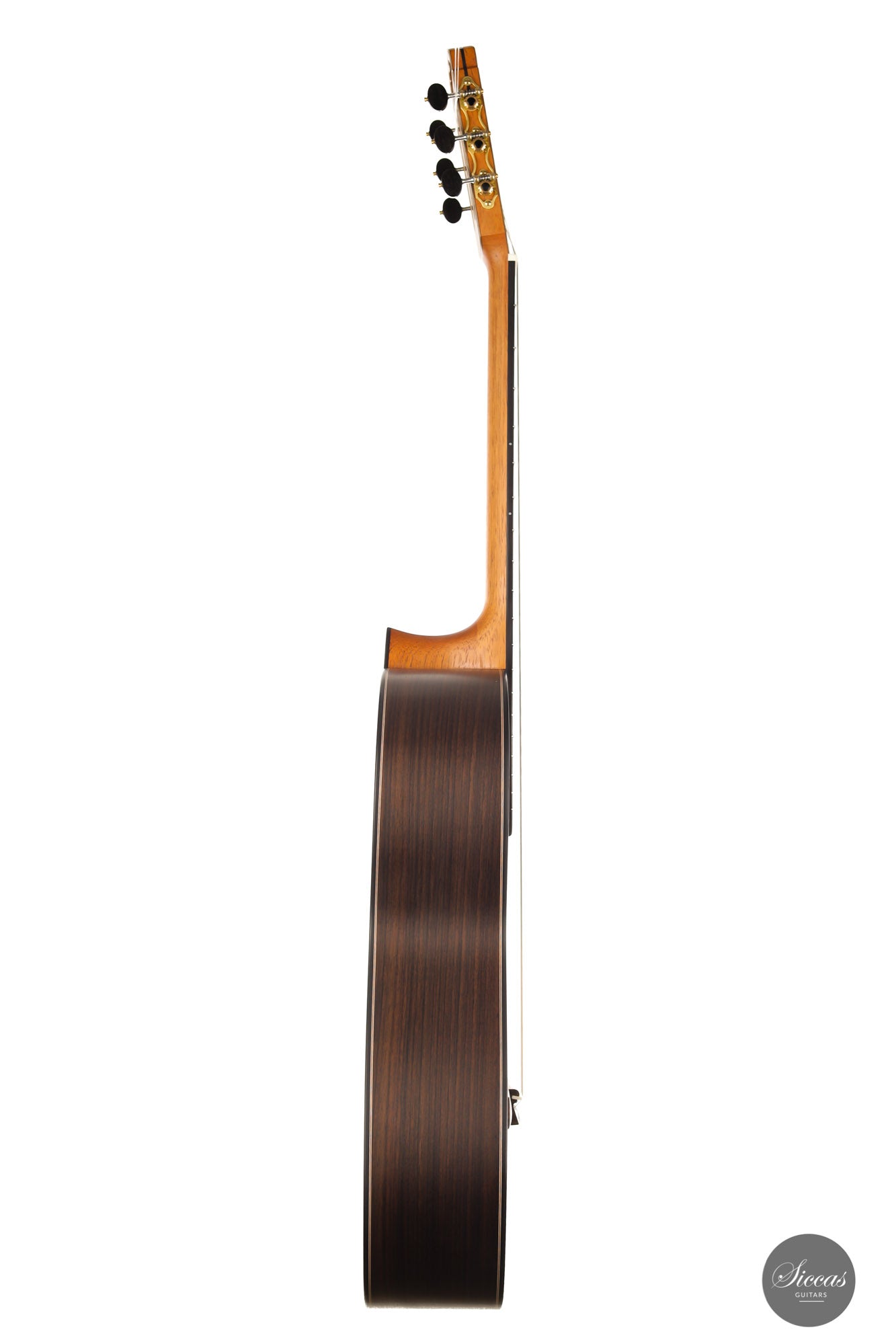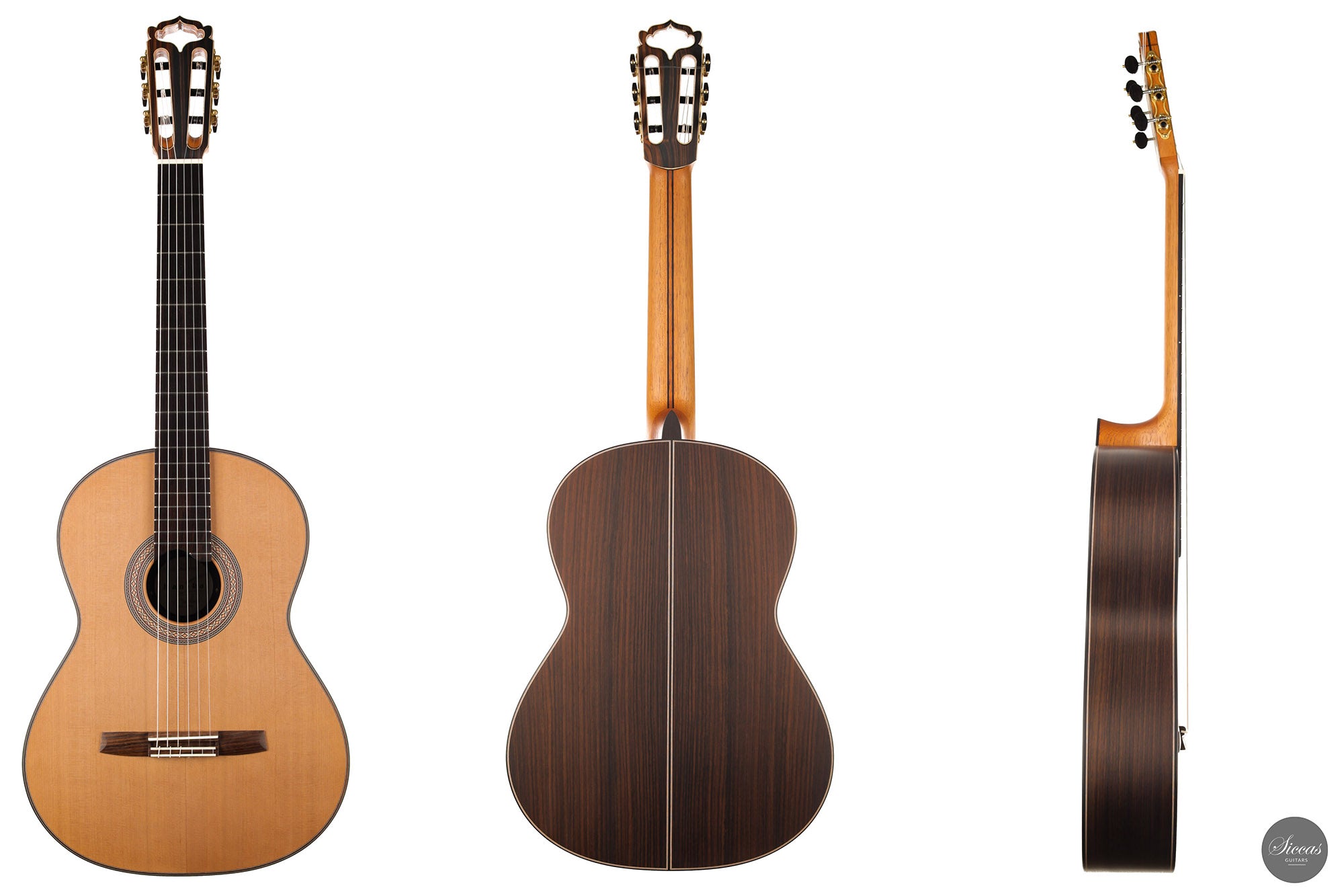 The volume of this guitar and the quick response are impressive. The player gets a very good feedback and it’s easy to play so that the player can play fast and virtuous. Depth of bass comes from an air resonance somewhat lower than F. The balance between the treble, middle and bass is very good. The tuning machines are made by Alessi. Comes with a Hanika Hiscox Pro II case.