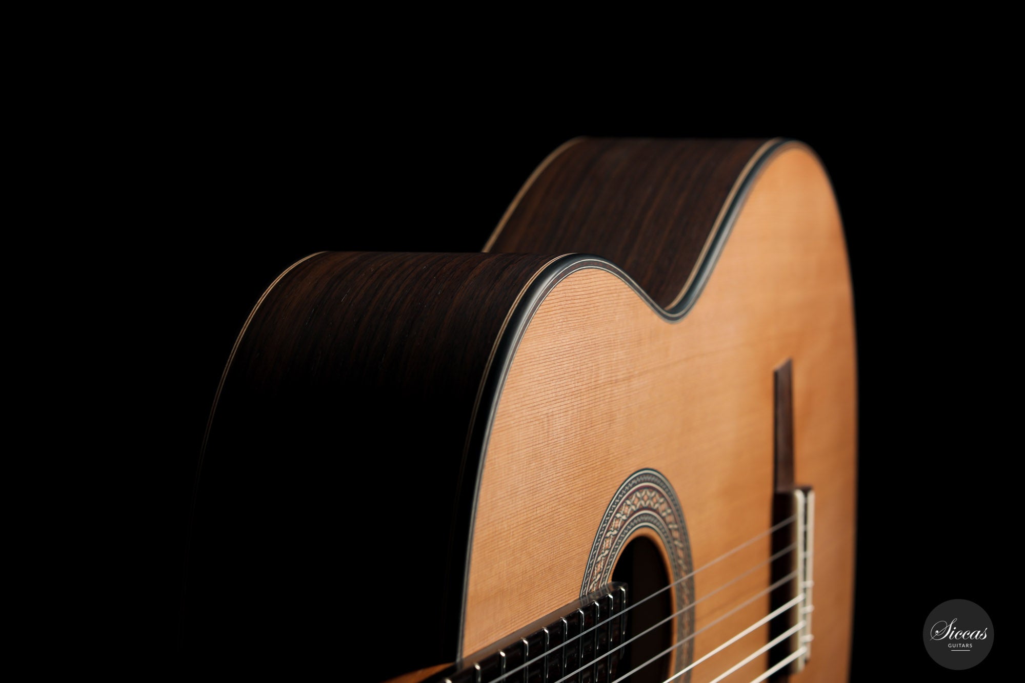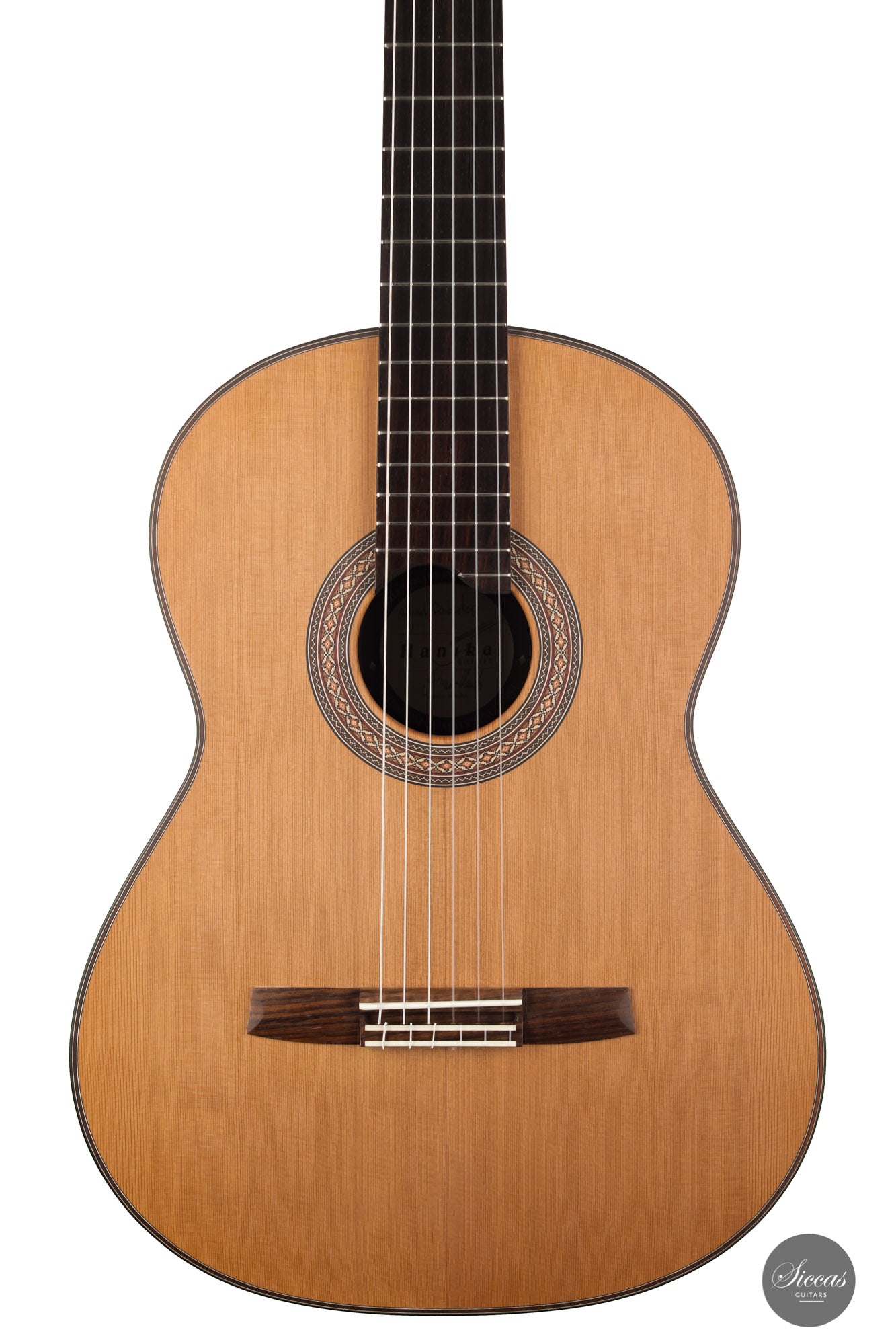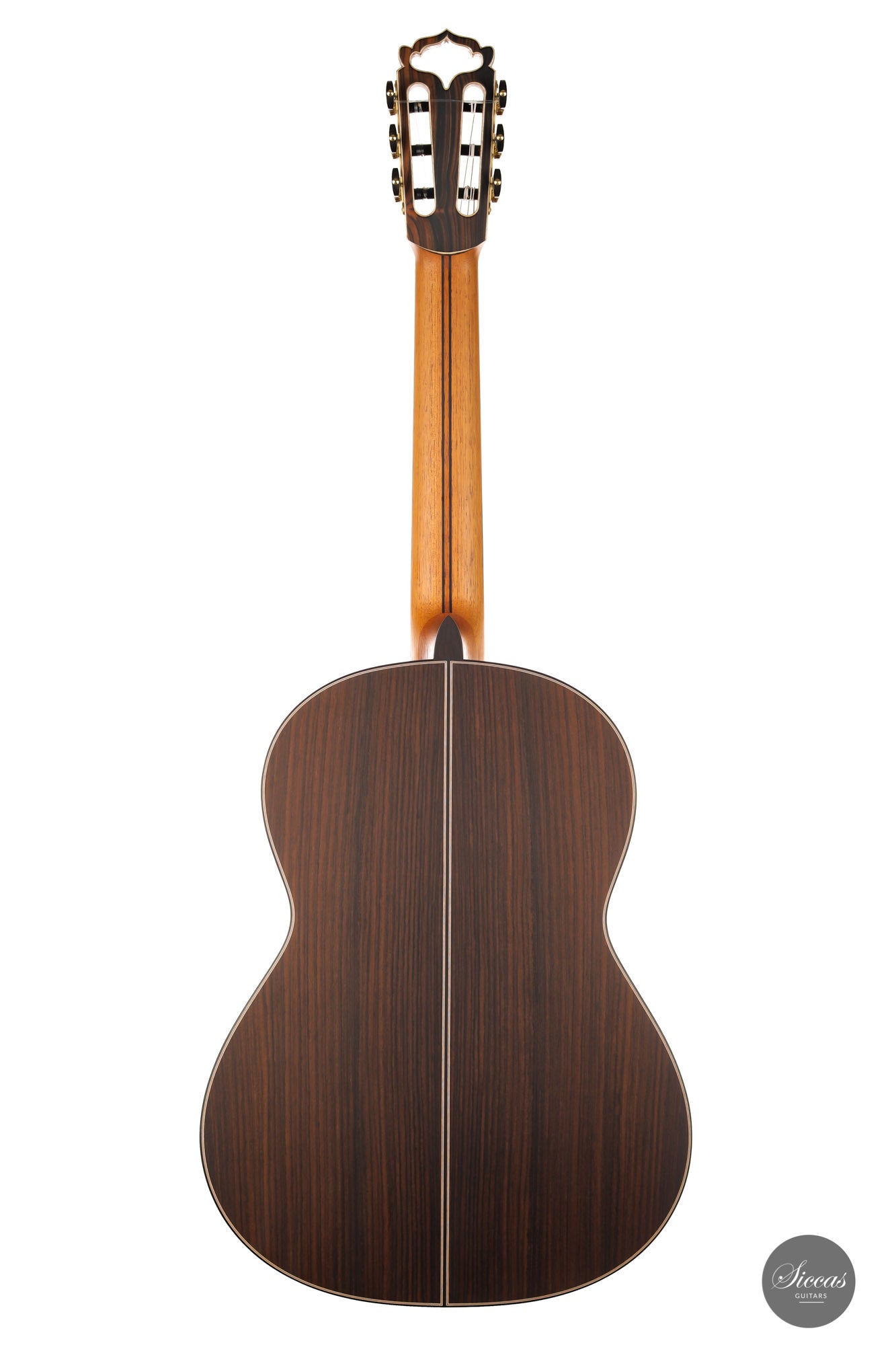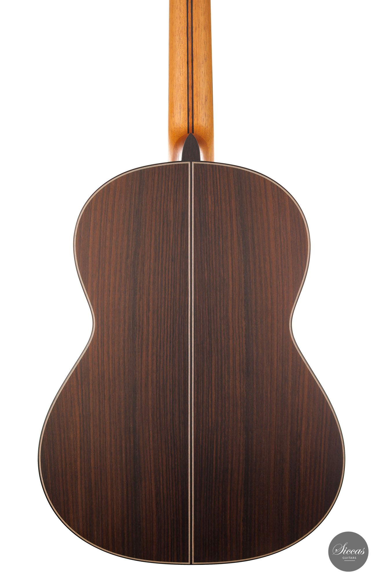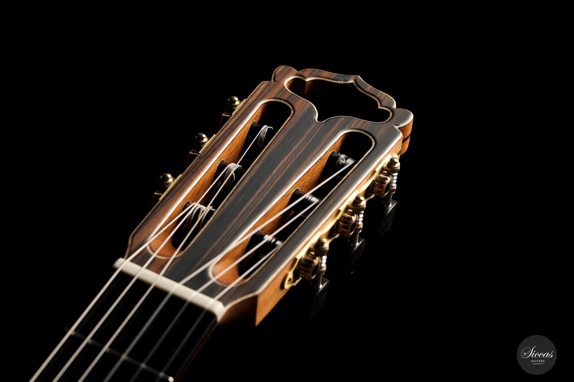 The volume of this guitar and the quick response are impressive. The player gets a very good feedback and it’s easy to play so that the player can play fast and virtuous. Depth of bass comes from an air resonance somewhat lower than F. The balance between the treble, middle and bass is very good. The tuning machines are made by Alessi. Comes with a Hanika Hiscox Pro II case.