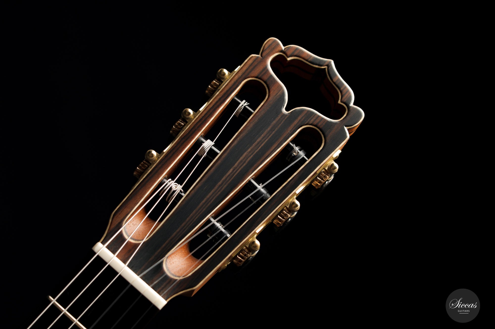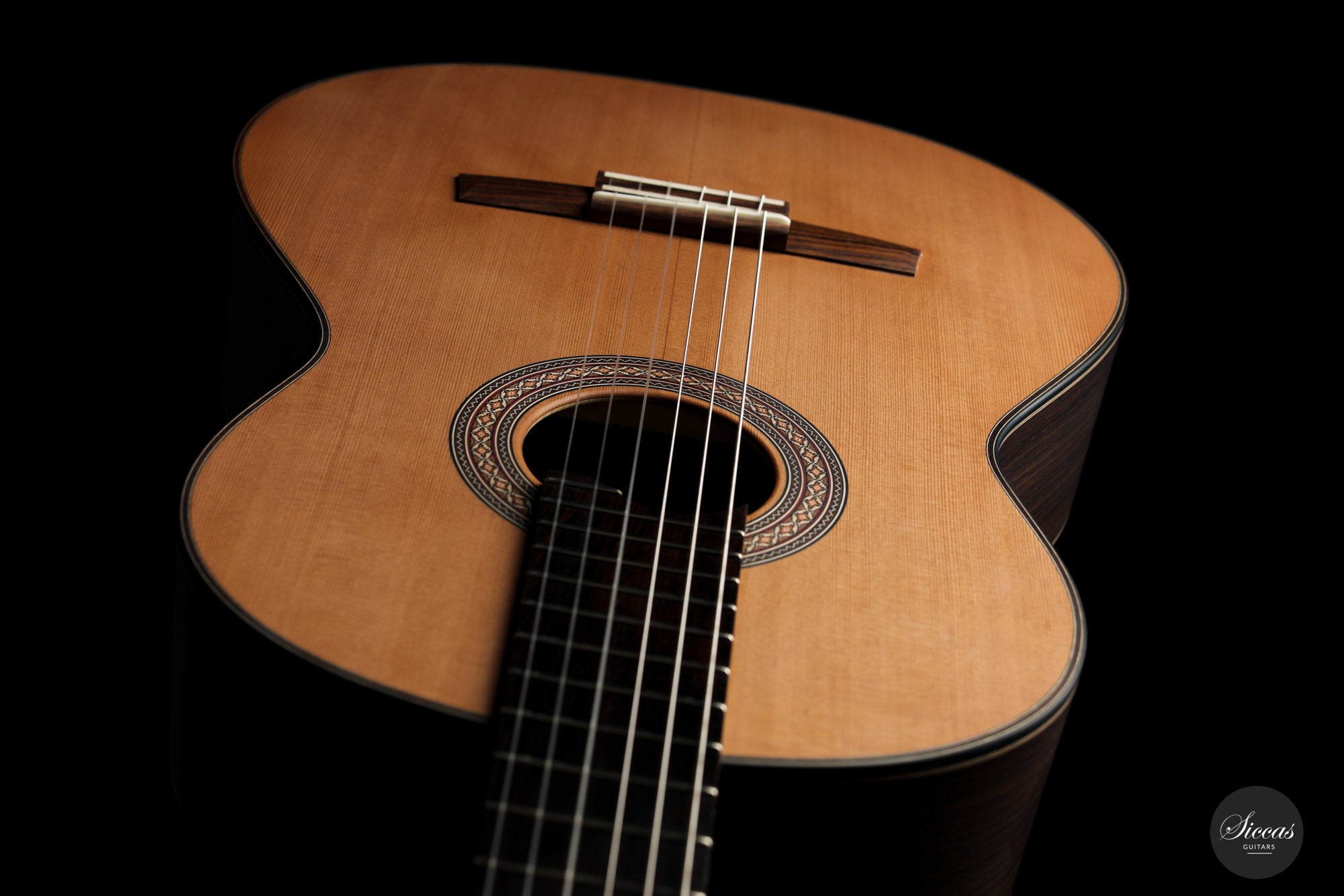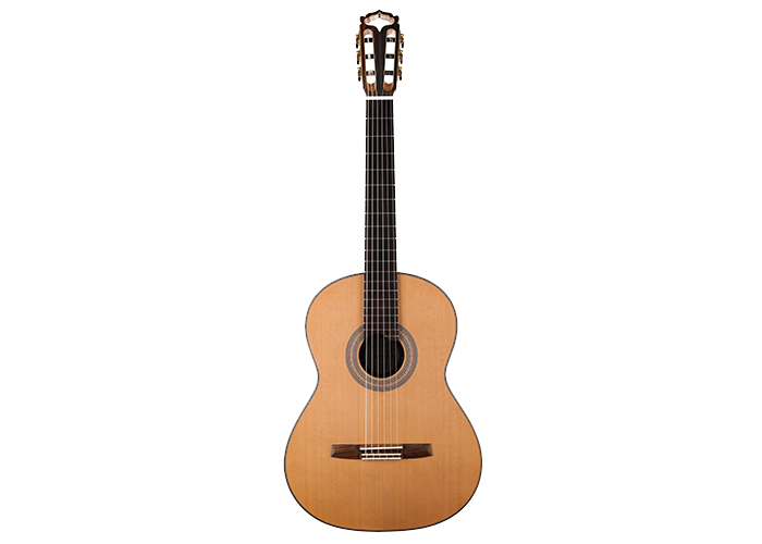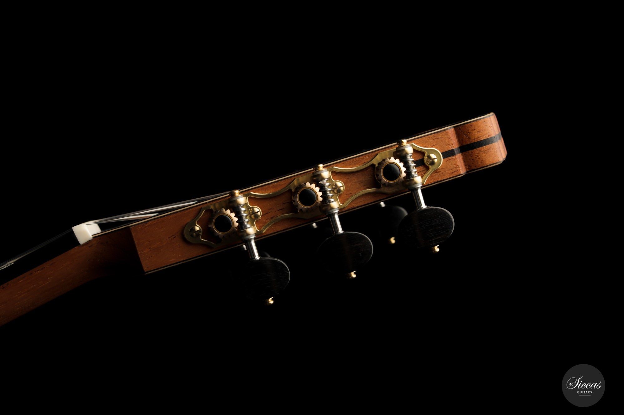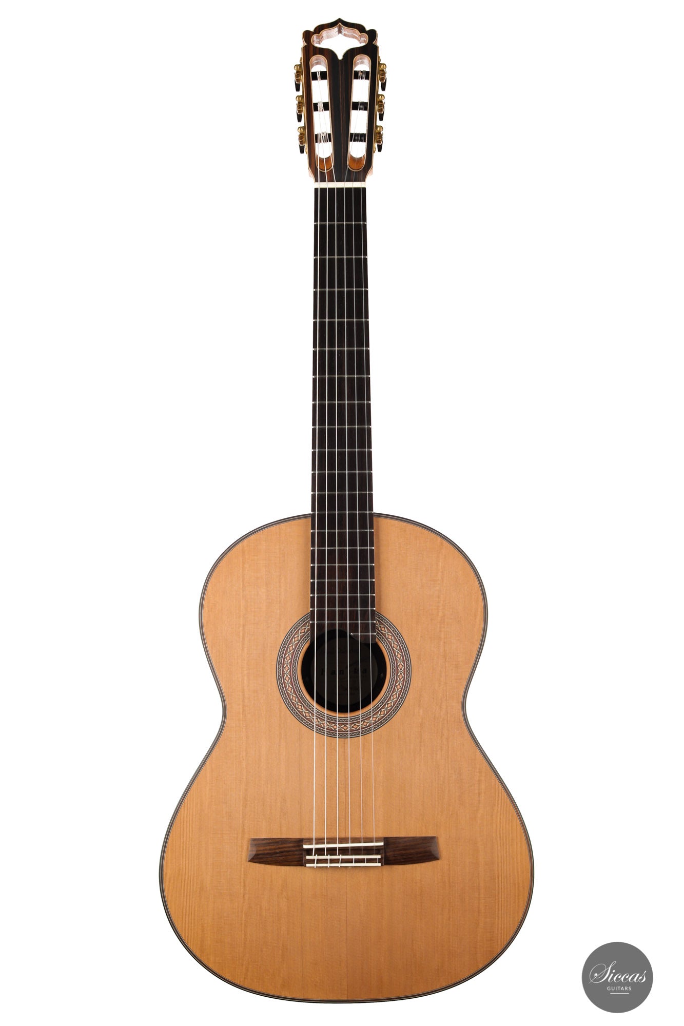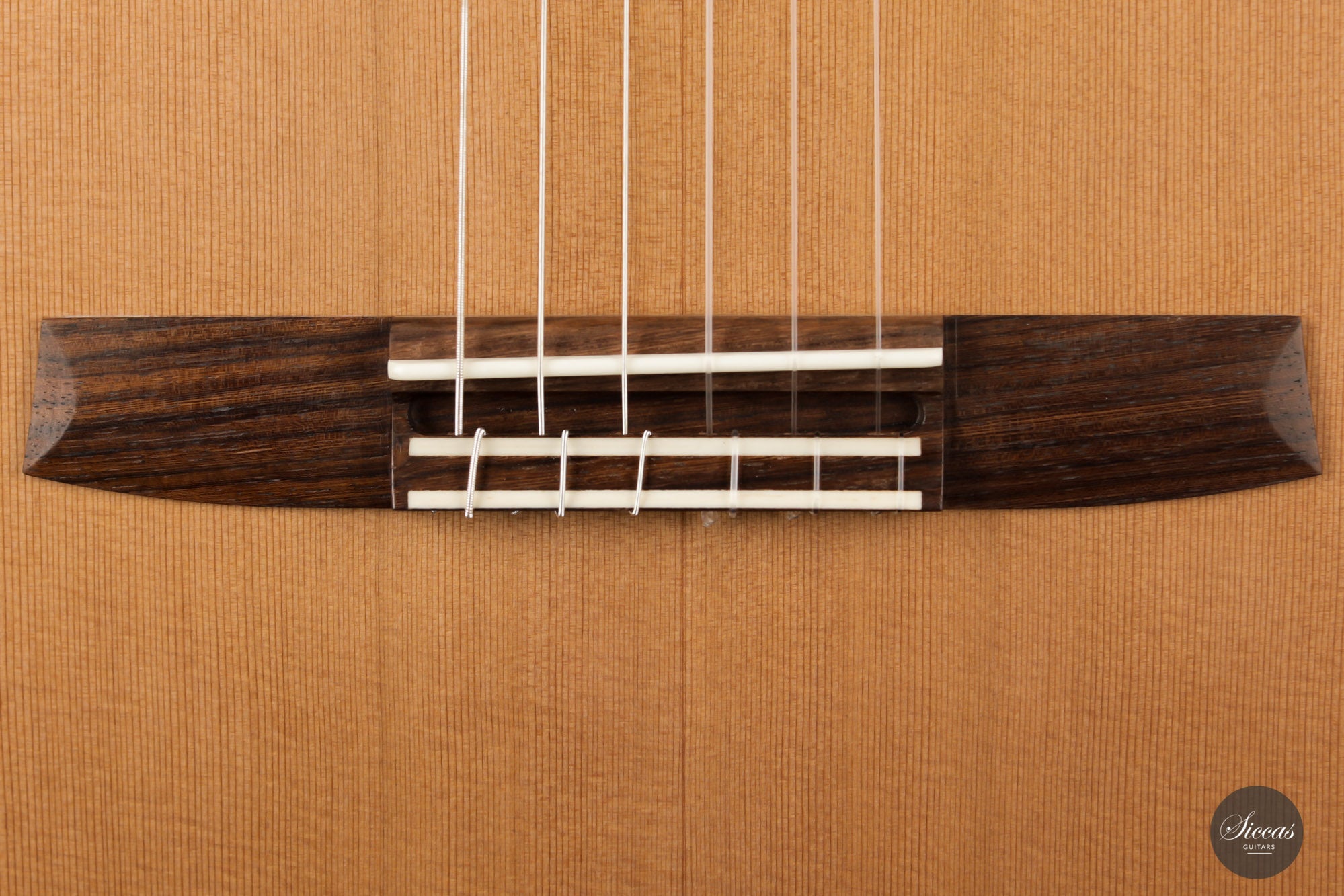 The volume of this guitar and the quick response are impressive. The player gets a very good feedback and it’s easy to play so that the player can play fast and virtuous. Depth of bass comes from an air resonance somewhat lower than F. The balance between the treble, middle and bass is very good. The tuning machines are made by Alessi. Comes with a Hanika Hiscox Pro II case.