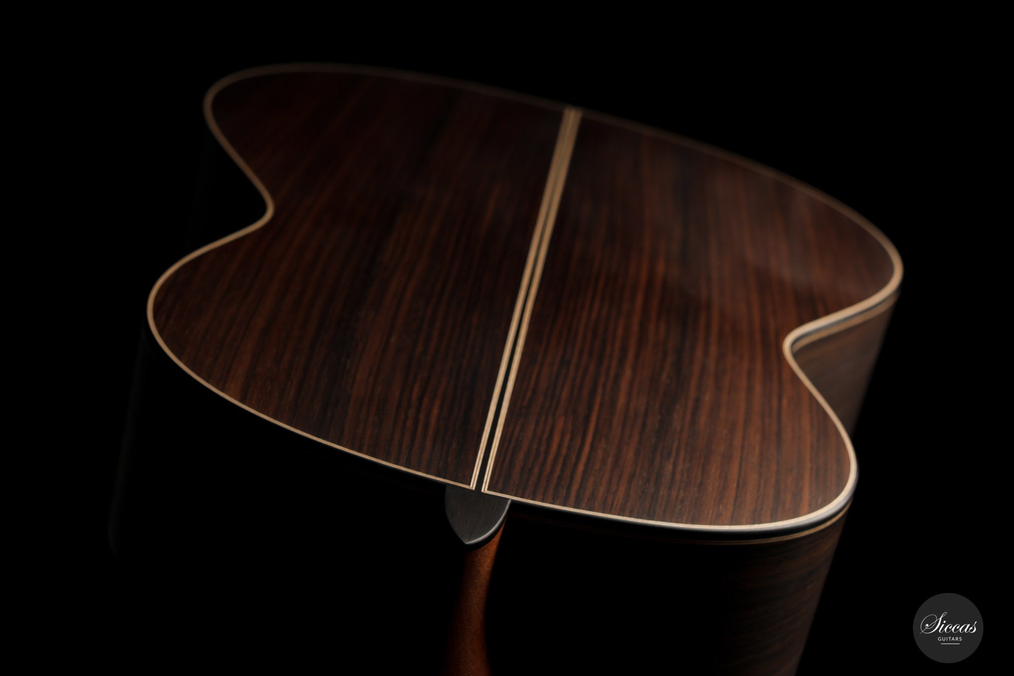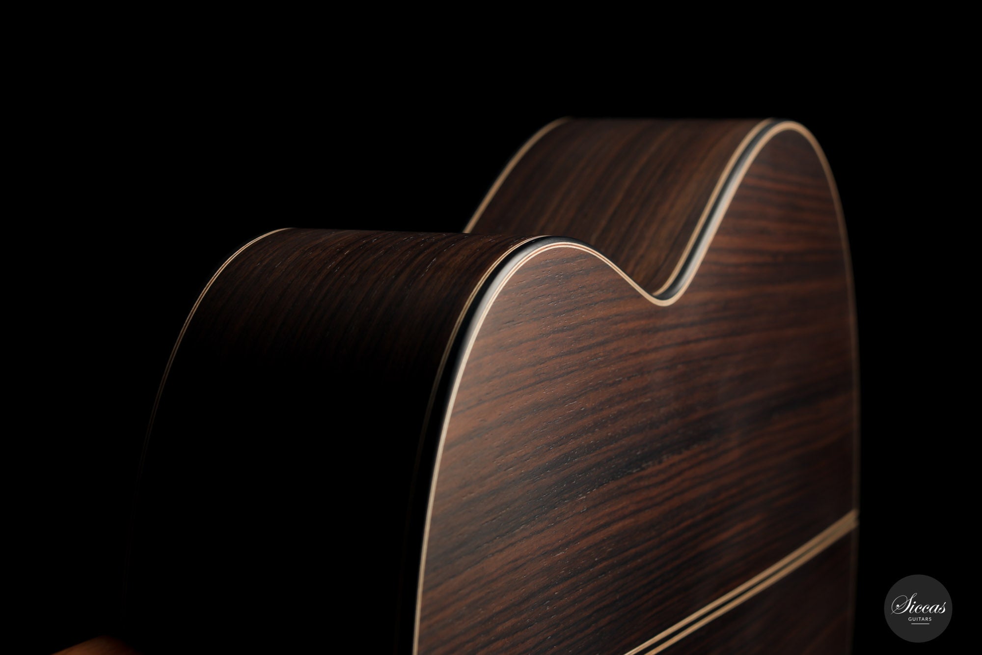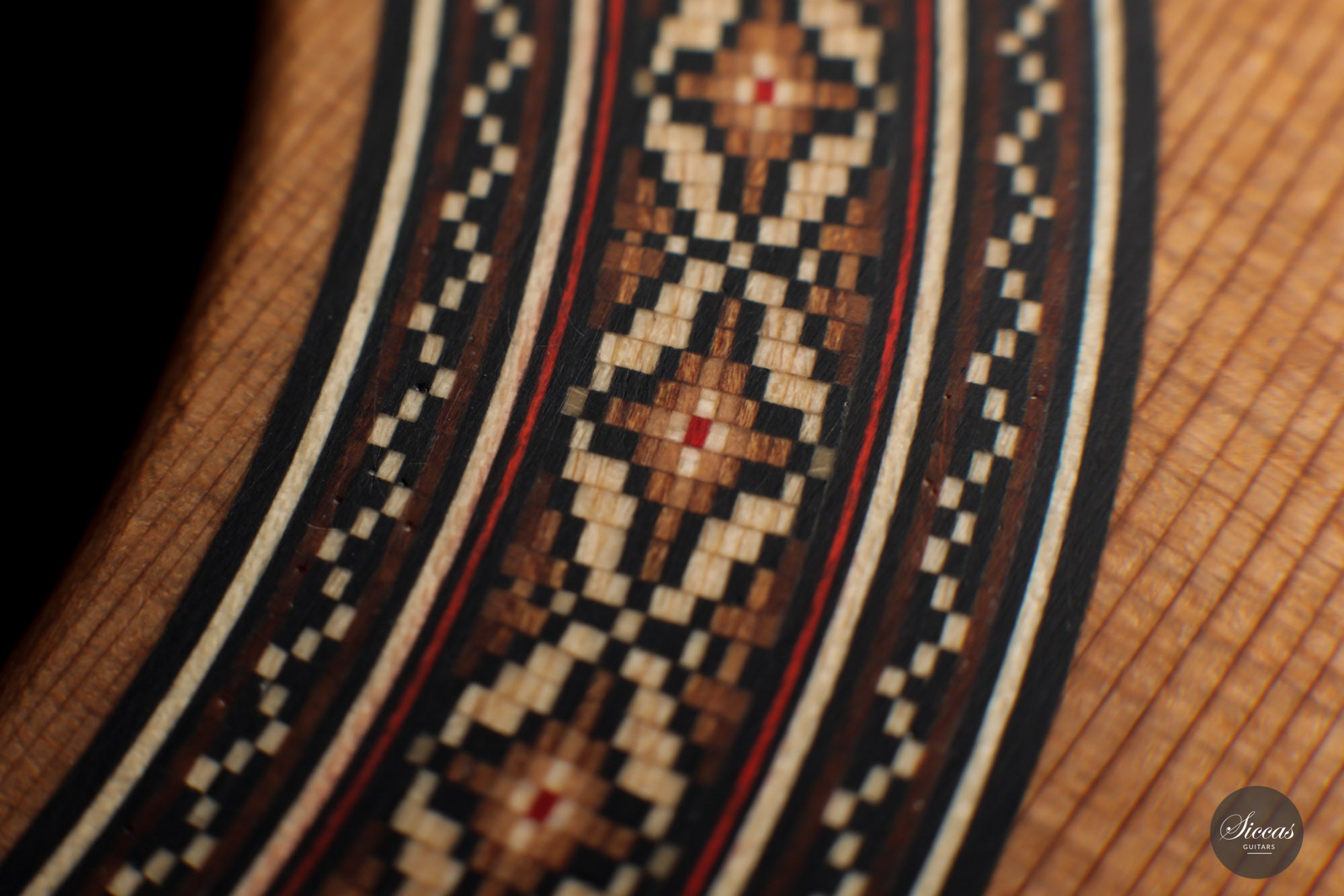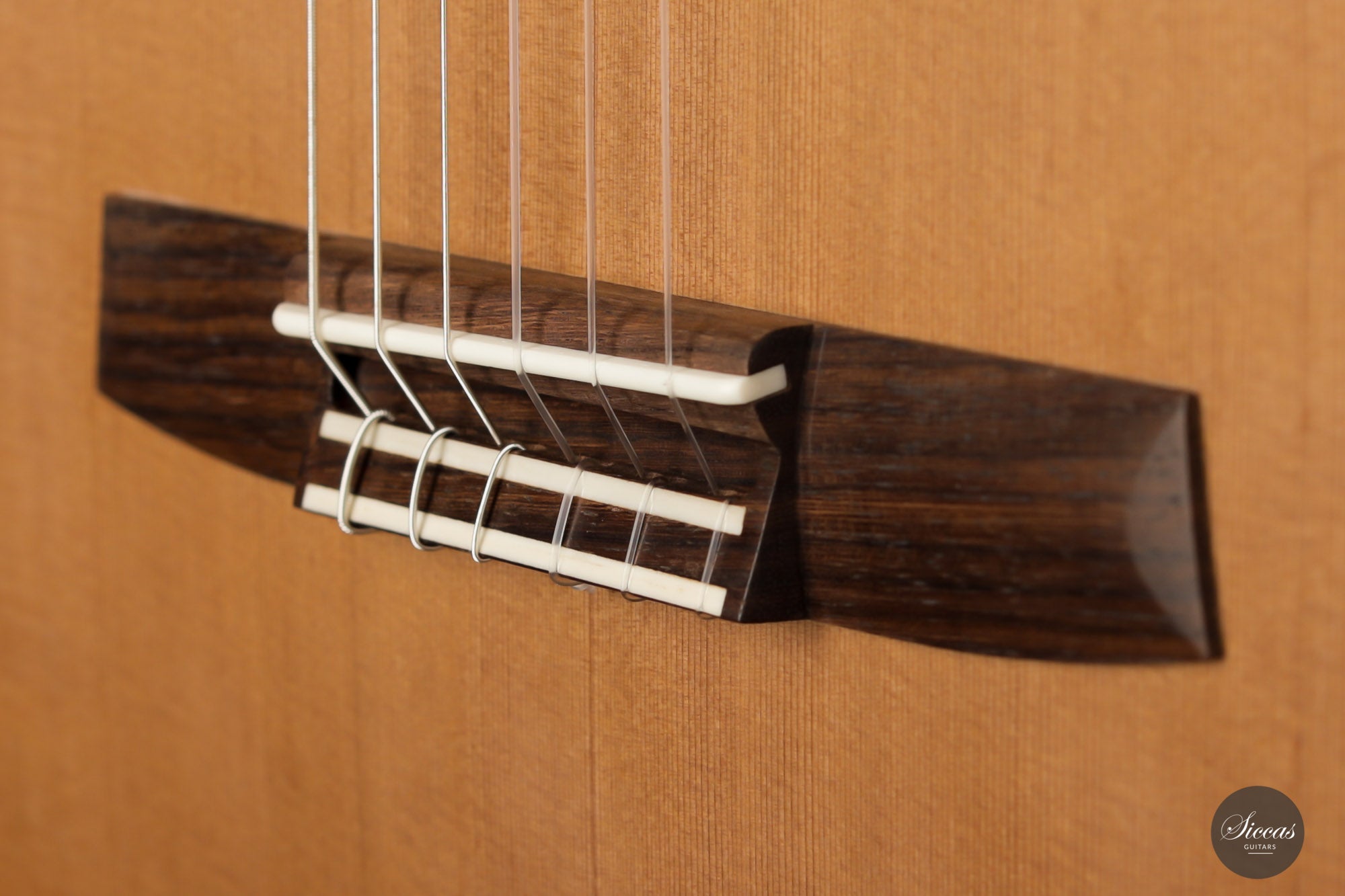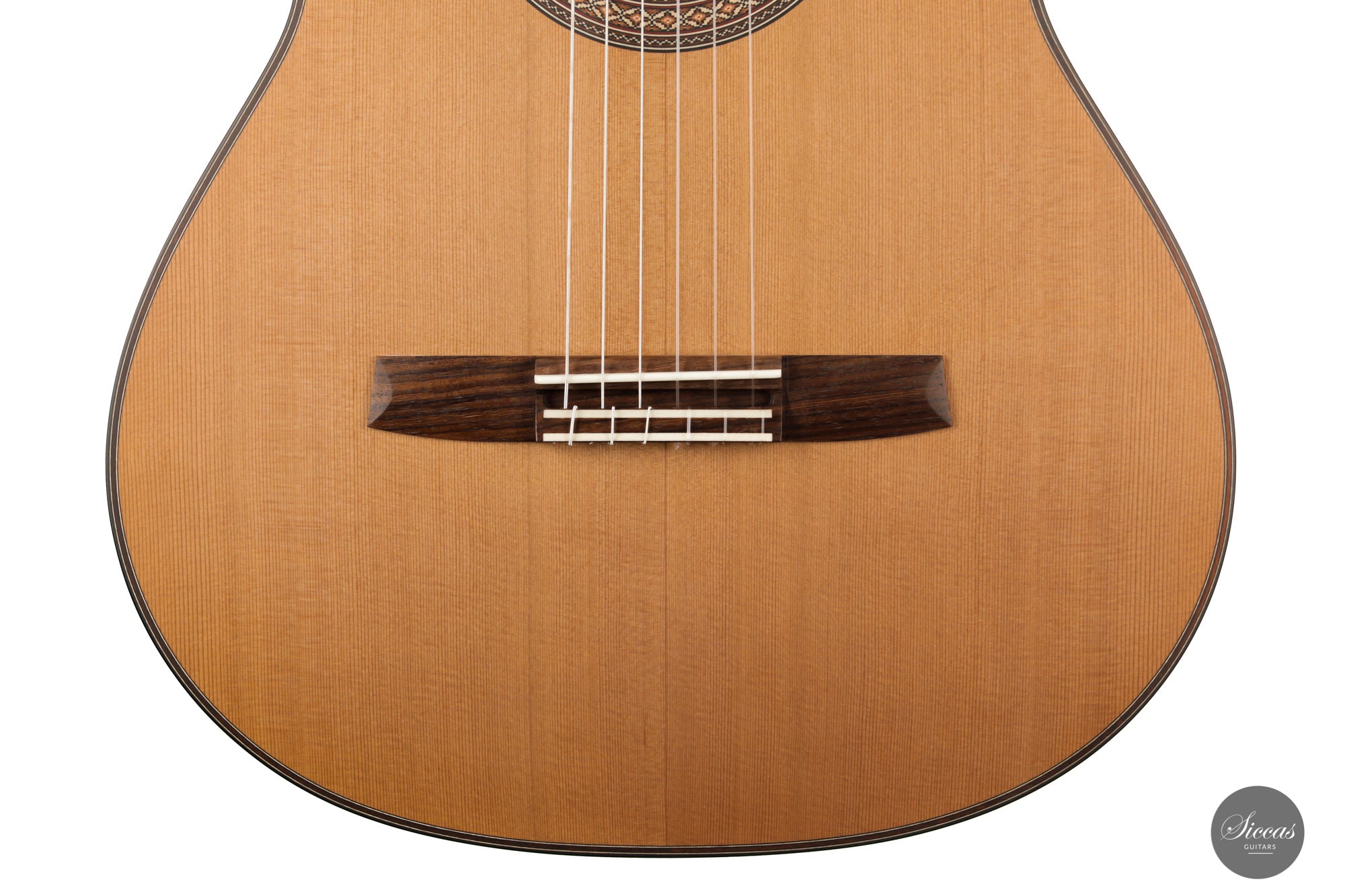The volume of this guitar and the quick response are impressive. The player gets a very good feedback and it’s easy to play so that the player can play fast and virtuous. Depth of bass comes from an air resonance somewhat lower than F. The balance between the treble, middle and bass is very good. The tuning machines are made by Alessi. Comes with a Hanika Hiscox Pro II case.
