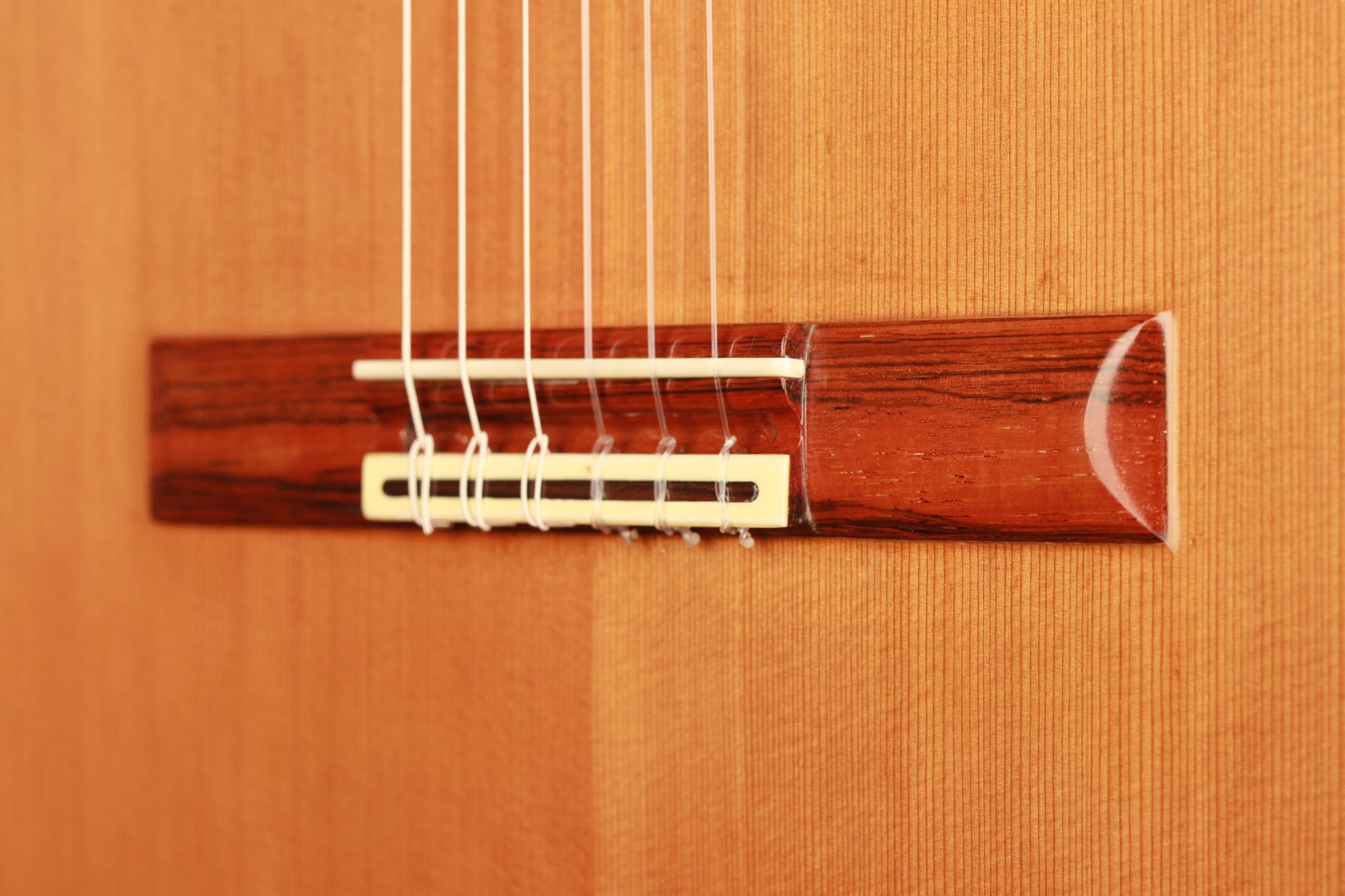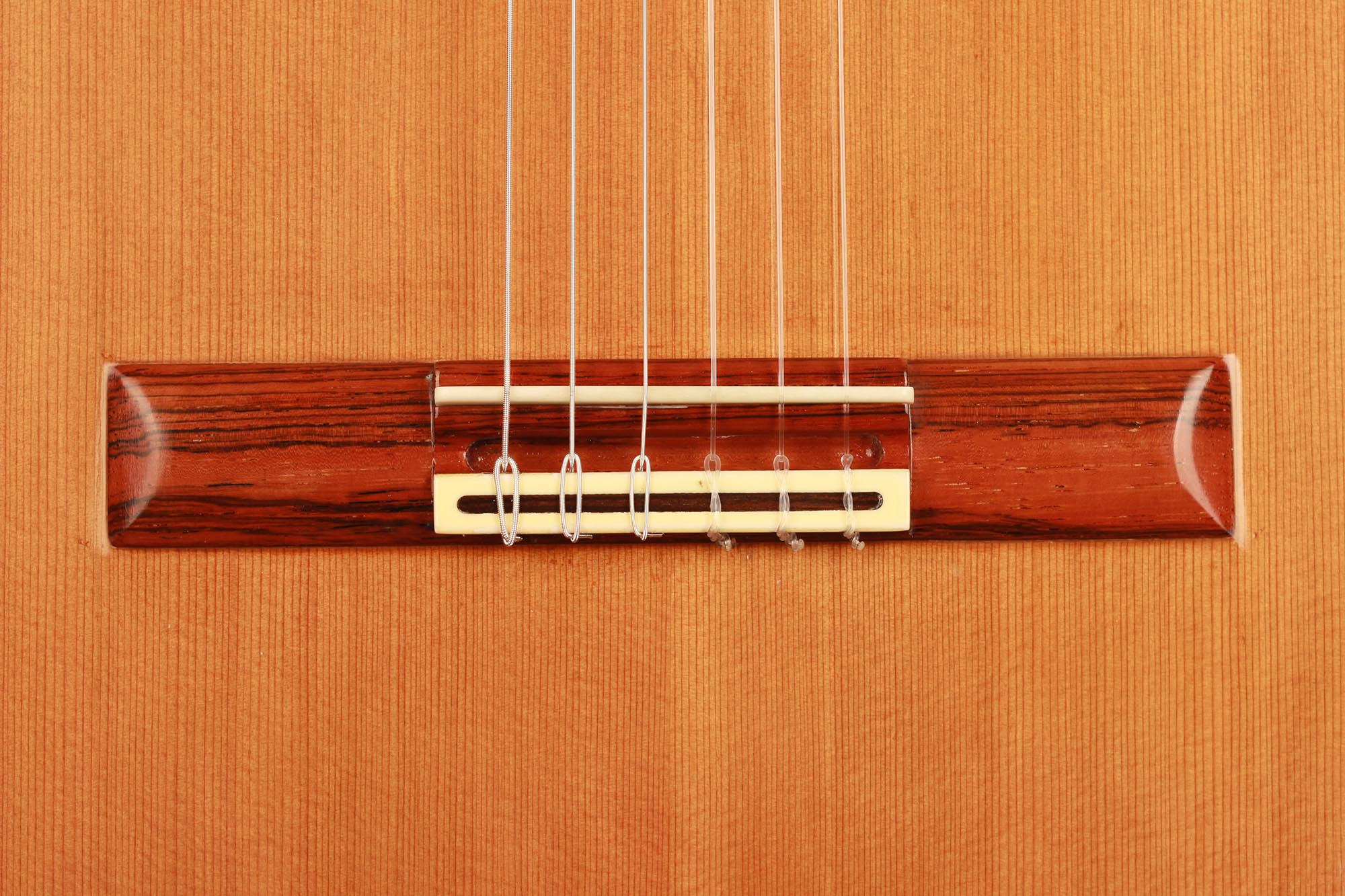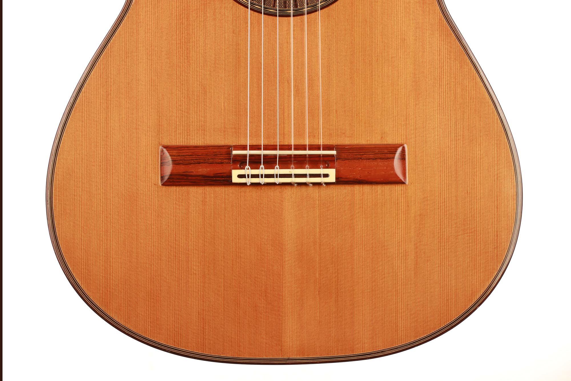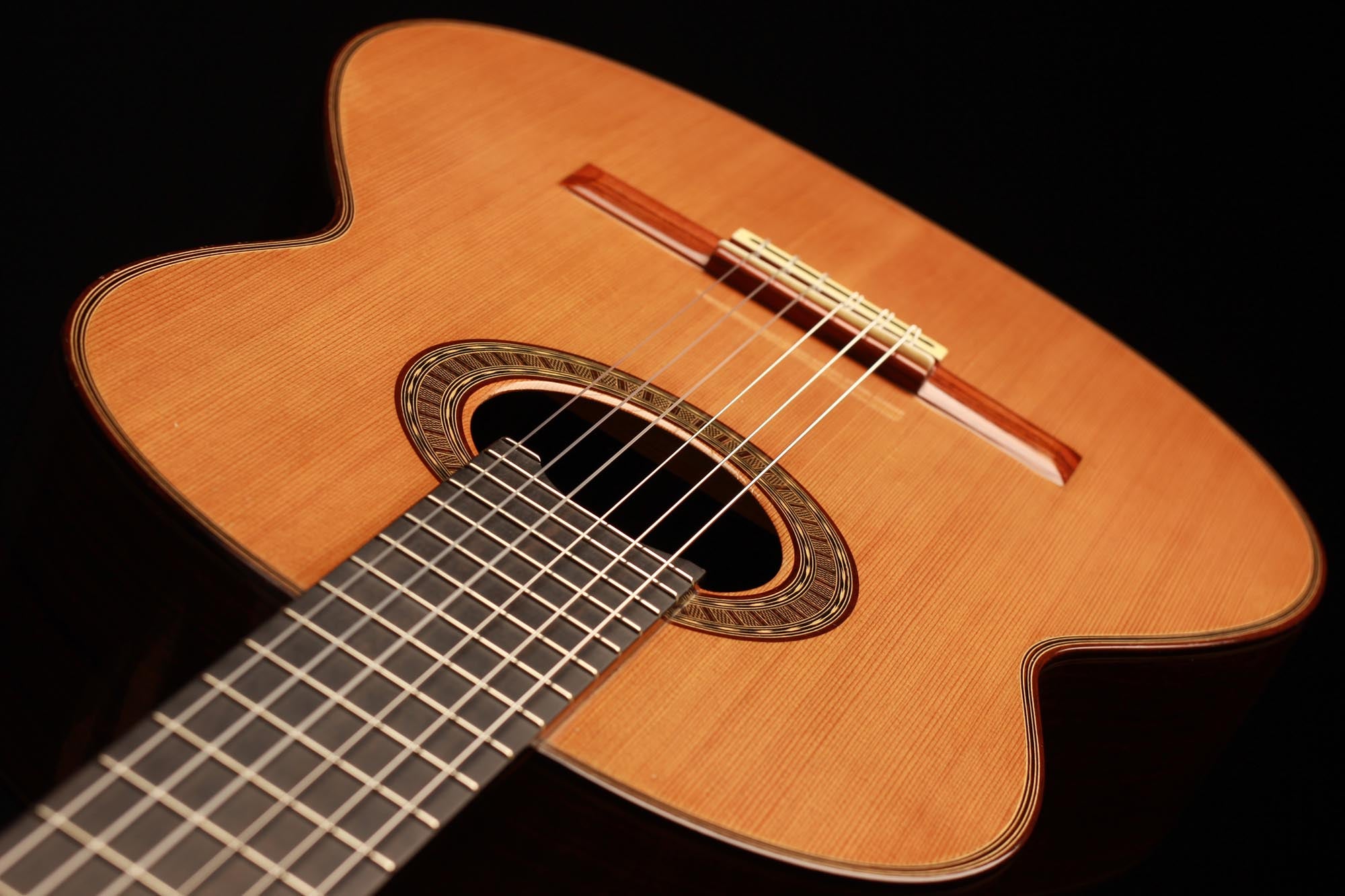 This very interesting 2005 concert model has a beautifully built seven-piece arched back in the style of a baroque guitar or a lute. This striking feature gives both a unique look to this instrument and provides some extra power and sustain. The separation of voices and the overall balance in this guitar are remarkable and the sound-character is rather nice and bright for a cedar top.