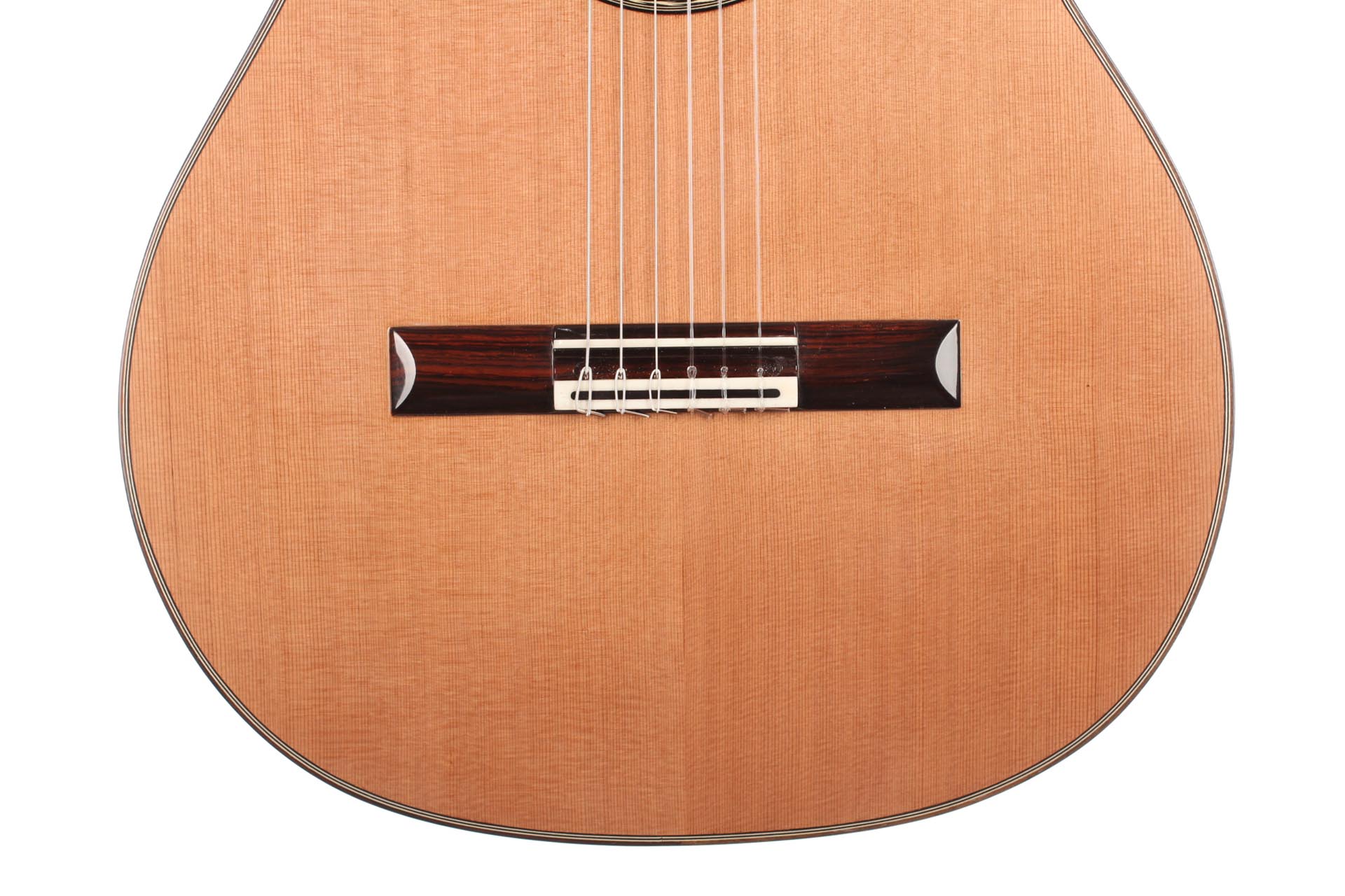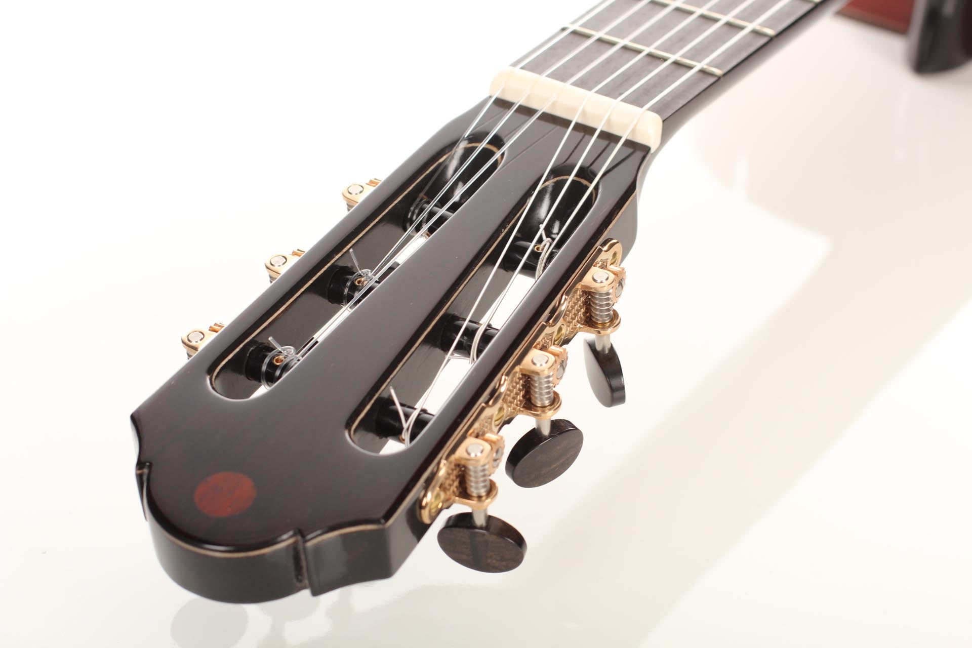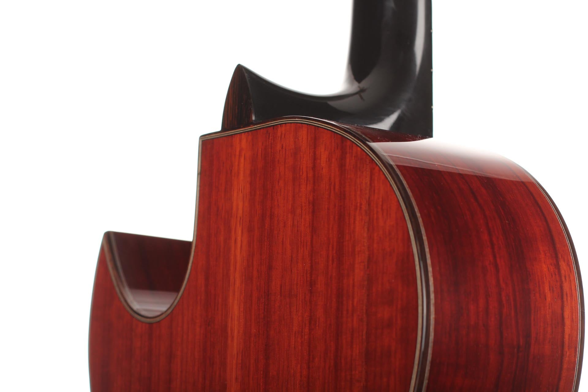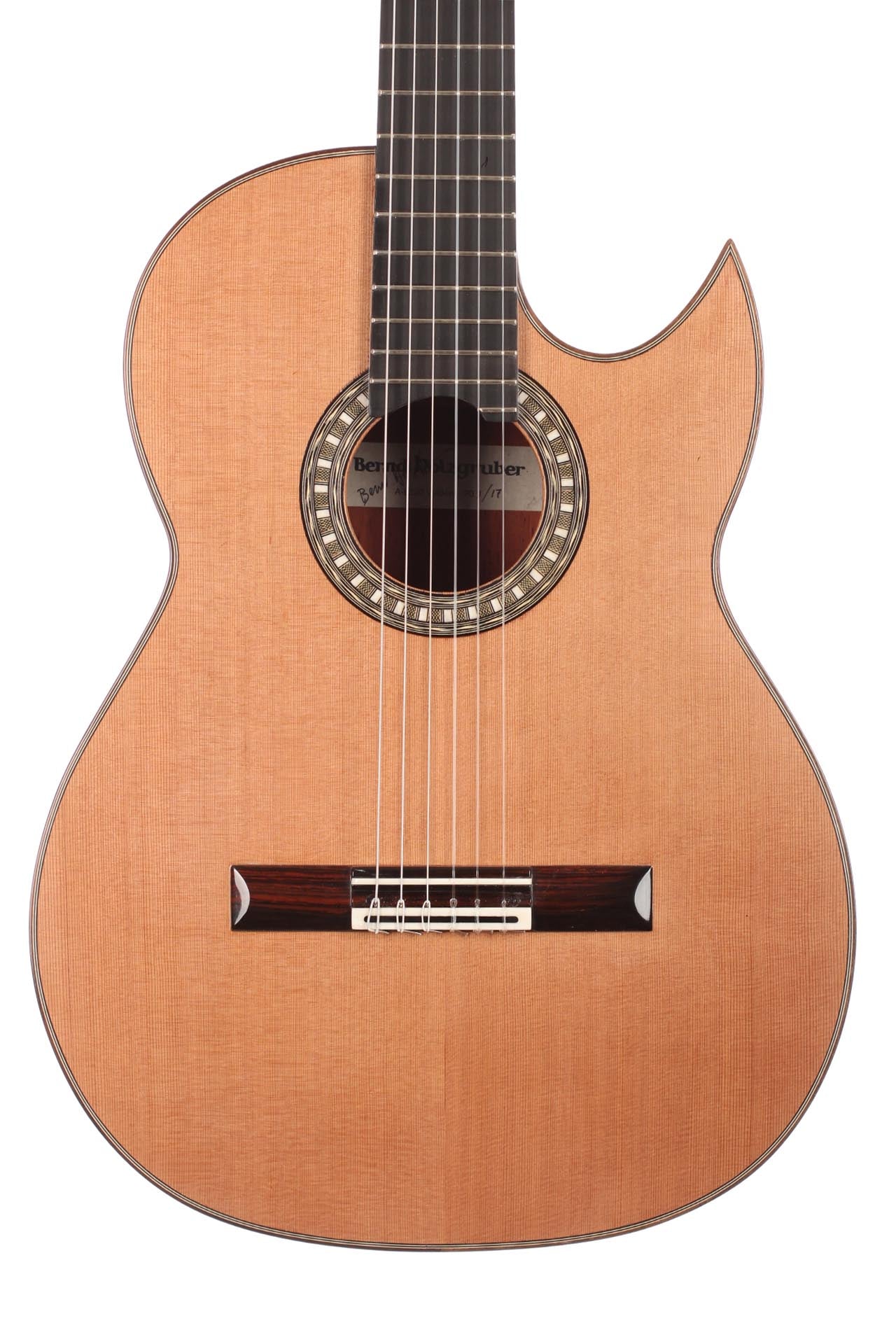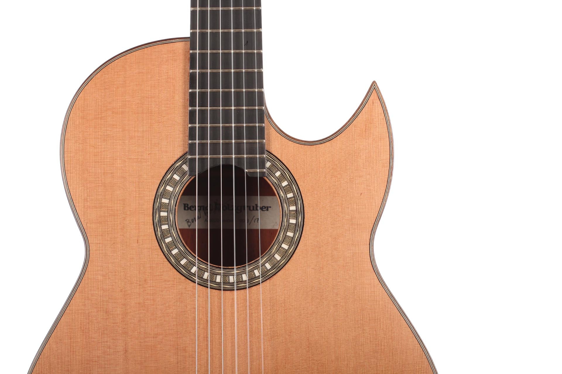 This guitar was built in 2017 and is wearing the number 203. It is a great example of B. Holzgruber’s versatility and craftsmanship. This modern guitar has a fine cedar top, braced in a very personal way that corresponds to the results of the master’s acoustic researches. This free-to-vibrate top is contrasting with the dense Bloodwood (Brosimum rubescens) back and sides to give a balanced, warm and subtle instrument. The cutaway and the black finish on the neck are giving to the guitar a fresh and modern character and this instrument would fit perfectly any crossover guitarist researching for a versatile guitar. The tuners are made by Sloane. A Hiscox Pro II case is included. The bridge as well as other marquetry details are built with CITES-certified Brazilian rosewood (Dalbergia nigra).