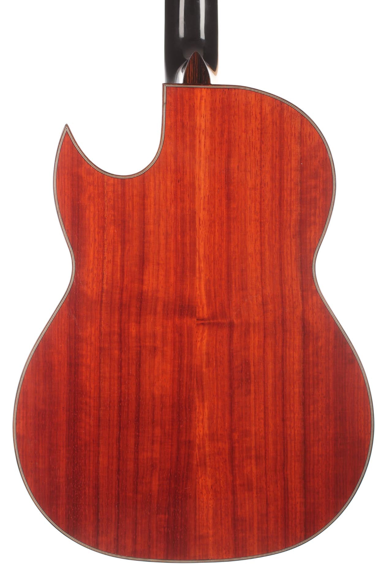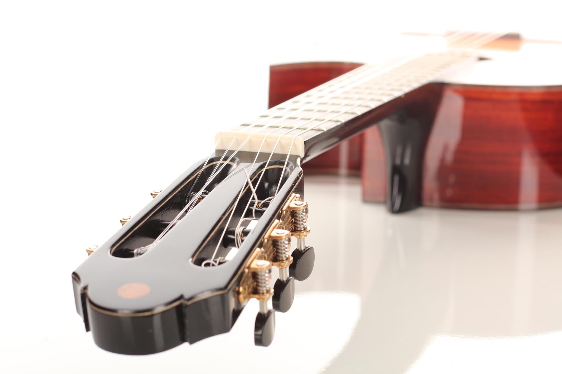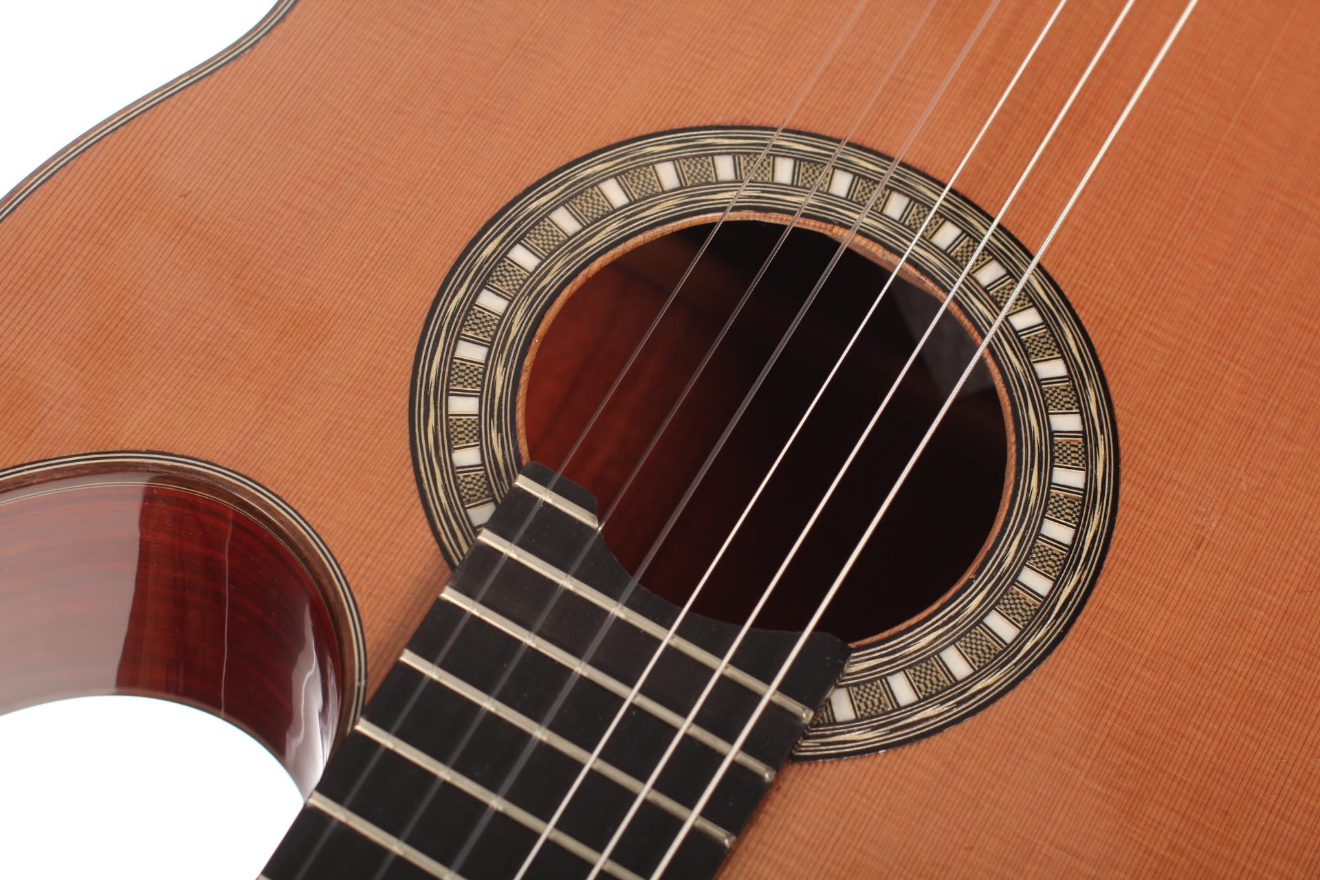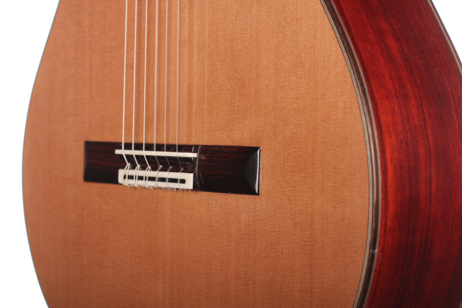 This guitar was built in 2017 and is wearing the number 203. It is a great example of B. Holzgruber’s versatility and craftsmanship. This modern guitar has a fine cedar top, braced in a very personal way that corresponds to the results of the master’s acoustic researches. This free-to-vibrate top is contrasting with the dense Bloodwood (Brosimum rubescens) back and sides to give a balanced, warm and subtle instrument. The cutaway and the black finish on the neck are giving to the guitar a fresh and modern character and this instrument would fit perfectly any crossover guitarist researching for a versatile guitar. The tuners are made by Sloane. A Hiscox Pro II case is included. The bridge as well as other marquetry details are built with CITES-certified Brazilian rosewood (Dalbergia nigra).