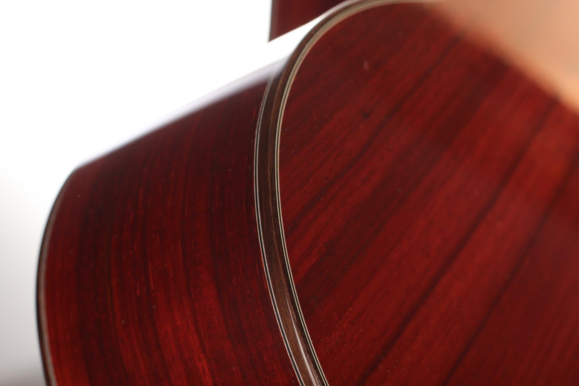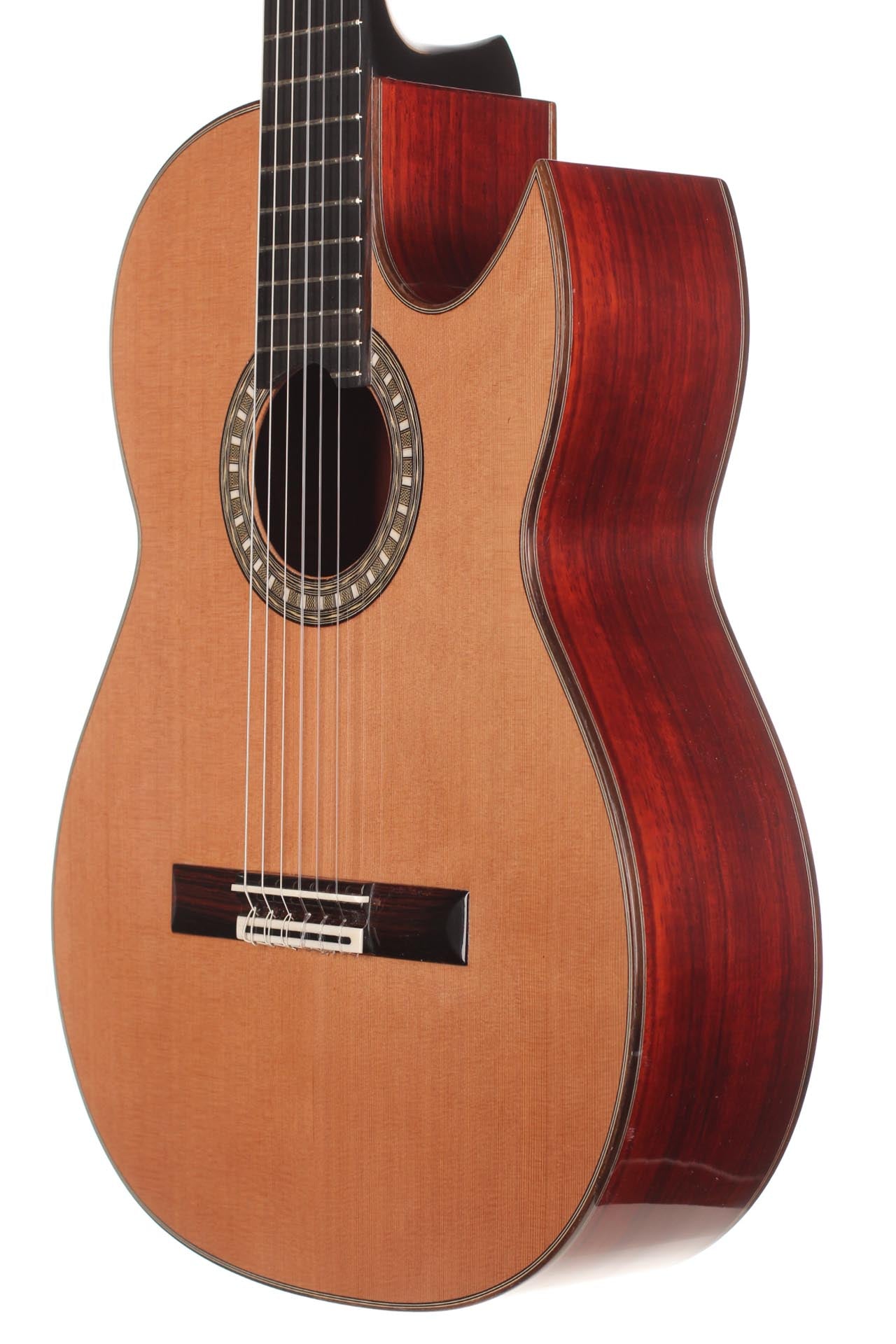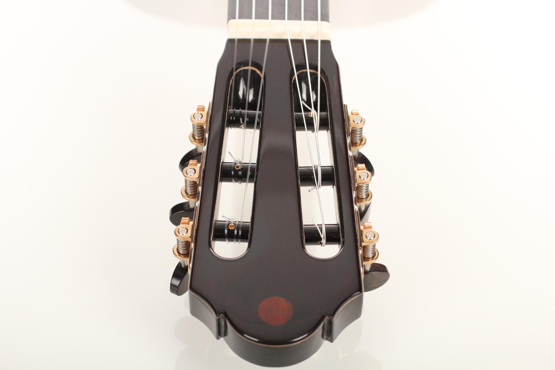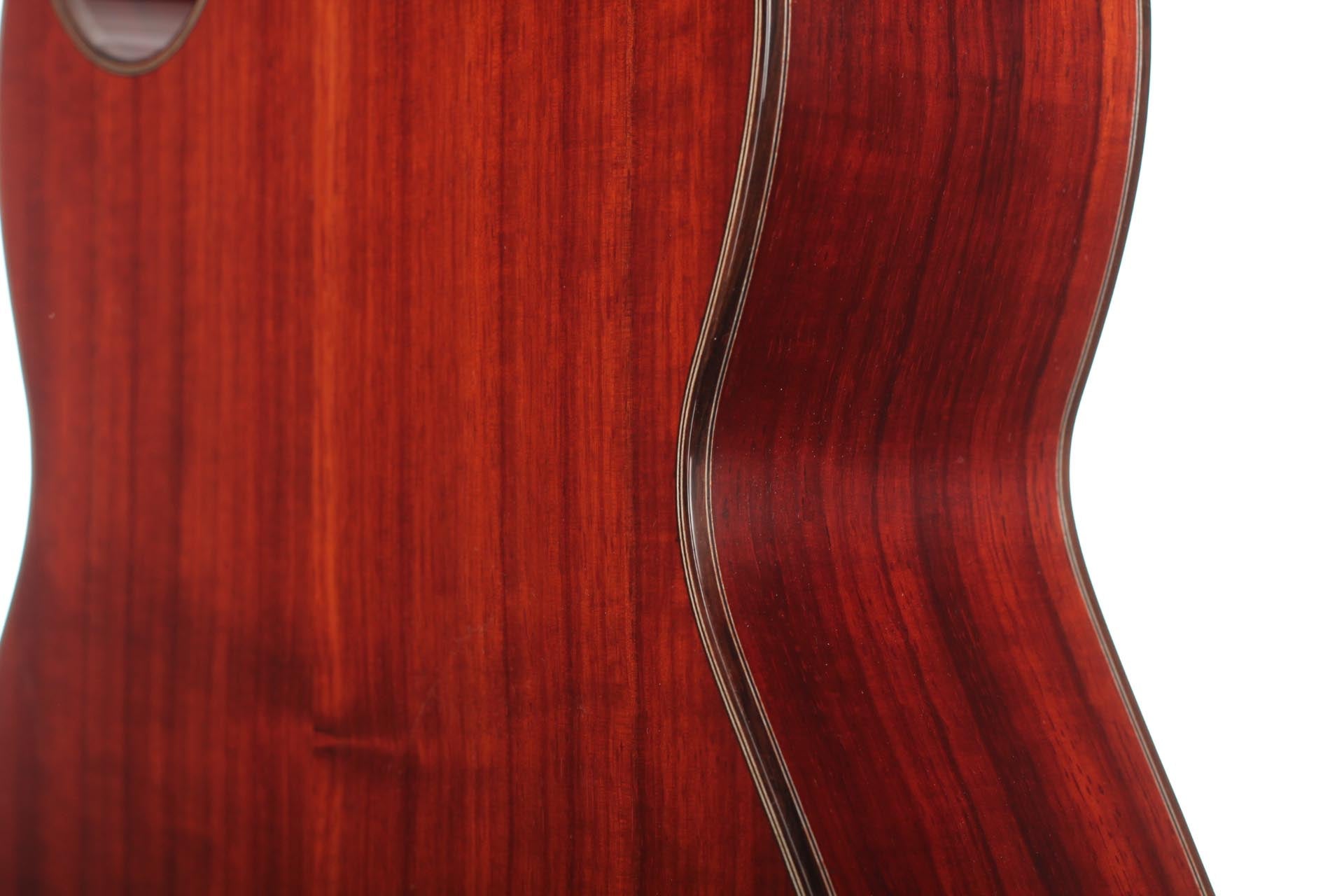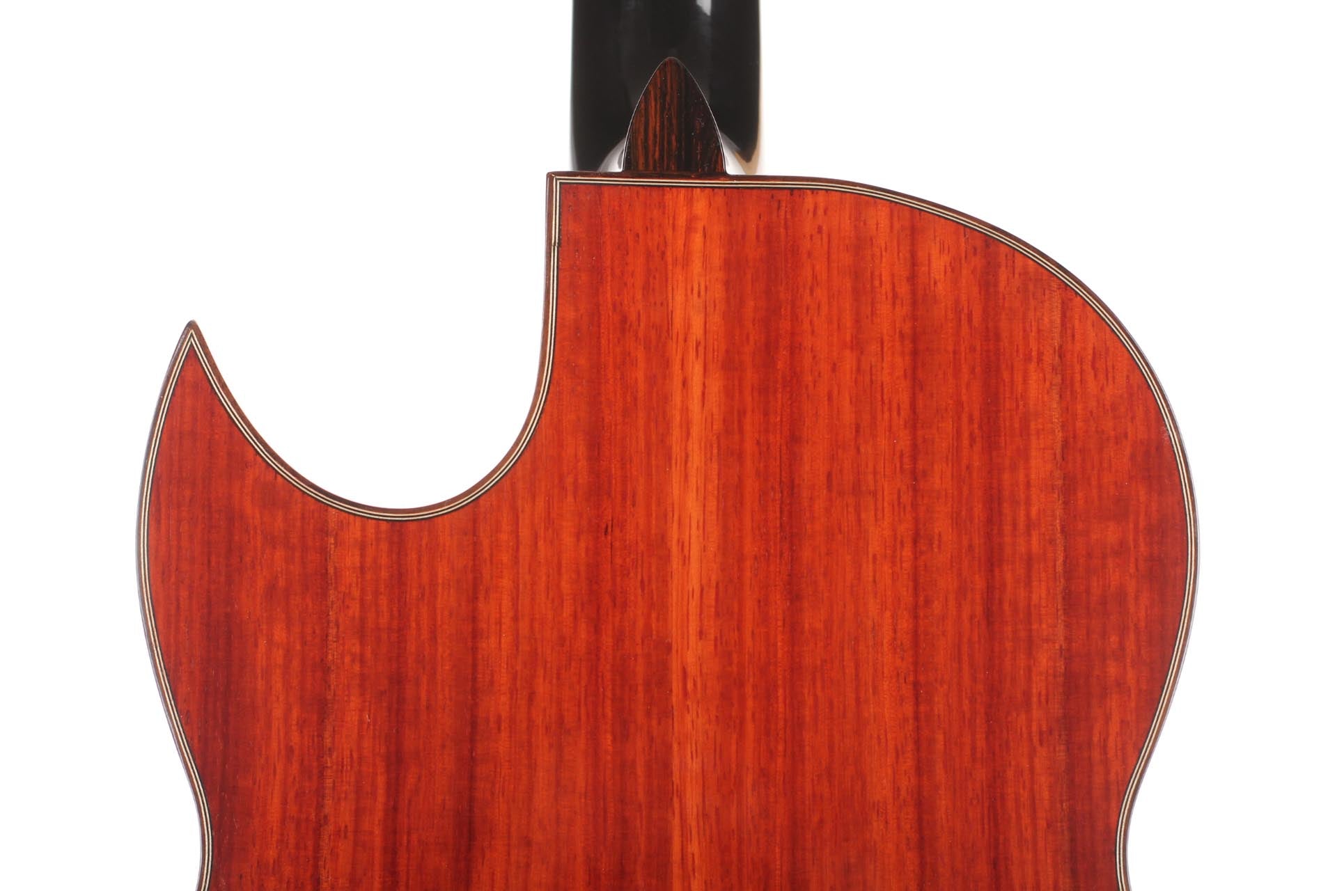 This guitar was built in 2017 and is wearing the number 203. It is a great example of B. Holzgruber’s versatility and craftsmanship. This modern guitar has a fine cedar top, braced in a very personal way that corresponds to the results of the master’s acoustic researches. This free-to-vibrate top is contrasting with the dense Bloodwood (Brosimum rubescens) back and sides to give a balanced, warm and subtle instrument. The cutaway and the black finish on the neck are giving to the guitar a fresh and modern character and this instrument would fit perfectly any crossover guitarist researching for a versatile guitar. The tuners are made by Sloane. A Hiscox Pro II case is included. The bridge as well as other marquetry details are built with CITES-certified Brazilian rosewood (Dalbergia nigra).