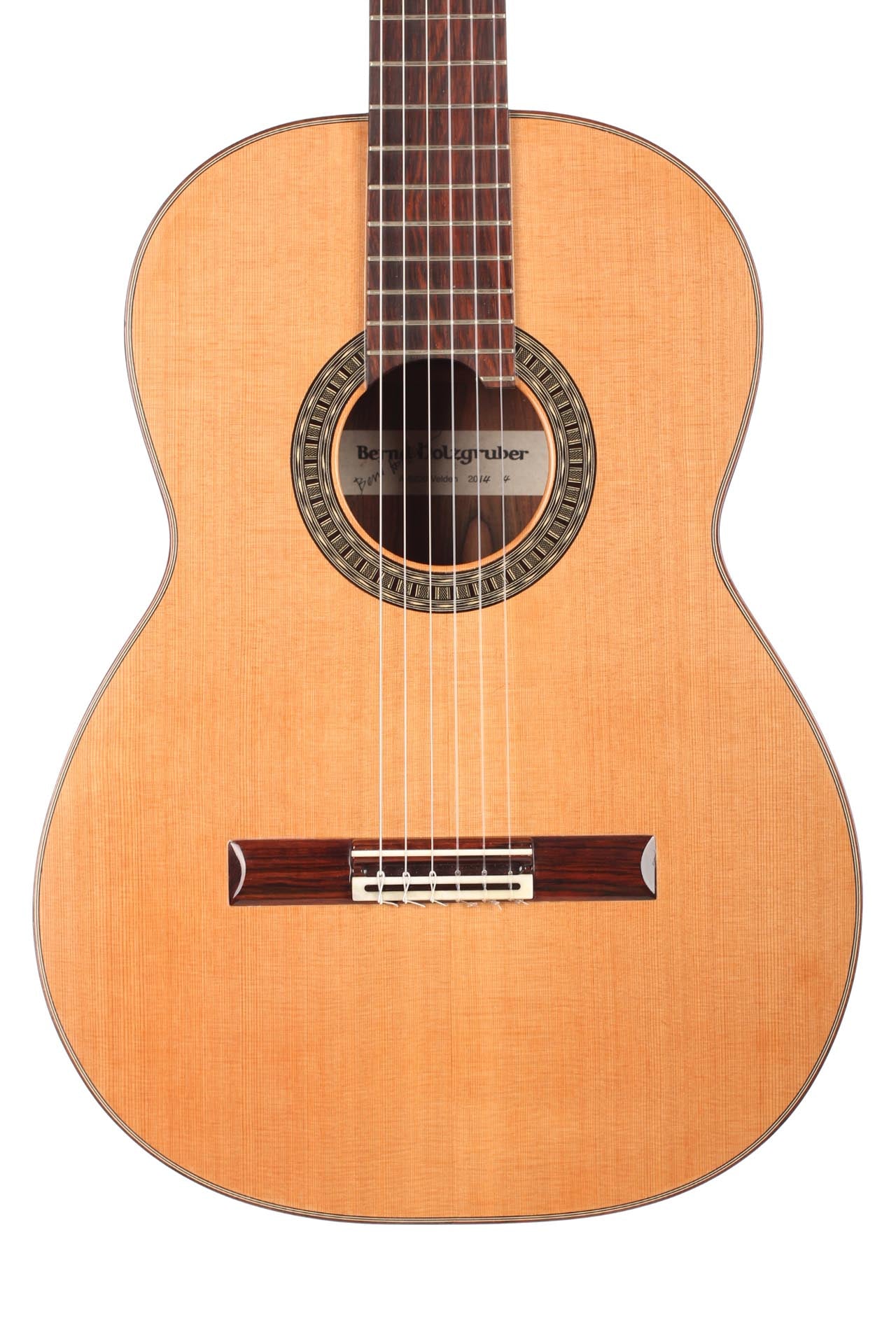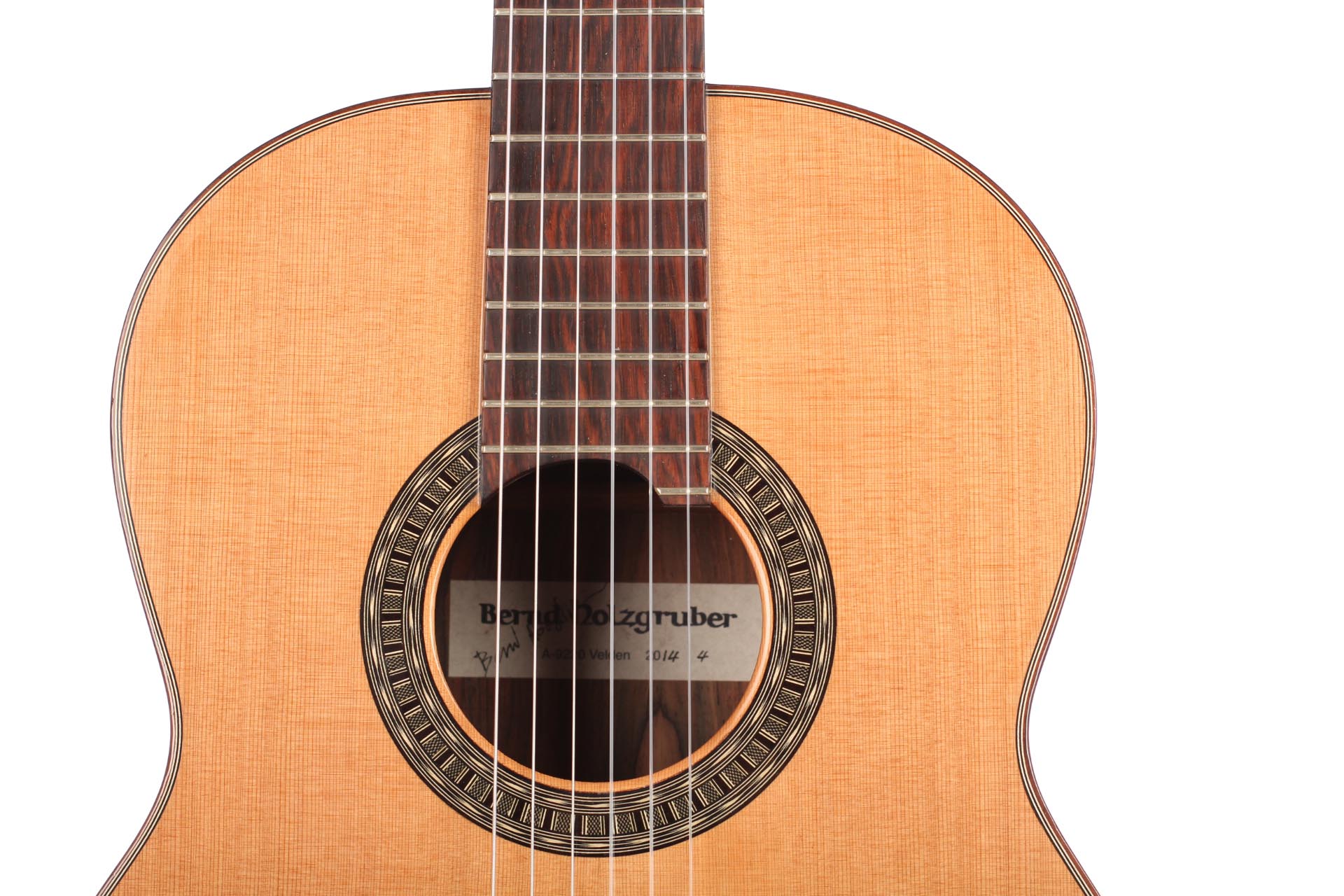 Bernd Holzgruber aus Velden am Wörthersee (Kärnten) ist Jg. 1939, studierte Gitarre in Wien bei Karl Scheit und spielte 1968 die künstlerische Reifeprüfung auf einem selbstgebauten Instrument. Seither betreute er Scheits Instrumentensammlung und hatte dabei Gelegenheit, Meistergitarren z.B. von Robert Bouchet sowie historische Lauten eingehend zu studieren. Er ist ein Pionier im Bau historischer Instrumente und ein kreativer Gitarrenbauer, der in seiner 50-jährigen Laufbahn seine Modelle immer wieder weiterentwickelte. Die Decke dieser Gitarre ist aus Zeder in Doubletop-Bauweise (Aramid) gefertigt. Die Decke hat keine Beleistung und hat lediglich zwei Verstärkungen die seitlich an der Decke verlaufen. Boden und Zargen sind aus ostindischem Palisander gefertigt. Die Mechaniken sind von Gotoh. Ein Hartschalenkoffer ist inklusive.