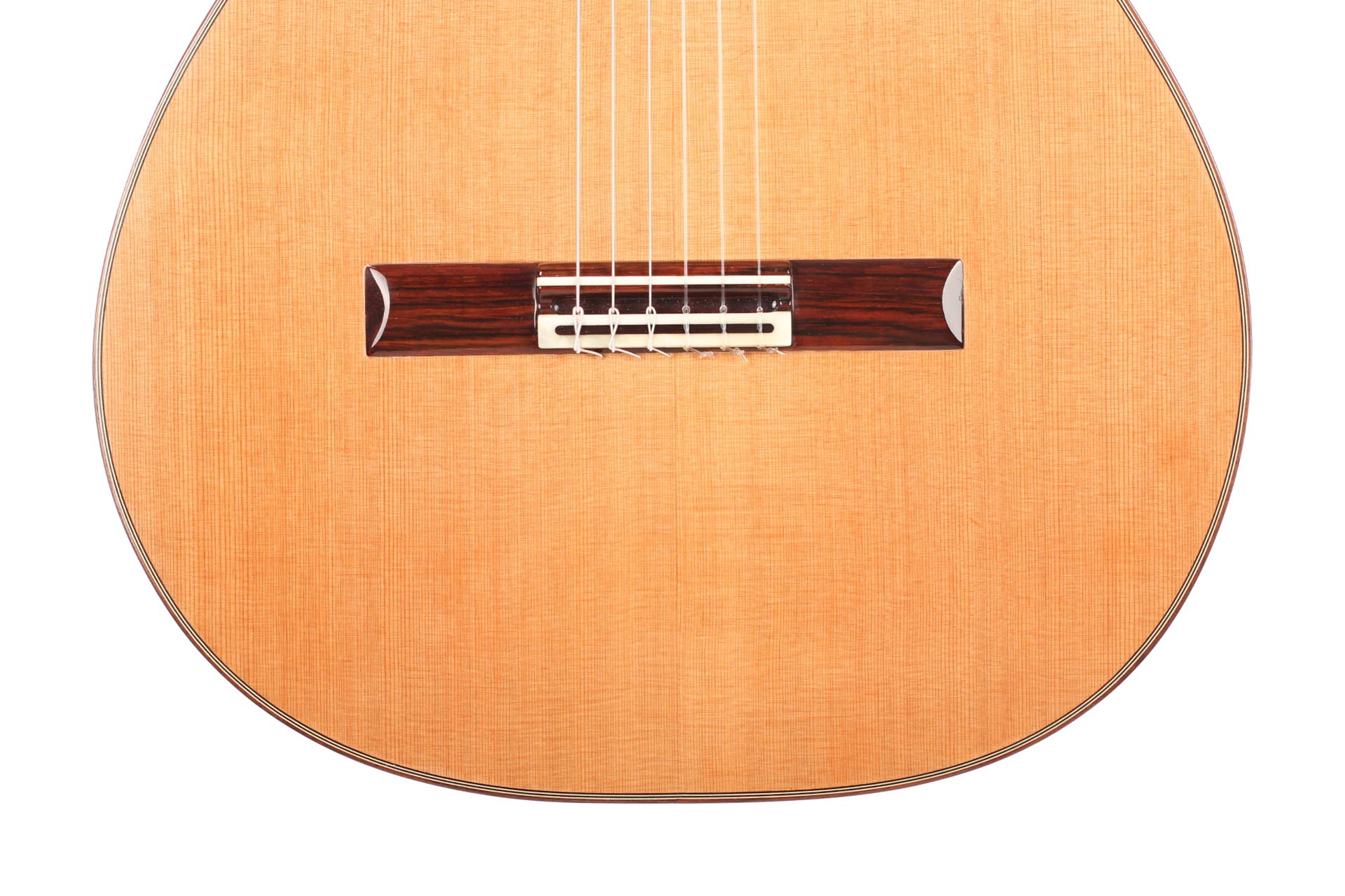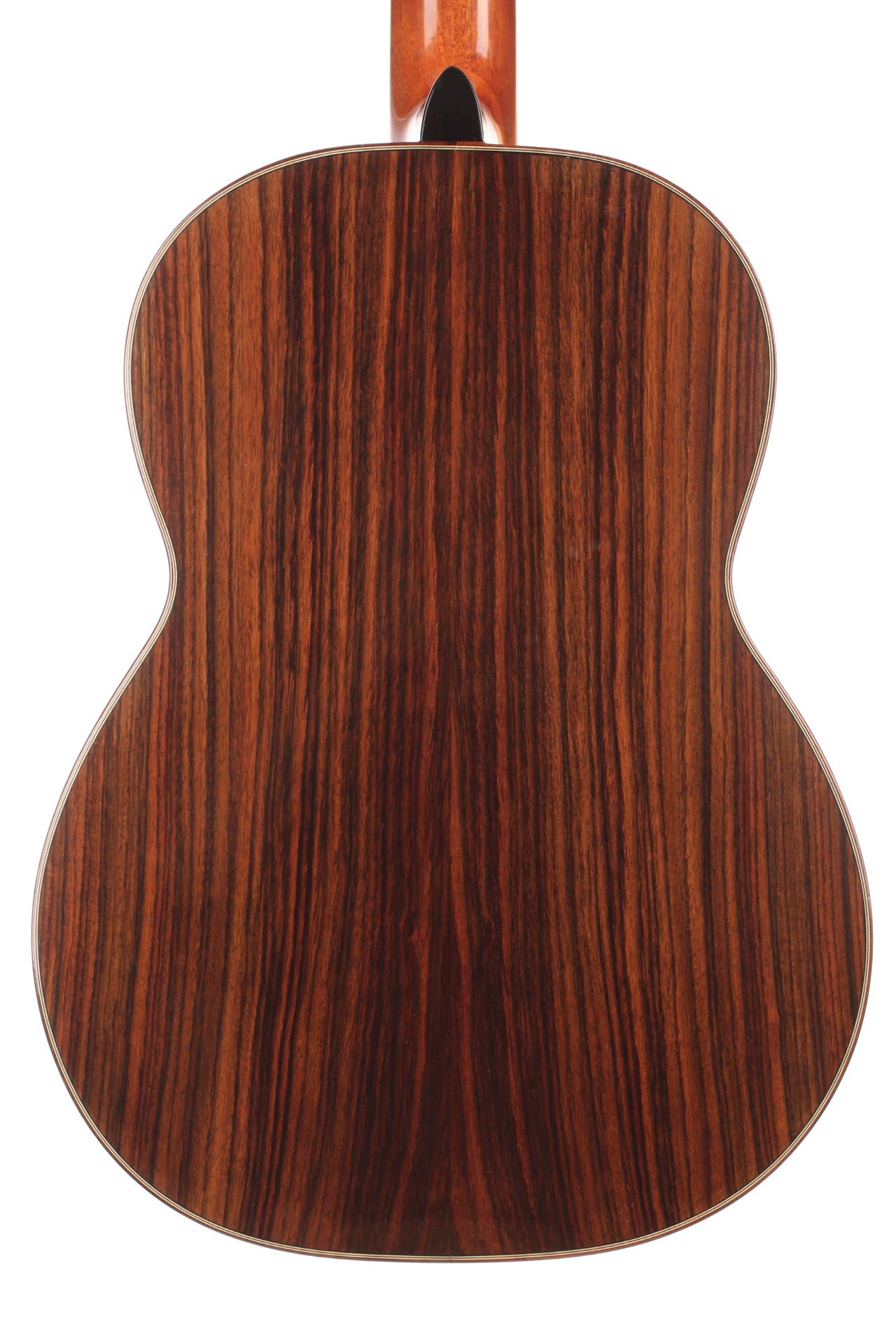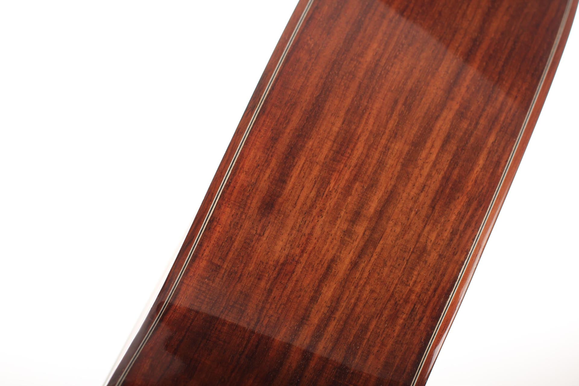 Bernd Holzgruber aus Velden am Wörthersee (Kärnten) ist Jg. 1939, studierte Gitarre in Wien bei Karl Scheit und spielte 1968 die künstlerische Reifeprüfung auf einem selbstgebauten Instrument. Seither betreute er Scheits Instrumentensammlung und hatte dabei Gelegenheit, Meistergitarren z.B. Robert Bouchet sowie historische Lauten eingehend zu studieren. Er ist ein Pionier im Bau historischer Instrumente und ein kreativer Gitarrenbauer, der in seiner 50-jährigen Laufbahn seine Modelle immer wieder weiterentwickelte. Die Decke dieser Gitarre ist aus Zeder in Doubletop-Bauweise (Aramid) gefertigt. Die Decke hat keine Beleistung und hat lediglich zwei Verstärkungen die seitlich an der Decke verlaufen. Boden und Zargen sind aus ostindischem Palisander gefertigt. Die Mechaniken sind von Gotoh. Ein Hartschalenkoffer ist inklusive.