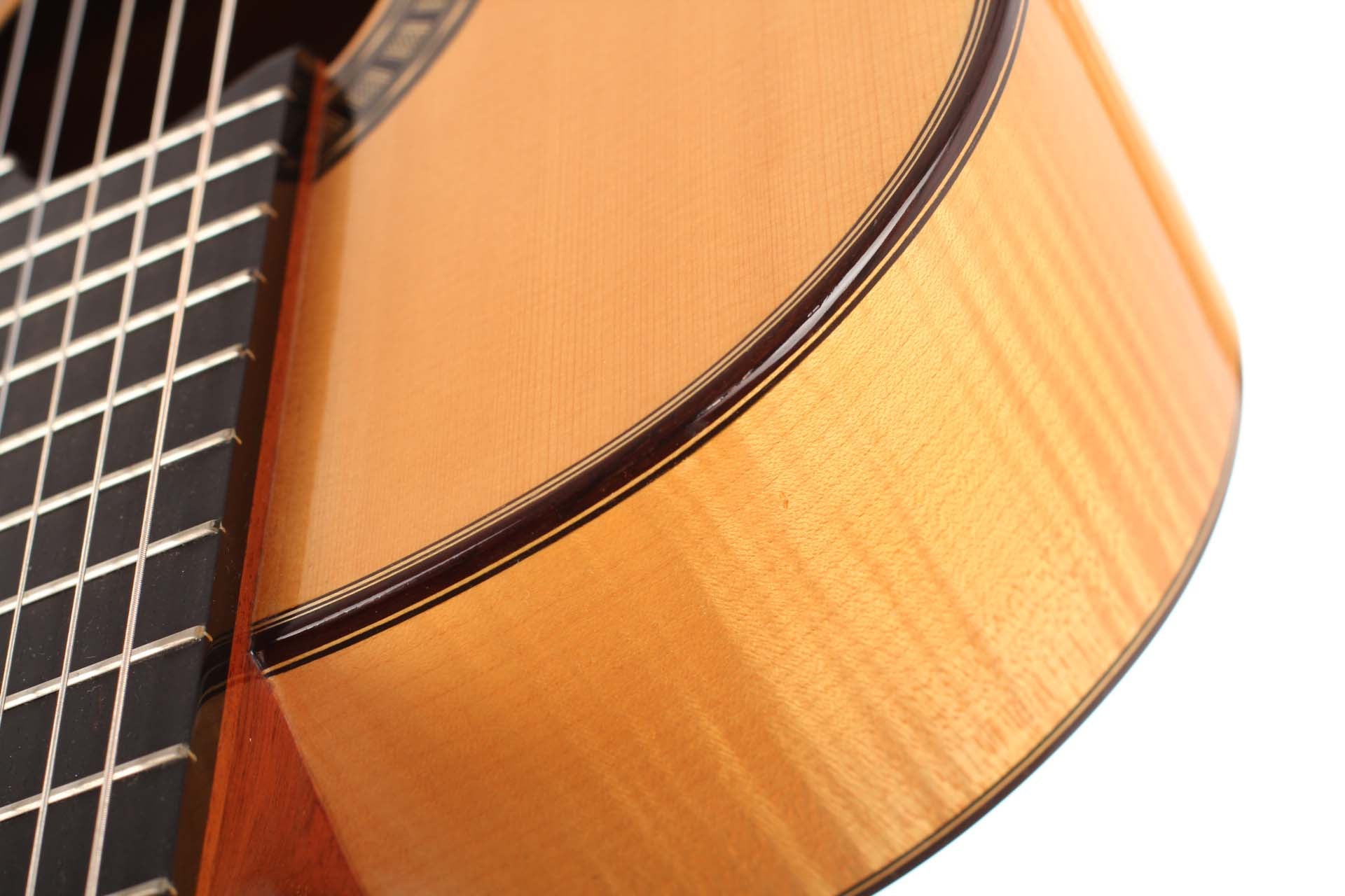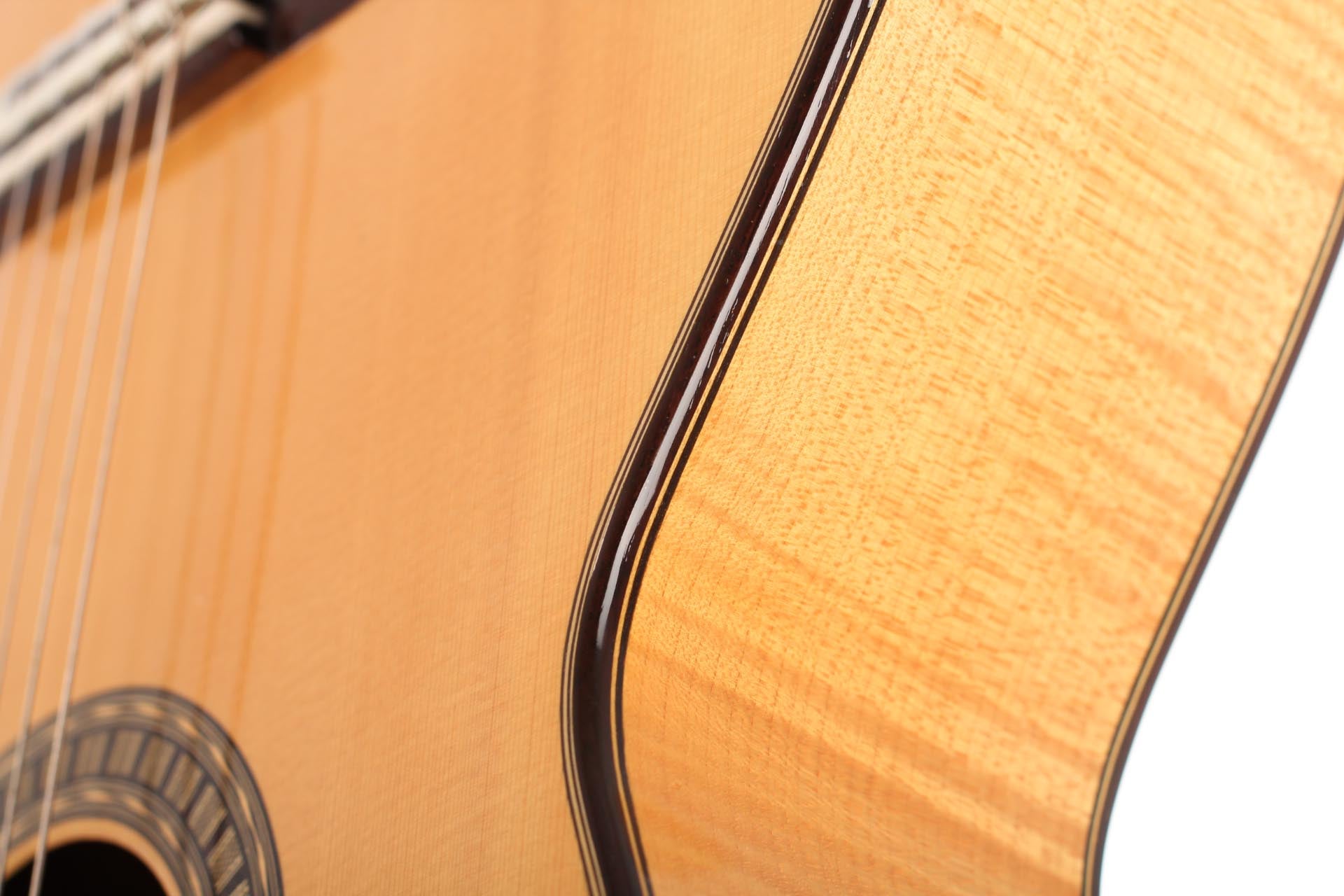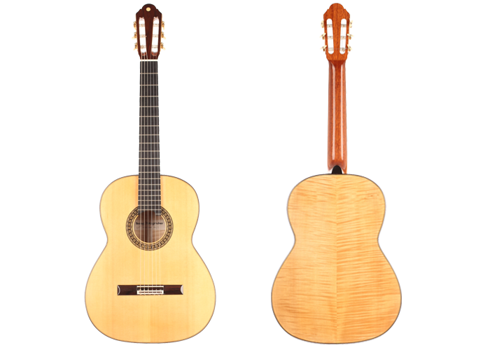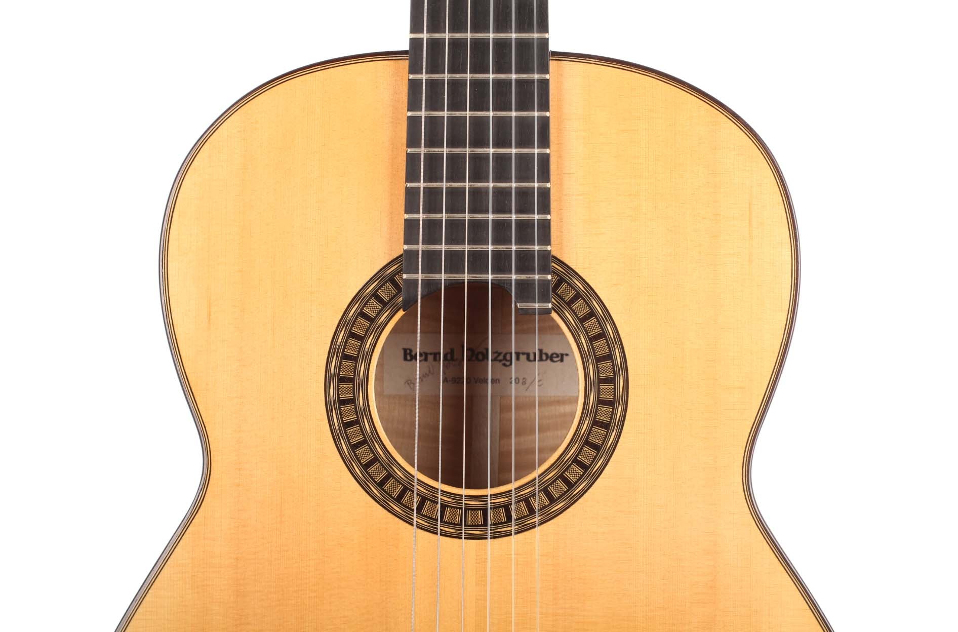 Bernd Holzgruber aus Velden am Wörthersee (Kärnten), geb. 1939, studierte Gitarre in Wien bei Karl Scheit und spielte 1968 die künstlerische Reifeprüfung auf einem selbstgebauten Instrument. Seither betreute er Scheits Instrumentensammlung und hatte dabei Gelegenheit, Meistergitarren z.B. von Robert Bouchet sowie historische Lauten eingehend zu studieren. Er ist ein Pionier im Bau historischer Instrumente und ein kreativer Gitarrenbauer, der in seiner 50-jährigen Laufbahn seine Modelle immer wieder weiterentwickelte. Die Fichtendecke dieser Gitarre ist in Lattice-Bauweise gefertigt. Boden und Zargen sind aus Ahorn gefertigt, wobei die Zargen mit Fichte furniert sind. Die Mechaniken sind von Fustero. Ein Hartschalenkoffer ist inklusive.