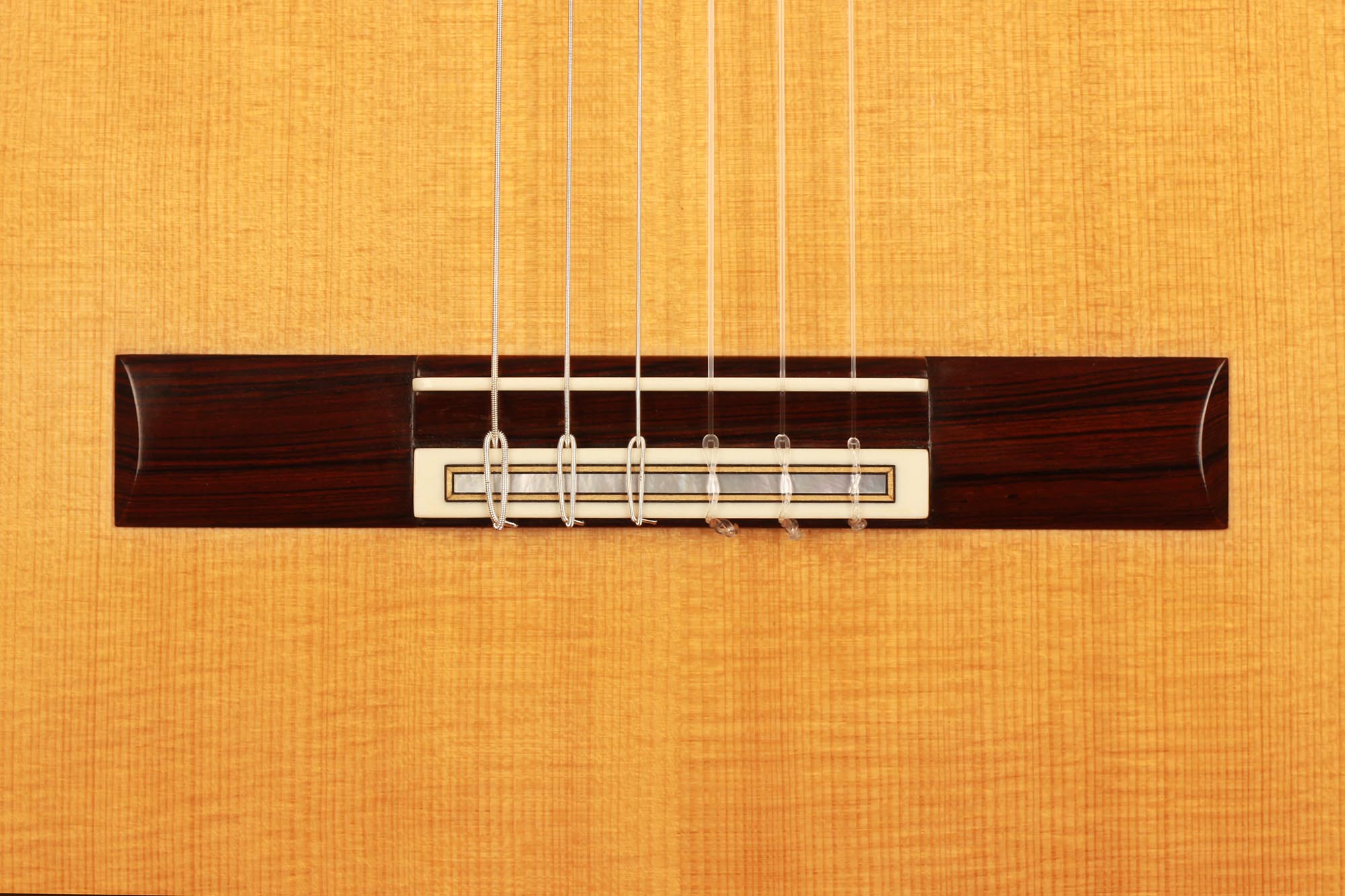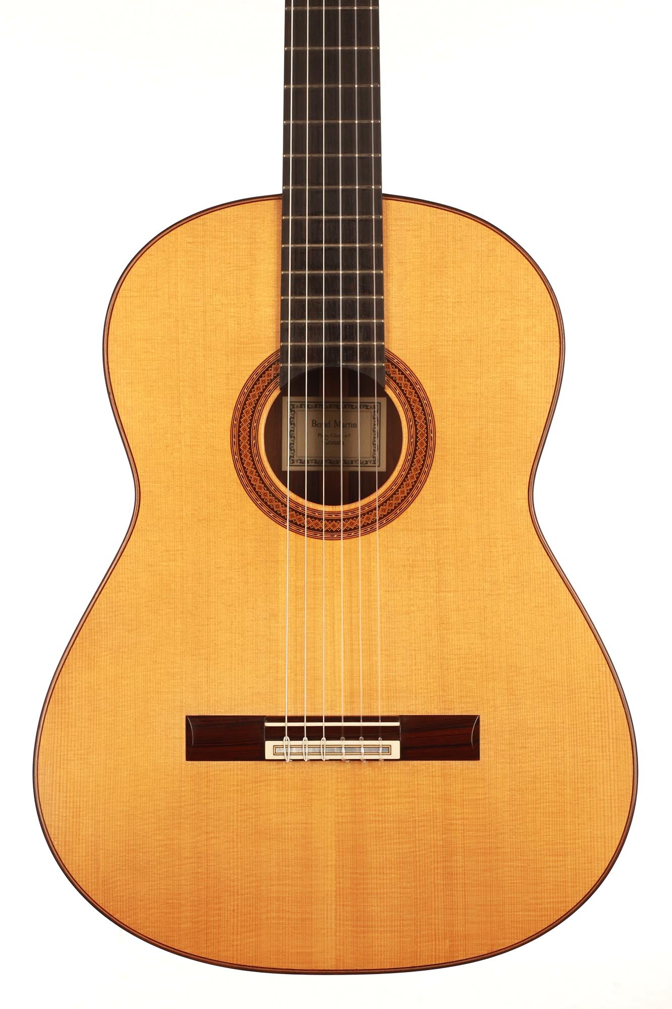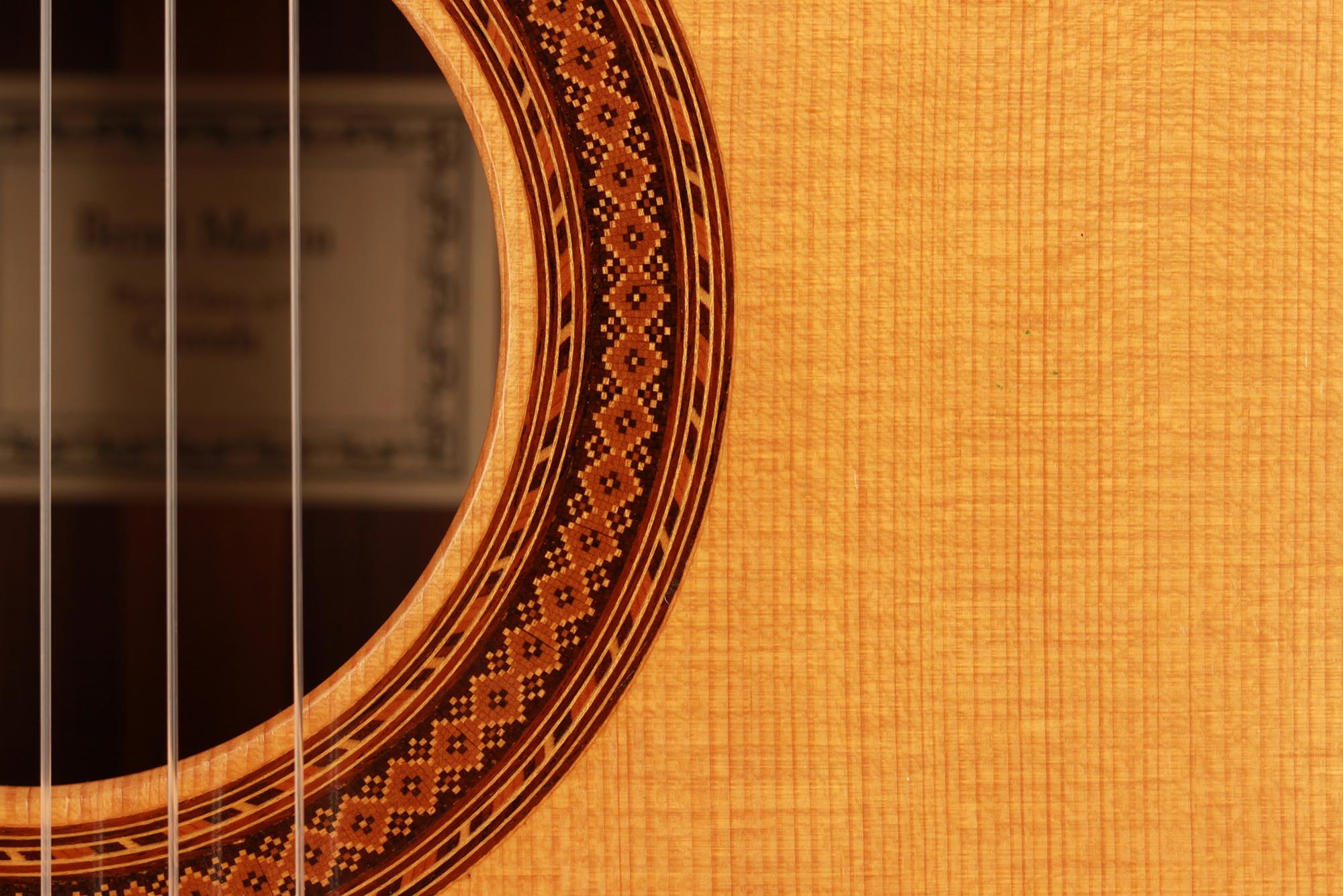 This fabulous guitar, both fine and elegant, was built in 1996. It is hand-signed by Bernd Martin on the inside of the top. The guitar is built with a traditional 7-fan bracing and is in very good condition considering its age. The top has acquired a beautiful color over the years. The back and sides are in good condition with only superficial signs of use. The top has only one repaired hairline crack to the right of the fingerboard