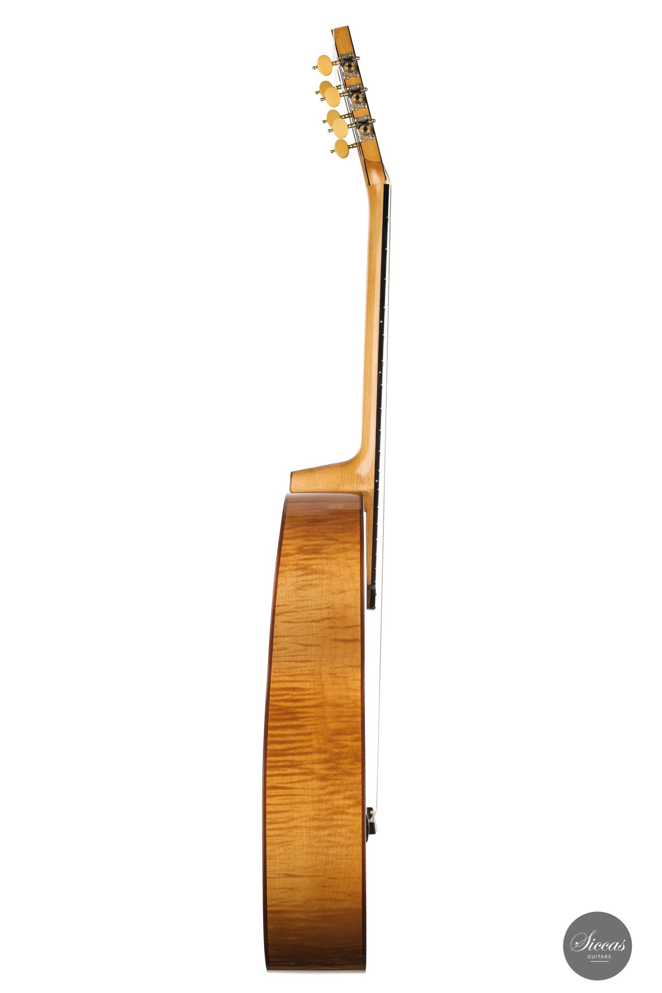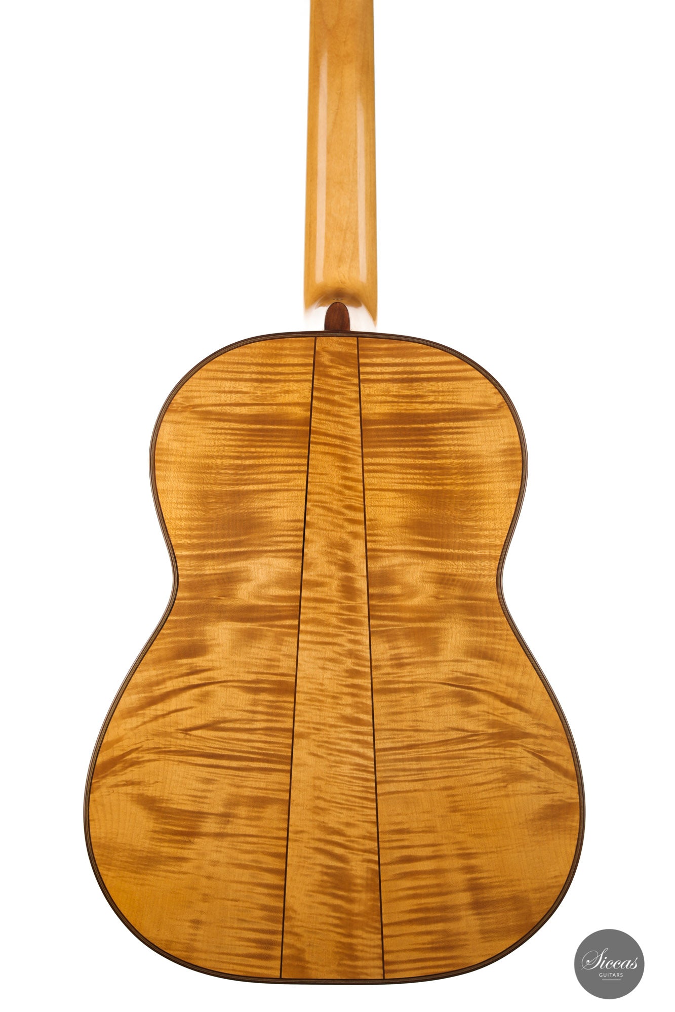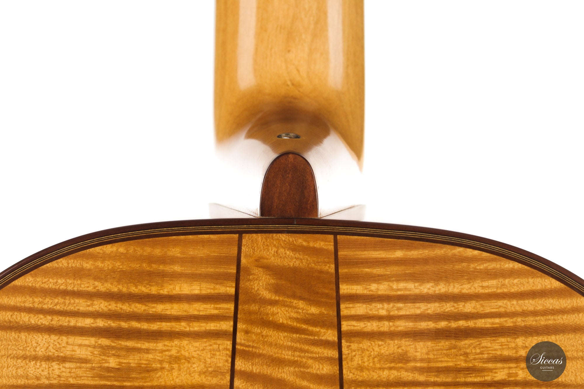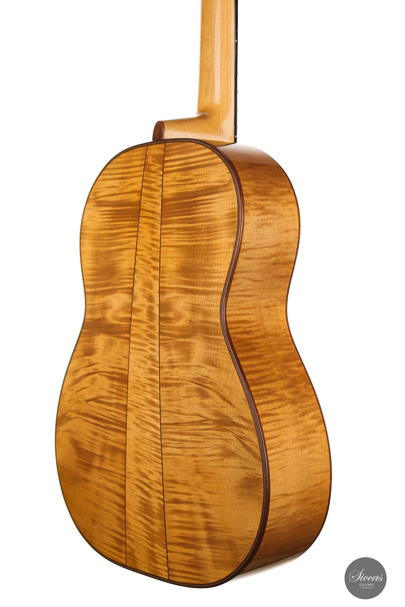 This guitar built in 2020 is truly fascinating. The concert model of his own design has an elaborate cedar lattice performance on a spruce top. This rather modern element is counterbalanced by a three-piece maple back, which is very reminiscent of the way Spanish guitar makers used this fine wood in the 19th century. In addition, the raised fingerboard is made in the Viennese style, suspended above the soundboard, and equipped with an internal mechanism that allows the height of the strings to be adjusted with a simple key. Finally, the headstock is adorned with superb Rodgers machine heads, which contrast with the dark, figured Ziricote head veneer.
