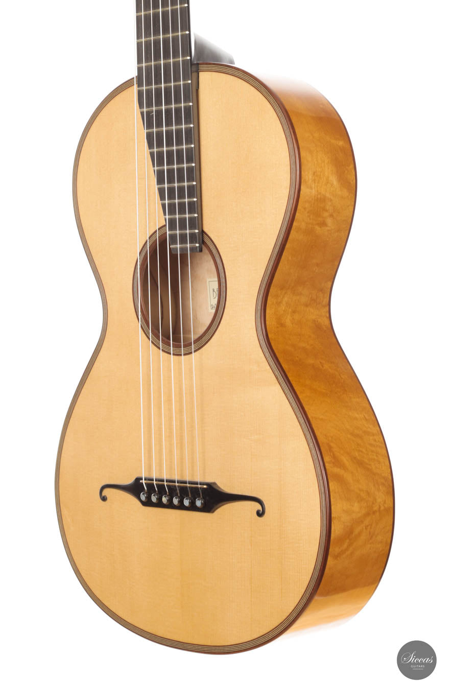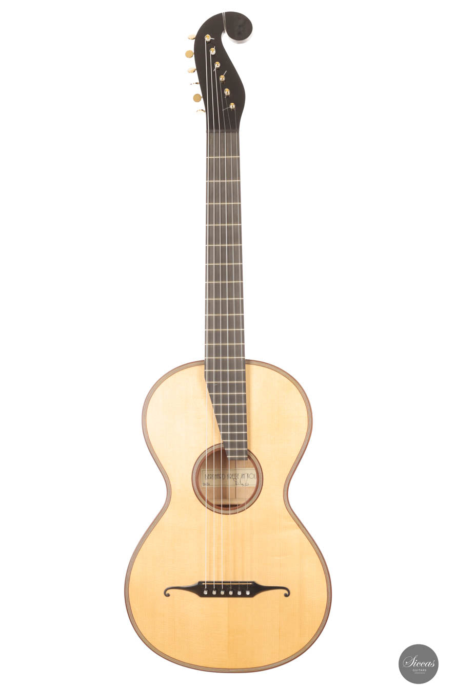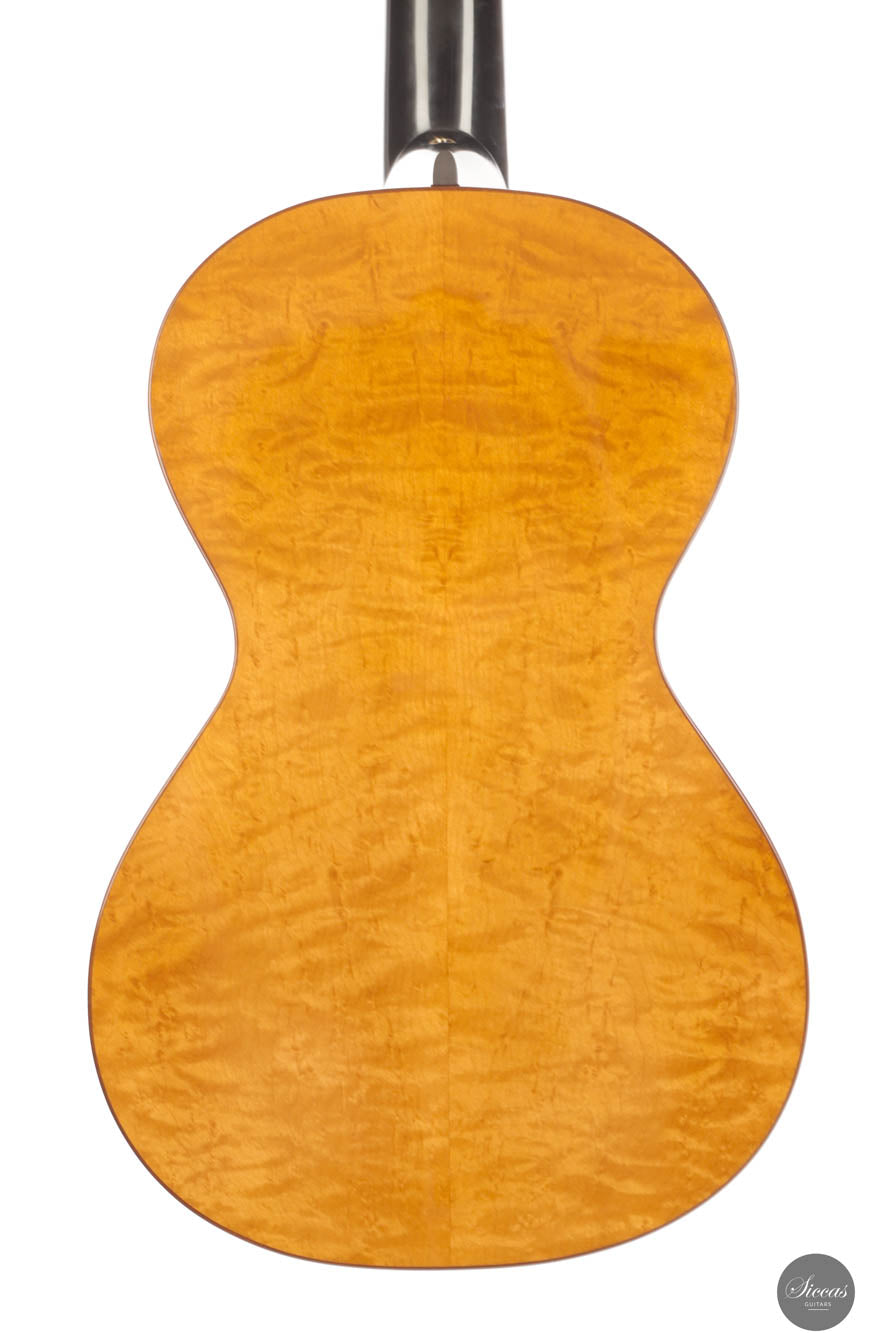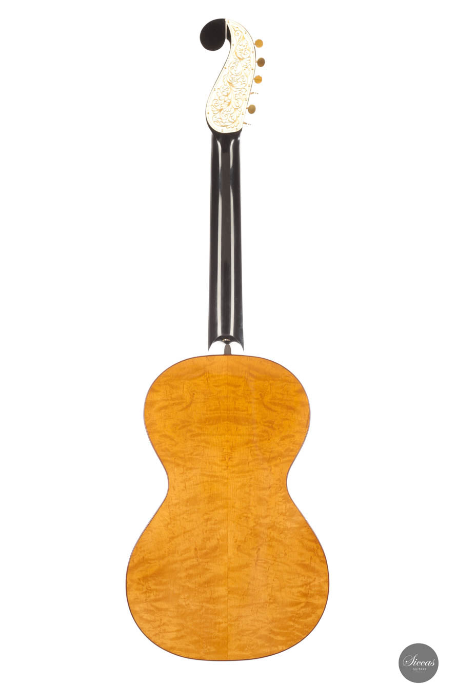 Dieses Instrument verkörpert Bernhards tiefes Fachwissen und seine Leidenschaft für historische Gitarren. Es handelt sich um ein herausragendes Konzertinstrument mit schneller Ansprache, außergewöhnlicher Projektion und bemerkenswerter Lautstärke. Mit Blick auf Komfort gestaltet, verfügt es über einen verstellbaren Hals und ein leicht erhöhtes Griffbrett, inspiriert von Stauffers patentiertem Design. Die verwendeten Materialien sind von höchster Qualität: Die Fichtendecke sowie Boden und Zargen aus eindrucksvollem Ahorn sind sowohl optisch ansprechend als auch klanglich hervorragend. Darüber hinaus verleiht die elegante Mechanik von Rodgers der Gitarre nicht nur ästhetischen Reiz, sondern arbeitet auch makellos. Diese Gitarre im Stauffer-Stil bietet eine einzigartige Gelegenheit für jeden Gitarristen, der ein historisches Instrument sucht, das von einem der weltweit führenden Experten im Bereich des historischen Gitarrenbaus gefertigt wurde.
