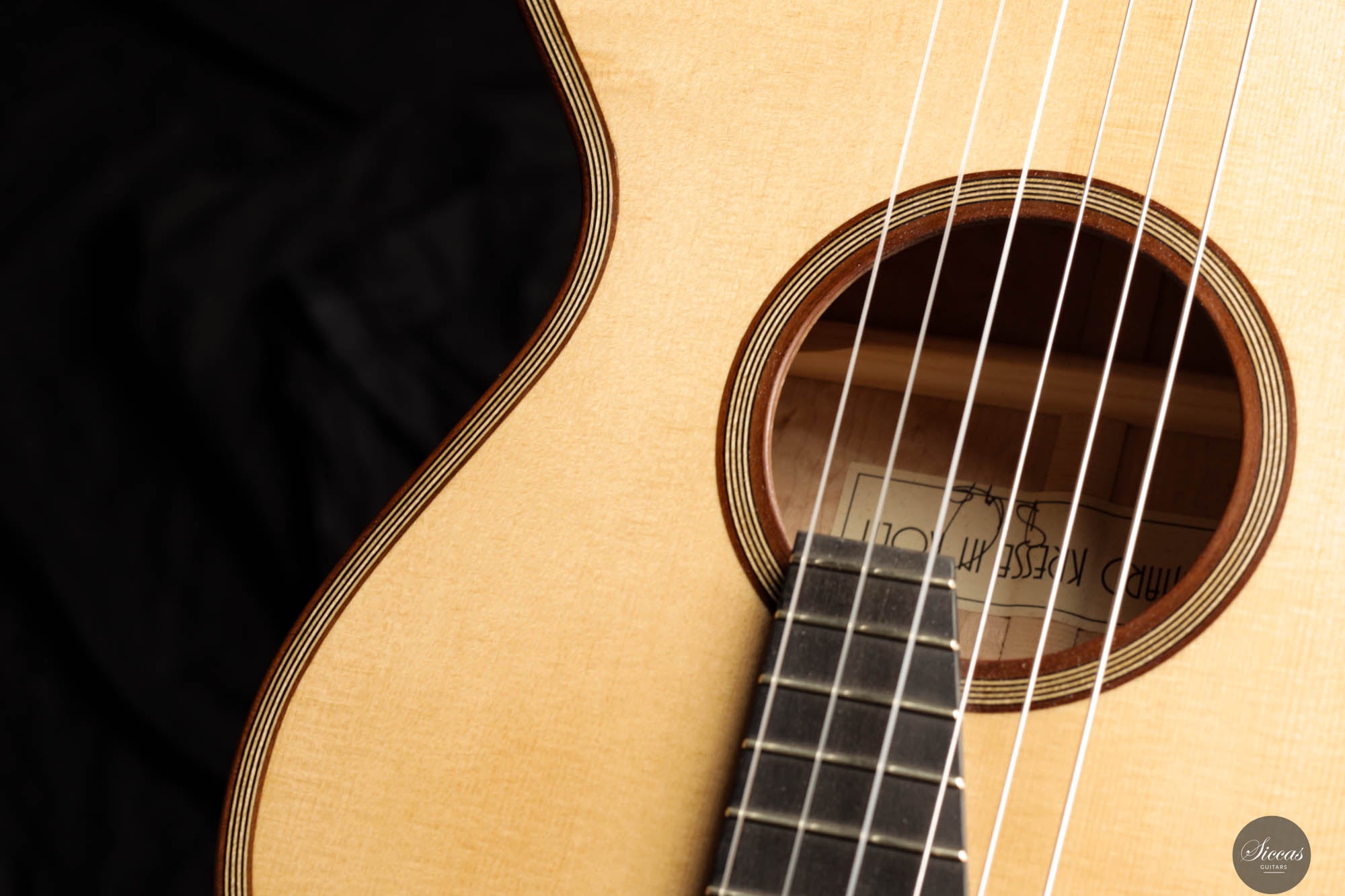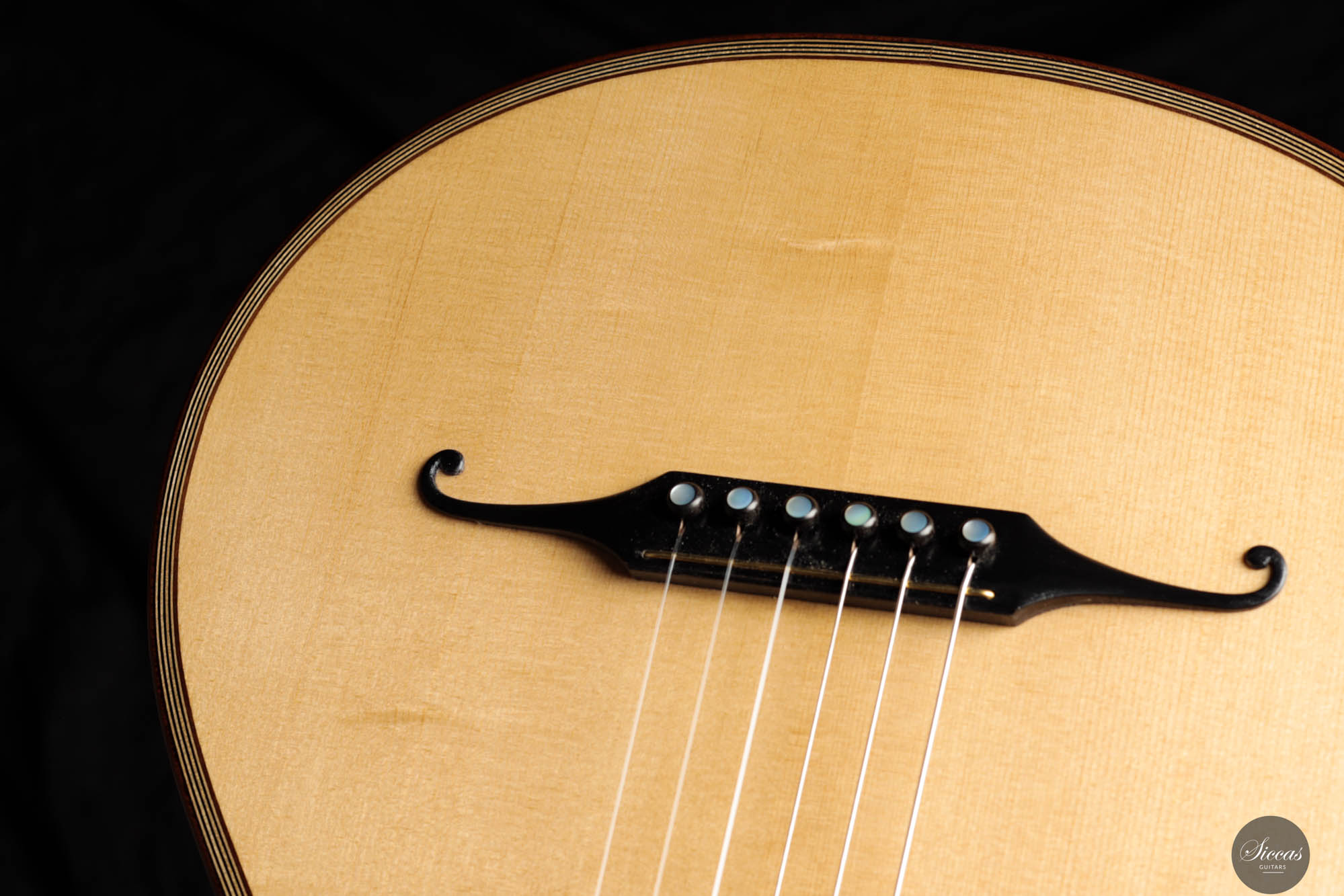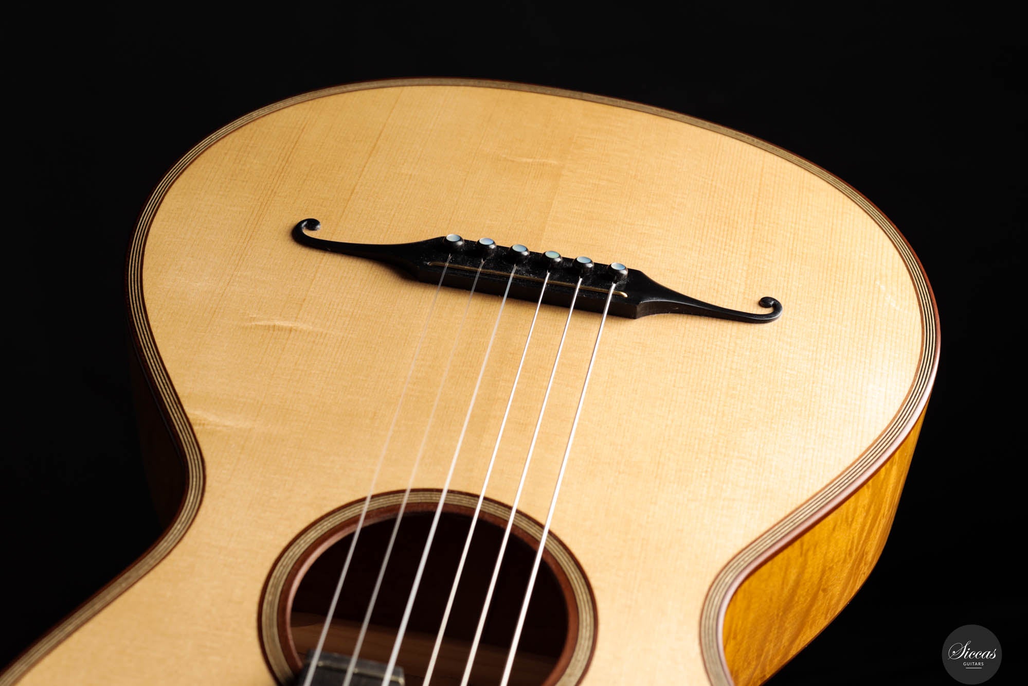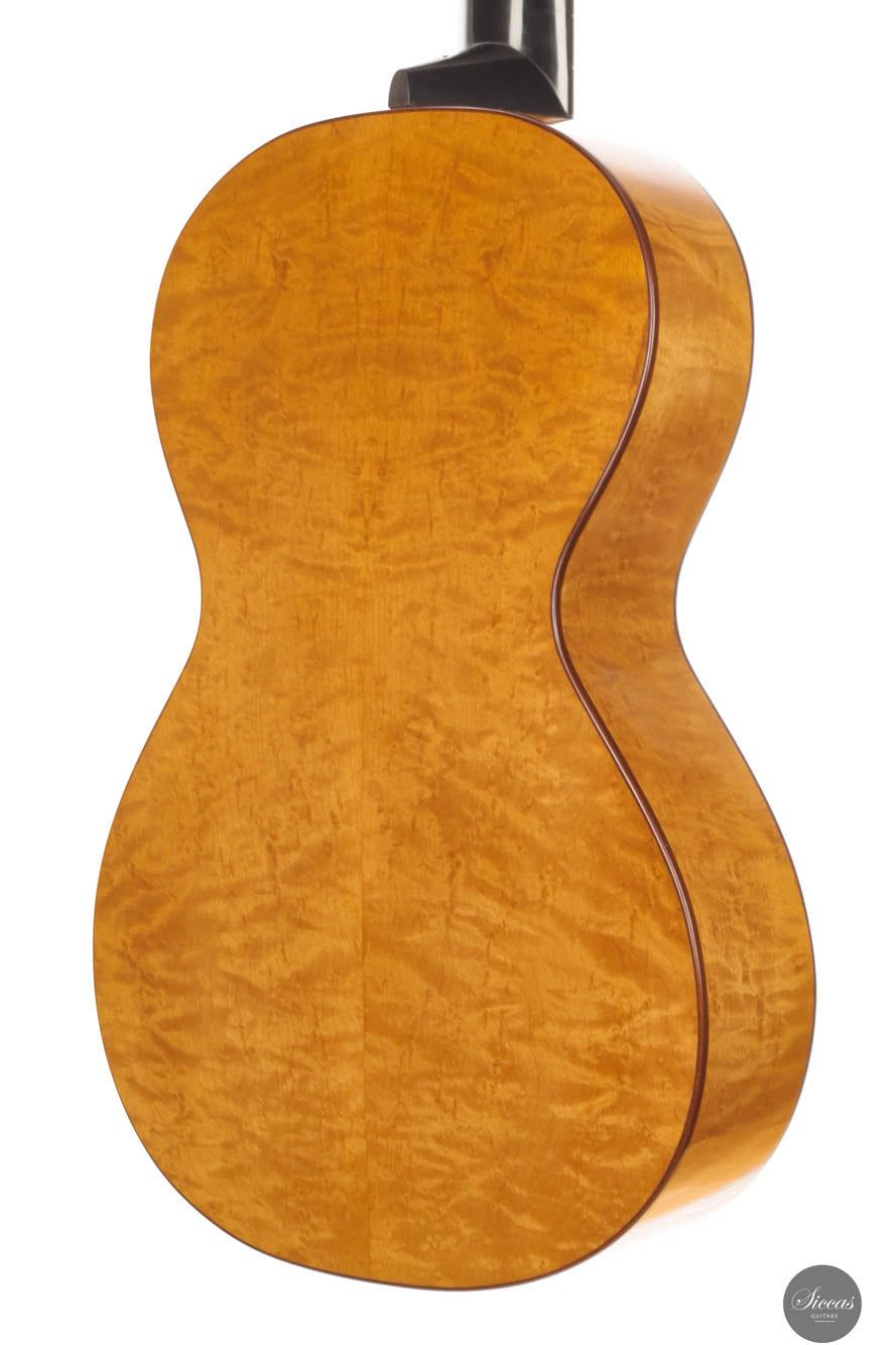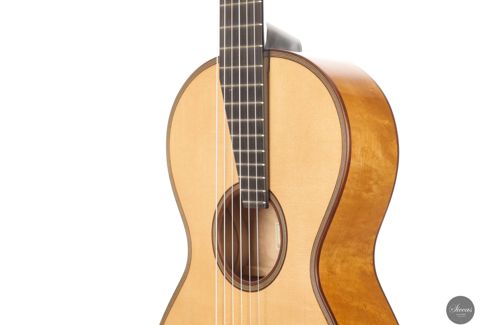 Dieses Instrument verkörpert Bernhards tiefes Fachwissen und seine Leidenschaft für historische Gitarren. Es handelt sich um ein herausragendes Konzertinstrument mit schneller Ansprache, außergewöhnlicher Projektion und bemerkenswerter Lautstärke. Mit Blick auf Komfort gestaltet, verfügt es über einen verstellbaren Hals und ein leicht erhöhtes Griffbrett, inspiriert von Stauffers patentiertem Design. Die verwendeten Materialien sind von höchster Qualität: Die Fichtendecke sowie Boden und Zargen aus eindrucksvollem Ahorn sind sowohl optisch ansprechend als auch klanglich hervorragend. Darüber hinaus verleiht die elegante Mechanik von Rodgers der Gitarre nicht nur ästhetischen Reiz, sondern arbeitet auch makellos. Diese Gitarre im Stauffer-Stil bietet eine einzigartige Gelegenheit für jeden Gitarristen, der ein historisches Instrument sucht, das von einem der weltweit führenden Experten im Bereich des historischen Gitarrenbaus gefertigt wurde.