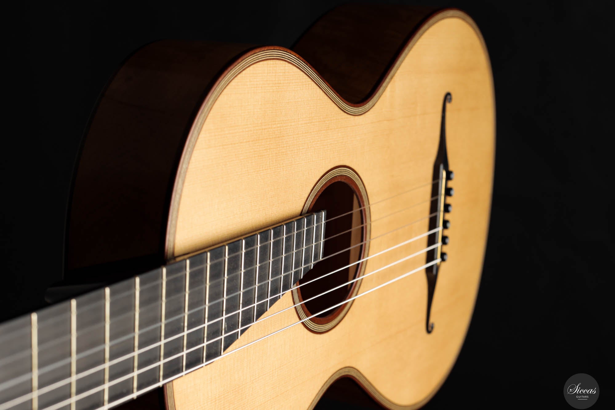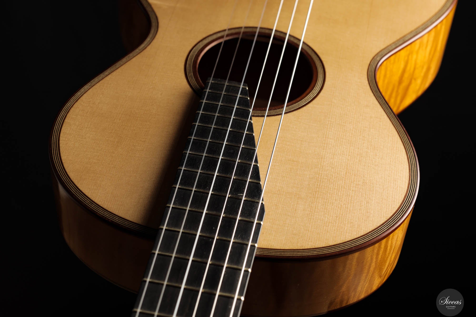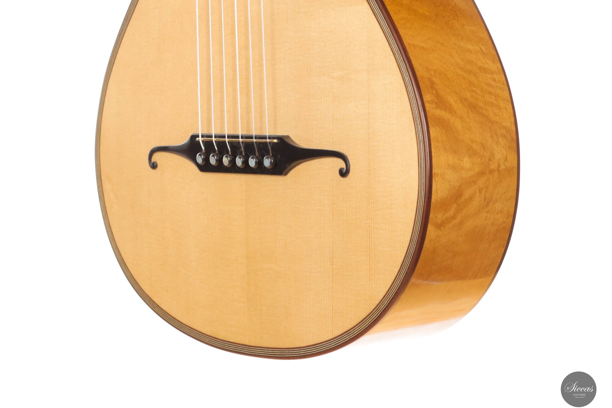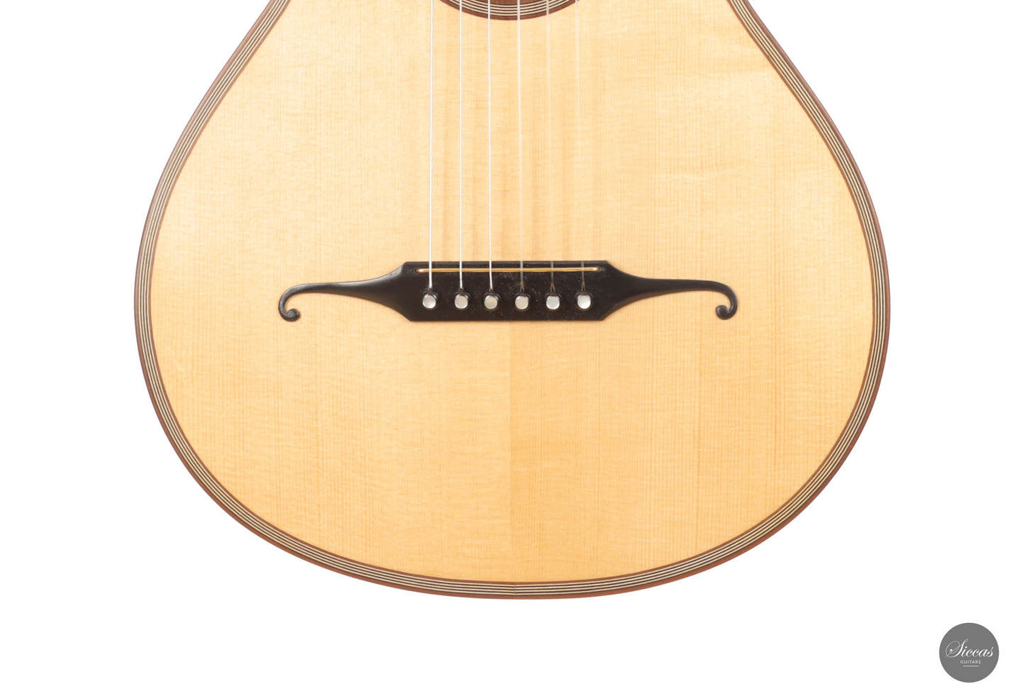 Dieses Instrument verkörpert Bernhards tiefes Fachwissen und seine Leidenschaft für historische Gitarren. Es handelt sich um ein herausragendes Konzertinstrument mit schneller Ansprache, außergewöhnlicher Projektion und bemerkenswerter Lautstärke. Mit Blick auf Komfort gestaltet, verfügt es über einen verstellbaren Hals und ein leicht erhöhtes Griffbrett, inspiriert von Stauffers patentiertem Design. Die verwendeten Materialien sind von höchster Qualität: Die Fichtendecke sowie Boden und Zargen aus eindrucksvollem Ahorn sind sowohl optisch ansprechend als auch klanglich hervorragend. Darüber hinaus verleiht die elegante Mechanik von Rodgers der Gitarre nicht nur ästhetischen Reiz, sondern arbeitet auch makellos. Diese Gitarre im Stauffer-Stil bietet eine einzigartige Gelegenheit für jeden Gitarristen, der ein historisches Instrument sucht, das von einem der weltweit führenden Experten im Bereich des historischen Gitarrenbaus gefertigt wurde.