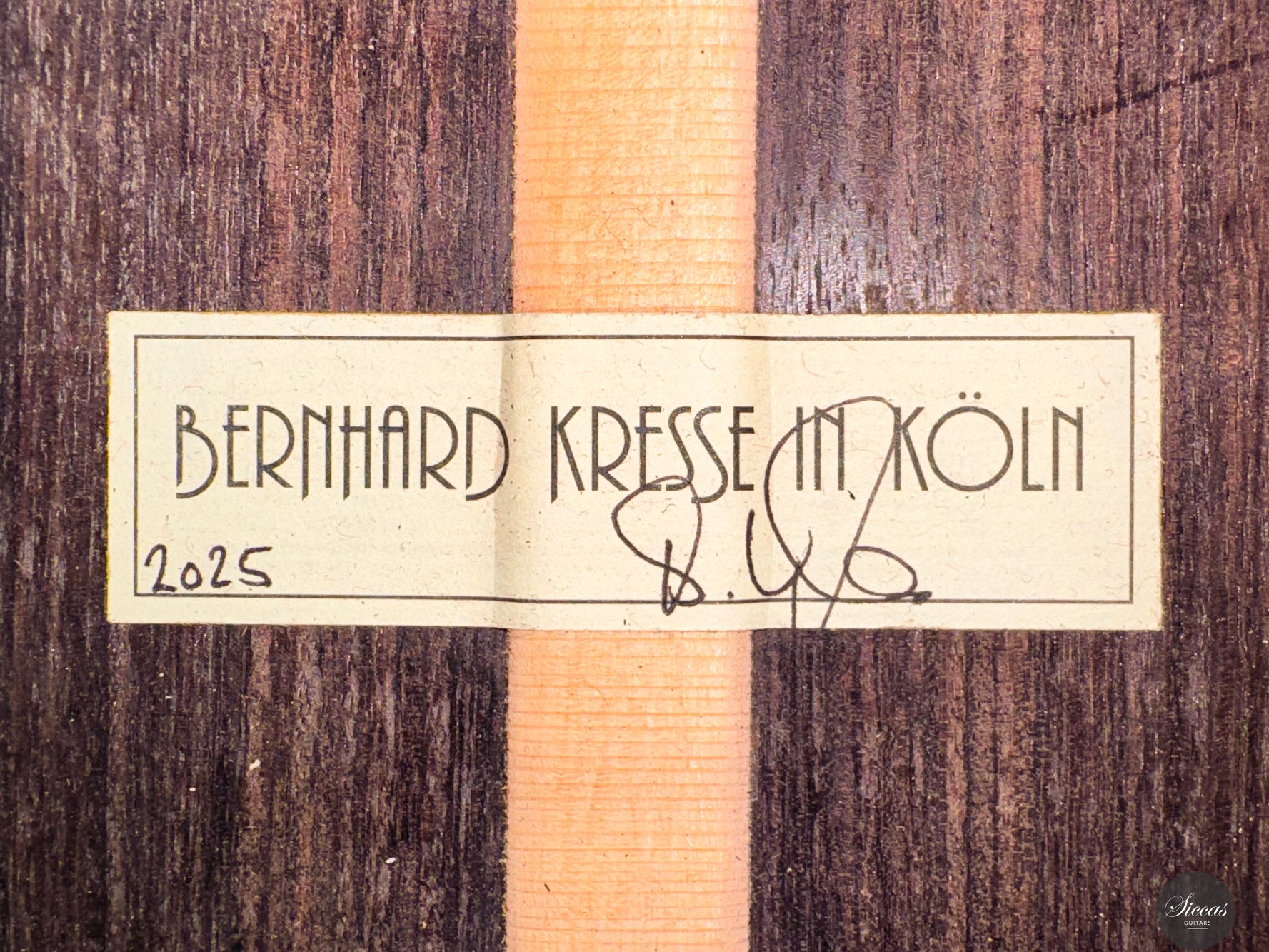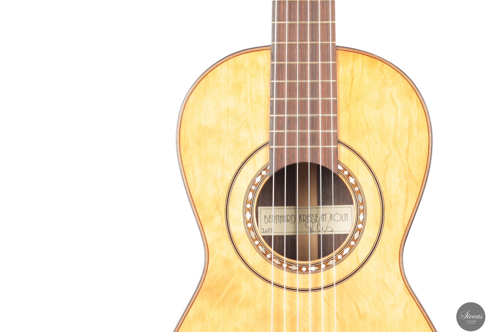 Bernhard Kresse aus Köln ist bekannt für historisch informierte Instrumente sowie moderne Konzertgitarren. Sein tiefes Wissen über die Gitarrentraditionen des 19. Jahrhunderts in Spanien und Frankreich, verbunden mit akribischer Handarbeit, macht ihn zu einem der führenden Gitarrenbauer romantischer Modelle, die einen authentischen Klang mit moderner Zuverlässigkeit verbinden.Über die Gitarre