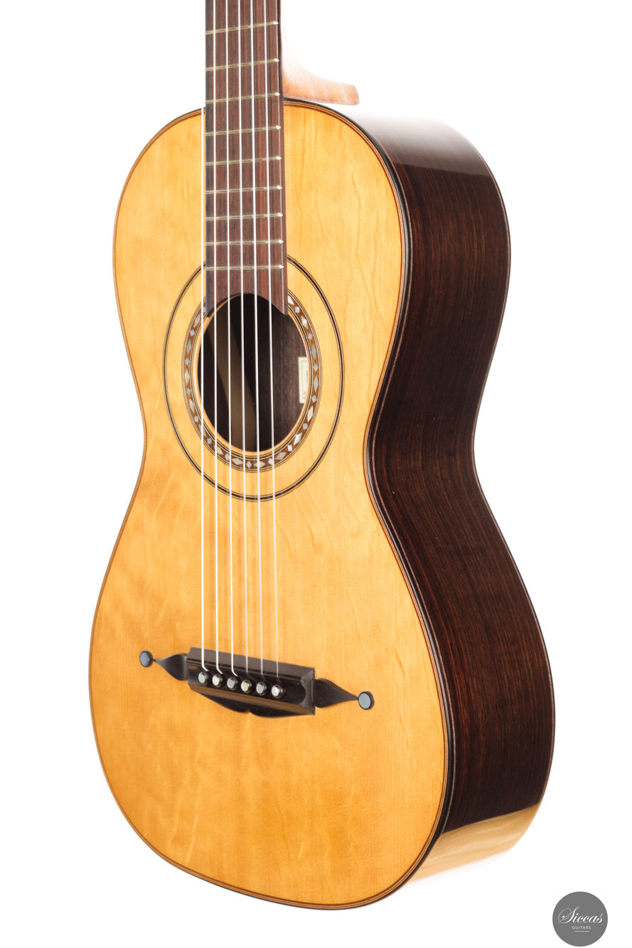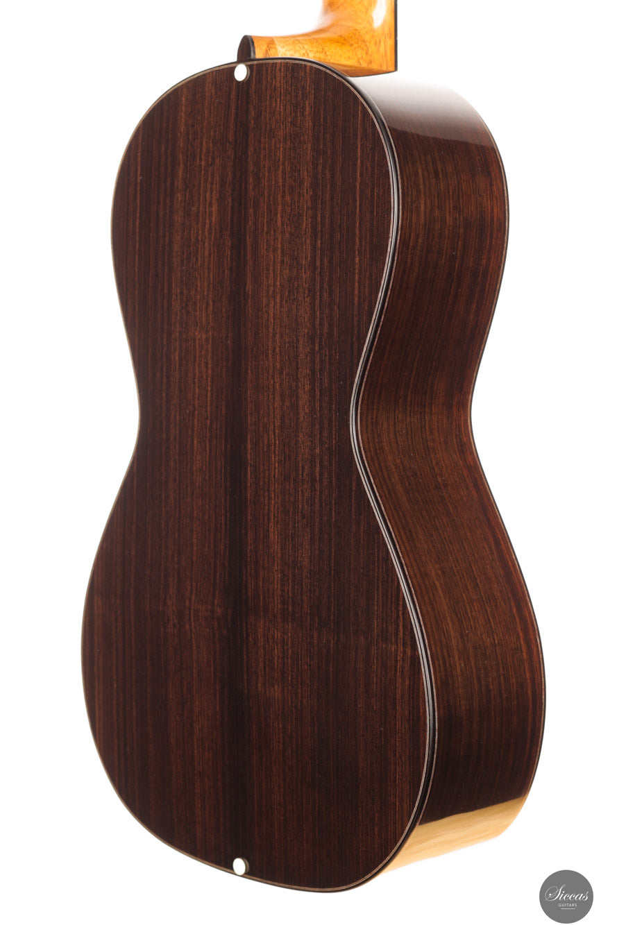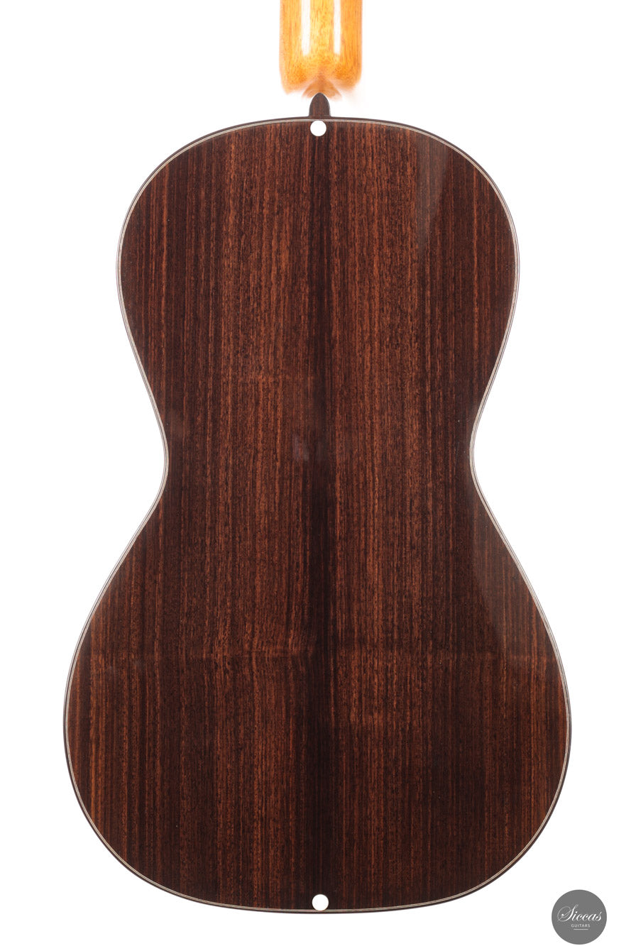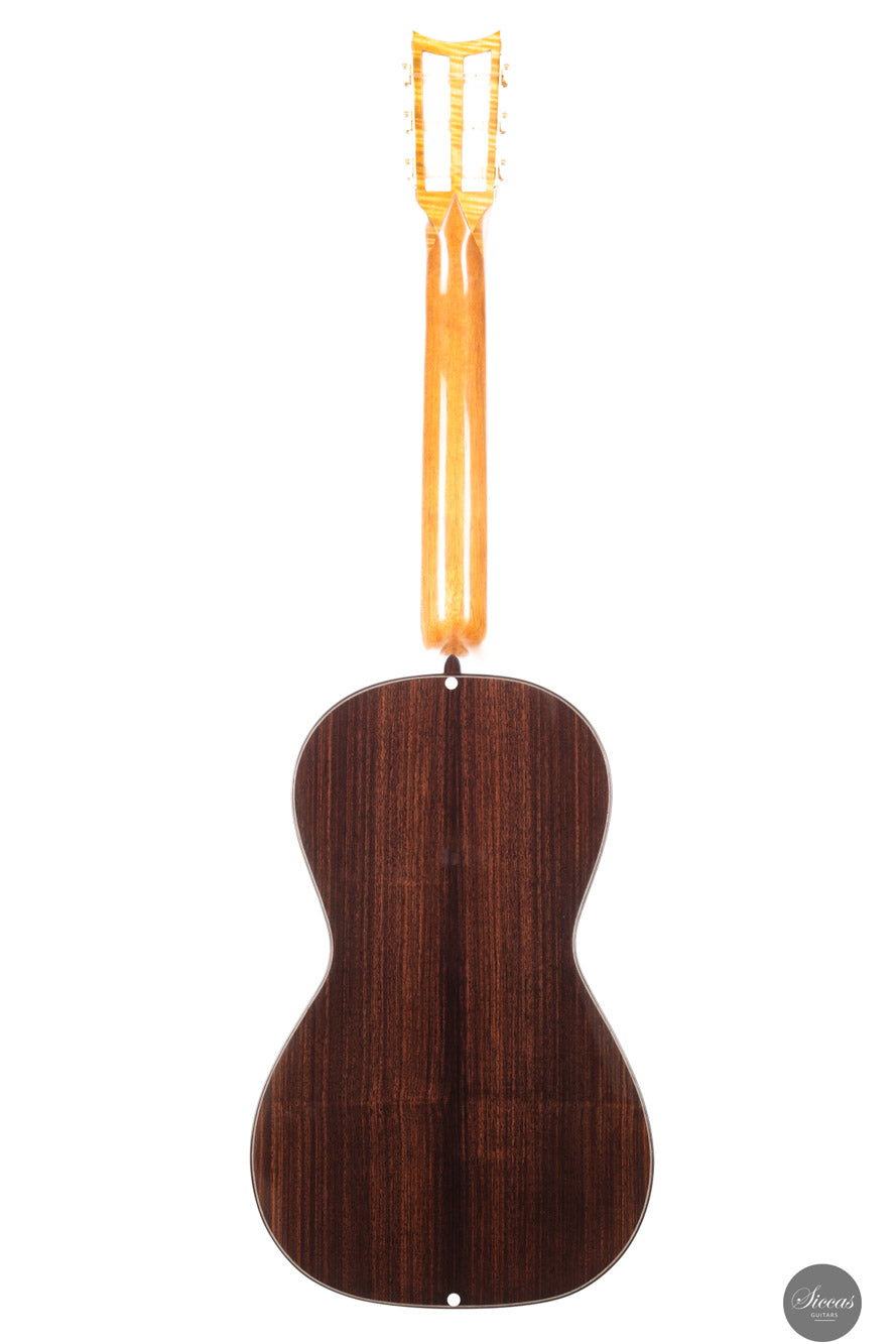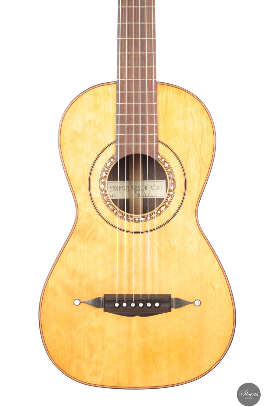 Dieses Instrument, fertiggestellt im Jahr 2025, ist Kresses Interpretation einer Gitarre von Louis Panormo aus dem Jahr 1843. Die Decke besteht aus Fichte, Boden und Zargen aus indischem Palisander, das Finish ist eine Schellackpolitur. Mit einer Mensur von 630 mm, einer Sattelbreite von 47 mm und einem sehr geringen Gewicht von 1190 Gramm bietet die Gitarre das Spielgefühl und die Wendigkeit romantischer Instrumente. Alessi Mechaniken runden die elegante und präzise Ausführung ab. Klanglich zeigt sich ein intimer, lyrischer Charakter mit dem typischen Fokus auf den Mitten, einer weichen, leicht boxigen Färbung und einem dezenten nasalen Ton, wie man ihn von originalen Panormo Gitarren kennt. Die ausgewogene Klarheit eignet sich hervorragend für klassische und romantische Literatur, während die neue Bauweise Stabilität und Zuverlässigkeit gewährleistet.Regelmäßige Pflege verlängert die Lebensdauer des Instruments