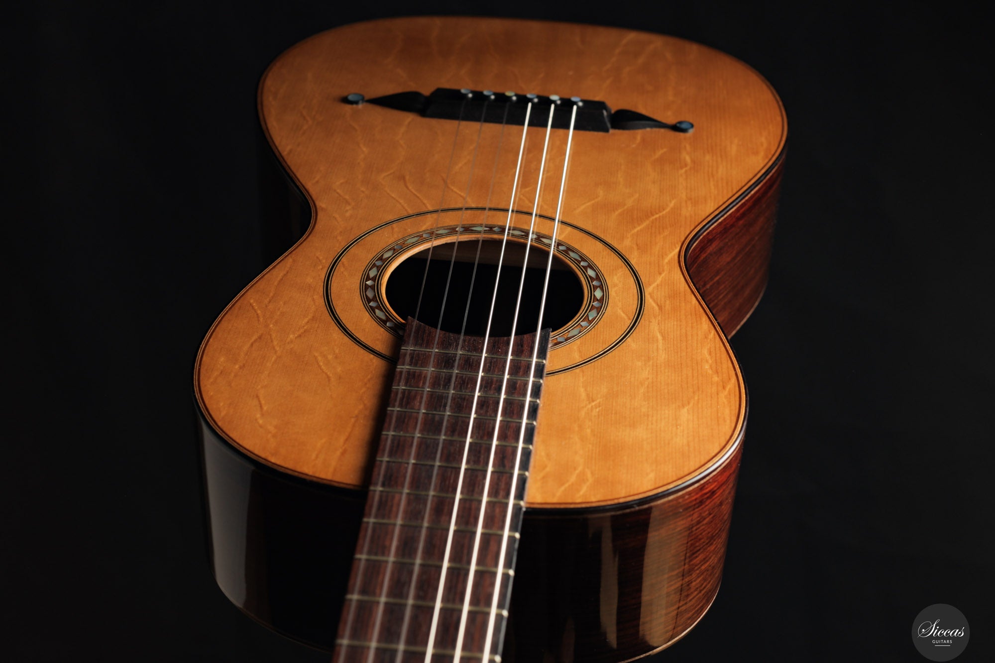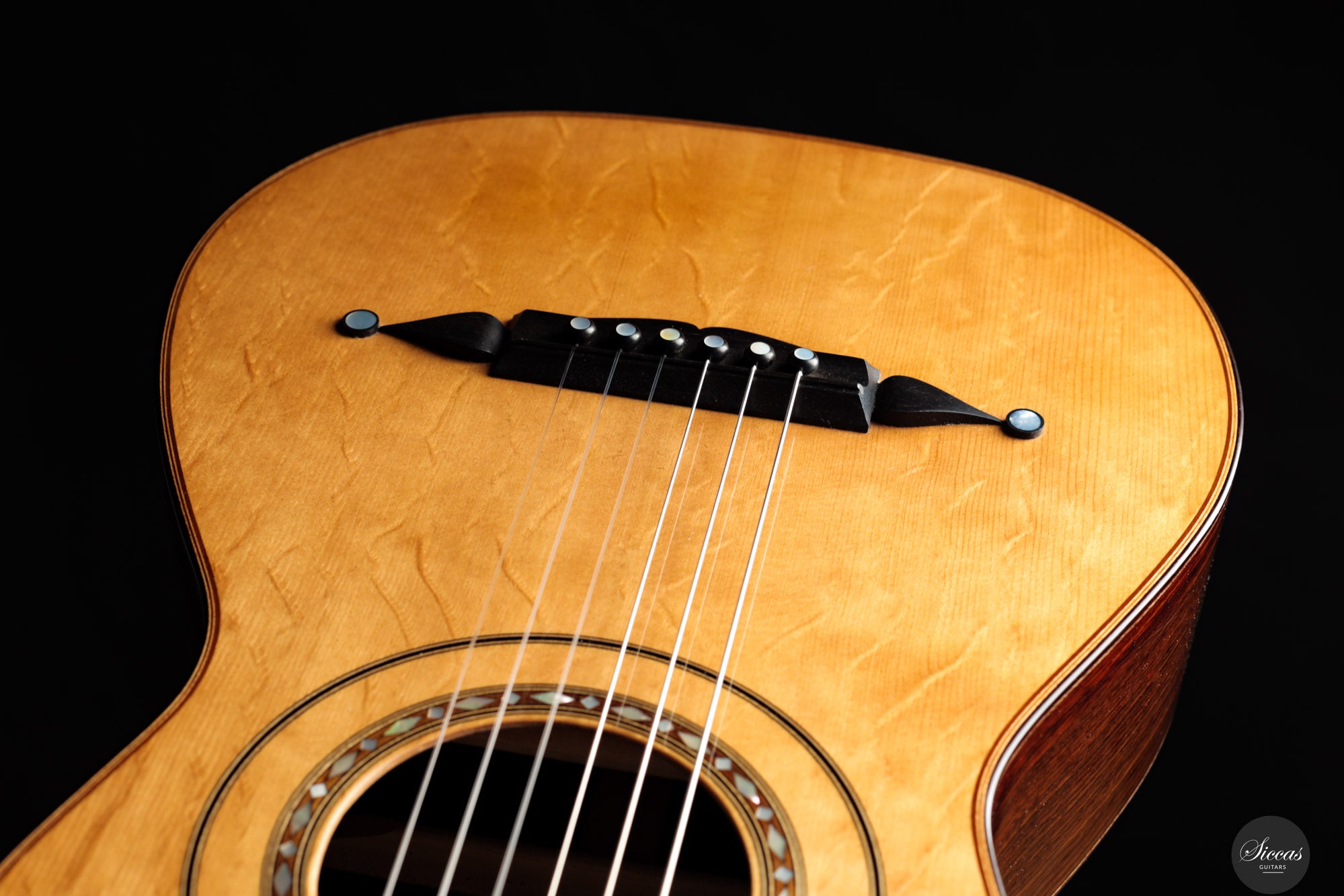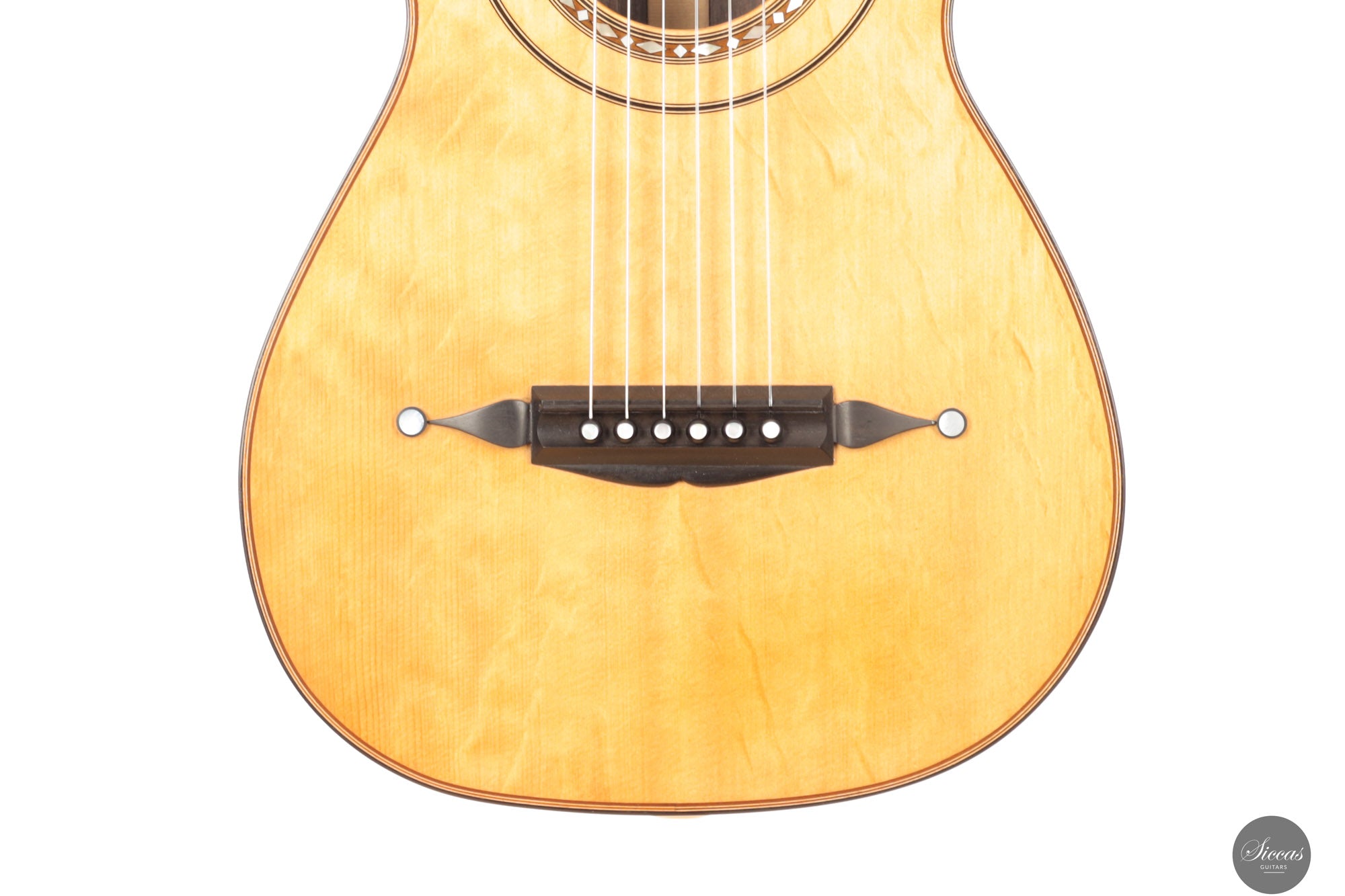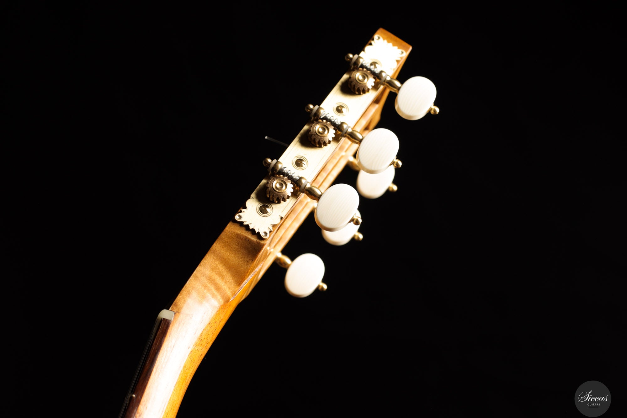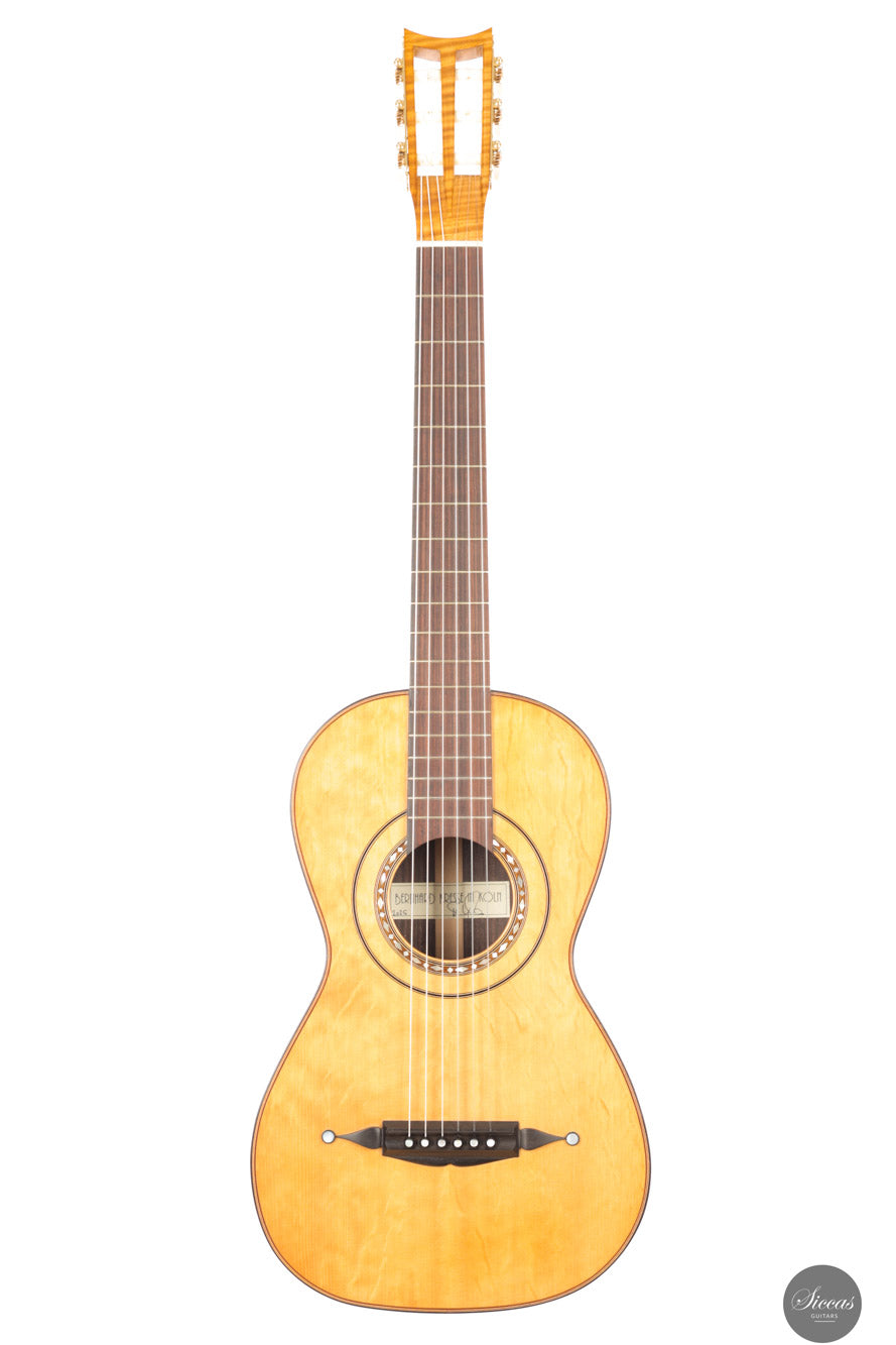 Dieses Instrument, fertiggestellt im Jahr 2025, ist Kresses Interpretation einer Gitarre von Louis Panormo aus dem Jahr 1843. Die Decke besteht aus Fichte, Boden und Zargen aus indischem Palisander, das Finish ist eine Schellackpolitur. Mit einer Mensur von 630 mm, einer Sattelbreite von 47 mm und einem sehr geringen Gewicht von 1190 Gramm bietet die Gitarre das Spielgefühl und die Wendigkeit romantischer Instrumente. Alessi Mechaniken runden die elegante und präzise Ausführung ab. Klanglich zeigt sich ein intimer, lyrischer Charakter mit dem typischen Fokus auf den Mitten, einer weichen, leicht boxigen Färbung und einem dezenten nasalen Ton, wie man ihn von originalen Panormo Gitarren kennt. Die ausgewogene Klarheit eignet sich hervorragend für klassische und romantische Literatur, während die neue Bauweise Stabilität und Zuverlässigkeit gewährleistet.Regelmäßige Pflege verlängert die Lebensdauer des Instruments