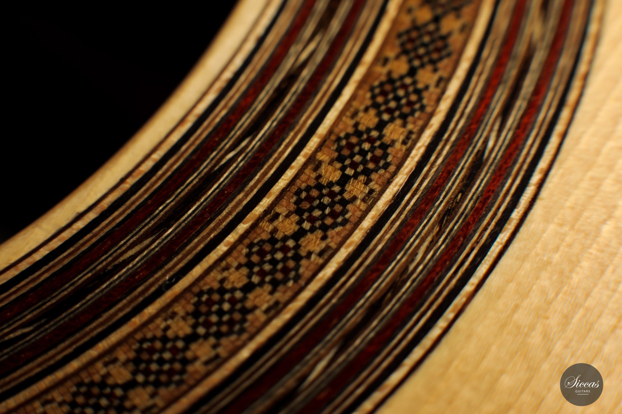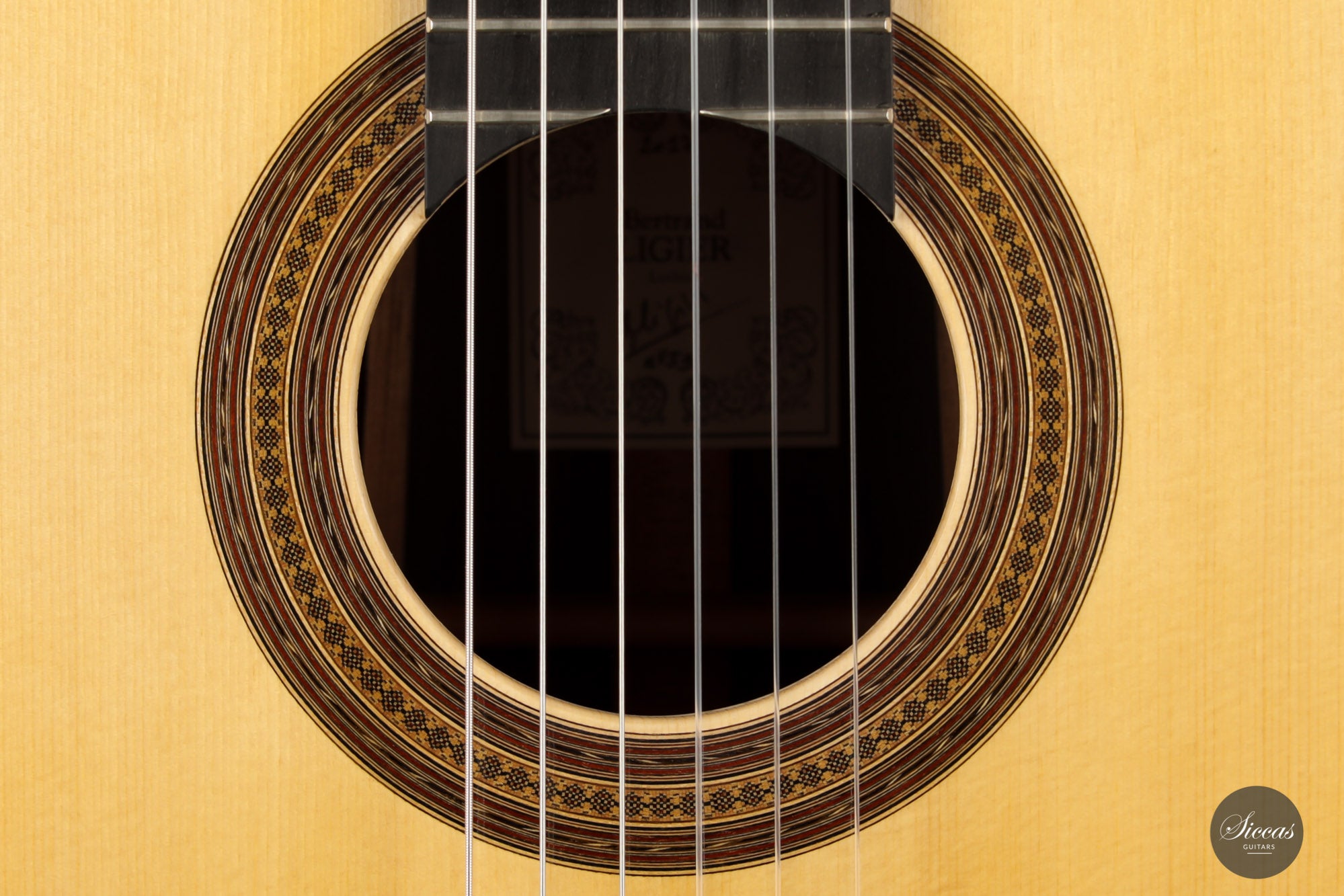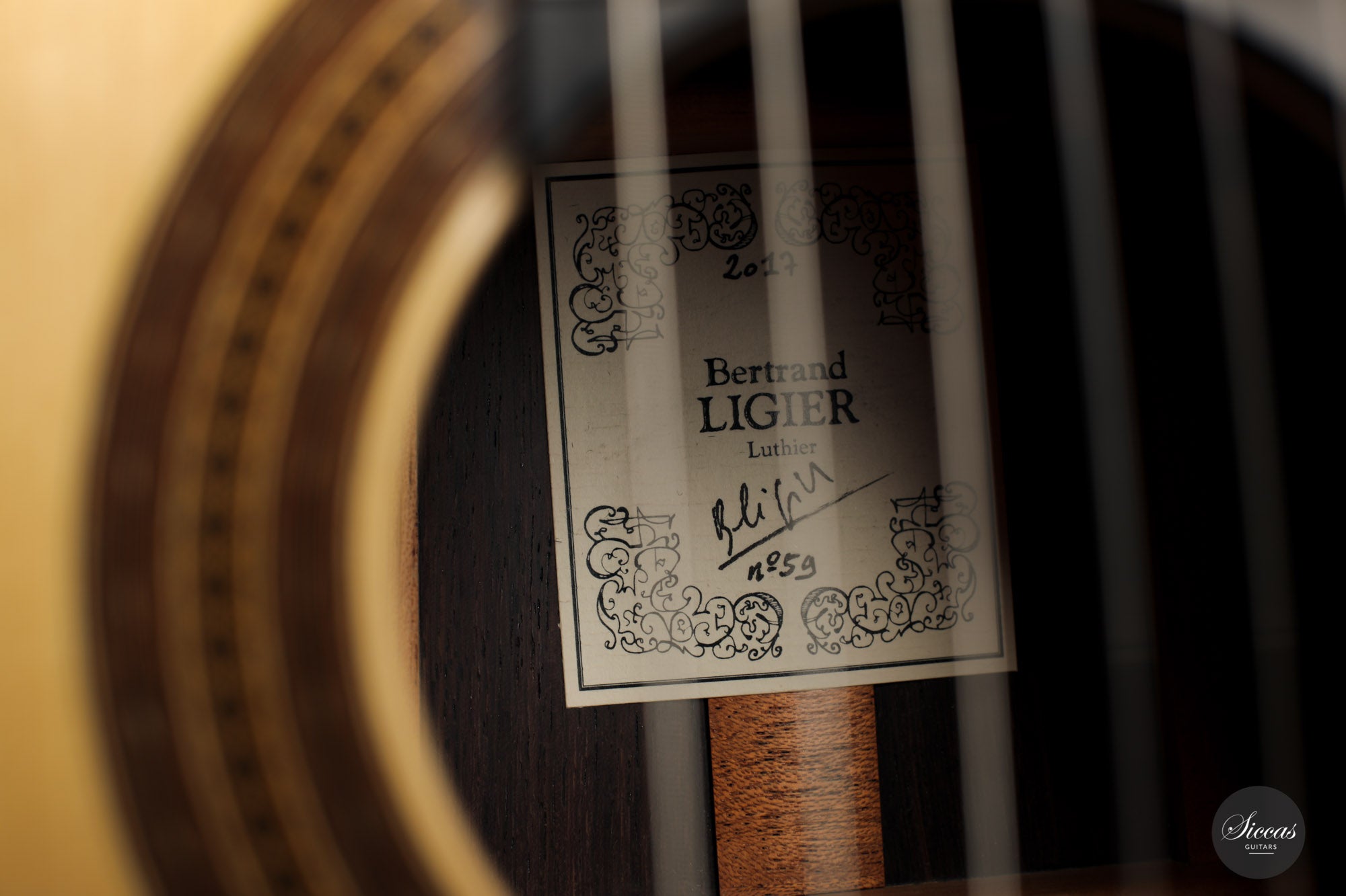 Bertrand Ligier is a French luthier based in Connaux, near Avignon in the south of France. His guitars follow the French tradition and are crafted with great finesse. Particular attention is given to the French polish, and the sound qualities follow those of Dominique Field and Daniel Friederich’s guitars. Bertrand has adopted some aesthetic details from the history of guitar making and has made them his own with outstanding refinement and taste. For instance, the shape of the head as well as the illuminations and the size of the label are reminiscent of those of Robert Bouchet. The rosette is of the utmost delicacy and the intricate mosaic pieces that compose it are assembled with skillful precision.