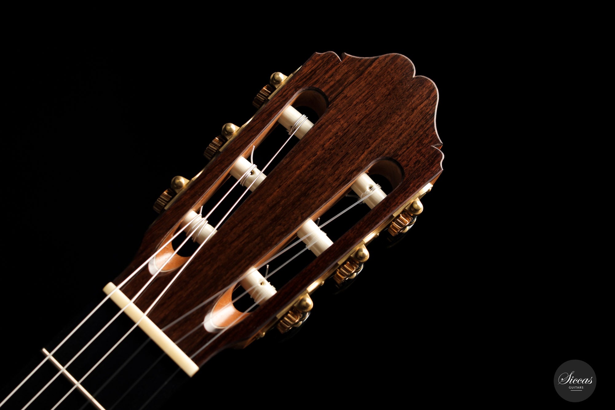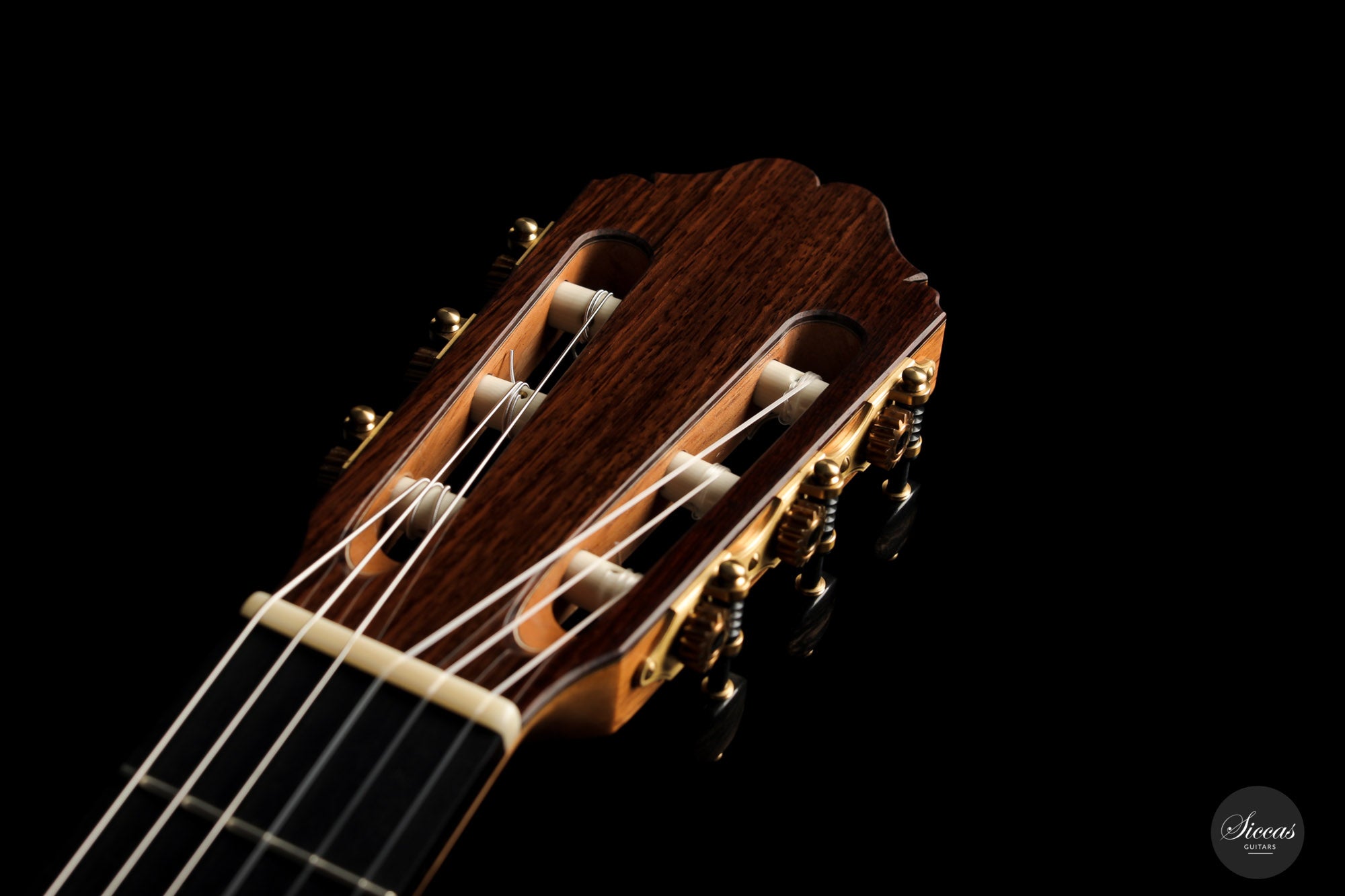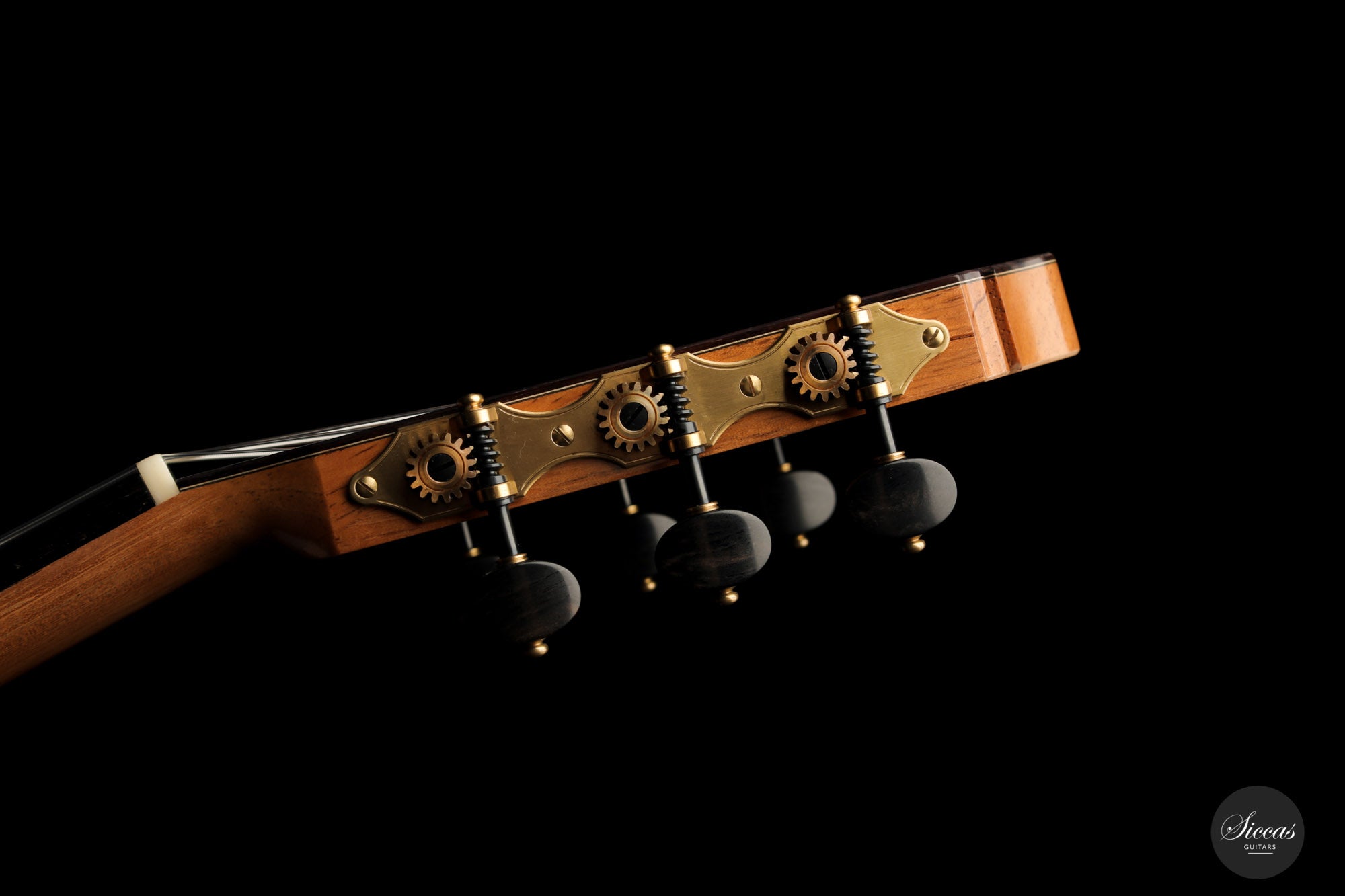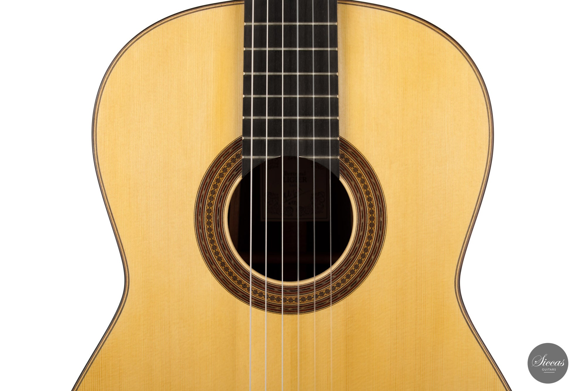 Bertrand Ligier is a French luthier based in Connaux, near Avignon in the south of France. His guitars follow the French tradition and are crafted with great finesse. Particular attention is given to the French polish, and the sound qualities follow those of Dominique Field and Daniel Friederich’s guitars. Bertrand has adopted some aesthetic details from the history of guitar making and has made them his own with outstanding refinement and taste. For instance, the shape of the head as well as the illuminations and the size of the label are reminiscent of those of Robert Bouchet. The rosette is of the utmost delicacy and the intricate mosaic pieces that compose it are assembled with skillful precision.