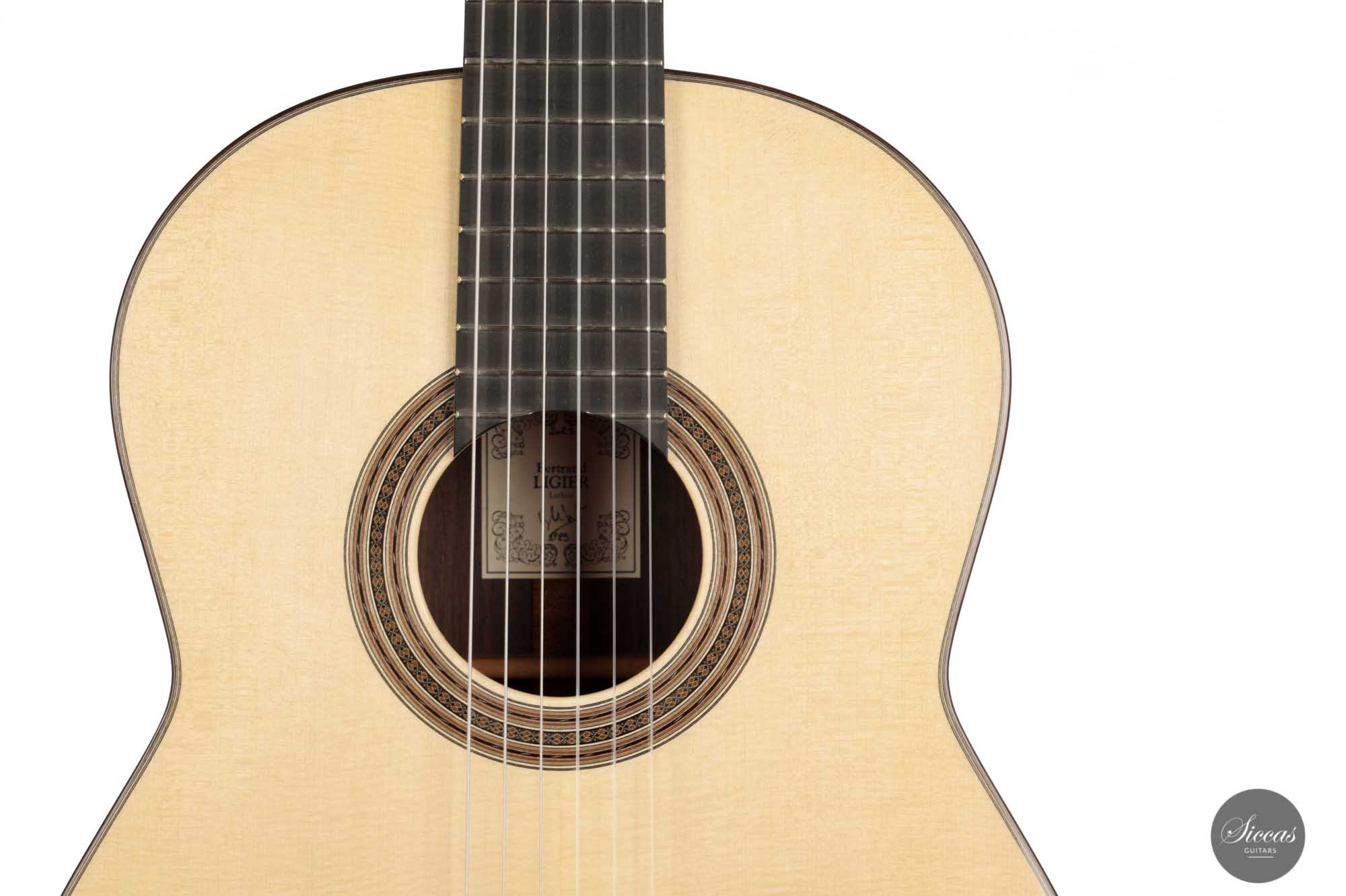 Bertrand Ligier ist ein französischer Gitarrenbauer aus Connaux in der Nähe von Avignon in Südfrankreich. Seine Gitarren folgen der französischen Tradition und sind besonders fein gefertigt. Sein Augenmerk gilt der Schellack Politur sowie der Klangqualitäten, die an die Gitarren von Dominique Field und Daniel Friederich erinnern. Bertrand hat aus der Geschichte des Gitarrenbaus einige ästhetische Details übernommen und sich diese mit einer herausragenden Raffinesse und Geschmack zu eigen gemacht. So erinnern beispielsweise die Form des Kopfes sowie die Illustrationen und die Maße des Etiketts an die von Robert Bouchet. Die Rosette ist überaus filigran und die aufwendigen Mosaikteile, aus denen sie besteht, sind mit gekonnter Präzision zusammengesetzt.
